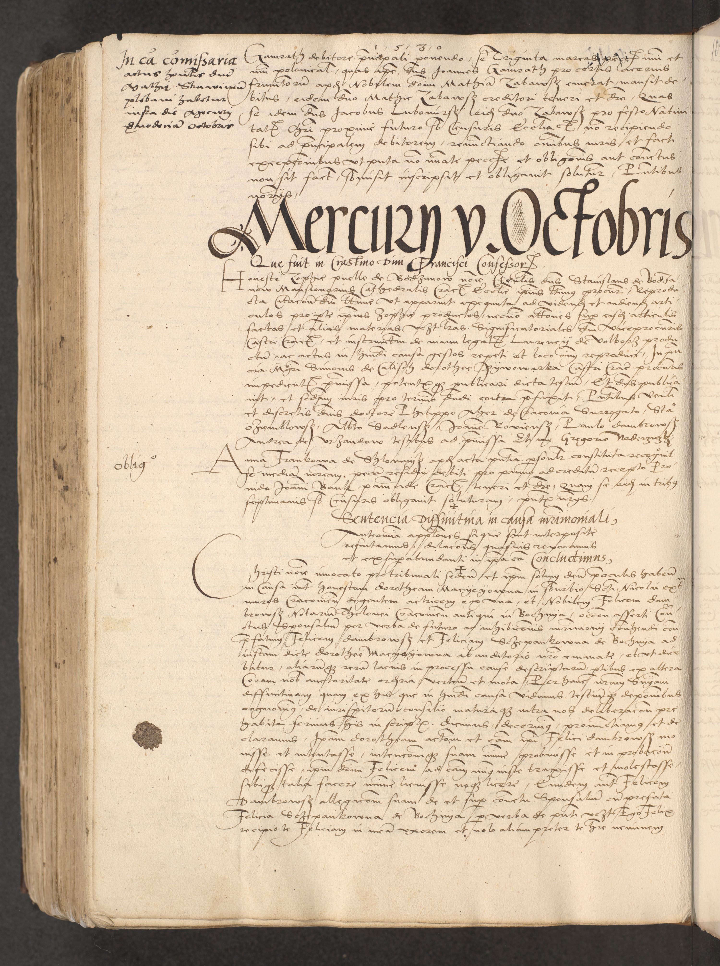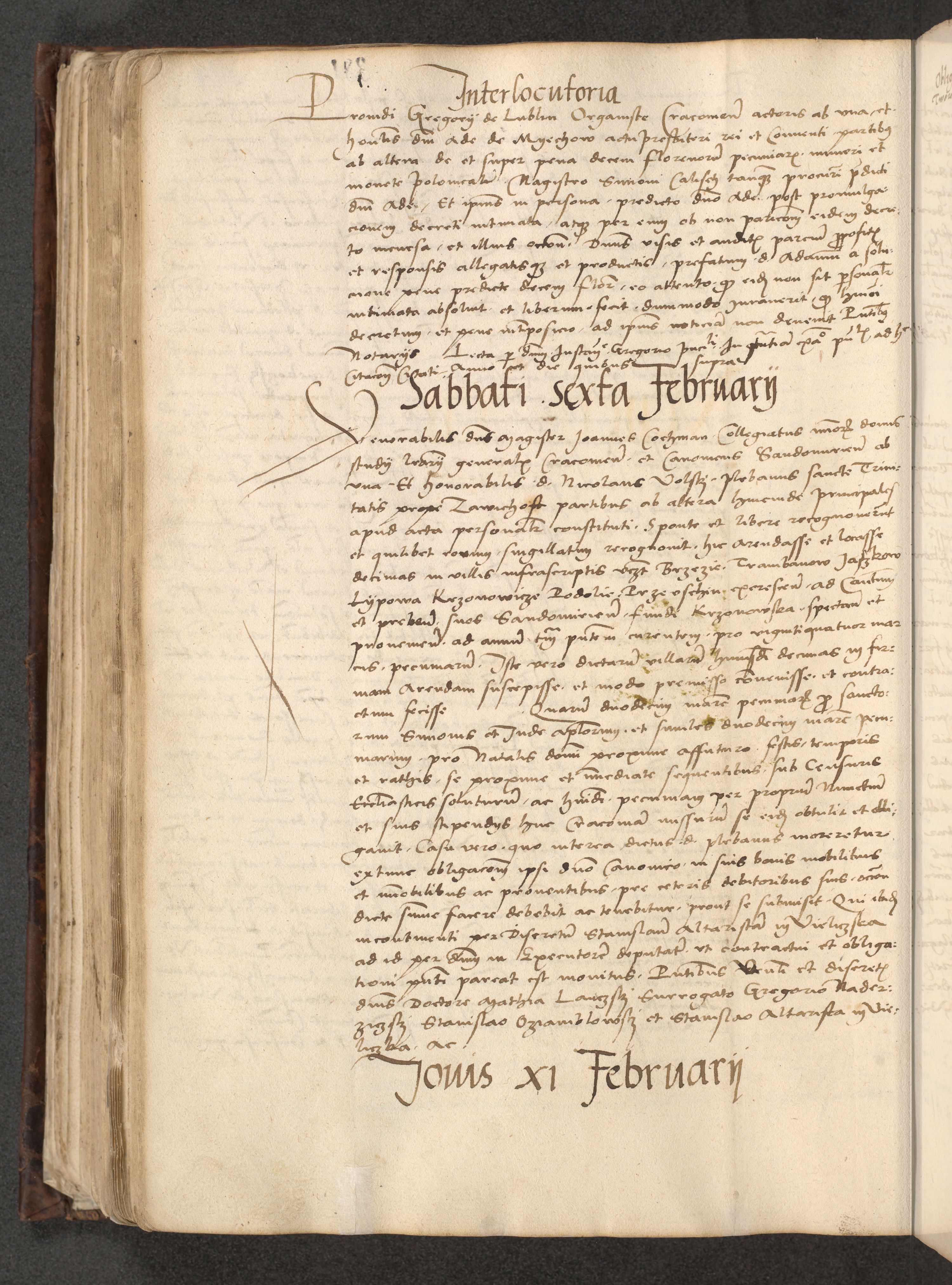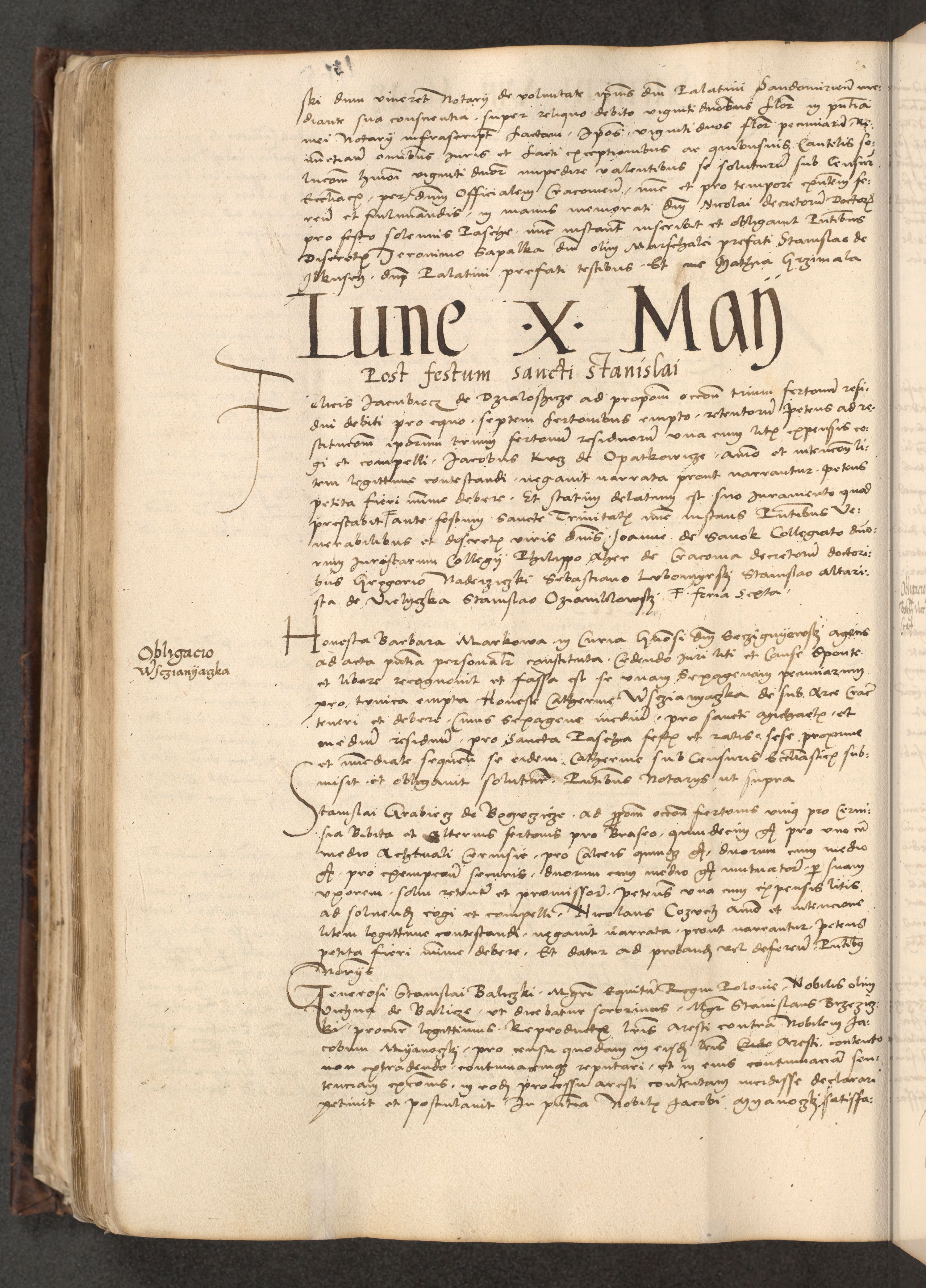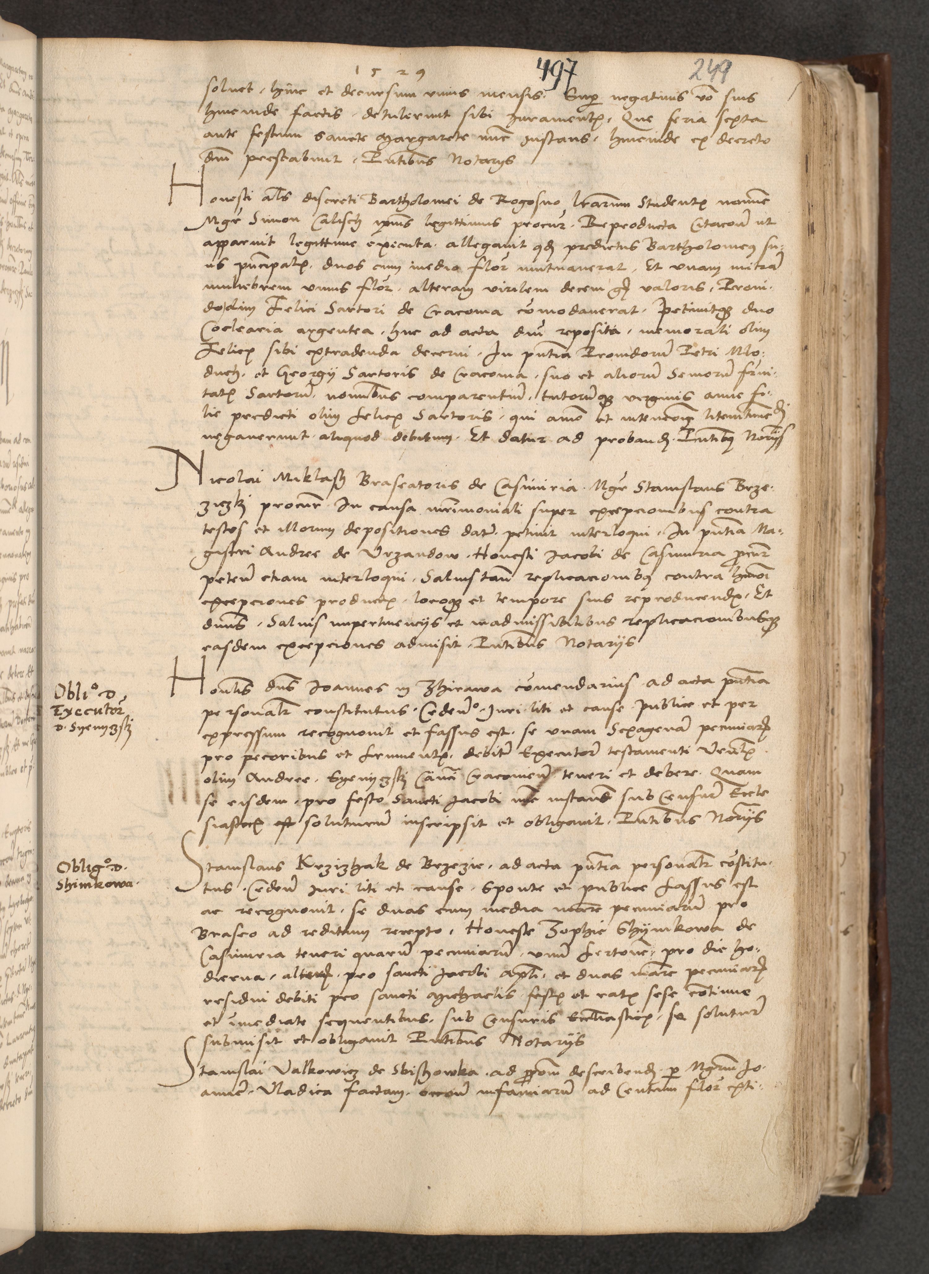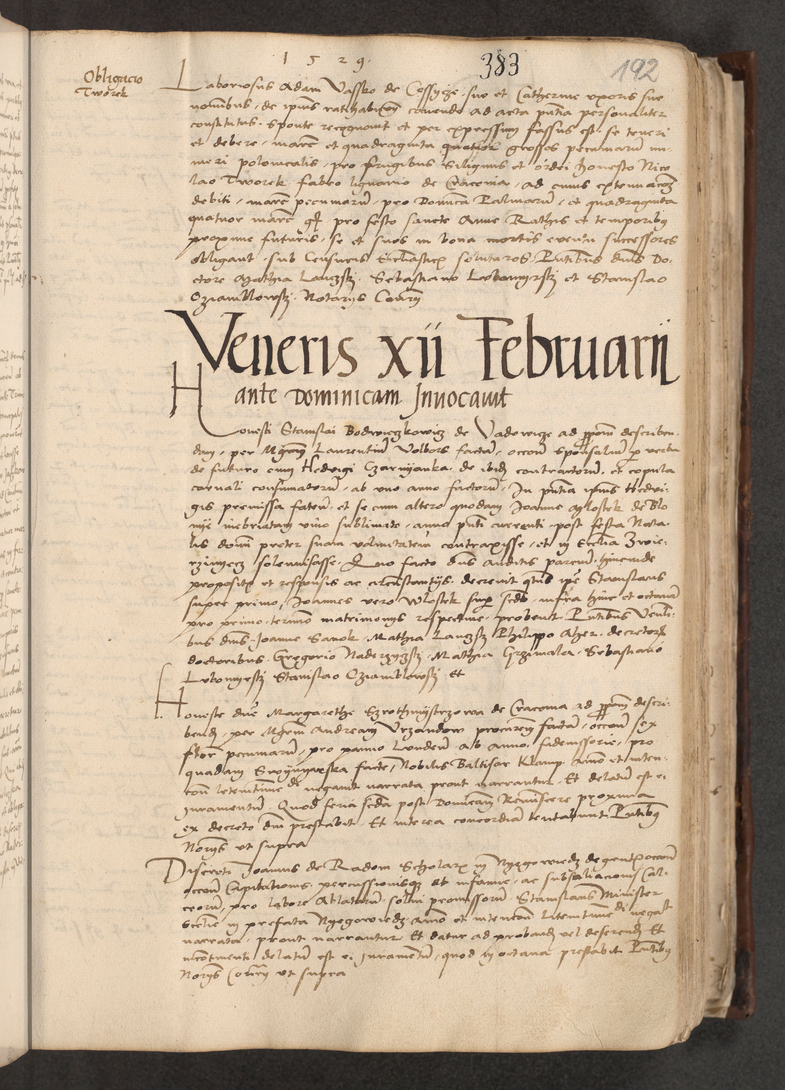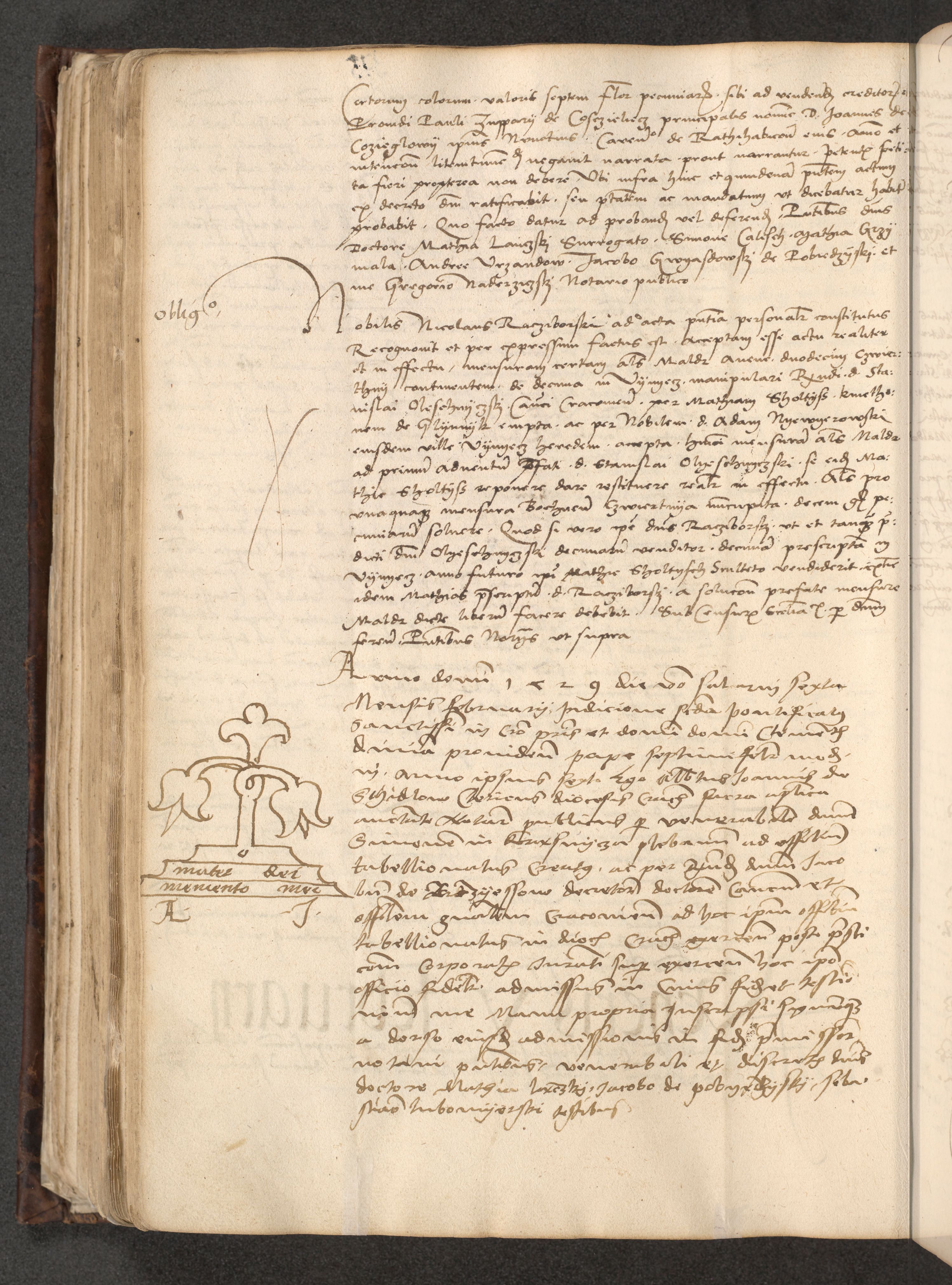INRI. Acta actorum, obligacionum et sentenciarum tam interlocutoriarum quam diffinitivarum coram reverendo patre ac egregio viro domino Jacobo Erciss[o]wski decretorum doctorem, canonico et officiali generali Cracoviensi ad annum Domini 1528, indicionem primam, pontificatus sanctissimi in Christo patris et domini domini Clementis divina probidendcia pape seprtimi, annum quintum, per Stanislaum de Mordi legalem consistorii notarium omine felici inchoantur