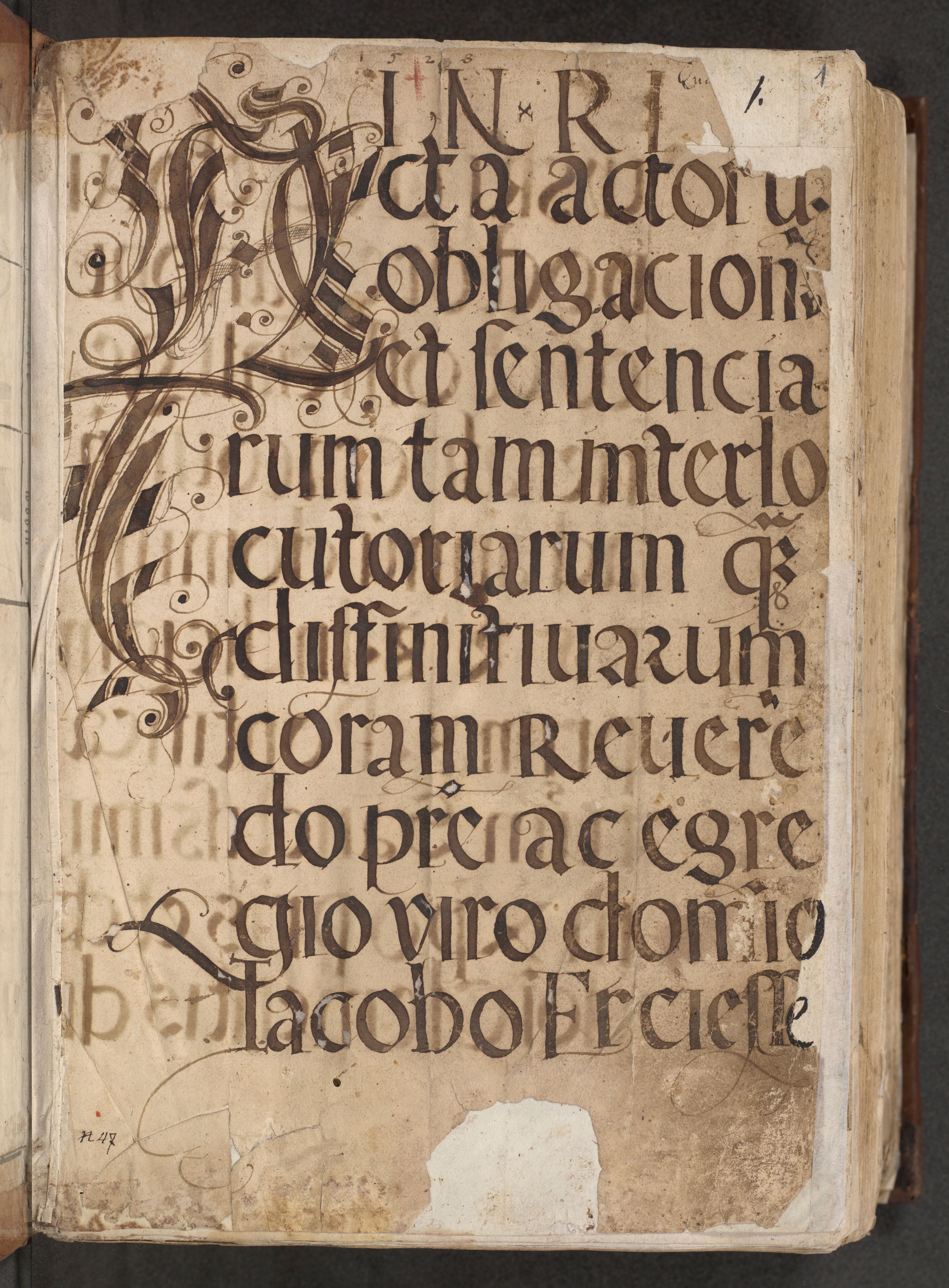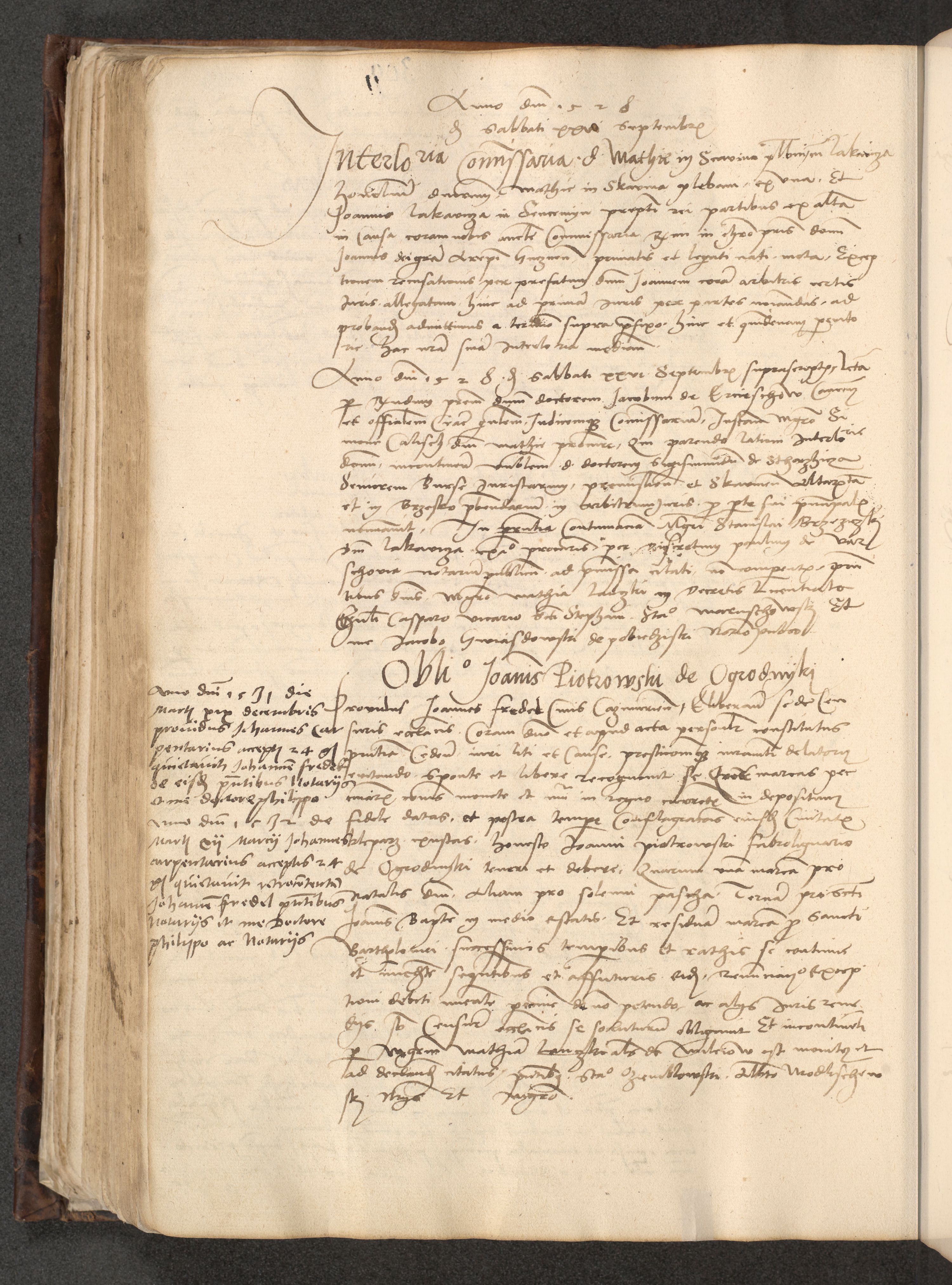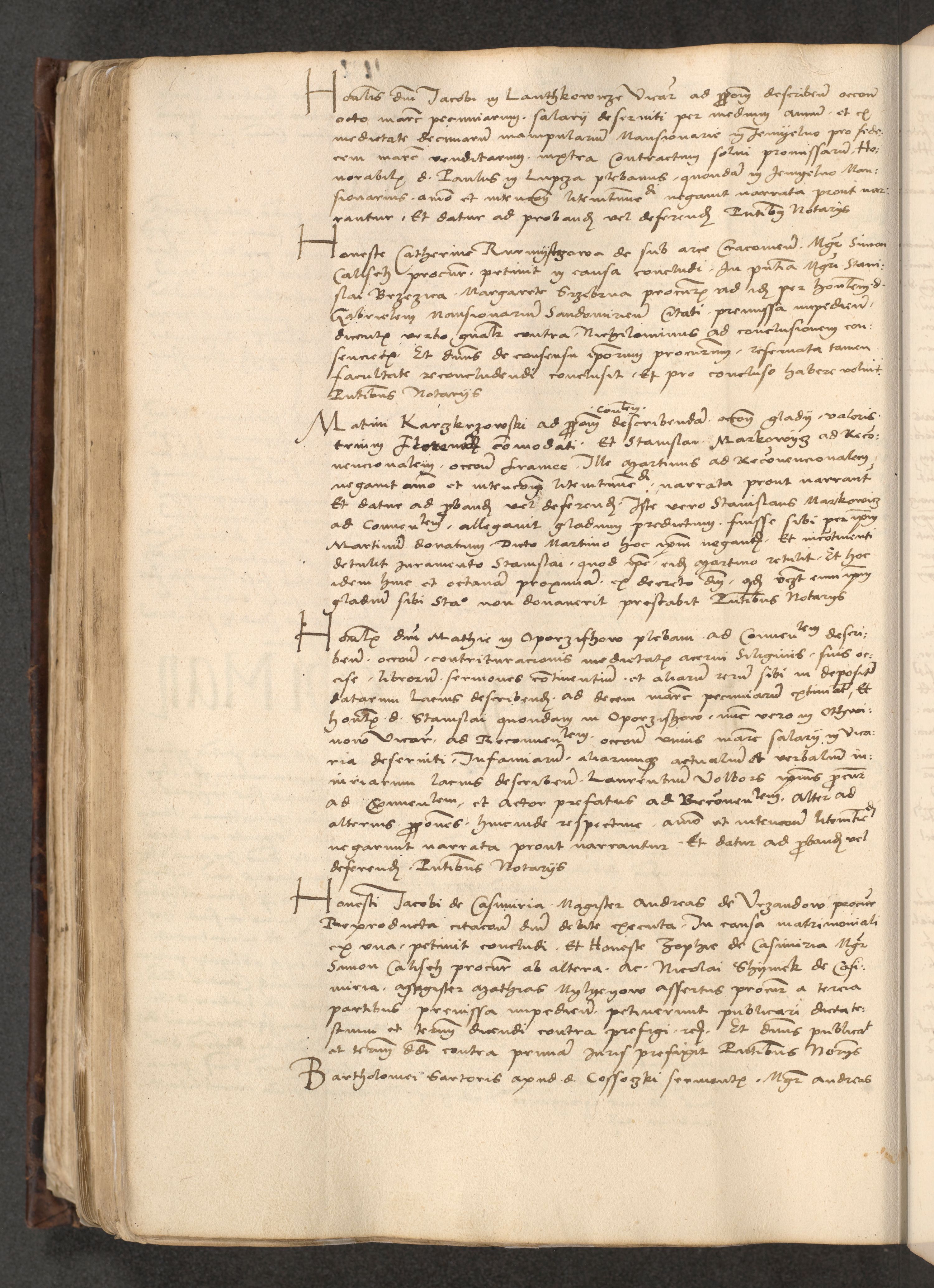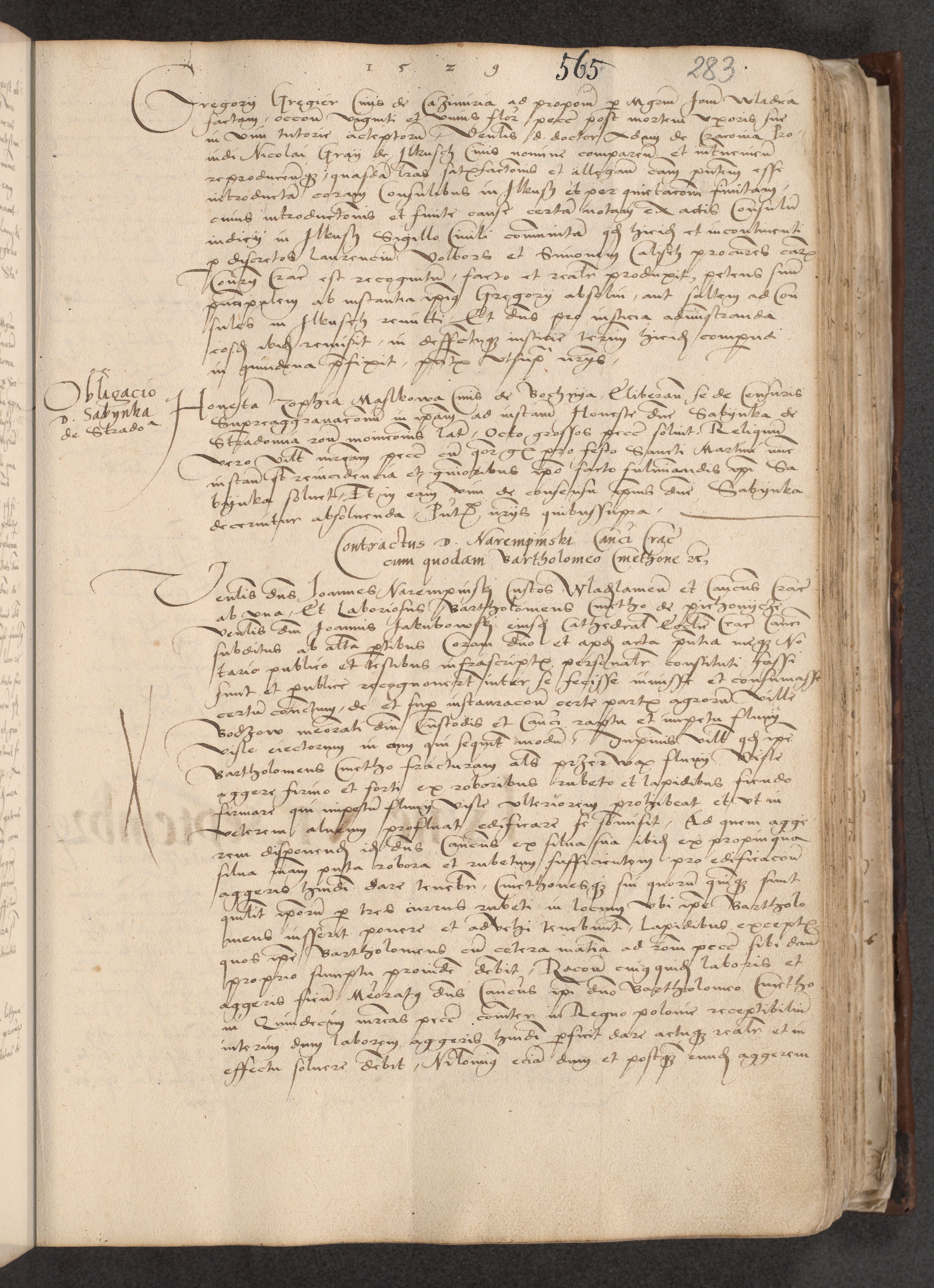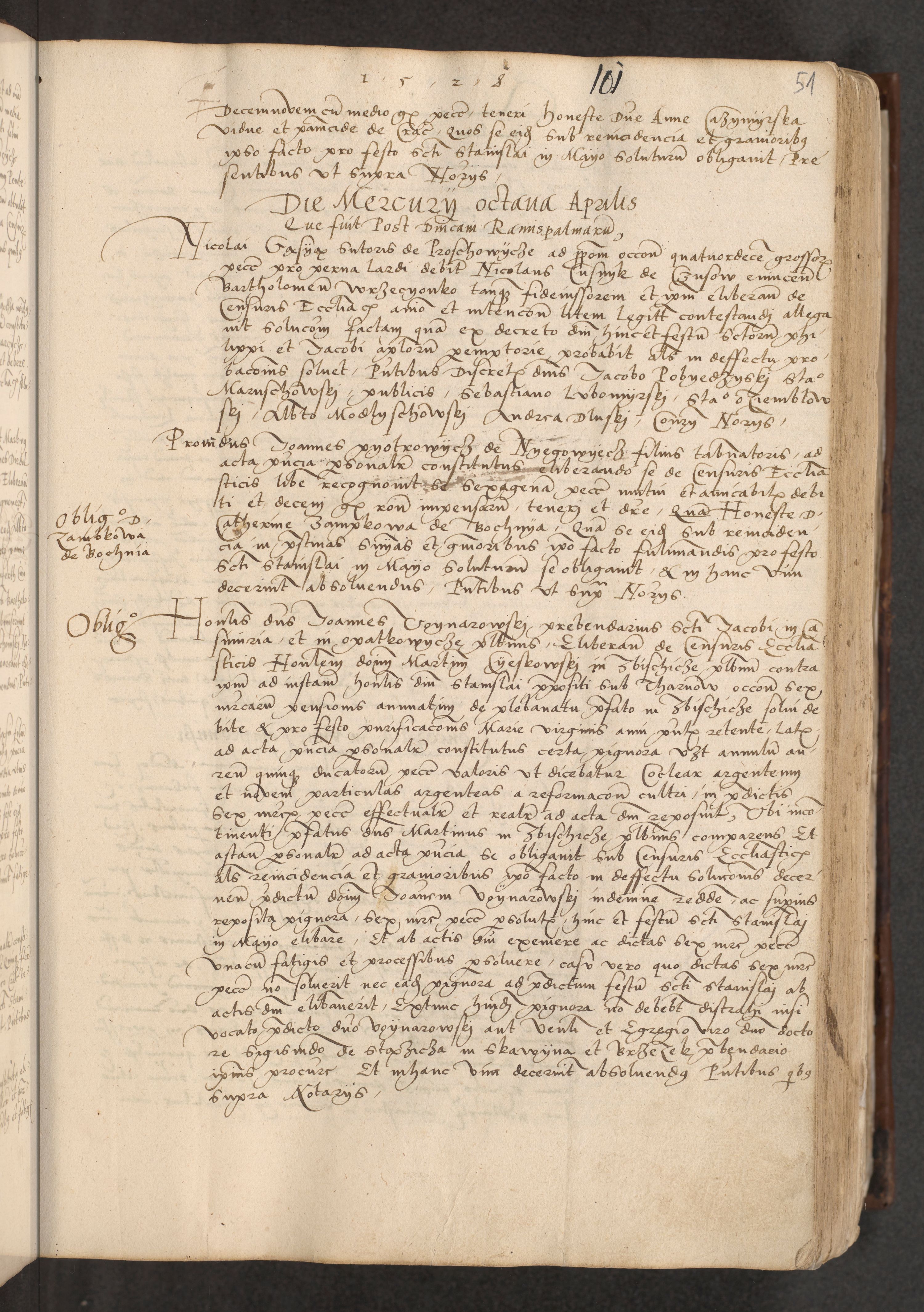 INRI. Acta actorum, obligacionum et sentenciarum tam interlocutoriarum quam diffinitivarum coram reverendo patre ac egregio viro domino Jacobo Erciss[o]wski decretorum doctorem, canonico et officiali generali Cracoviensi ad annum Domini 1528, indicionem primam, pontificatus sanctissimi in Christo patris et domini domini Clementis divina probidendcia pape seprtimi, annum quintum, per Stanislaum de Mordi legalem consistorii notarium omine felici inchoantur