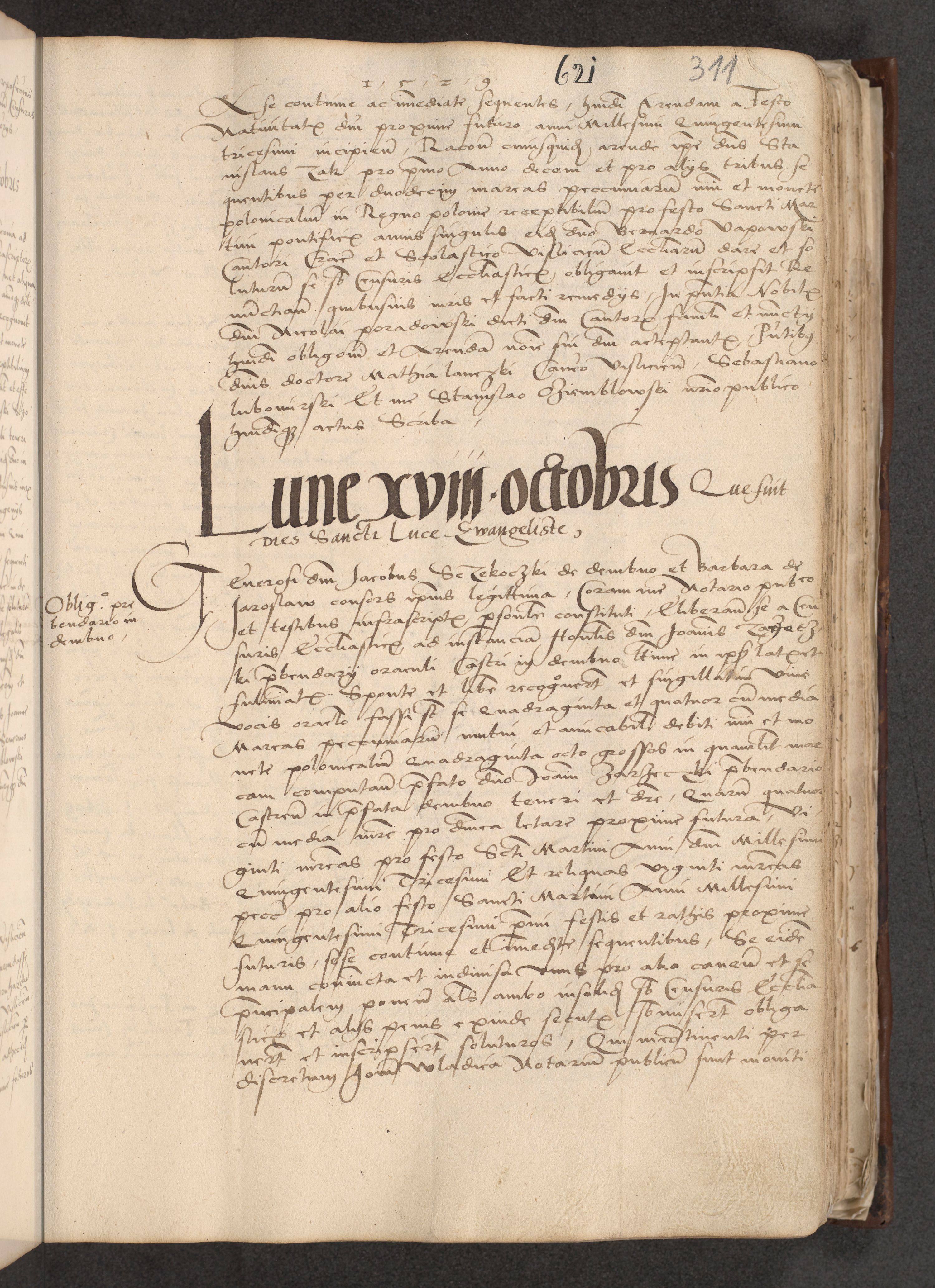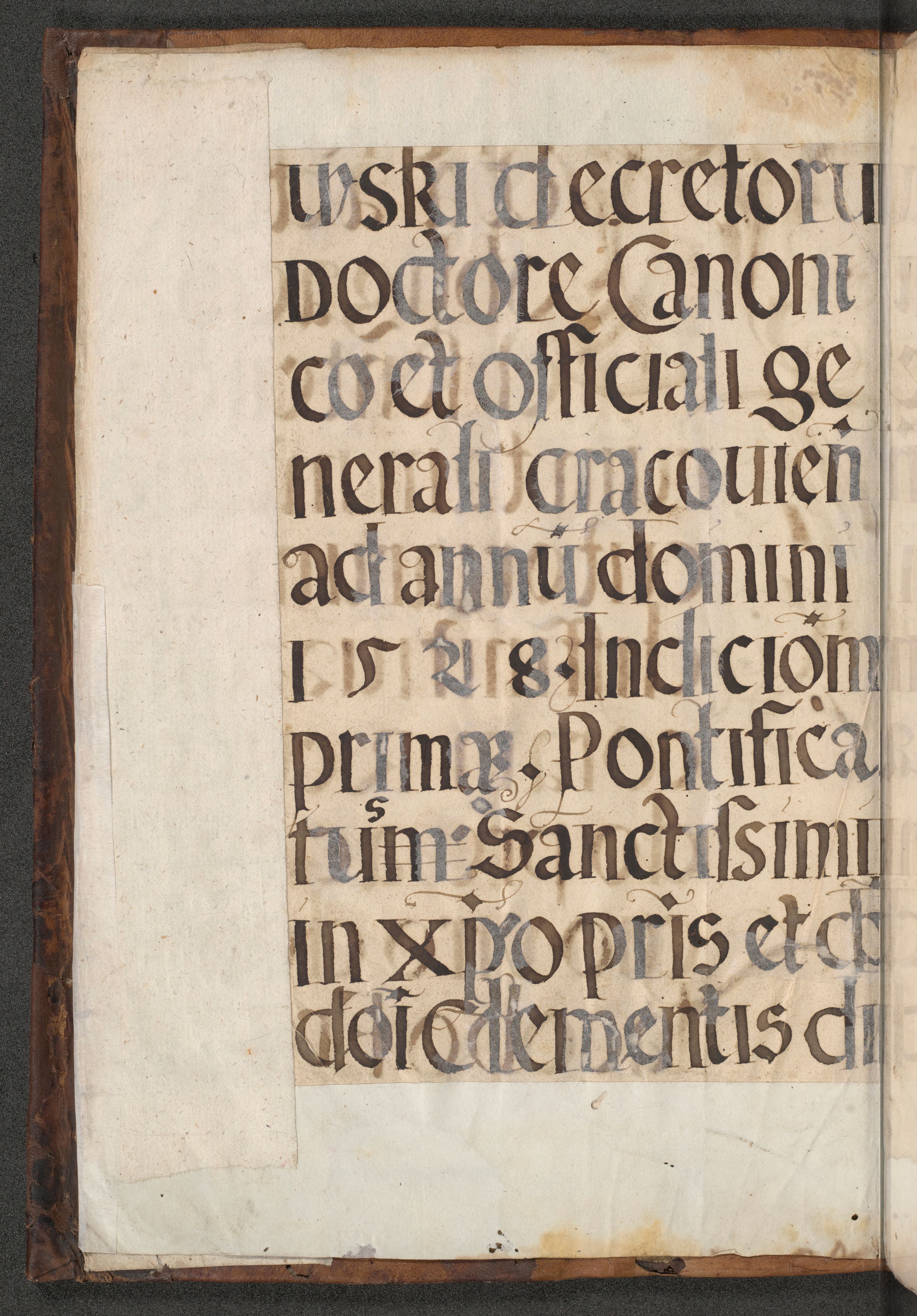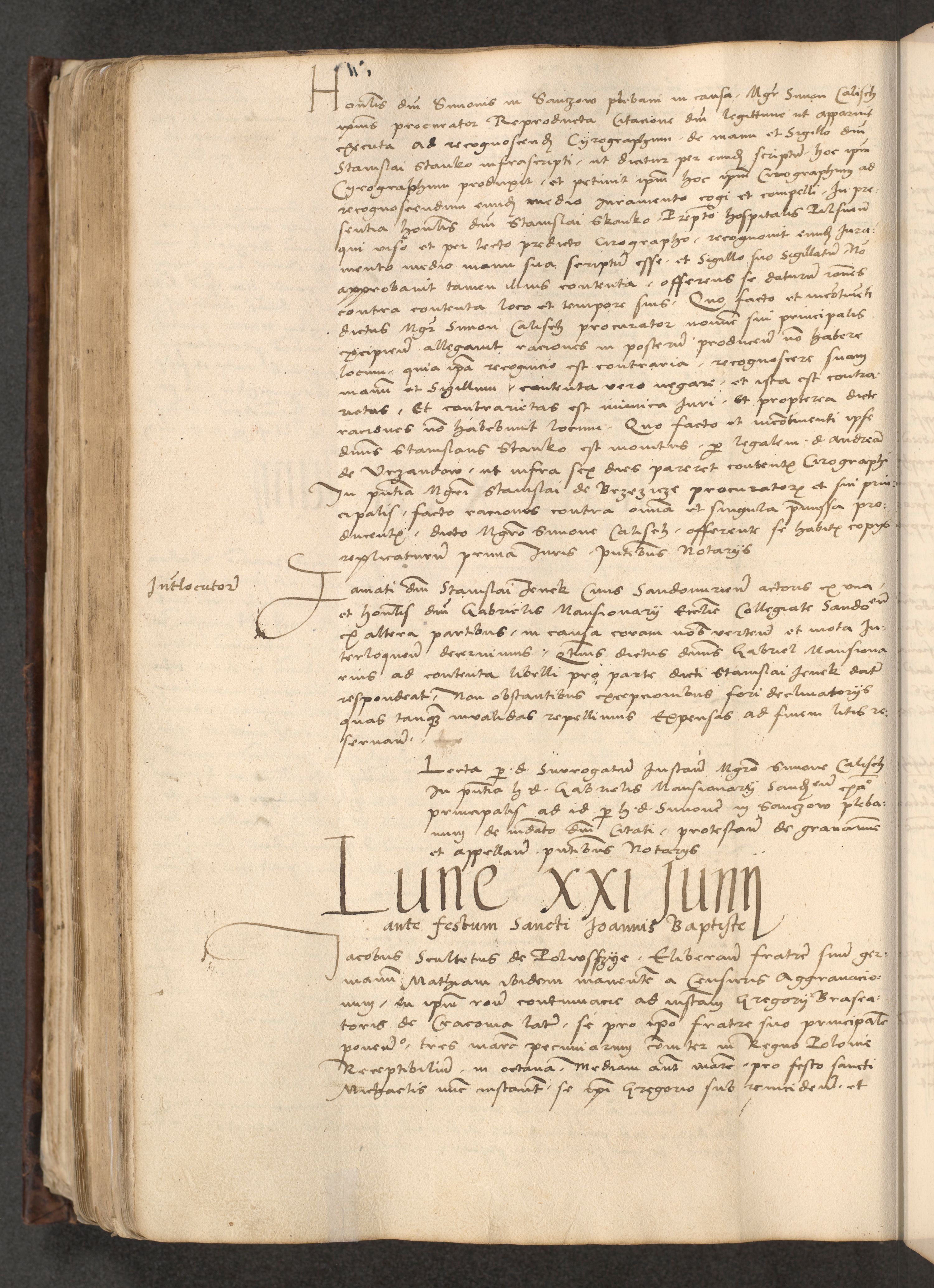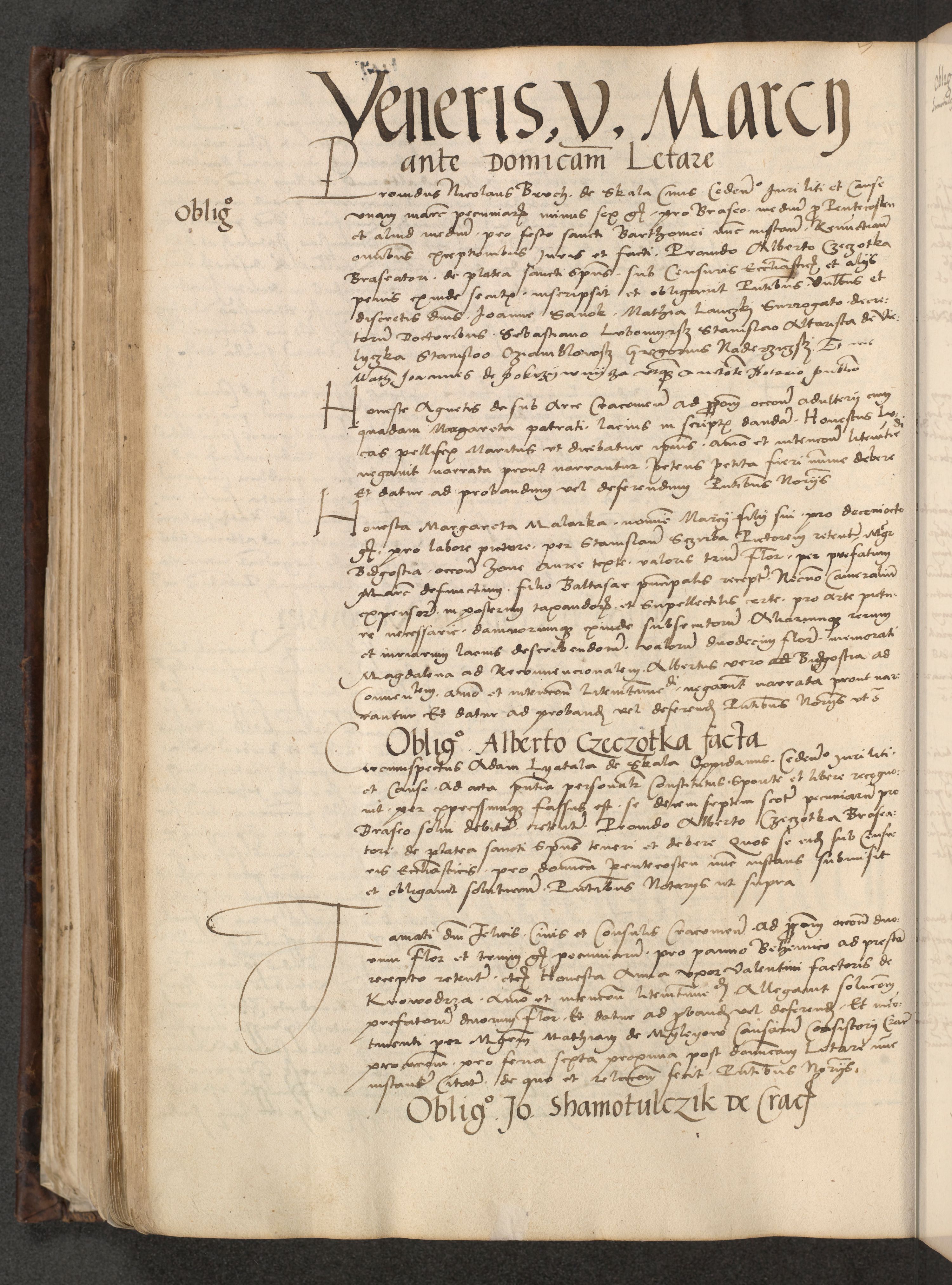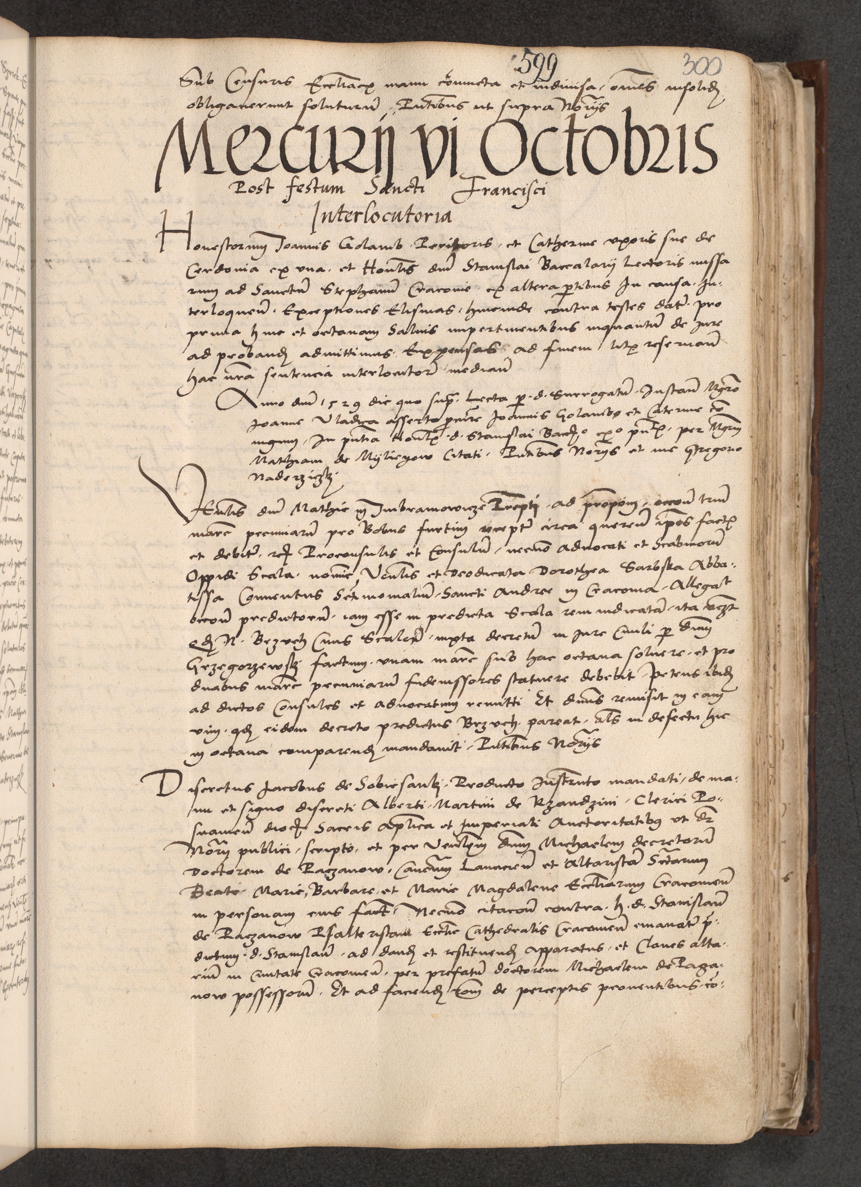 INRI. Acta actorum, obligacionum et sentenciarum tam interlocutoriarum quam diffinitivarum coram reverendo patre ac egregio viro domino Jacobo Erciss[o]wski decretorum doctorem, canonico et officiali generali Cracoviensi ad annum Domini 1528, indicionem primam, pontificatus sanctissimi in Christo patris et domini domini Clementis divina probidendcia pape seprtimi, annum quintum, per Stanislaum de Mordi legalem consistorii notarium omine felici inchoantur