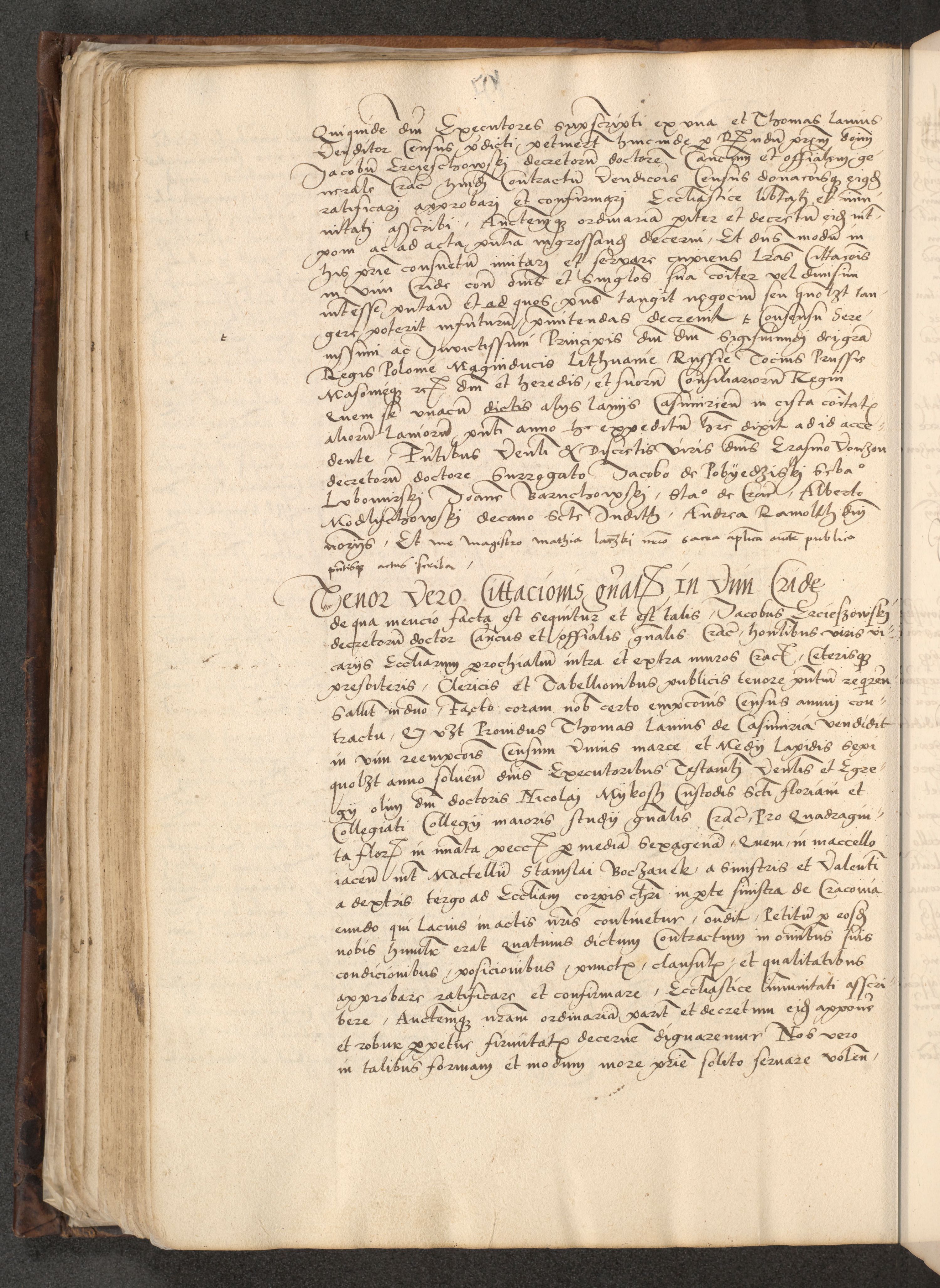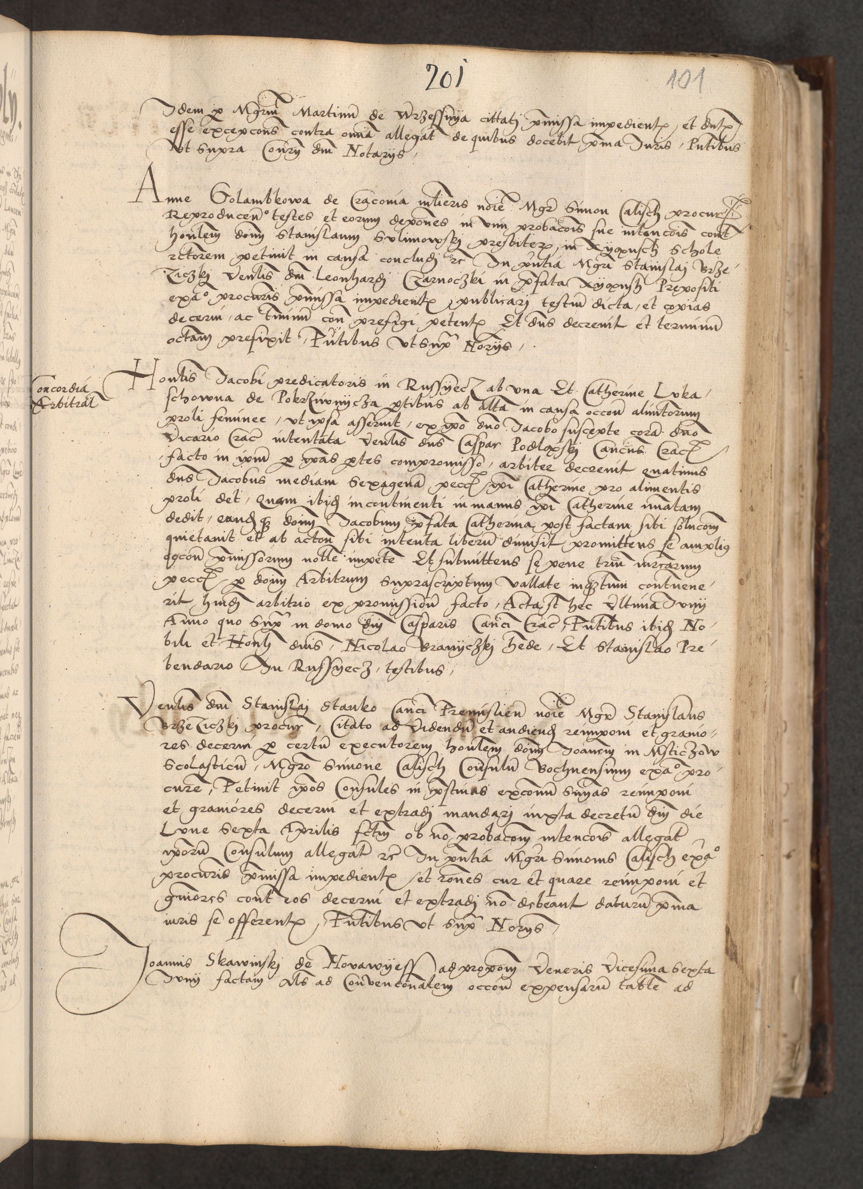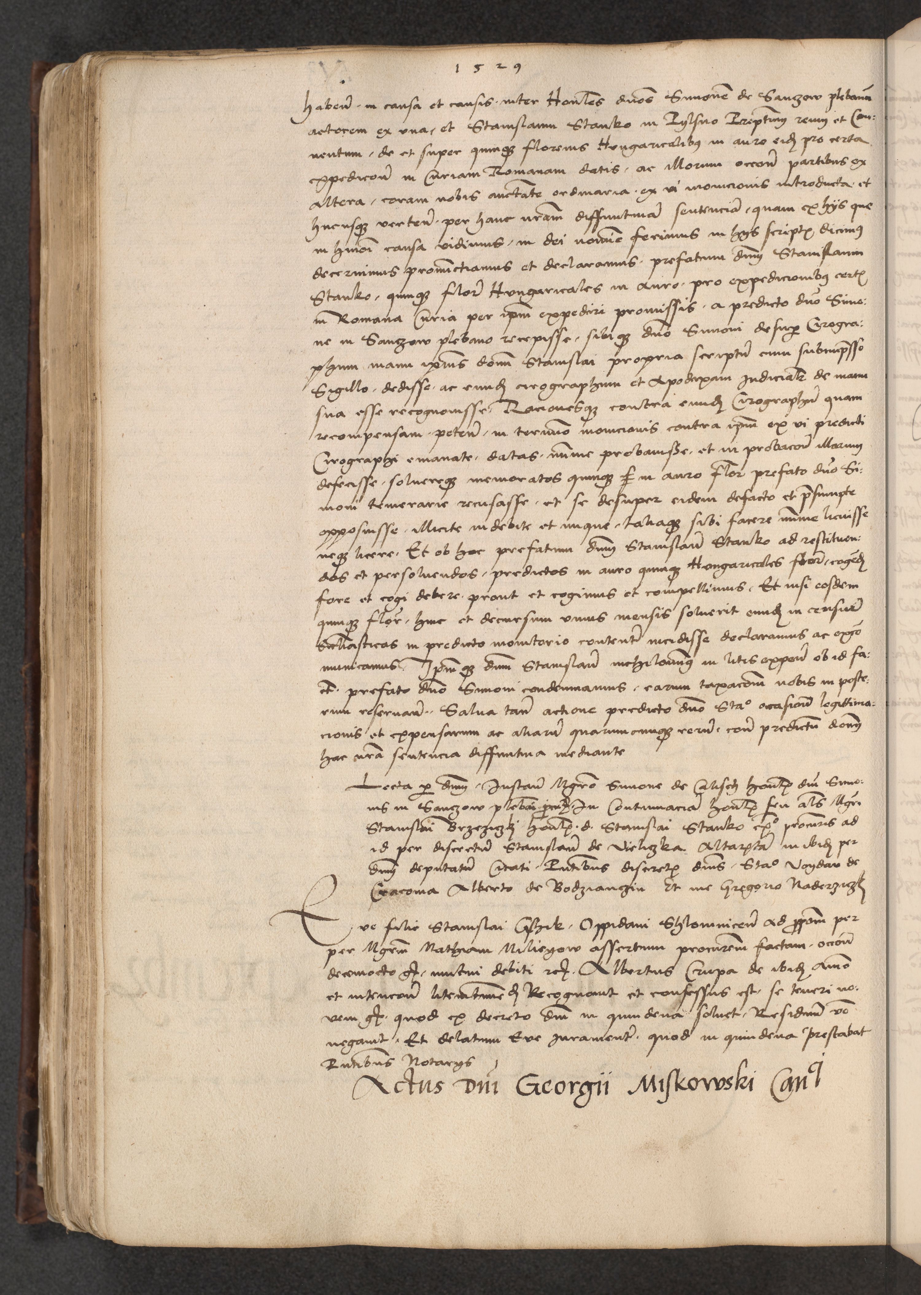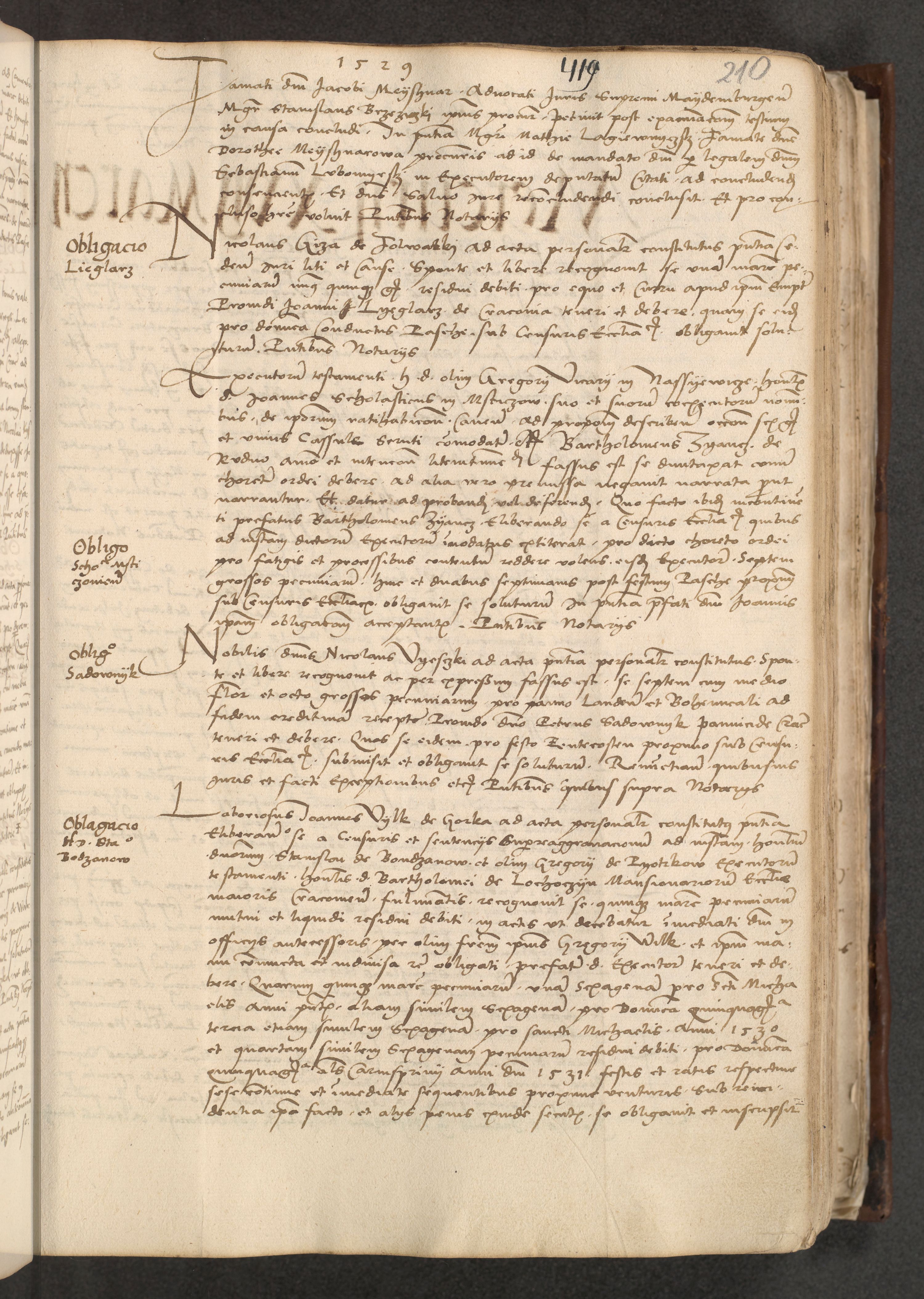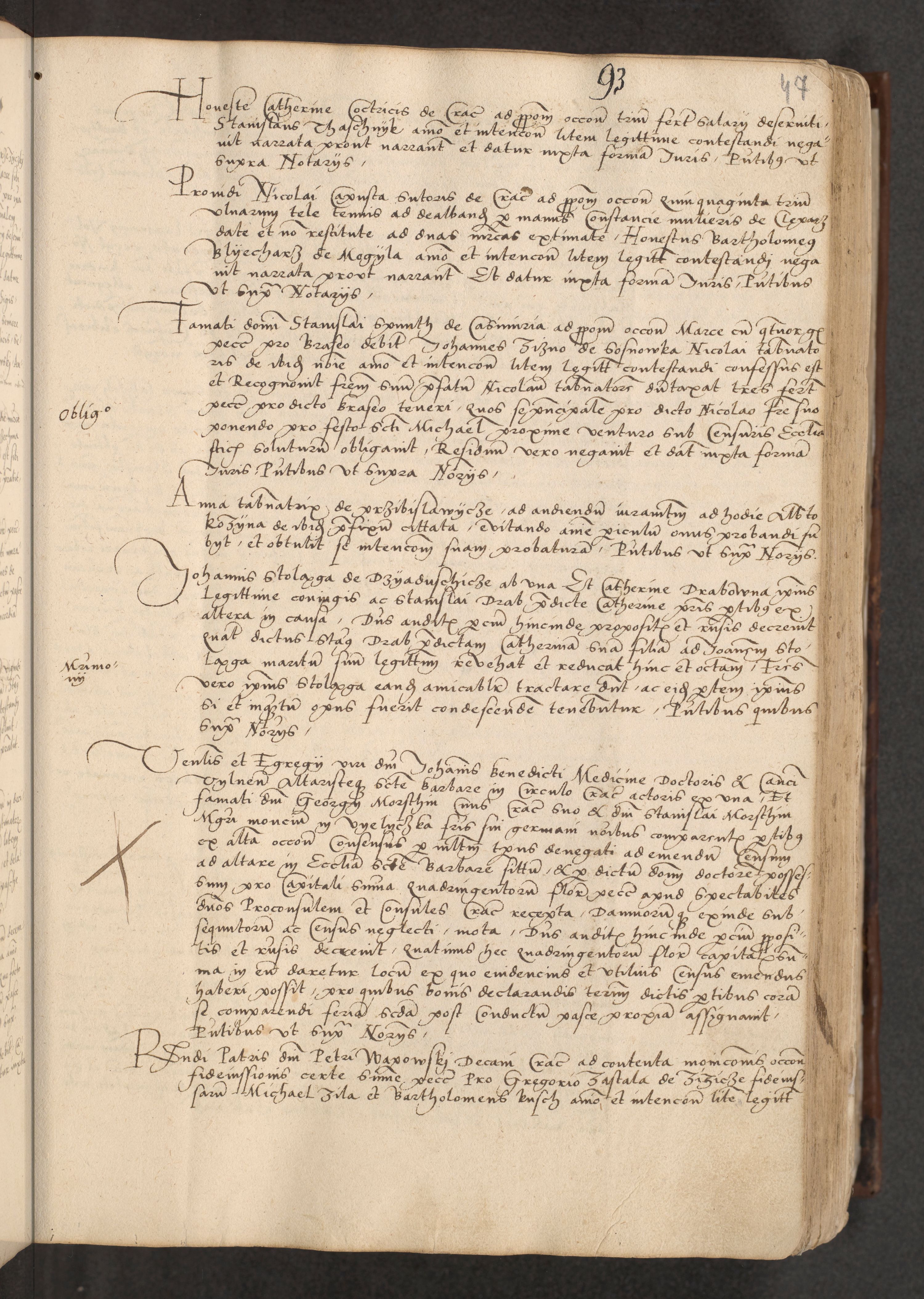 INRI. Acta actorum, obligacionum et sentenciarum tam interlocutoriarum quam diffinitivarum coram reverendo patre ac egregio viro domino Jacobo Erciss[o]wski decretorum doctorem, canonico et officiali generali Cracoviensi ad annum Domini 1528, indicionem primam, pontificatus sanctissimi in Christo patris et domini domini Clementis divina probidendcia pape seprtimi, annum quintum, per Stanislaum de Mordi legalem consistorii notarium omine felici inchoantur