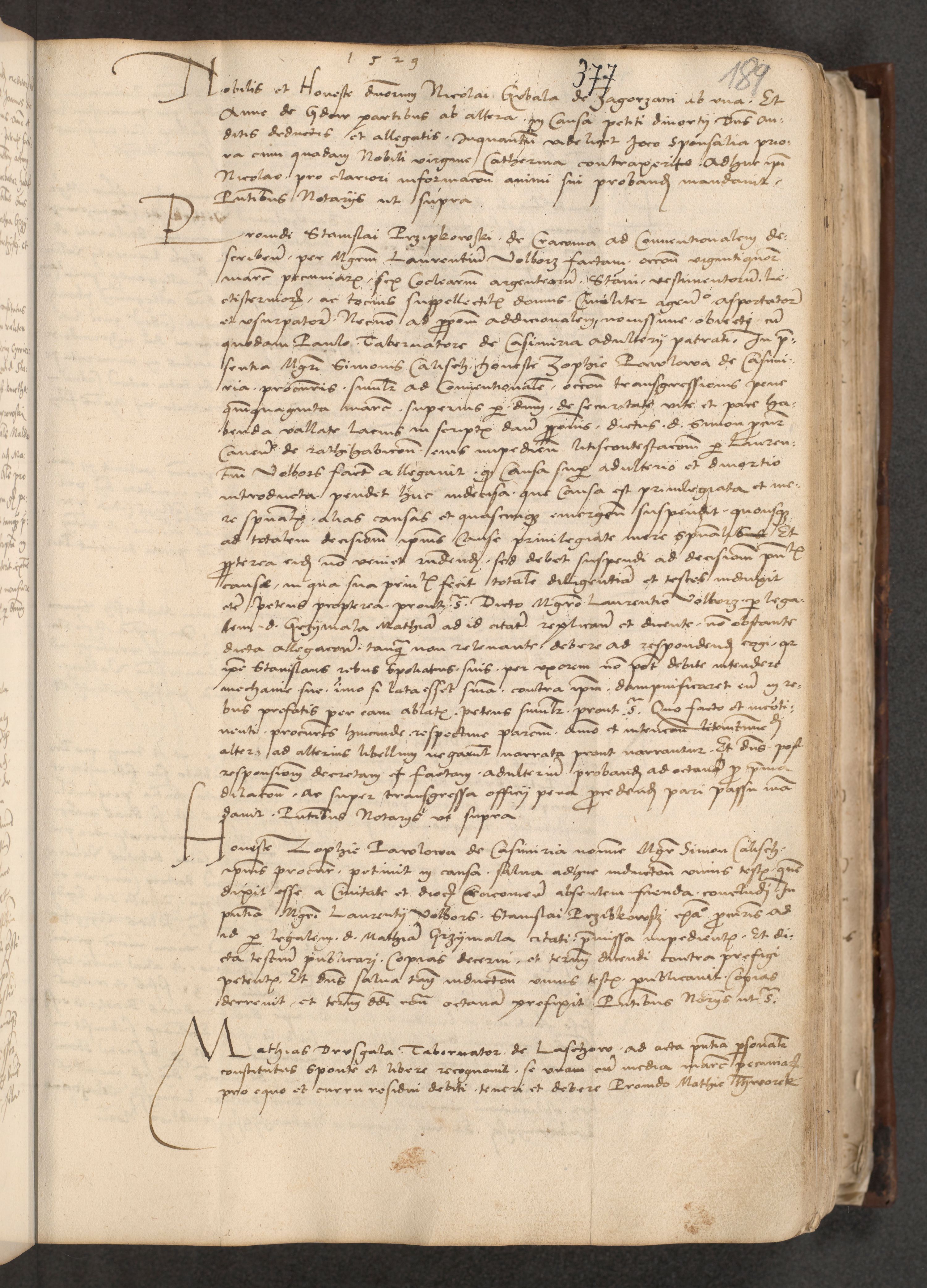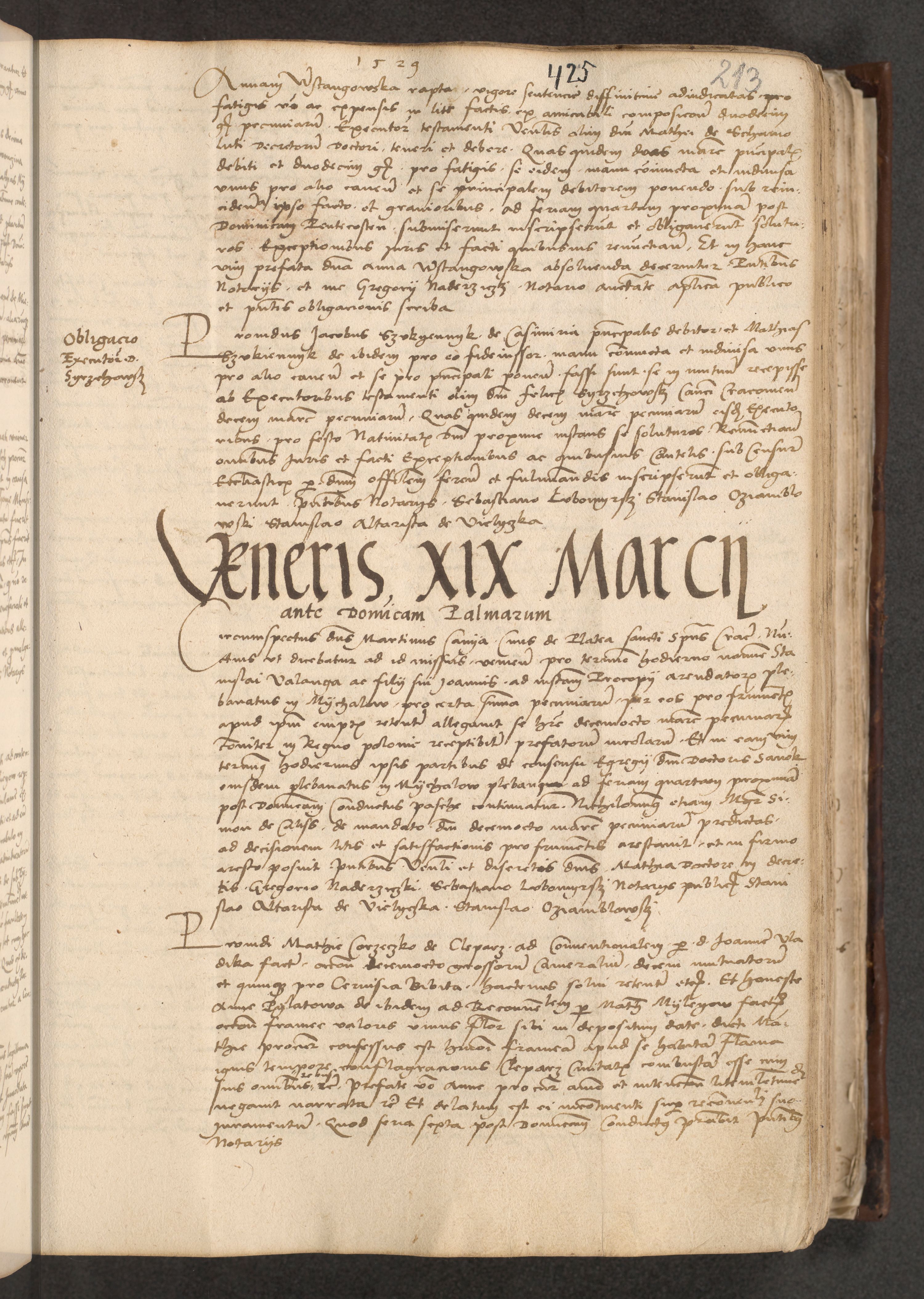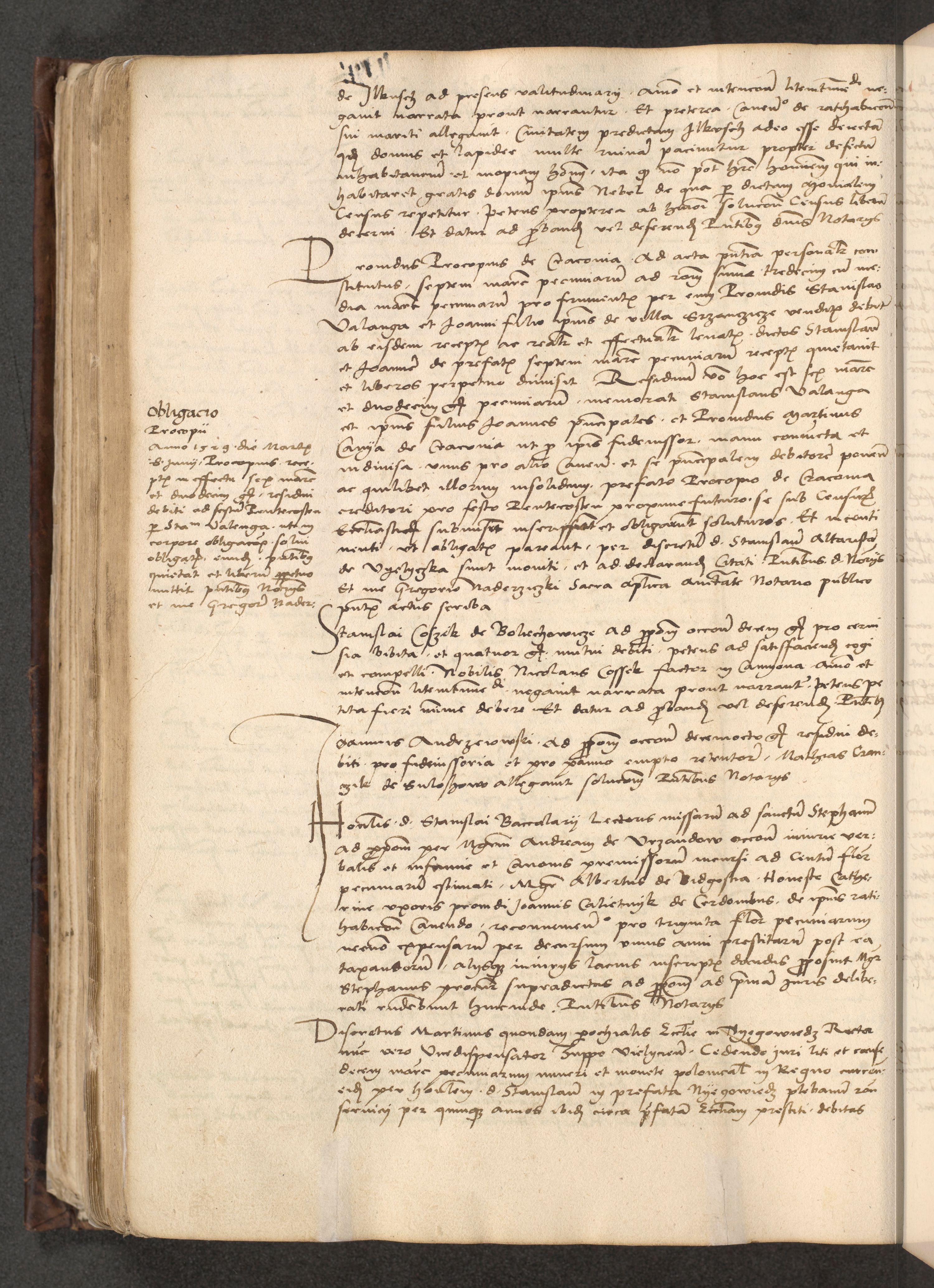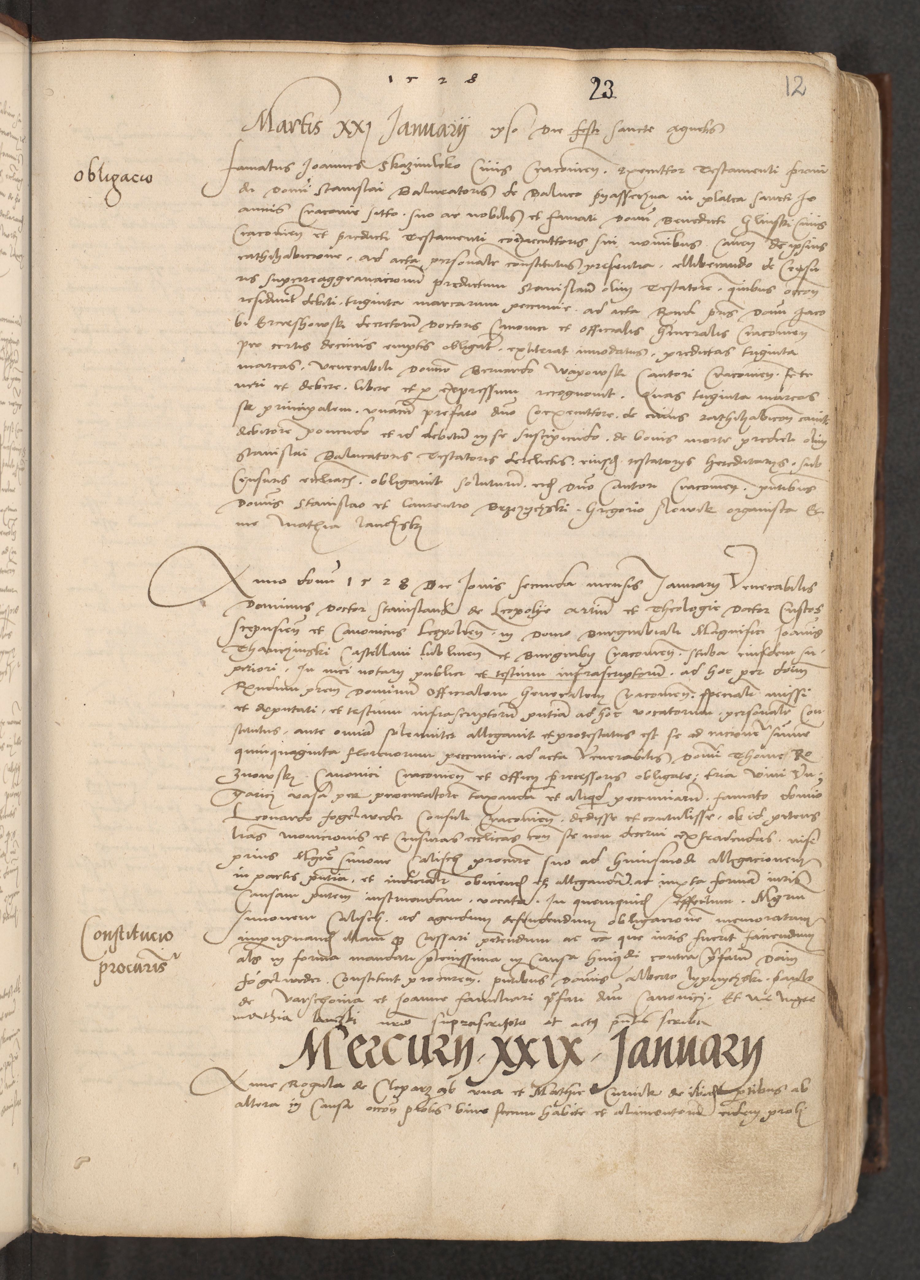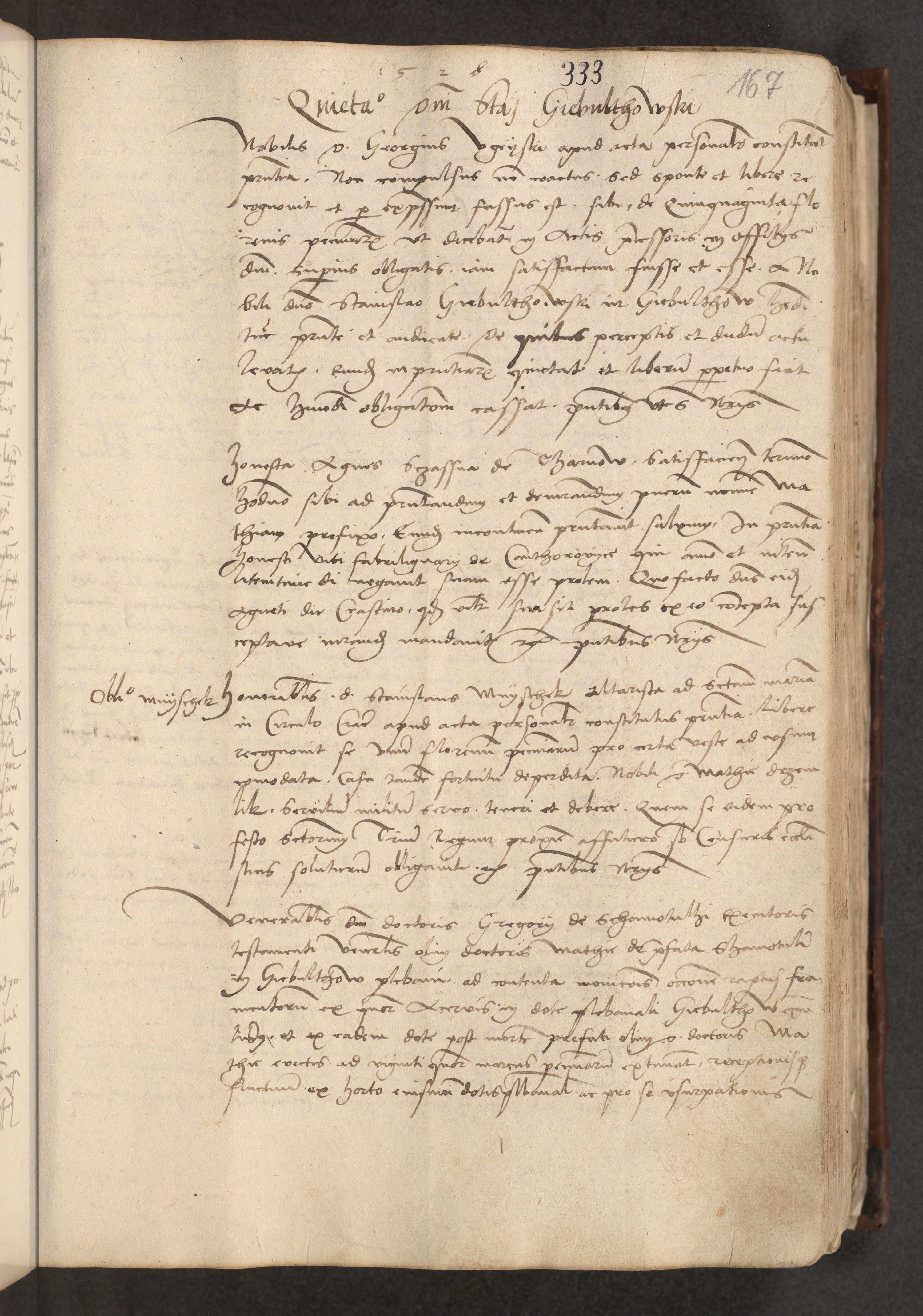 INRI. Acta actorum, obligacionum et sentenciarum tam interlocutoriarum quam diffinitivarum coram reverendo patre ac egregio viro domino Jacobo Erciss[o]wski decretorum doctorem, canonico et officiali generali Cracoviensi ad annum Domini 1528, indicionem primam, pontificatus sanctissimi in Christo patris et domini domini Clementis divina probidendcia pape seprtimi, annum quintum, per Stanislaum de Mordi legalem consistorii notarium omine felici inchoantur