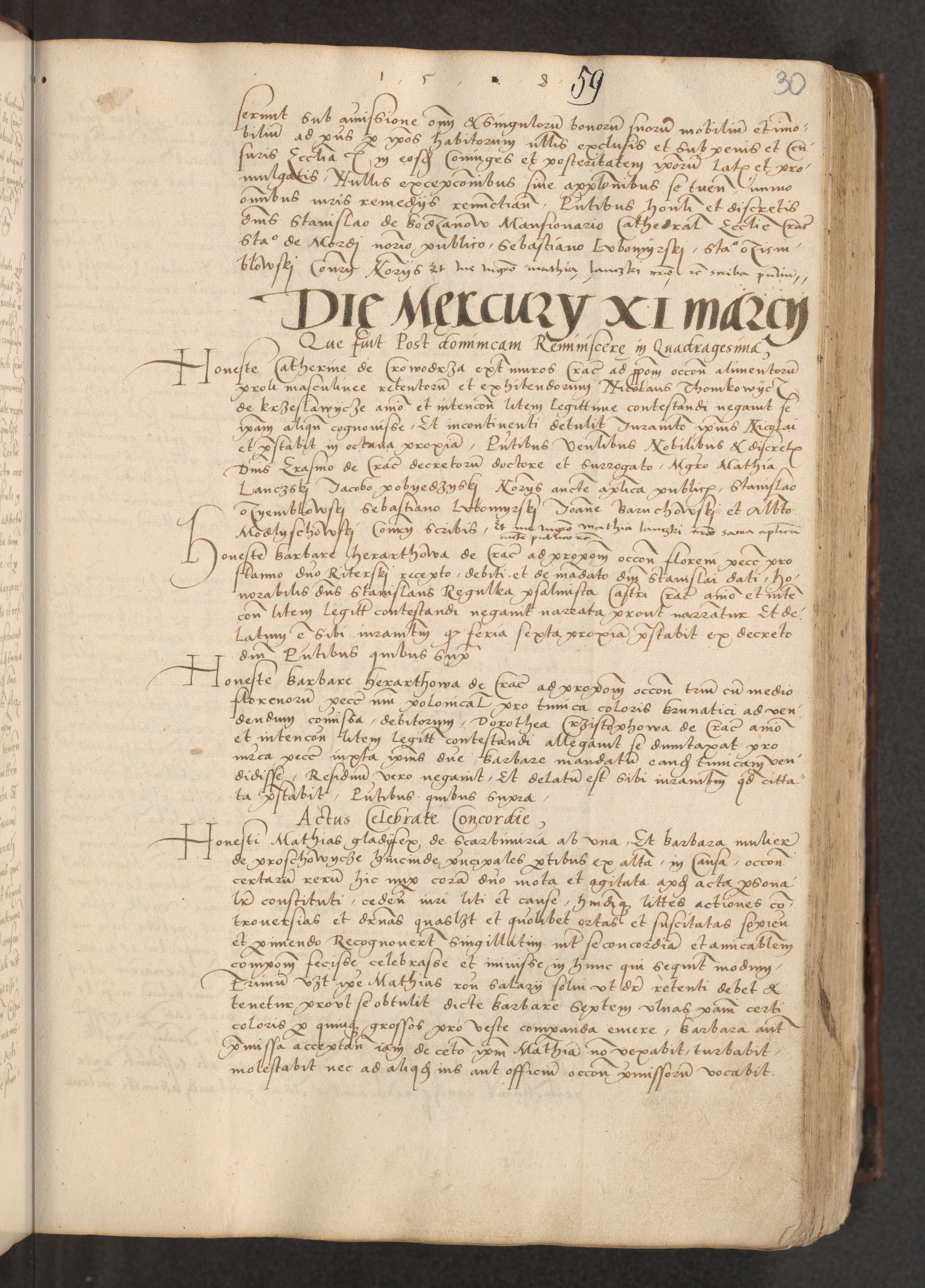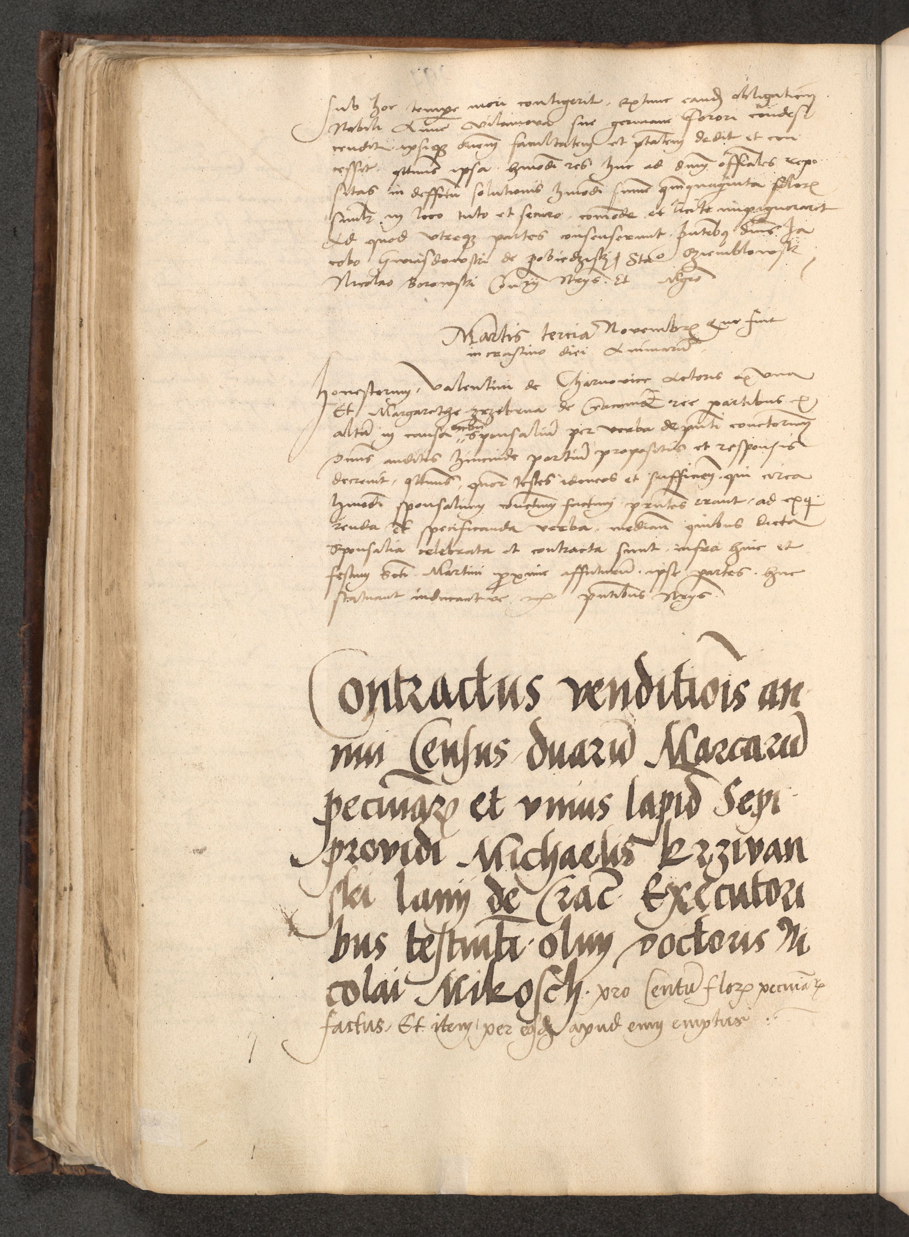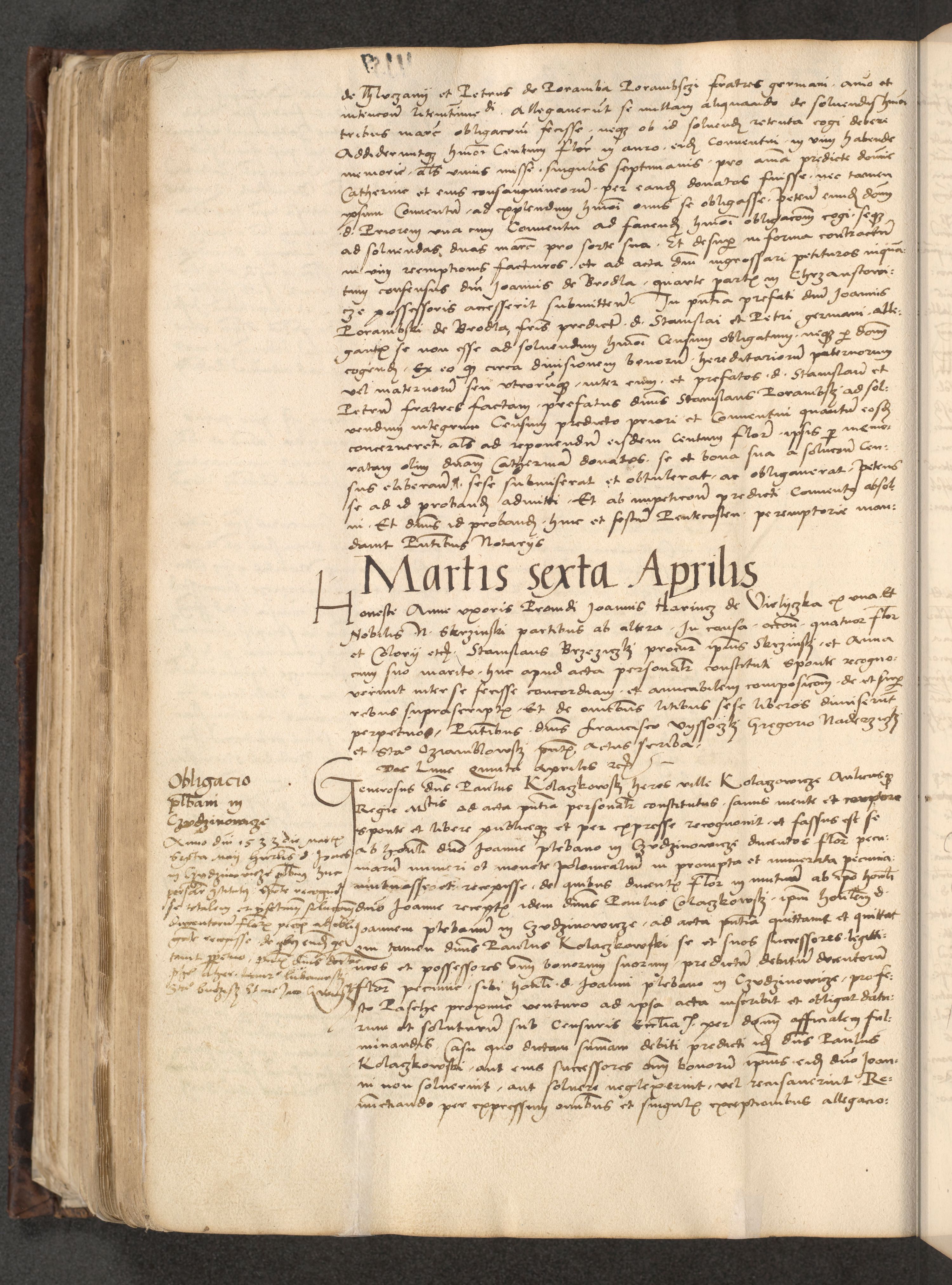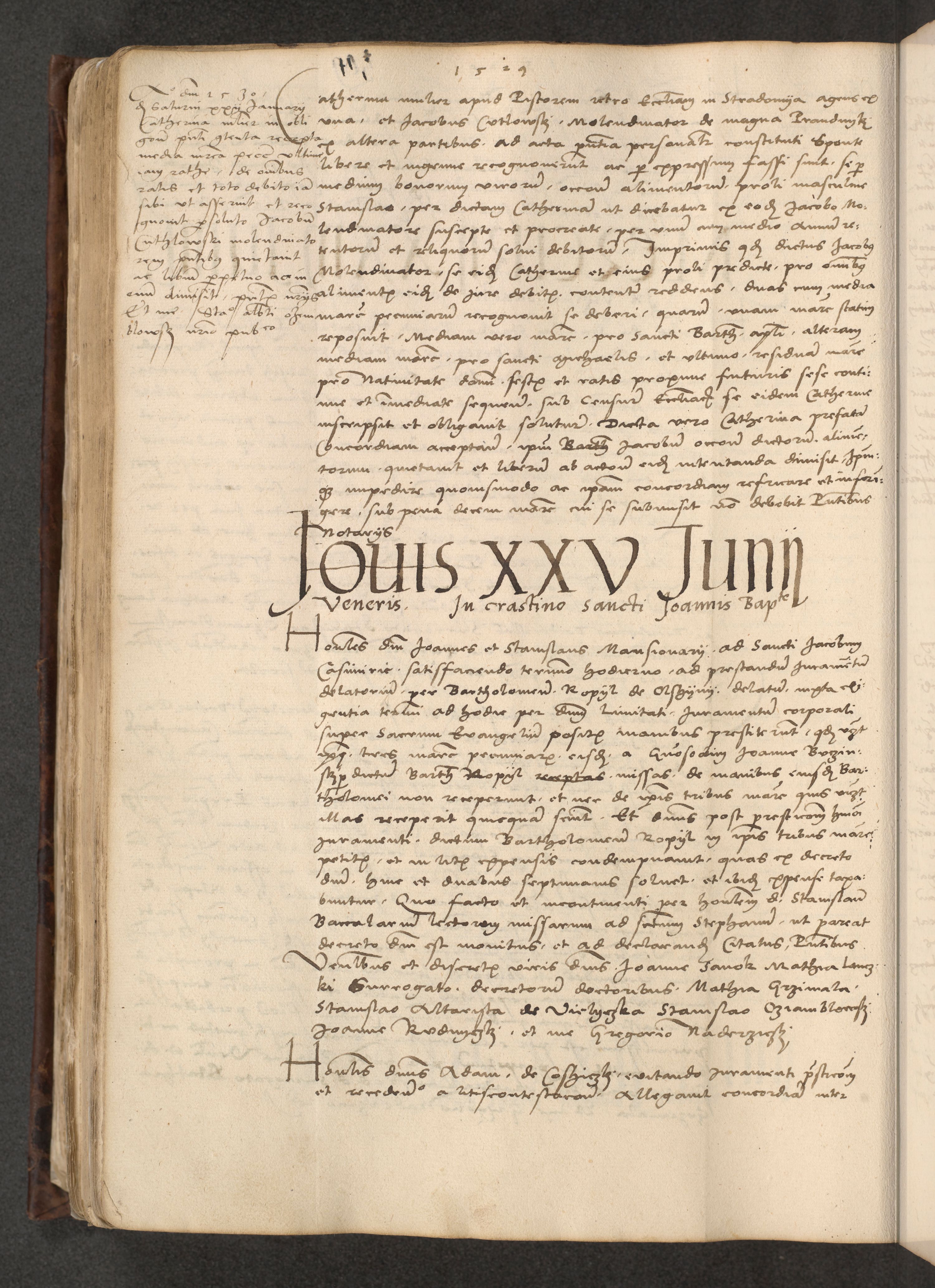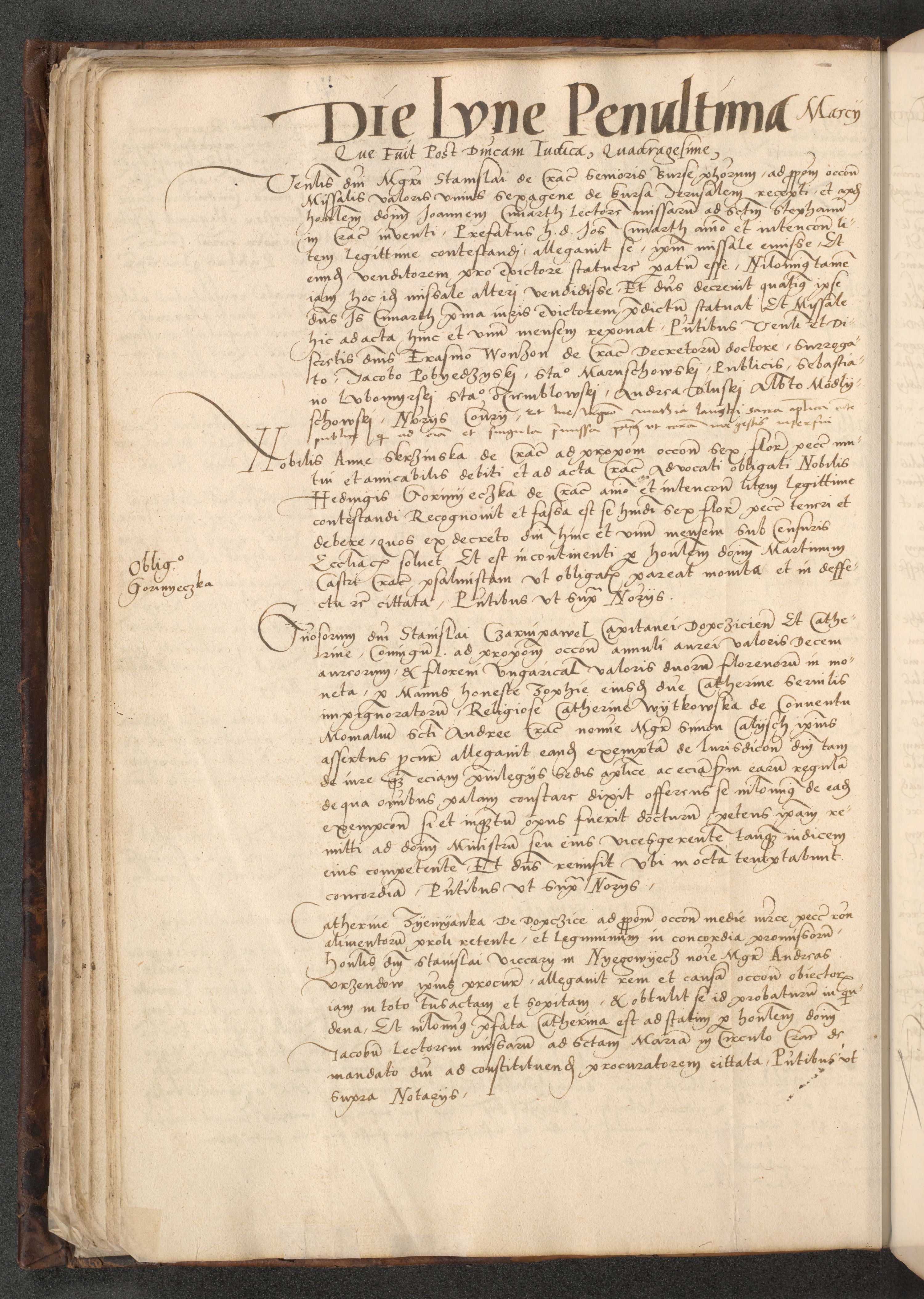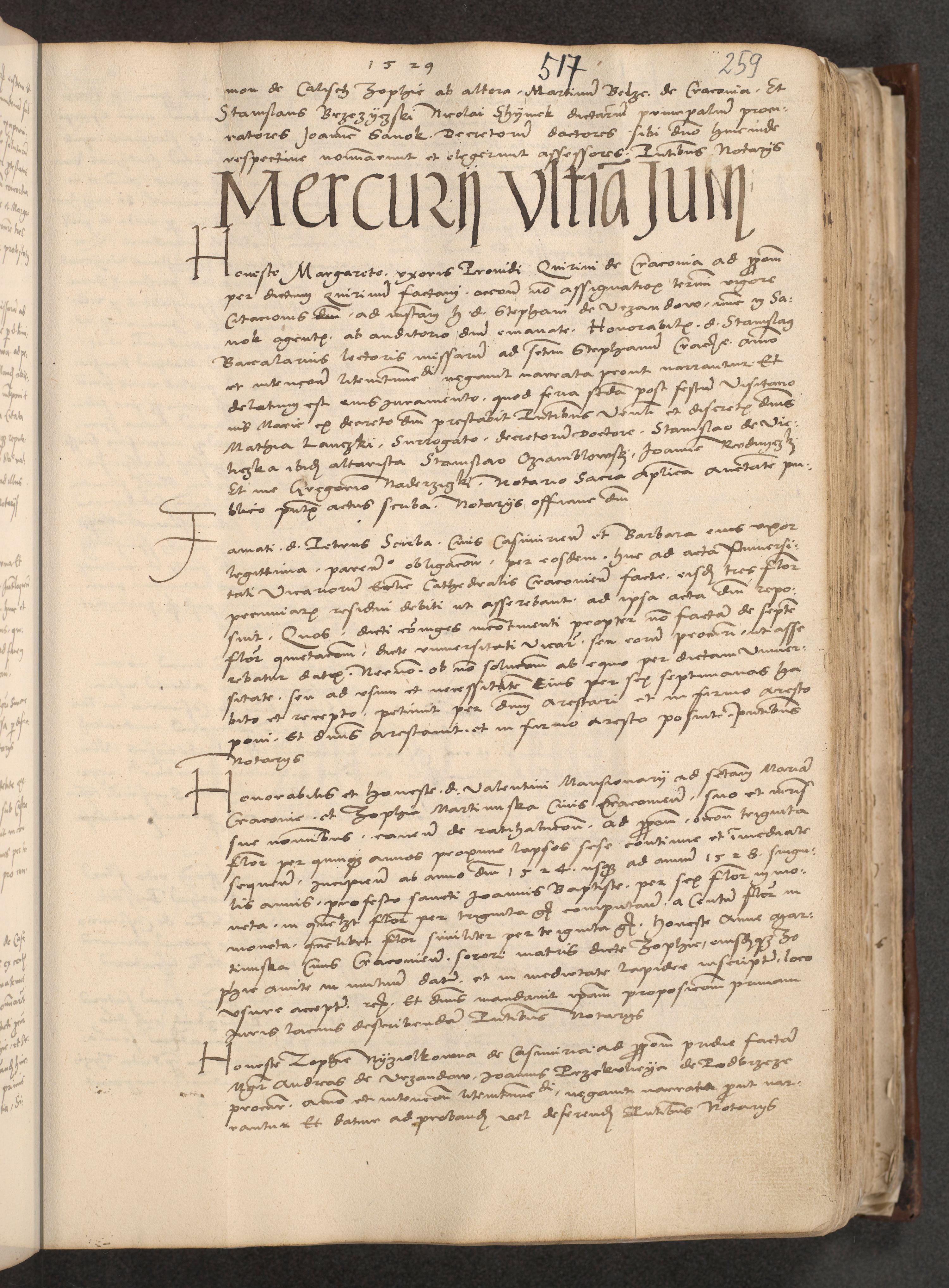 INRI. Acta actorum, obligacionum et sentenciarum tam interlocutoriarum quam diffinitivarum coram reverendo patre ac egregio viro domino Jacobo Erciss[o]wski decretorum doctorem, canonico et officiali generali Cracoviensi ad annum Domini 1528, indicionem primam, pontificatus sanctissimi in Christo patris et domini domini Clementis divina probidendcia pape seprtimi, annum quintum, per Stanislaum de Mordi legalem consistorii notarium omine felici inchoantur