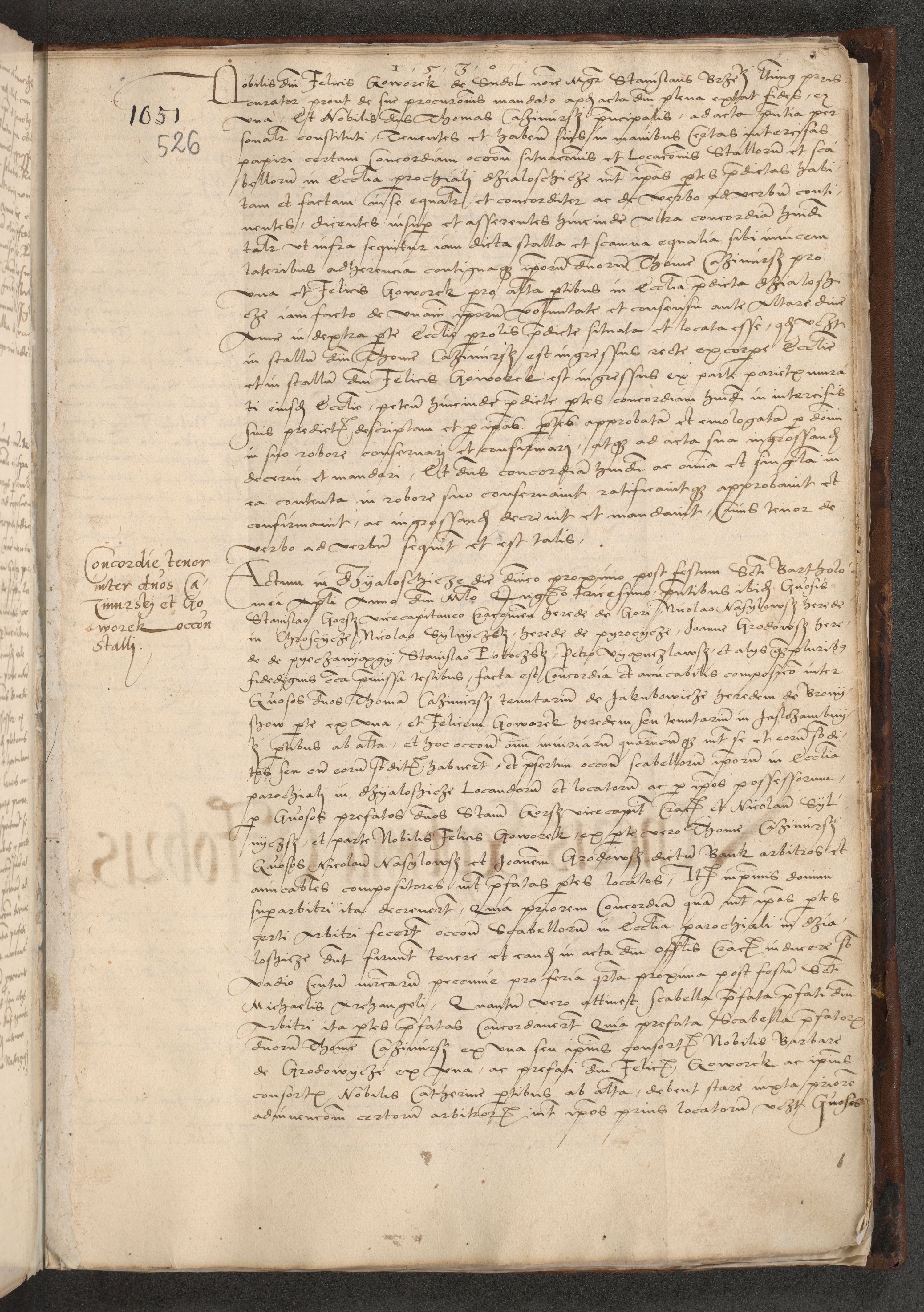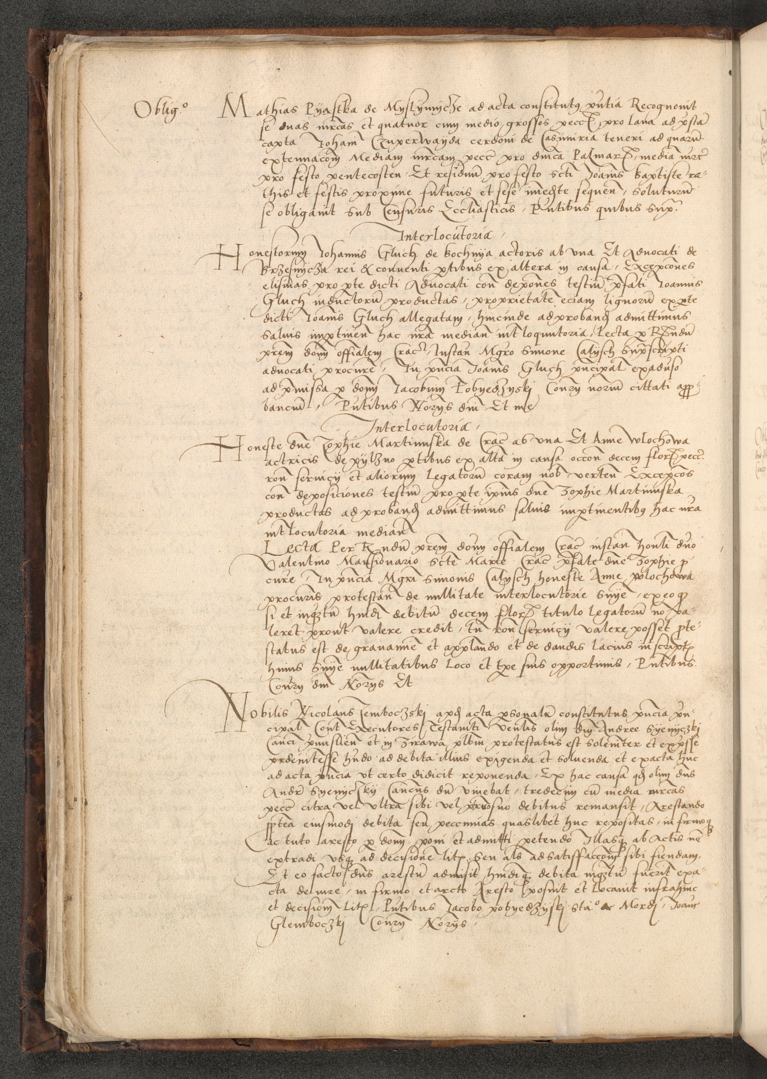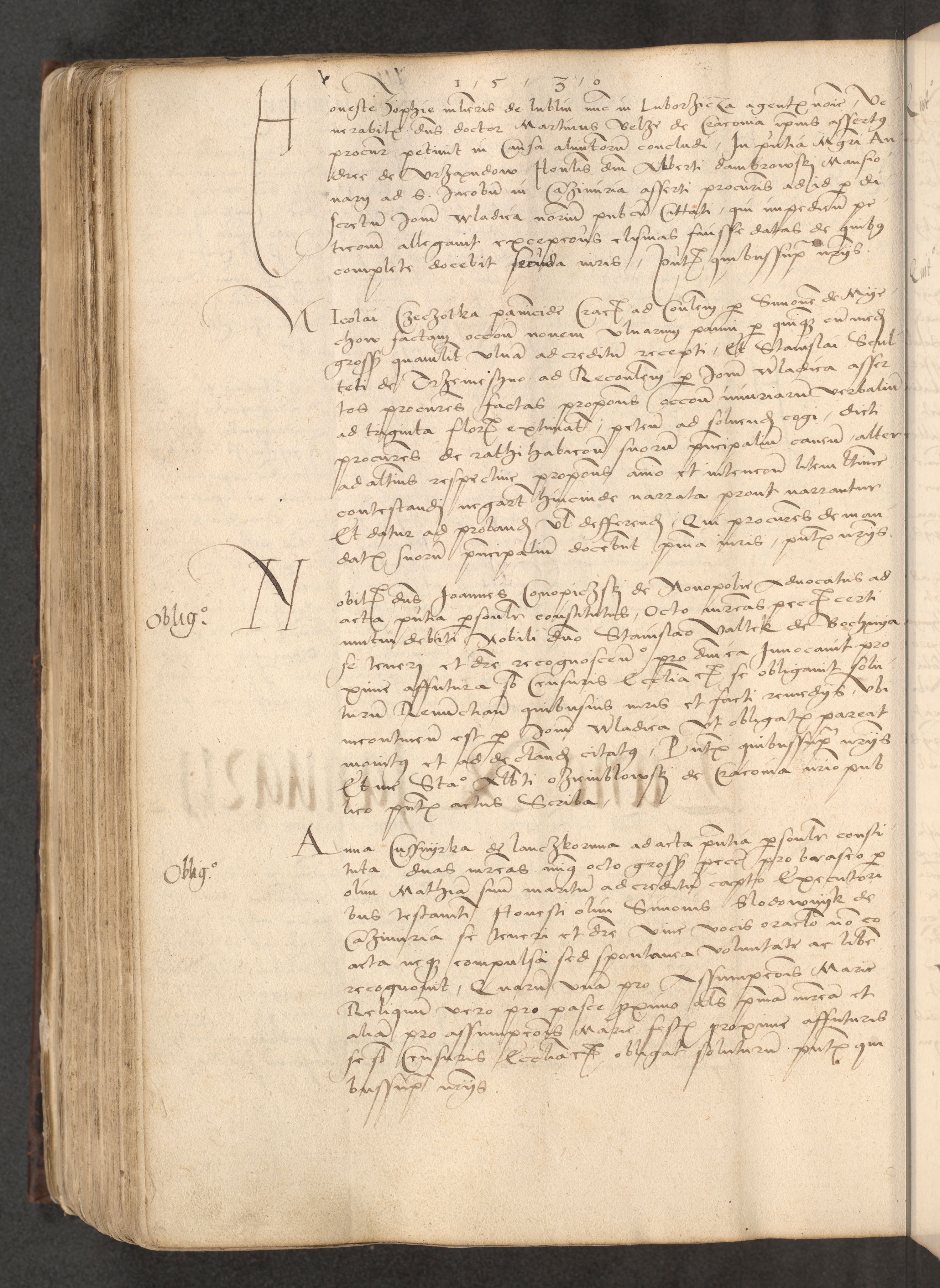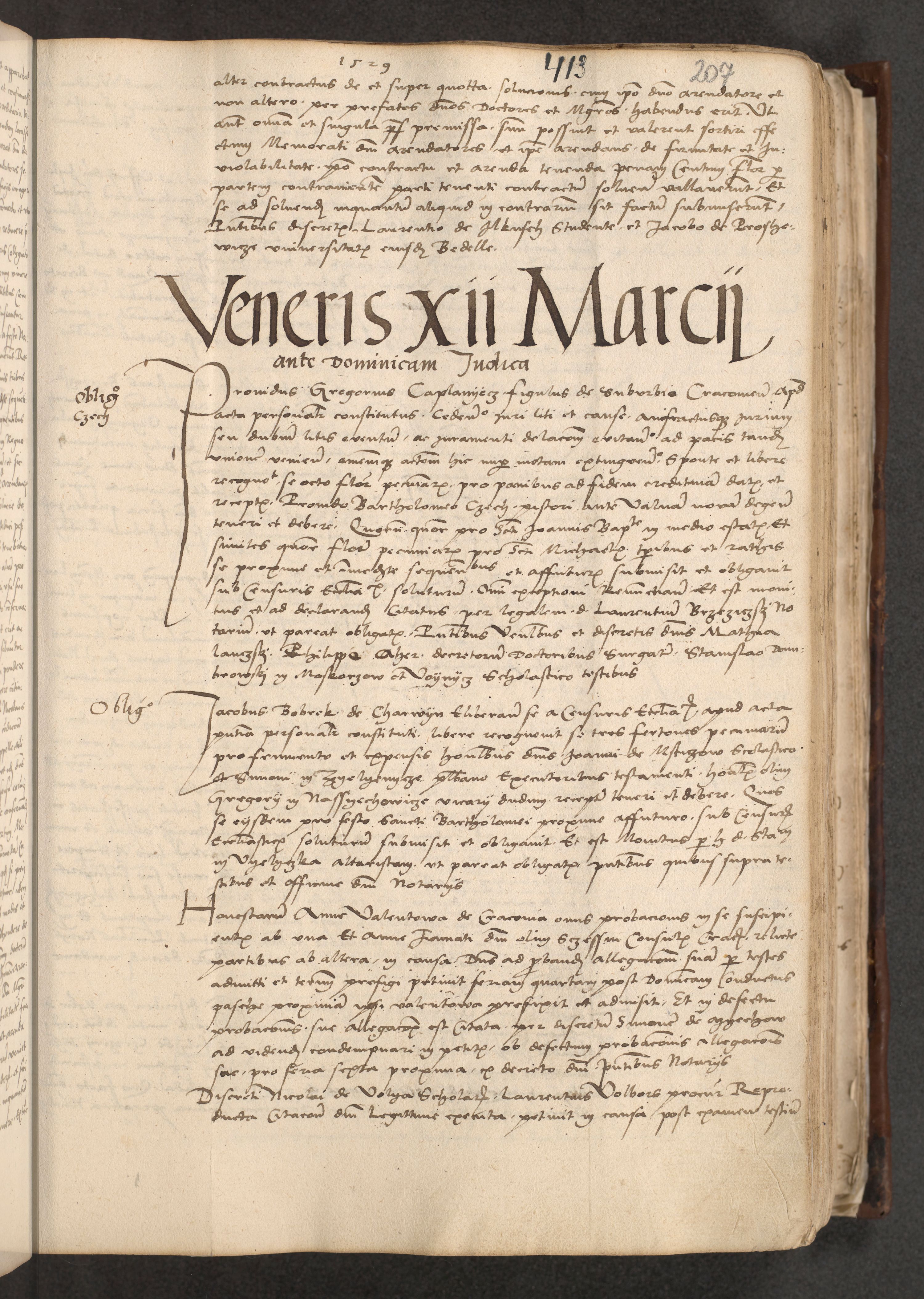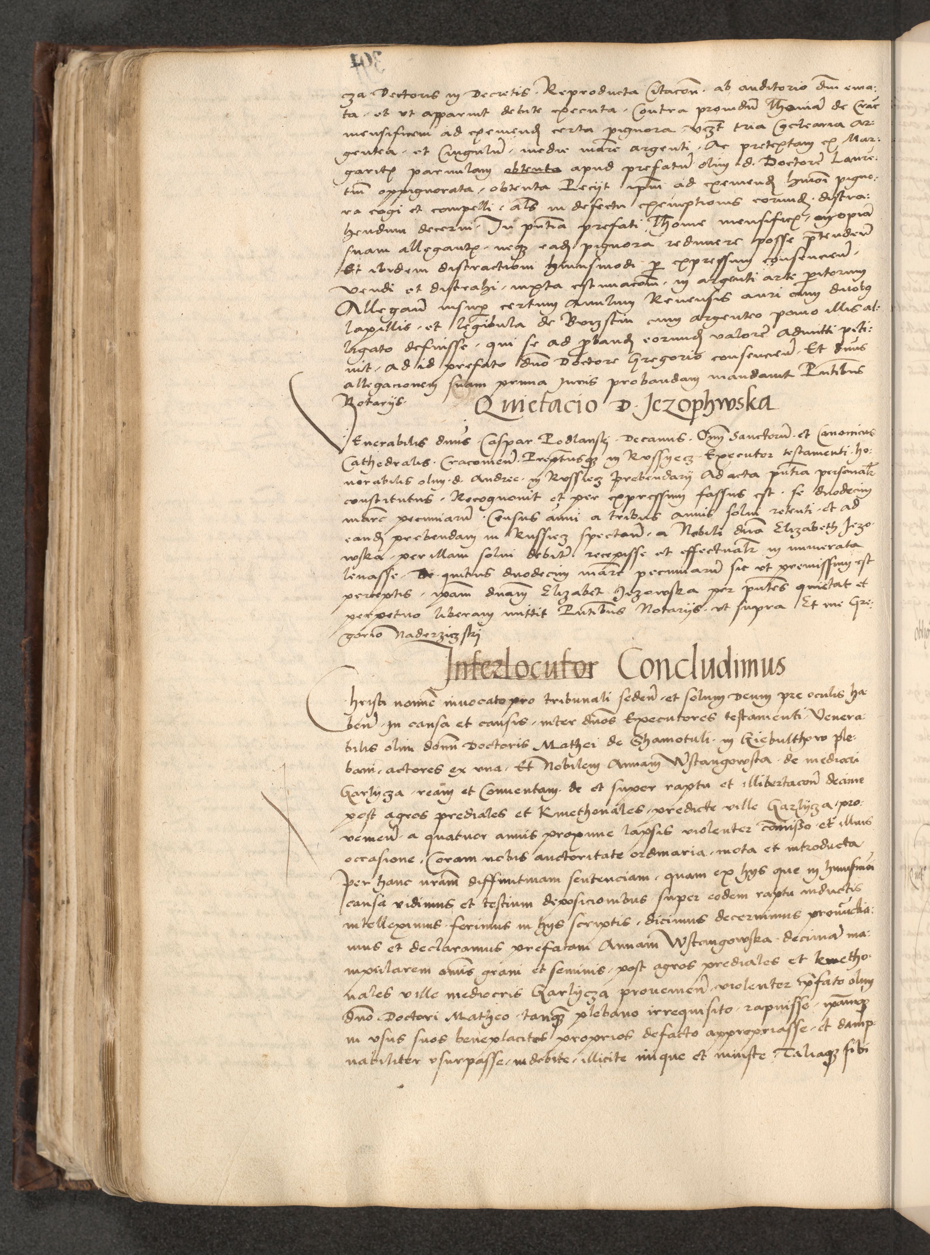 INRI. Acta actorum, obligacionum et sentenciarum tam interlocutoriarum quam diffinitivarum coram reverendo patre ac egregio viro domino Jacobo Erciss[o]wski decretorum doctorem, canonico et officiali generali Cracoviensi ad annum Domini 1528, indicionem primam, pontificatus sanctissimi in Christo patris et domini domini Clementis divina probidendcia pape seprtimi, annum quintum, per Stanislaum de Mordi legalem consistorii notarium omine felici inchoantur