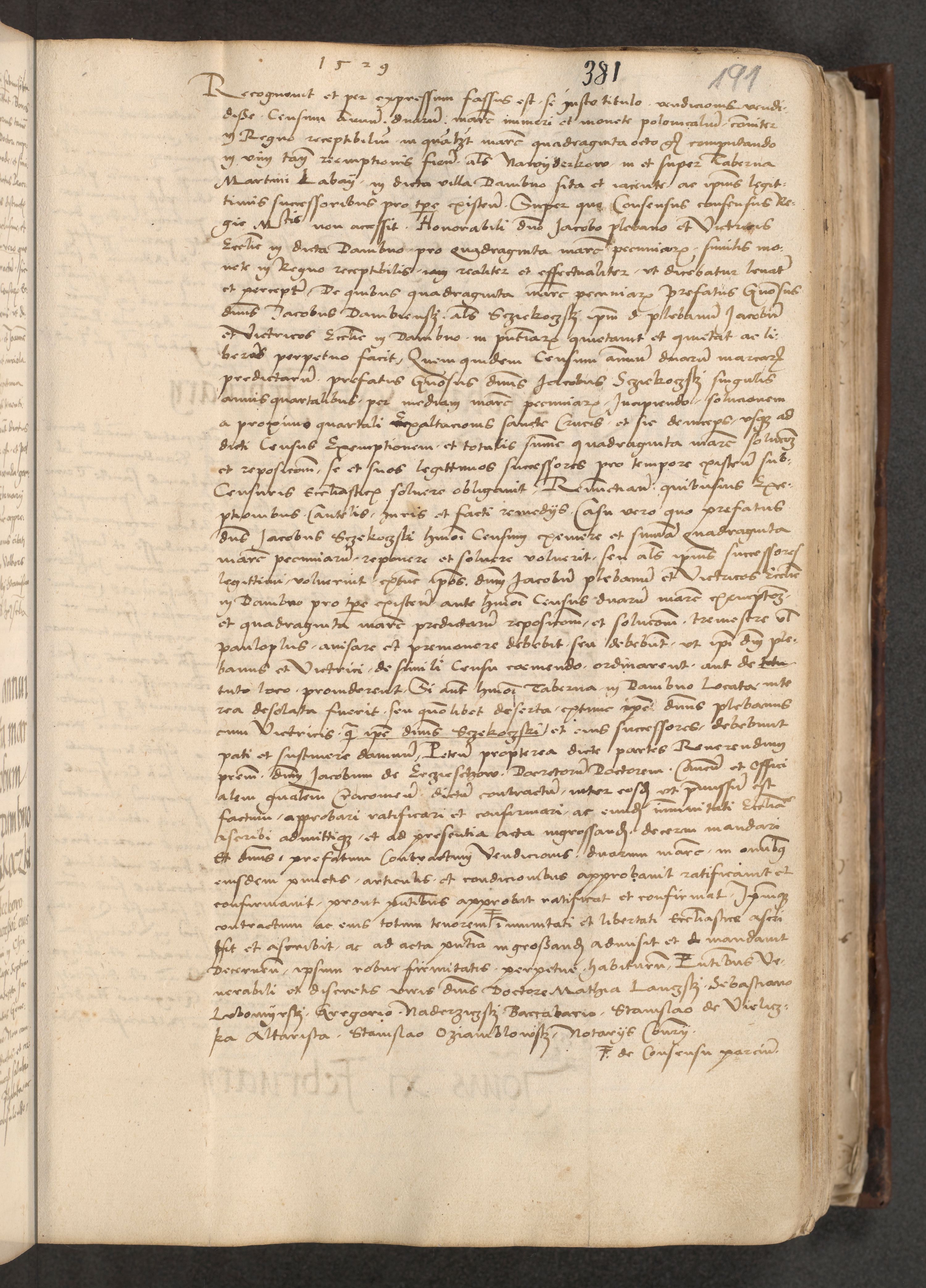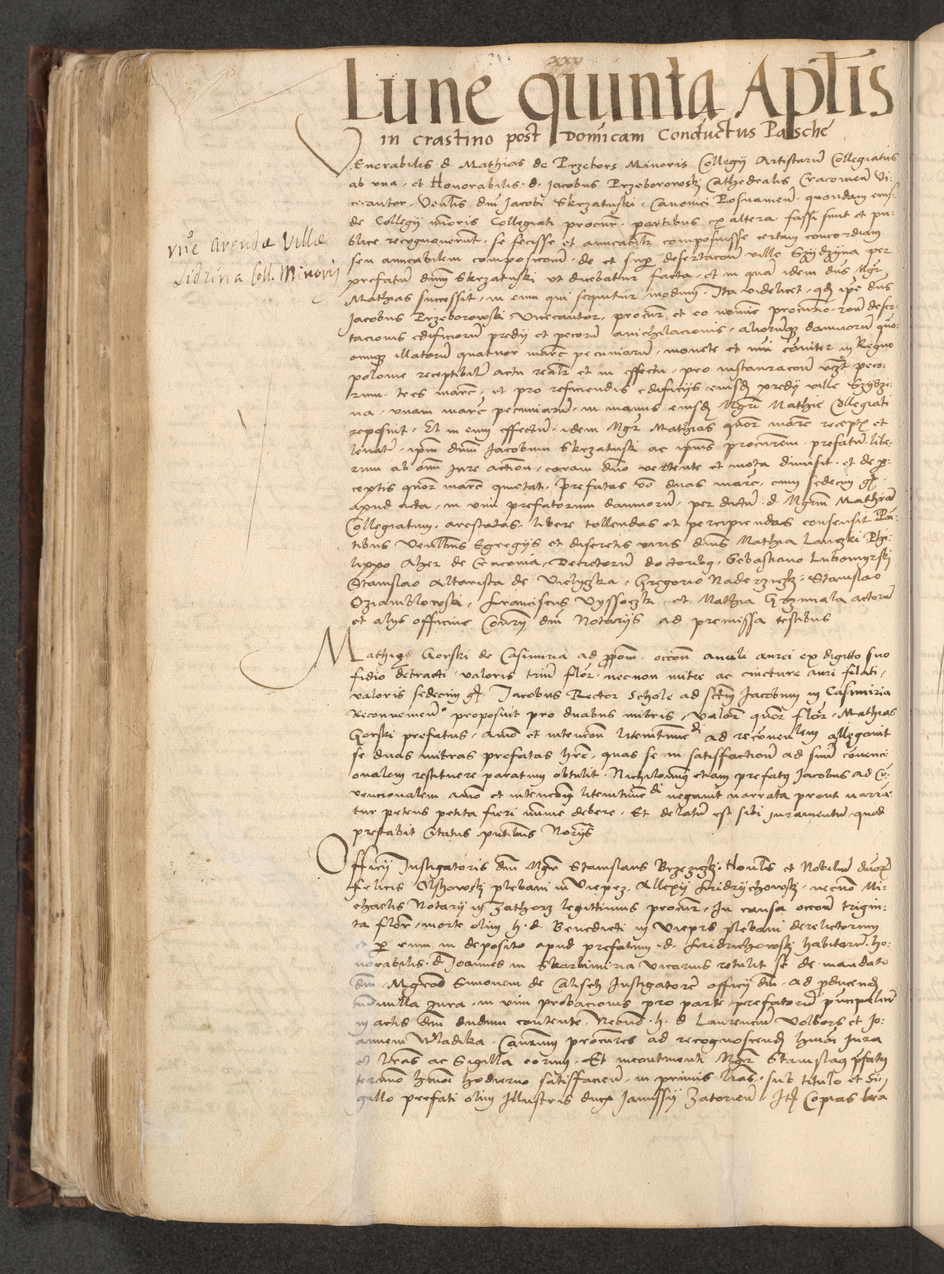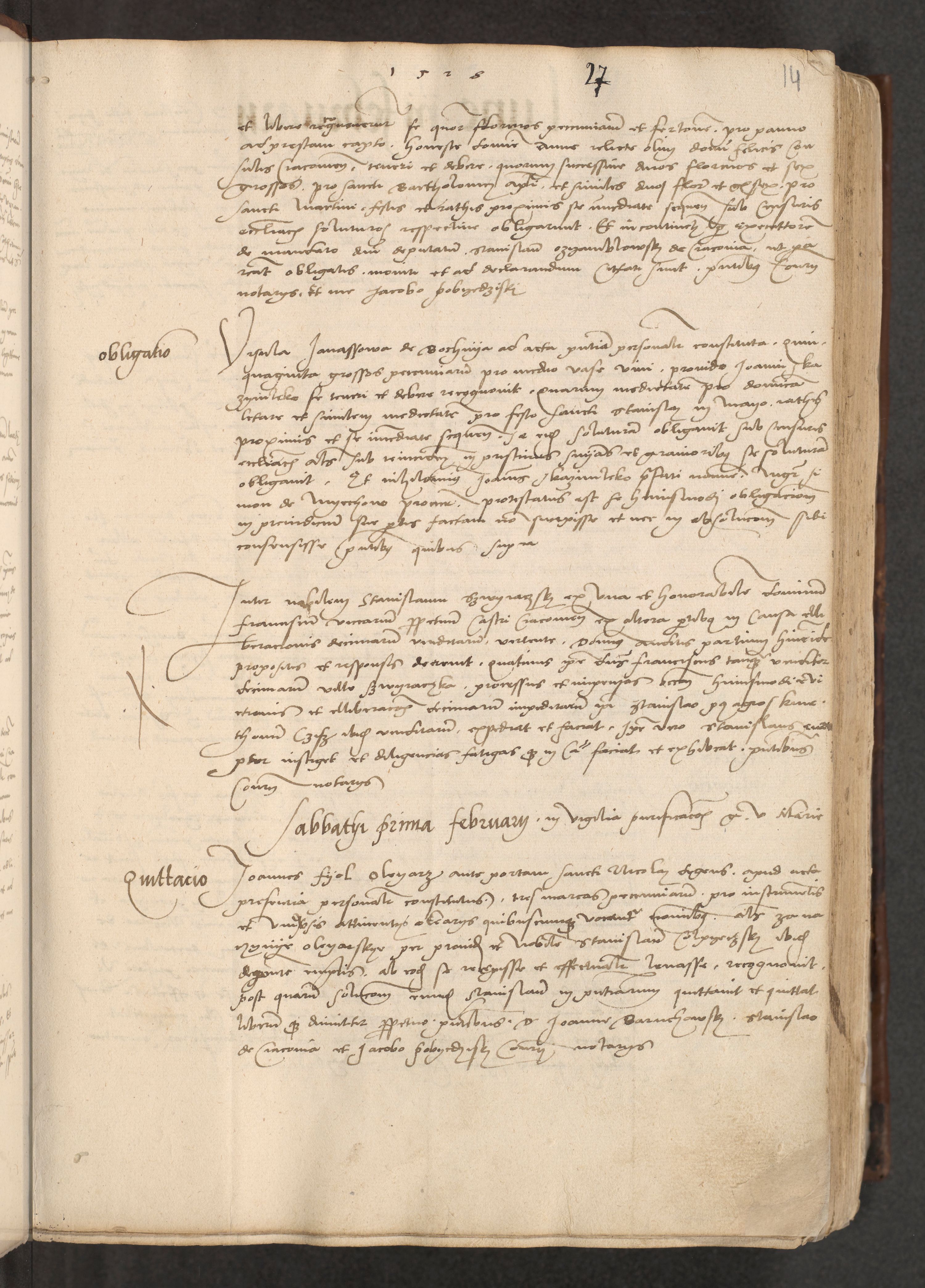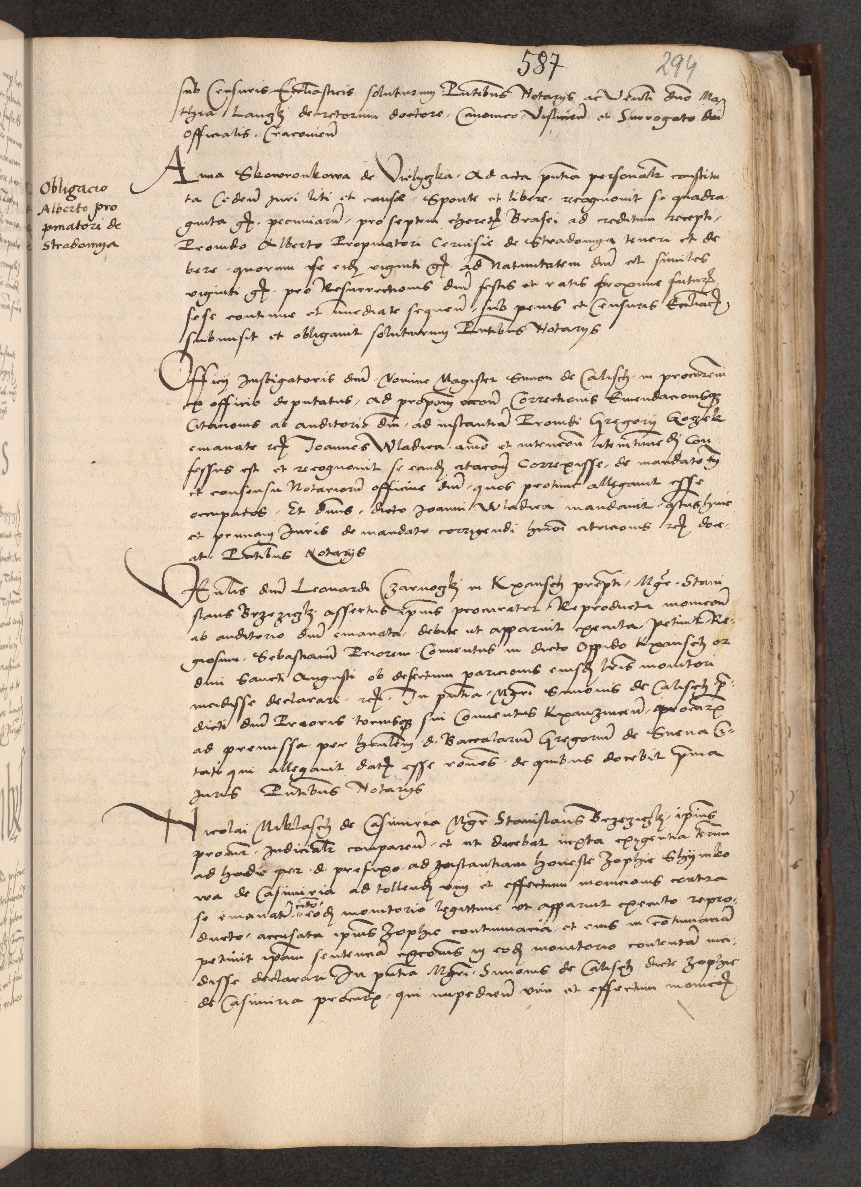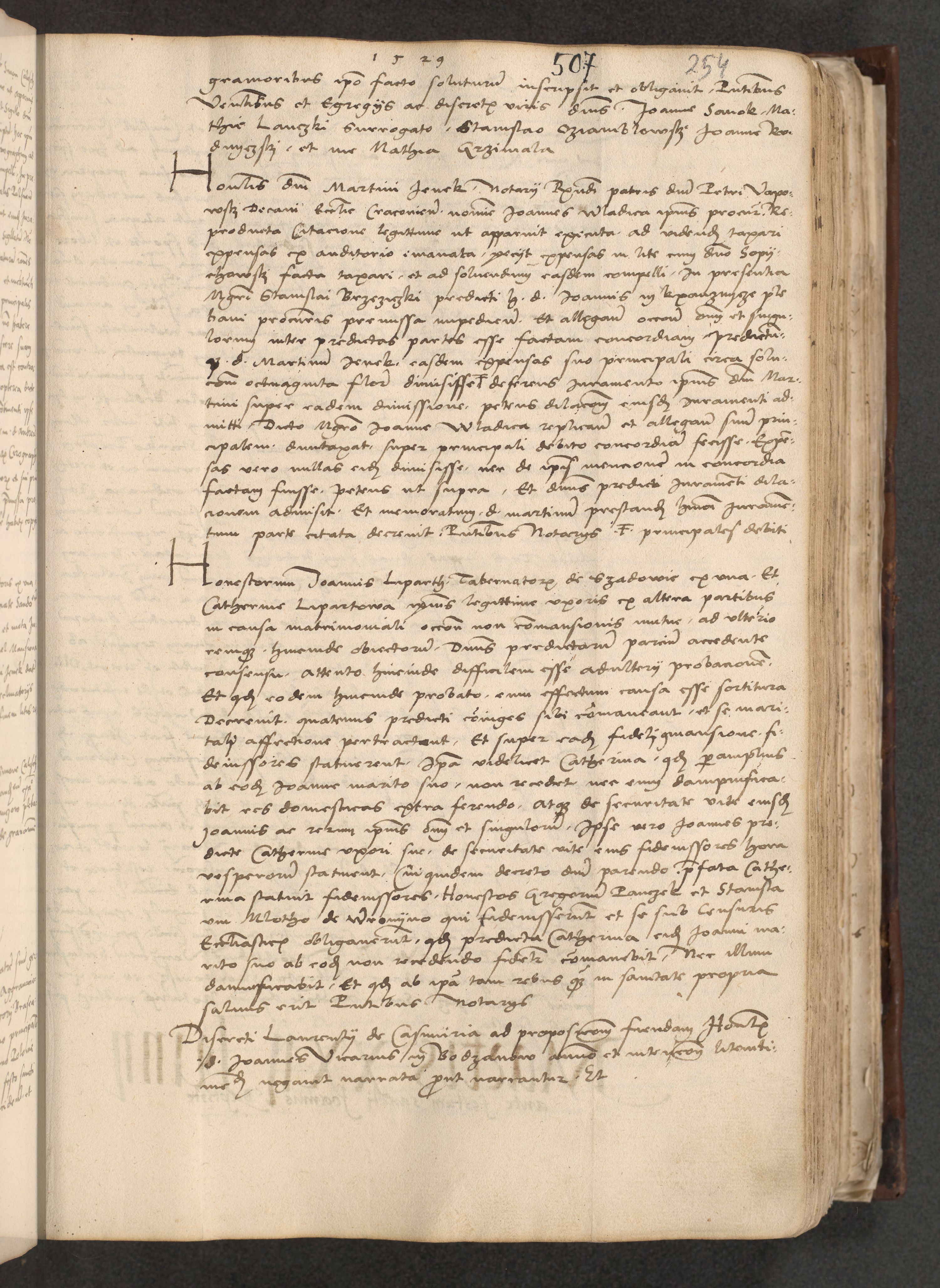 INRI. Acta actorum, obligacionum et sentenciarum tam interlocutoriarum quam diffinitivarum coram reverendo patre ac egregio viro domino Jacobo Erciss[o]wski decretorum doctorem, canonico et officiali generali Cracoviensi ad annum Domini 1528, indicionem primam, pontificatus sanctissimi in Christo patris et domini domini Clementis divina probidendcia pape seprtimi, annum quintum, per Stanislaum de Mordi legalem consistorii notarium omine felici inchoantur