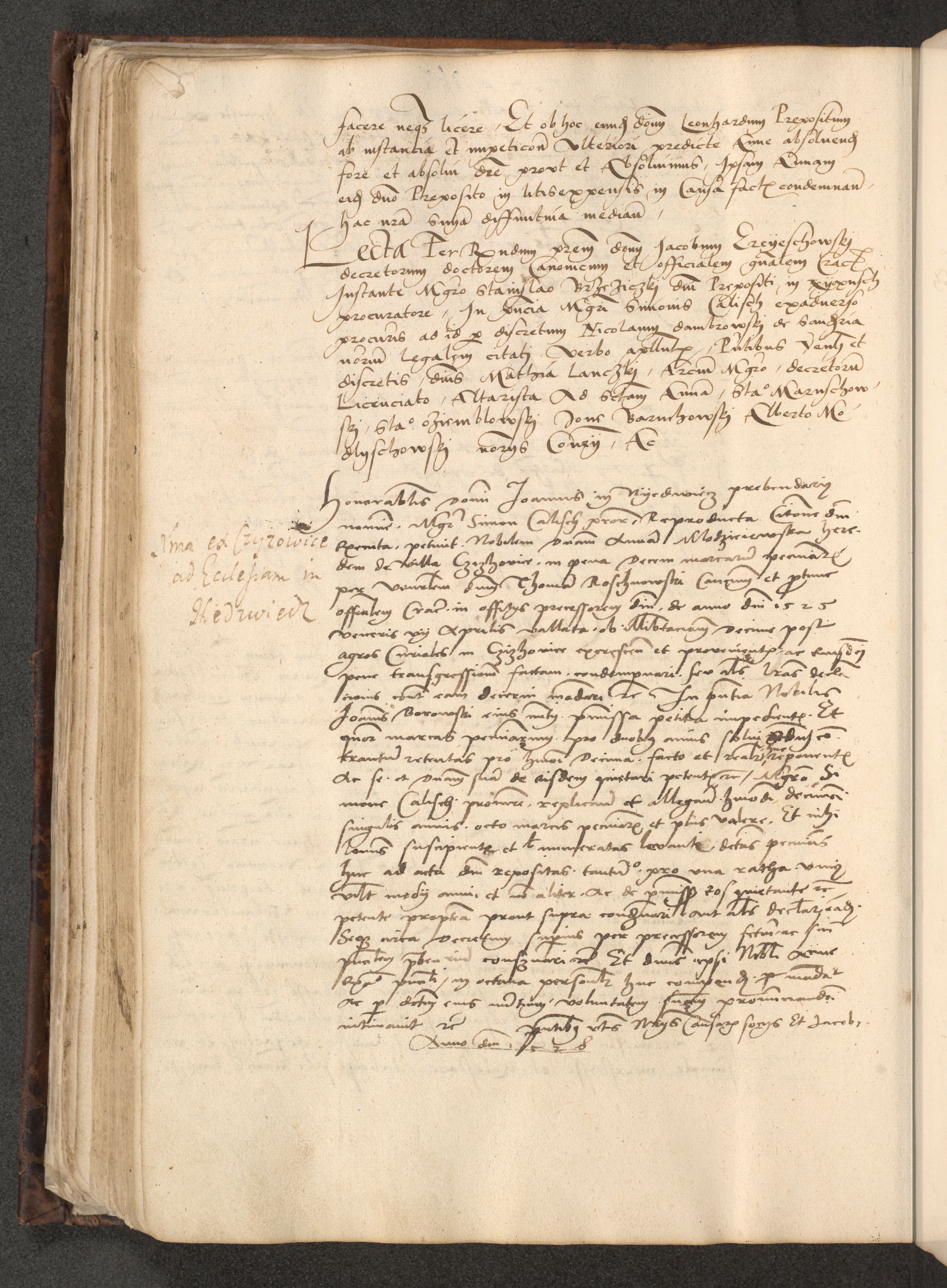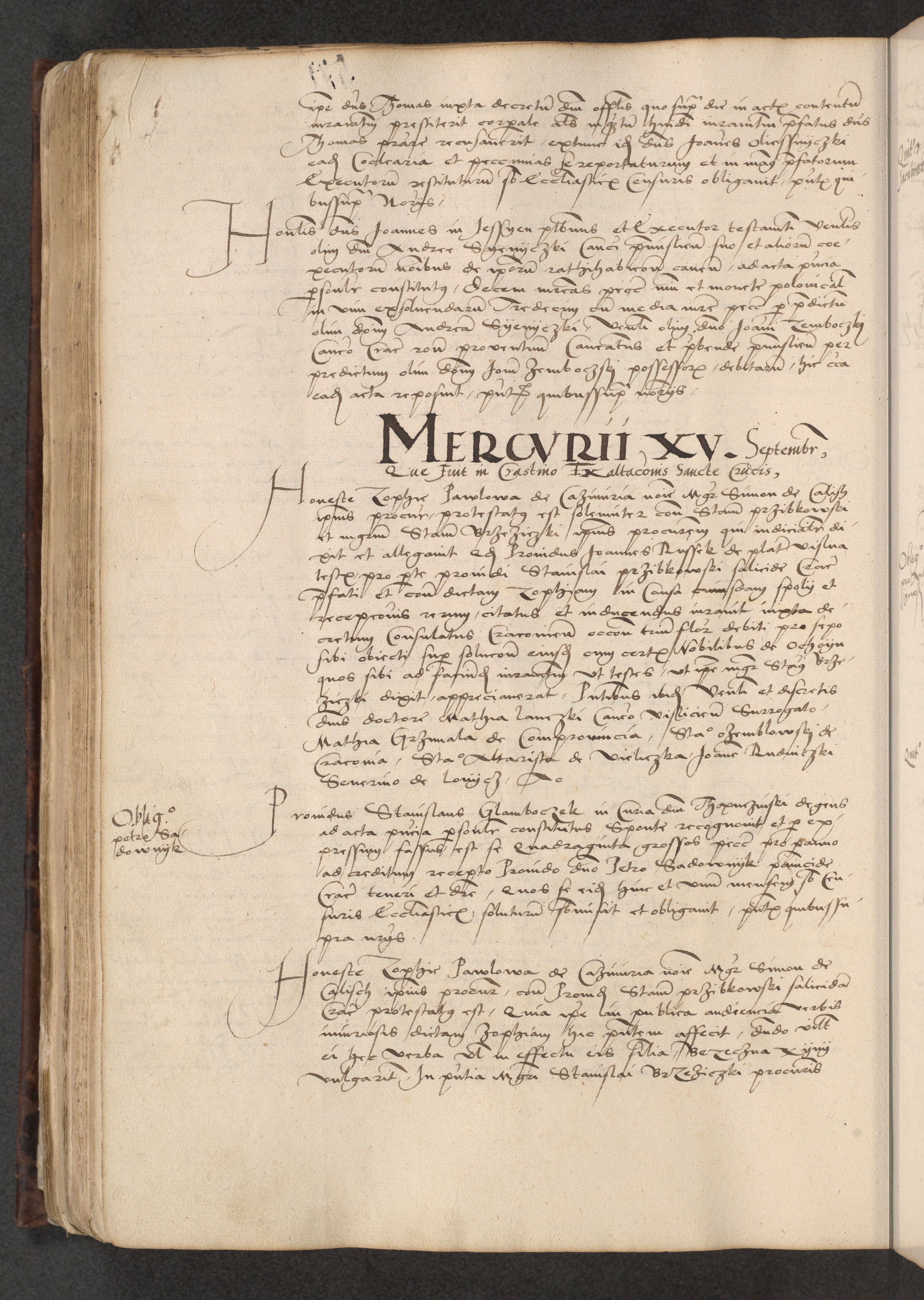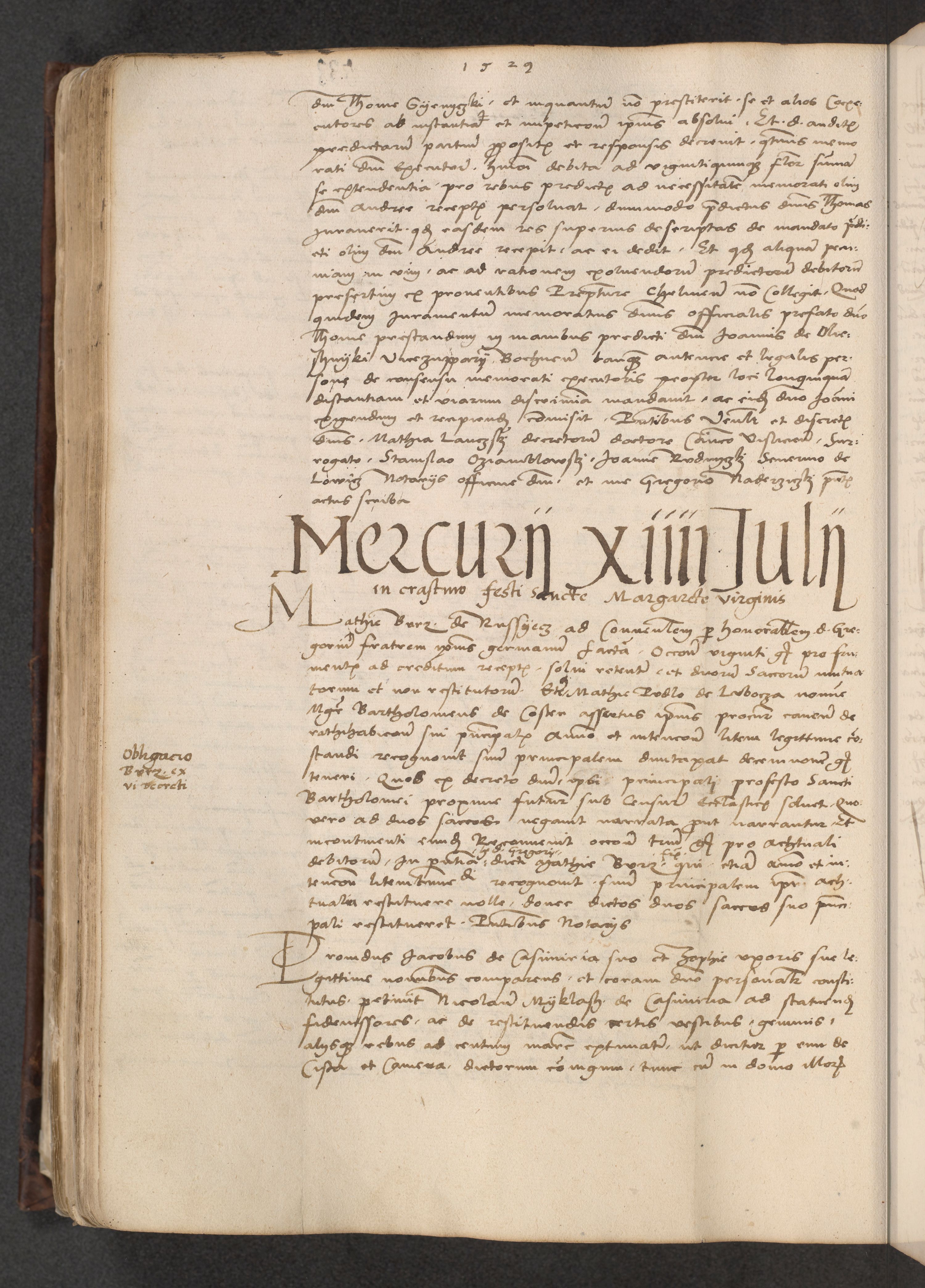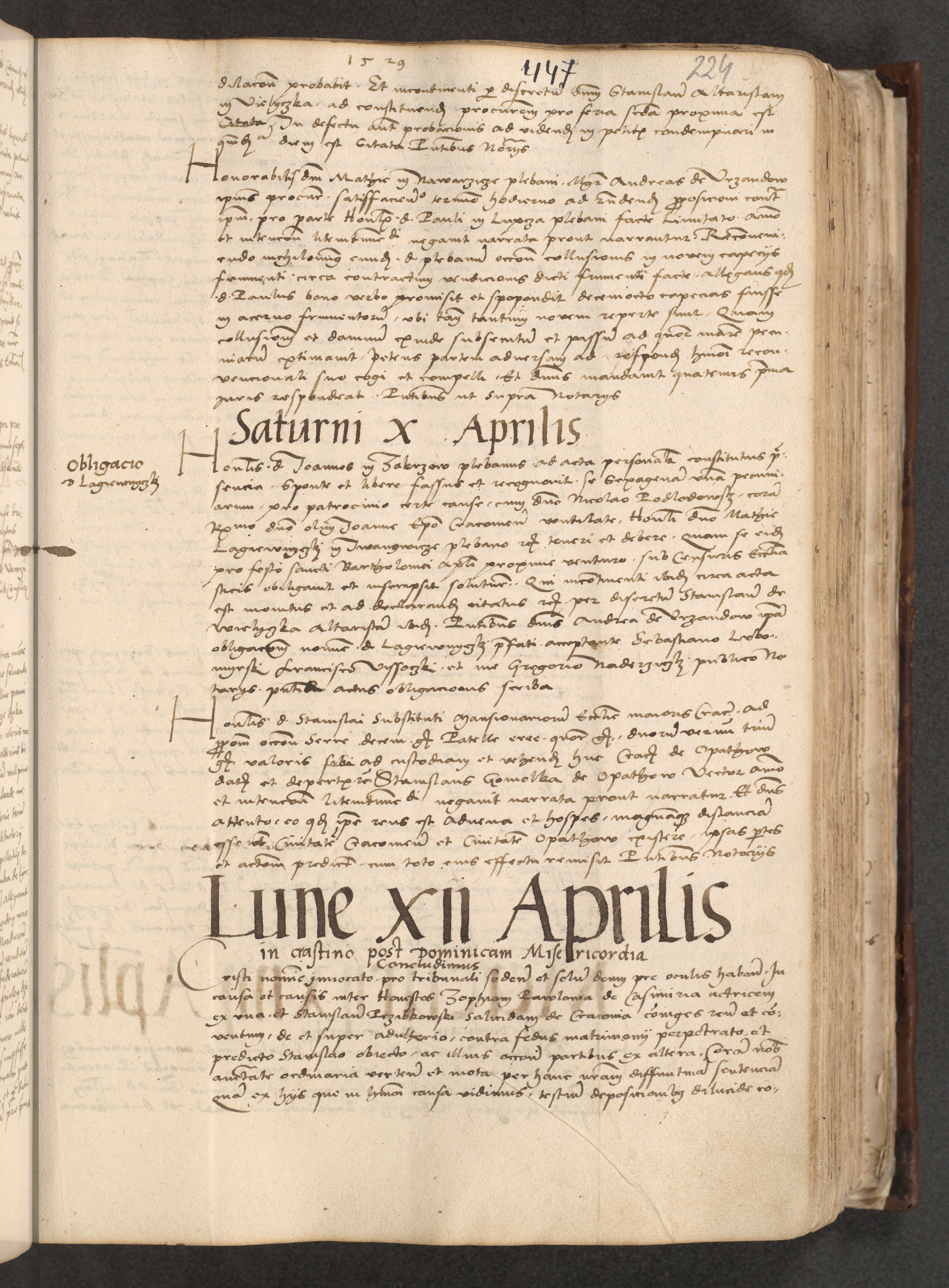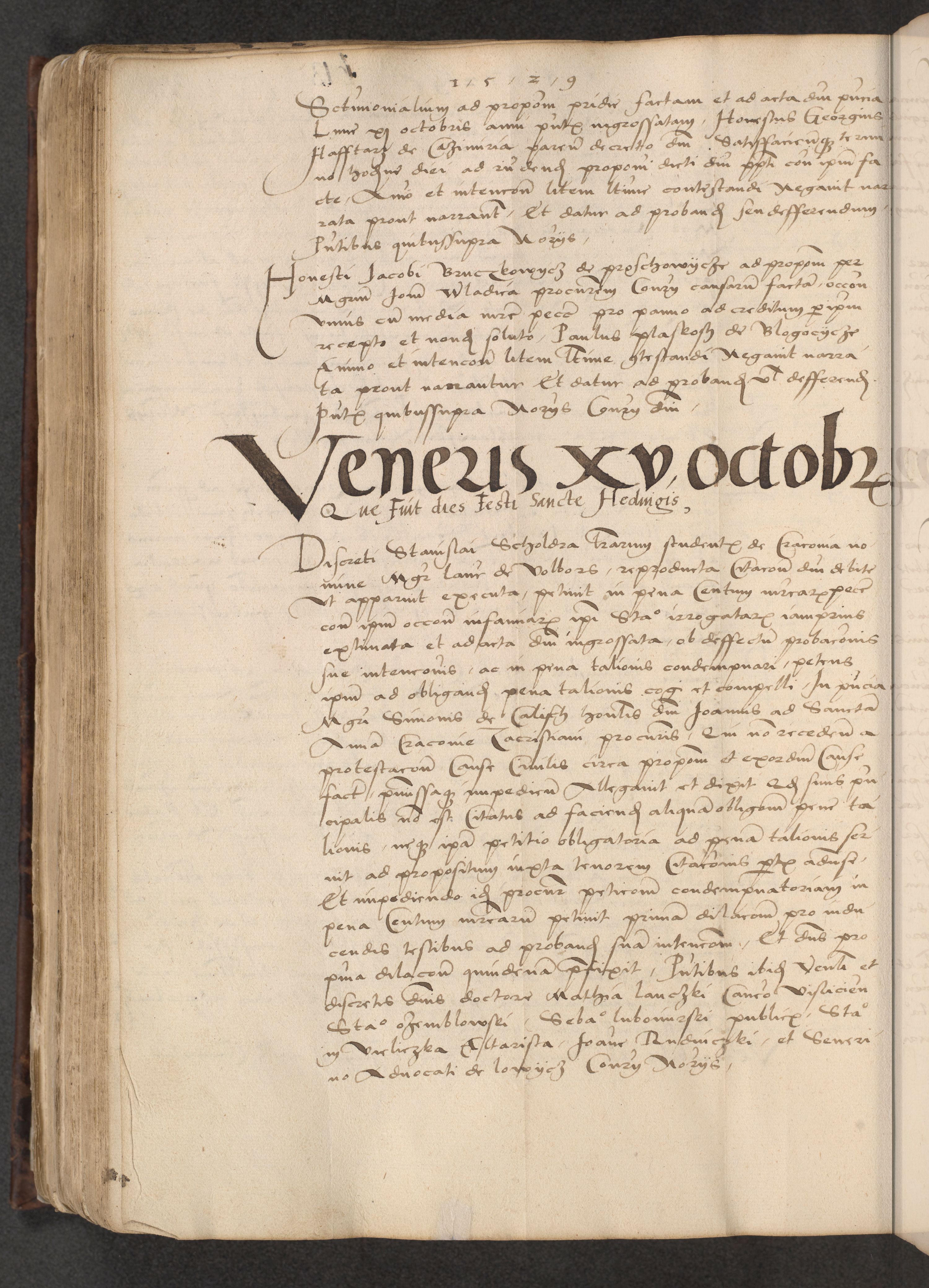 INRI. Acta actorum, obligacionum et sentenciarum tam interlocutoriarum quam diffinitivarum coram reverendo patre ac egregio viro domino Jacobo Erciss[o]wski decretorum doctorem, canonico et officiali generali Cracoviensi ad annum Domini 1528, indicionem primam, pontificatus sanctissimi in Christo patris et domini domini Clementis divina probidendcia pape seprtimi, annum quintum, per Stanislaum de Mordi legalem consistorii notarium omine felici inchoantur