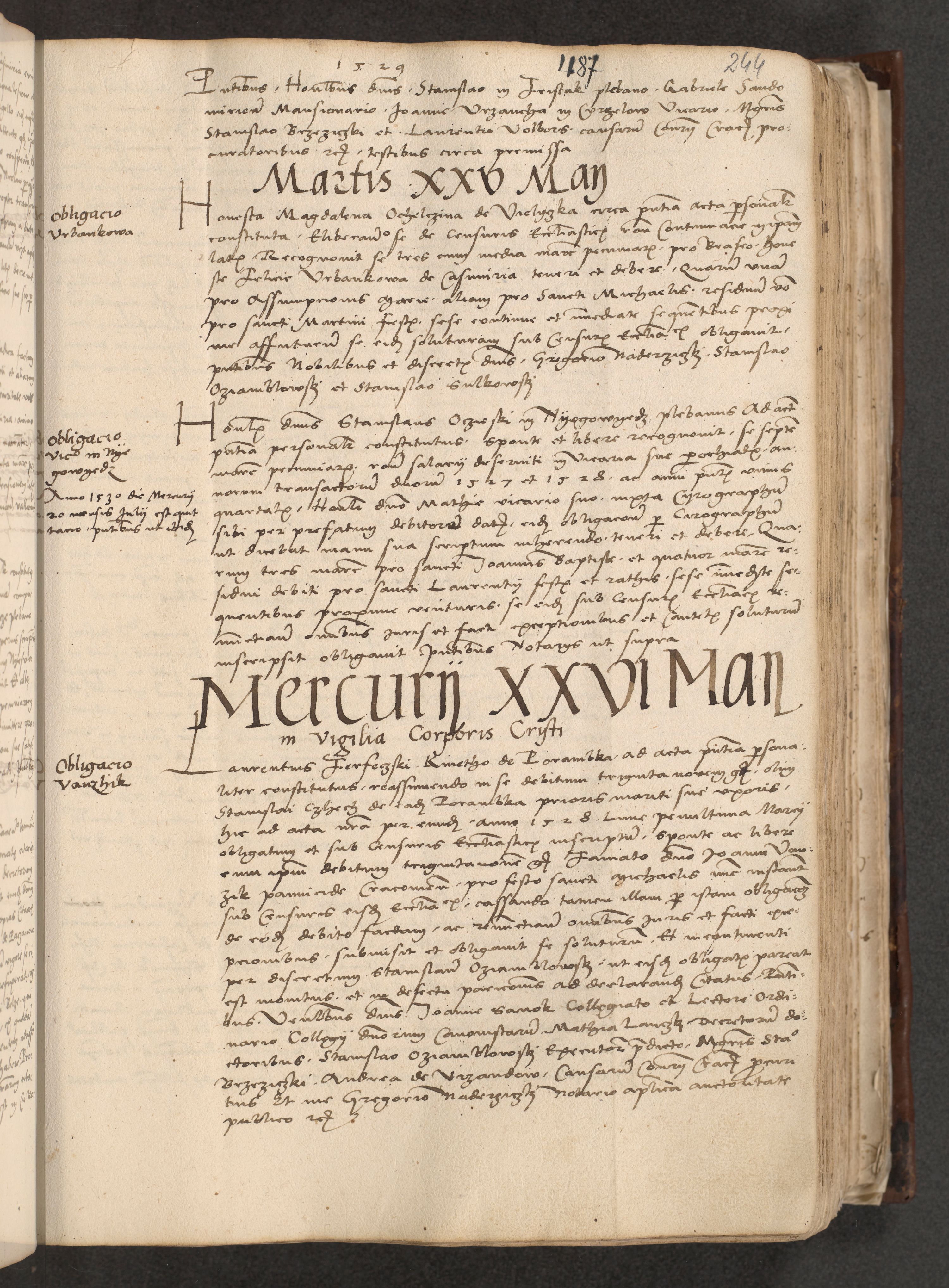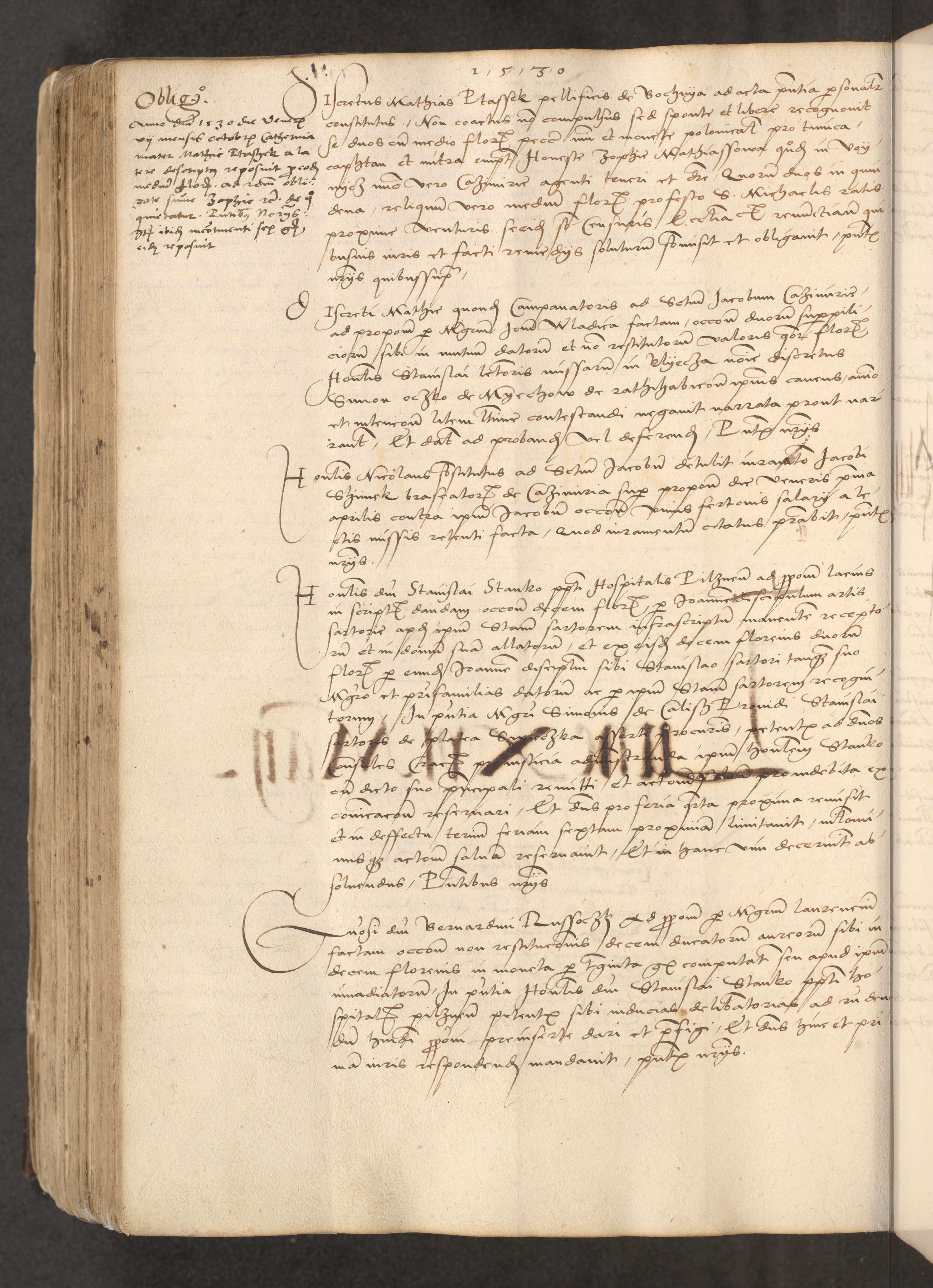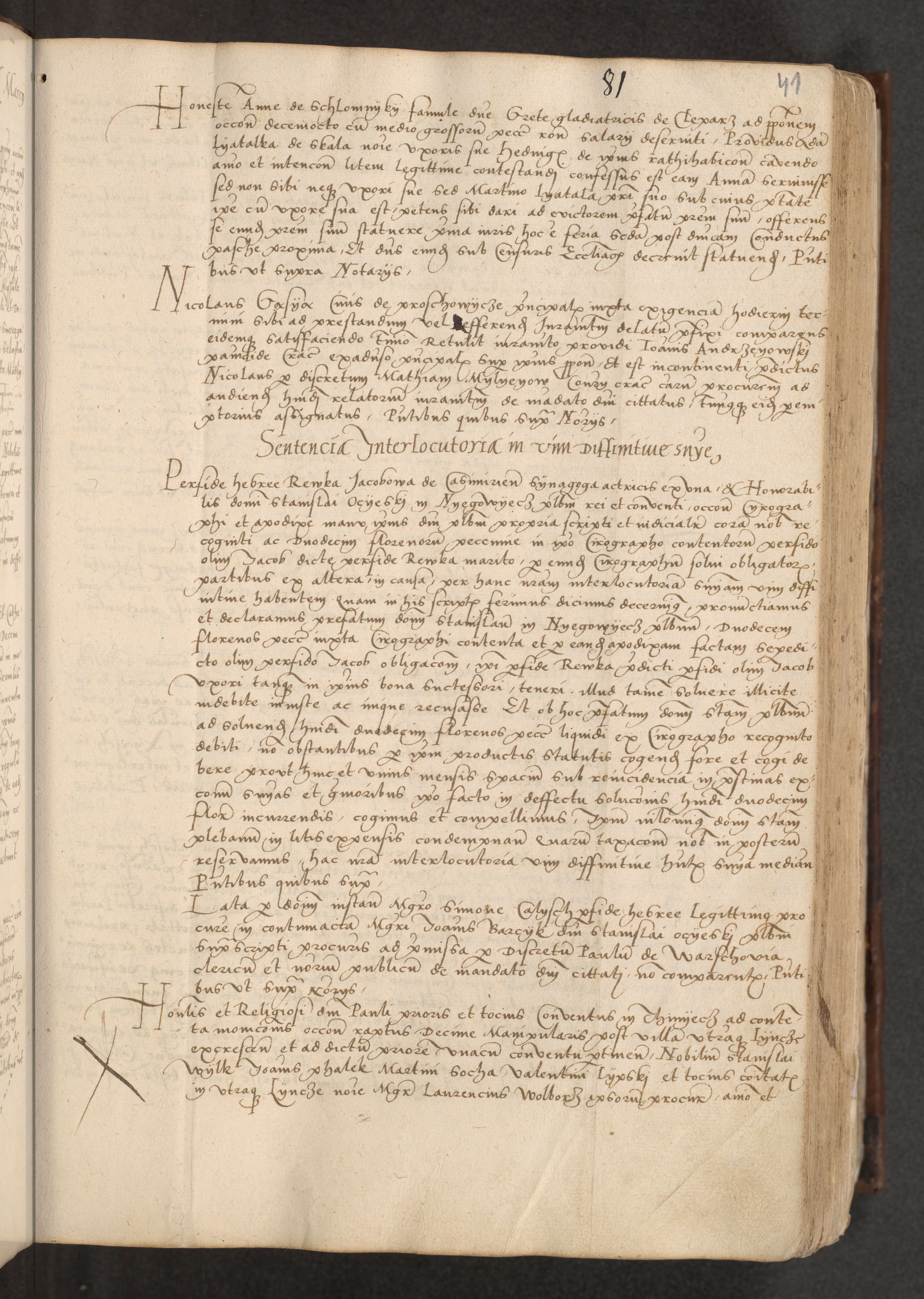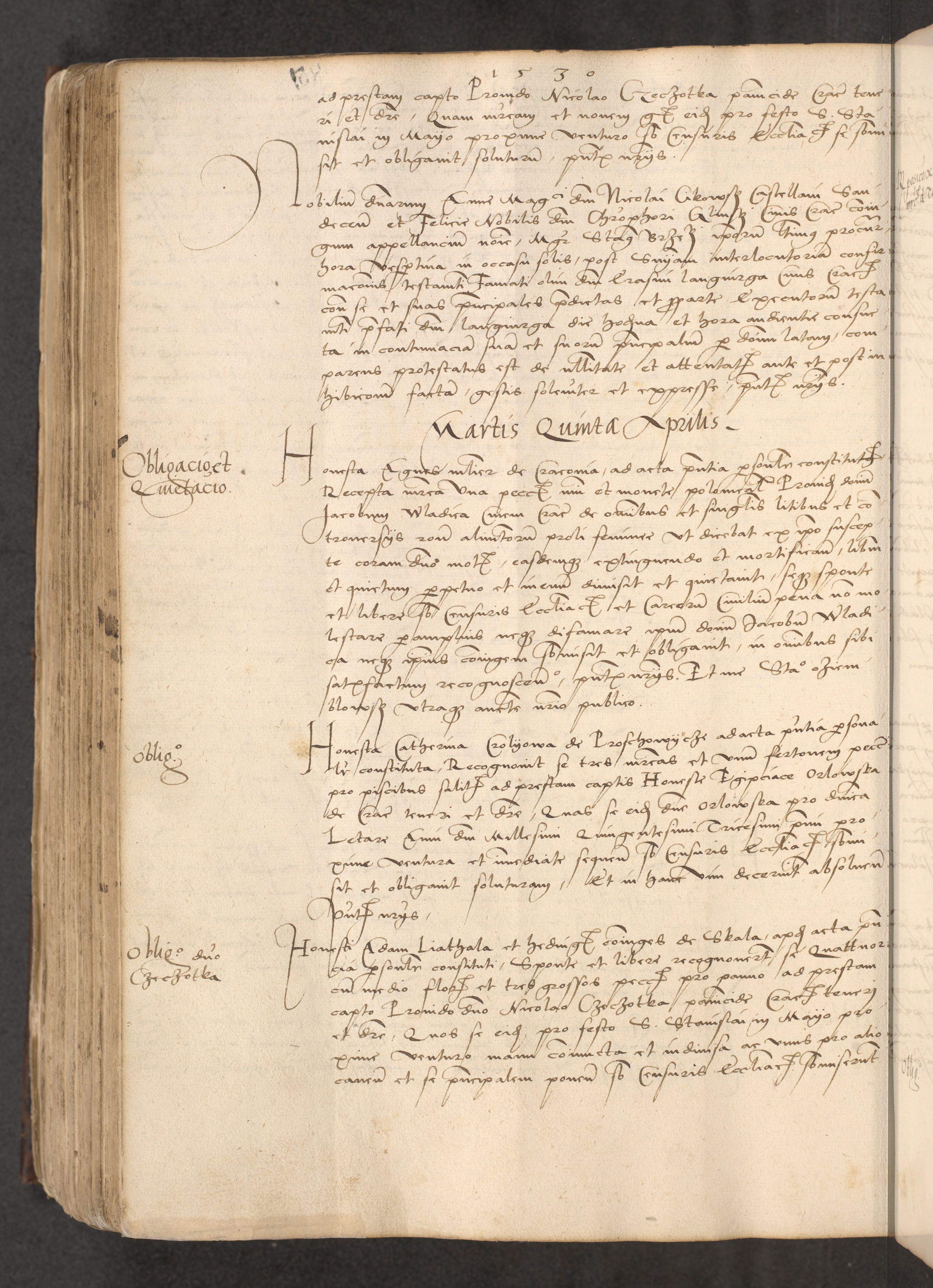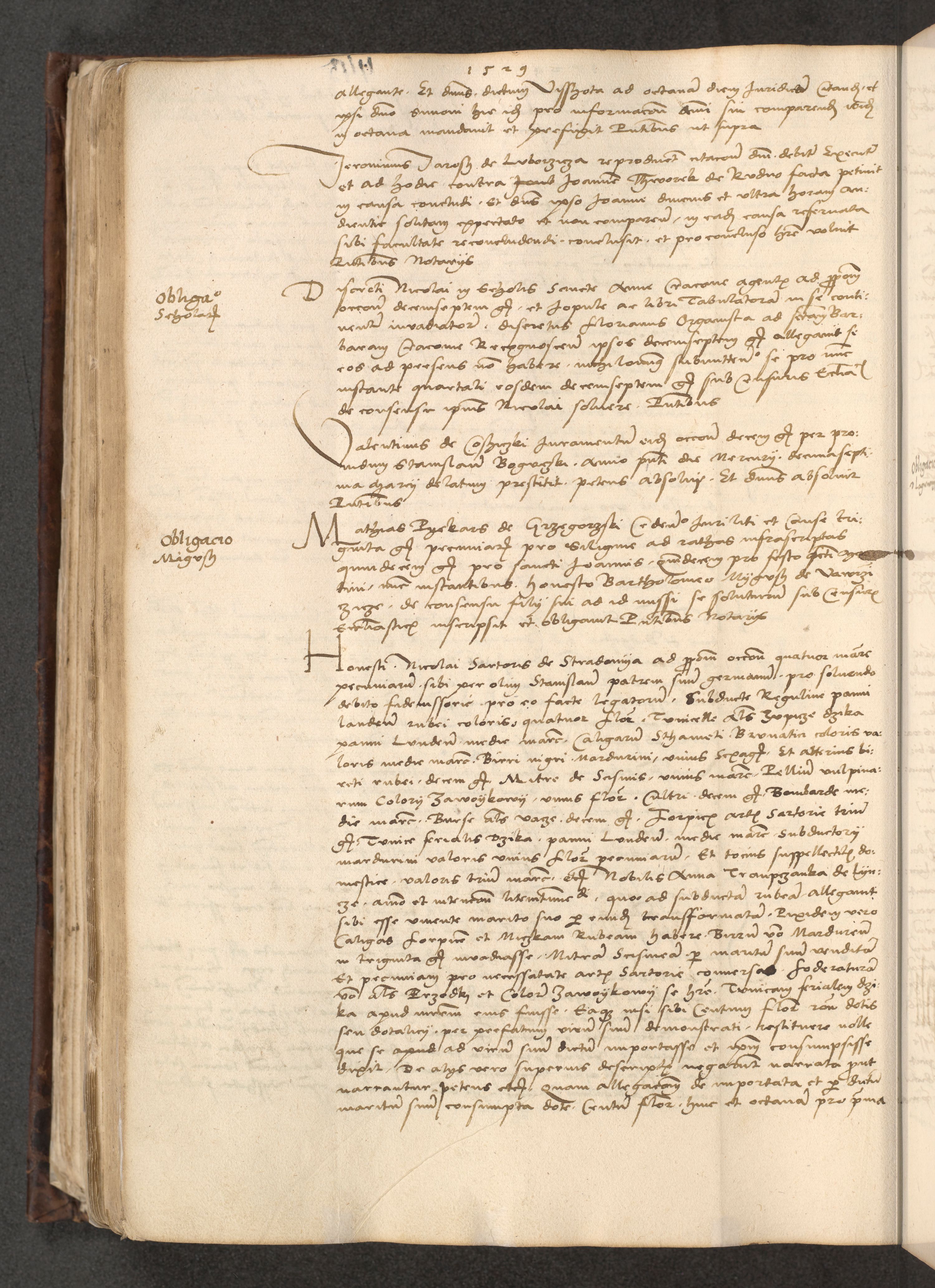 INRI. Acta actorum, obligacionum et sentenciarum tam interlocutoriarum quam diffinitivarum coram reverendo patre ac egregio viro domino Jacobo Erciss[o]wski decretorum doctorem, canonico et officiali generali Cracoviensi ad annum Domini 1528, indicionem primam, pontificatus sanctissimi in Christo patris et domini domini Clementis divina probidendcia pape seprtimi, annum quintum, per Stanislaum de Mordi legalem consistorii notarium omine felici inchoantur
