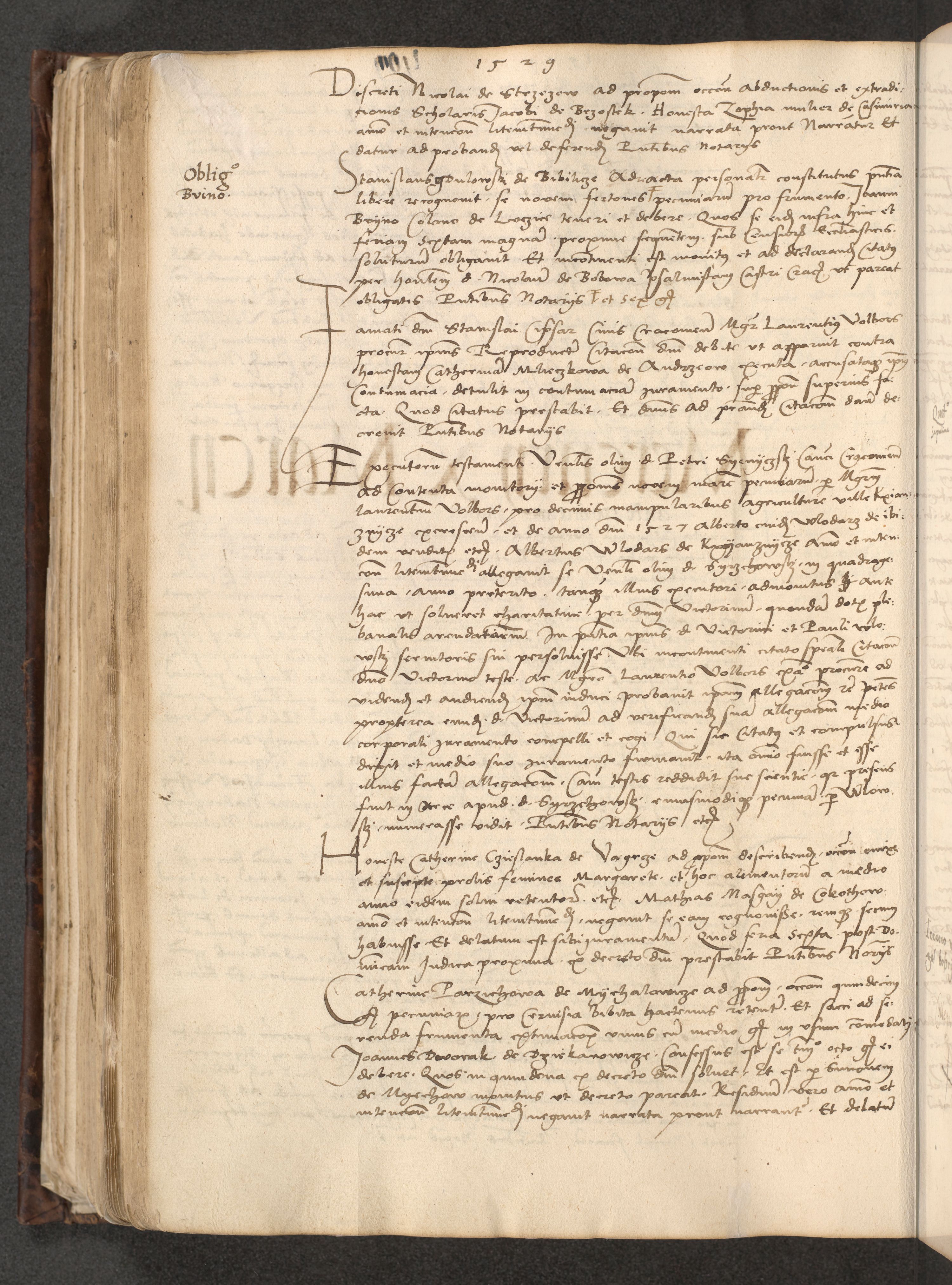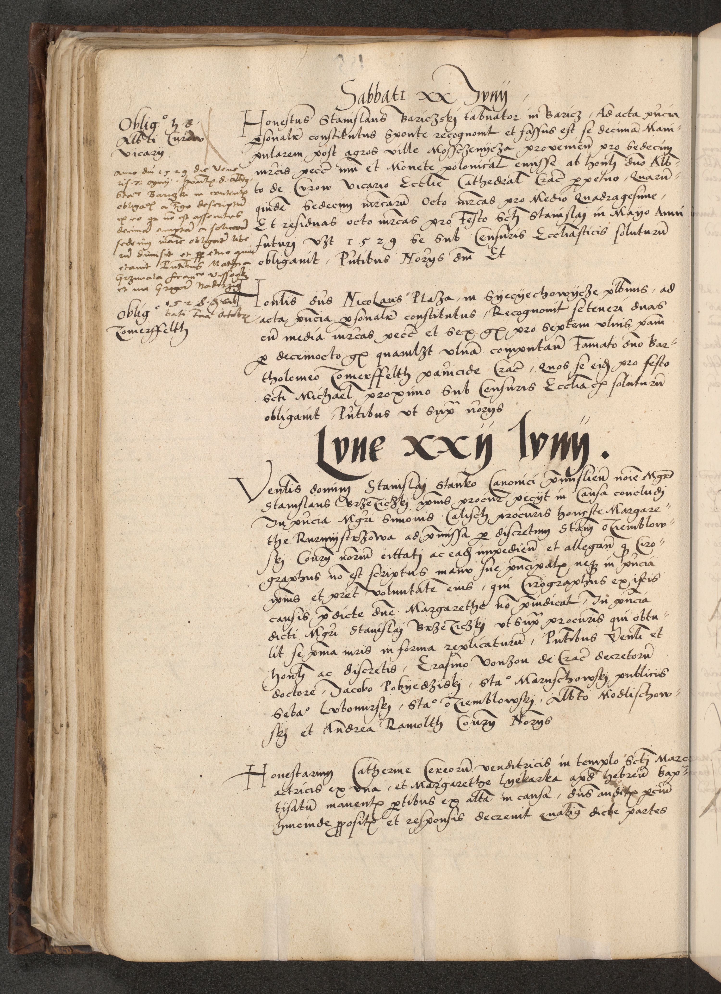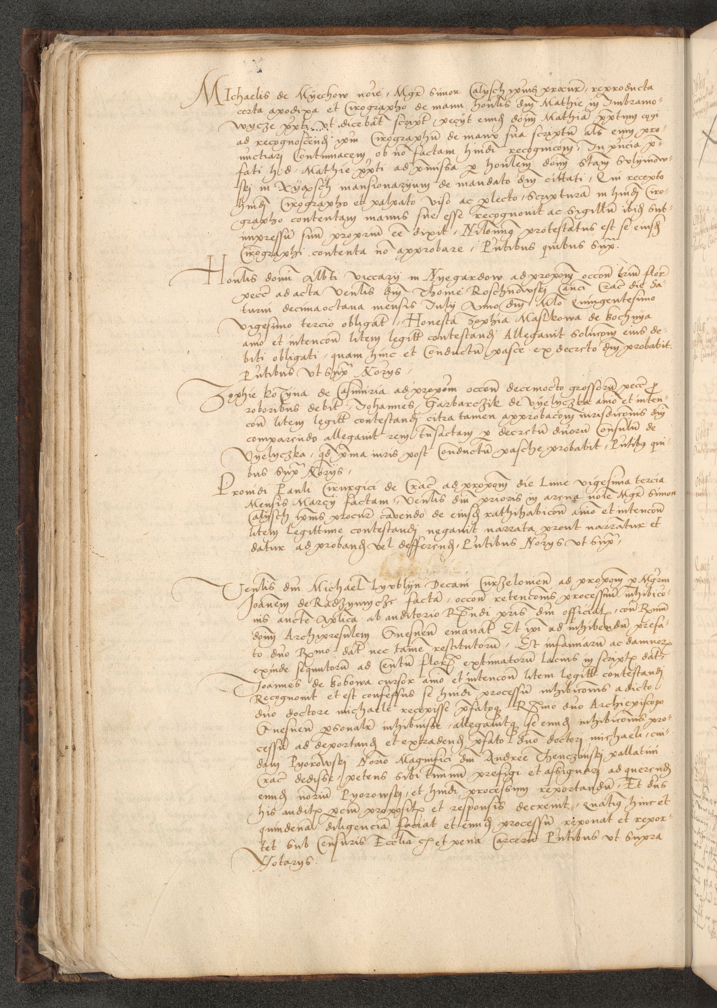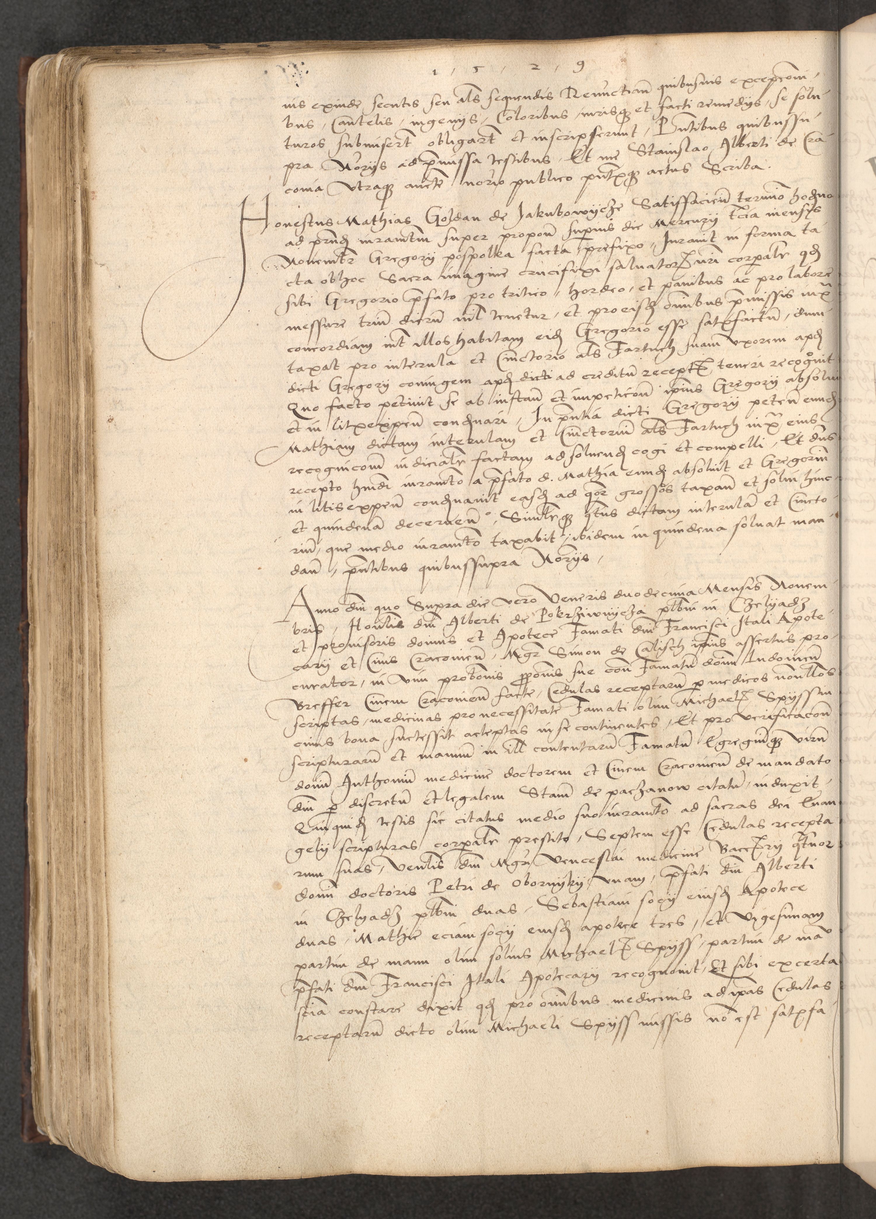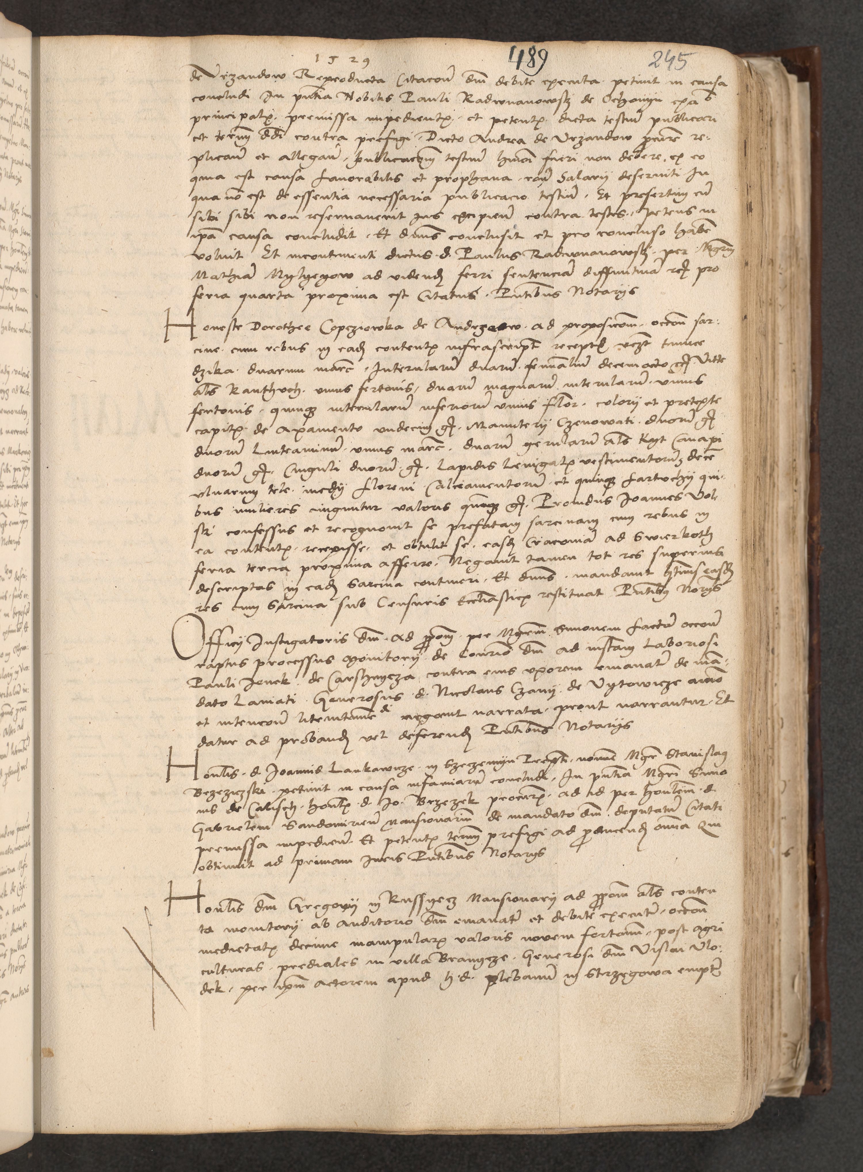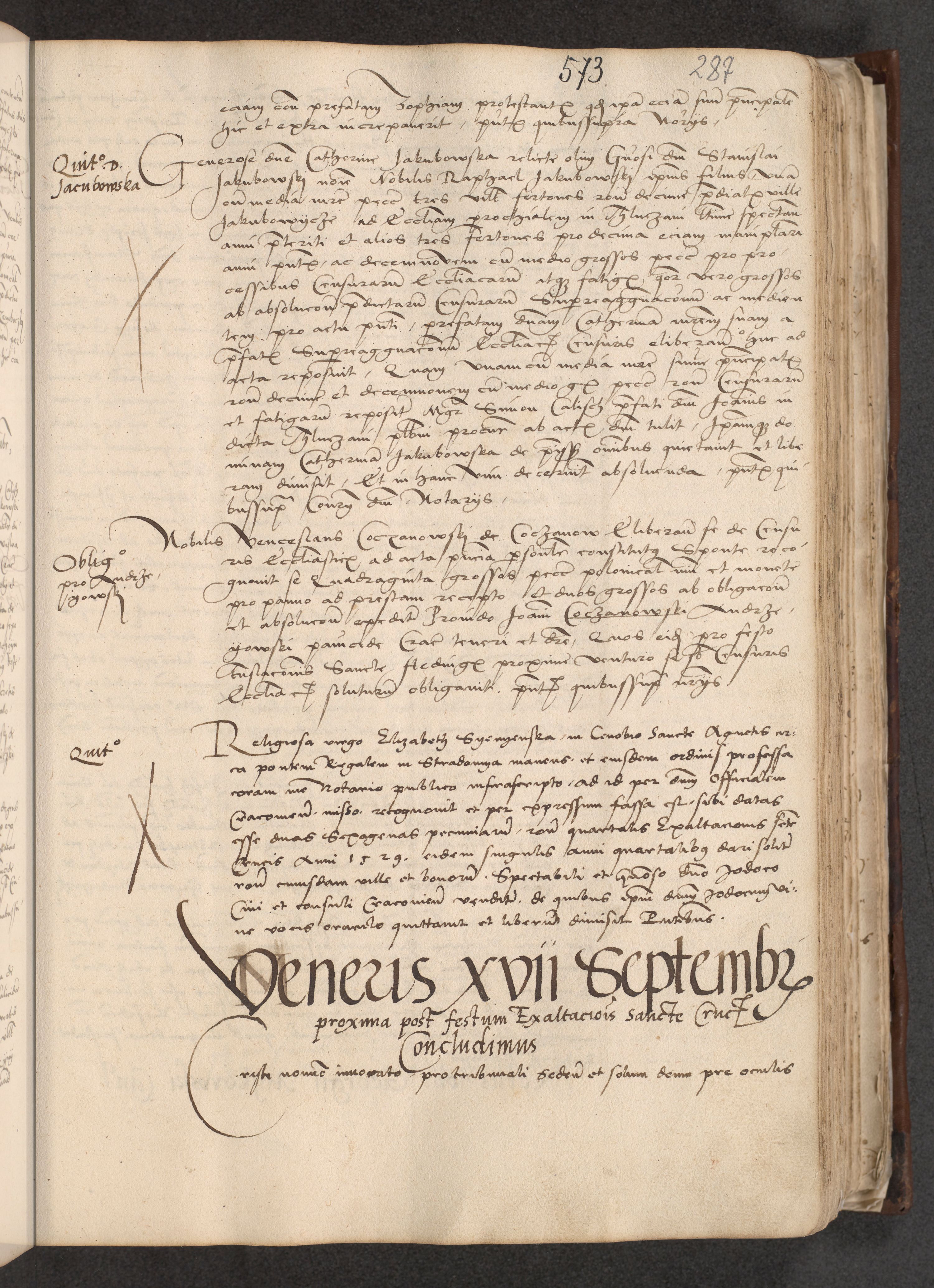 INRI. Acta actorum, obligacionum et sentenciarum tam interlocutoriarum quam diffinitivarum coram reverendo patre ac egregio viro domino Jacobo Erciss[o]wski decretorum doctorem, canonico et officiali generali Cracoviensi ad annum Domini 1528, indicionem primam, pontificatus sanctissimi in Christo patris et domini domini Clementis divina probidendcia pape seprtimi, annum quintum, per Stanislaum de Mordi legalem consistorii notarium omine felici inchoantur