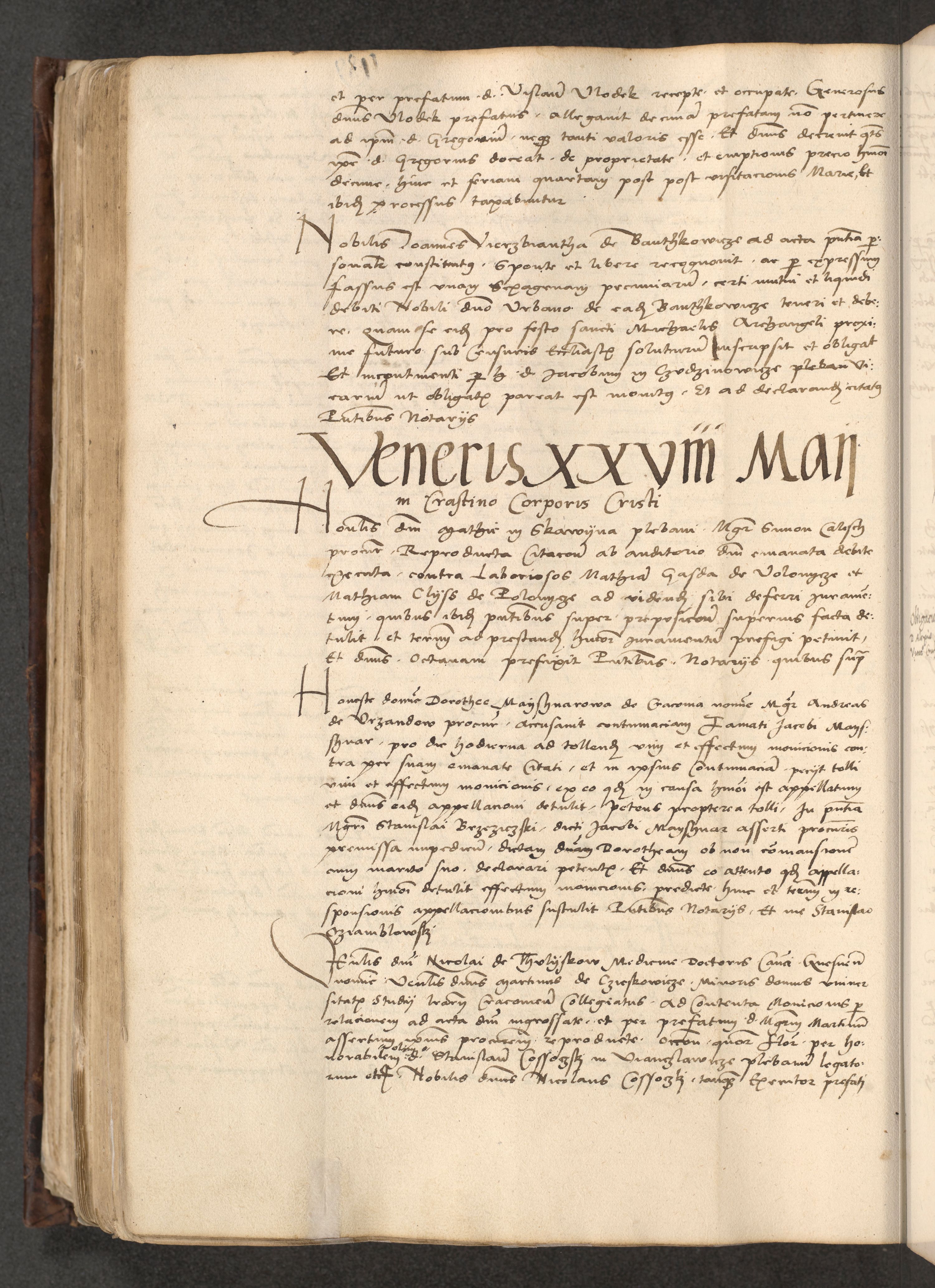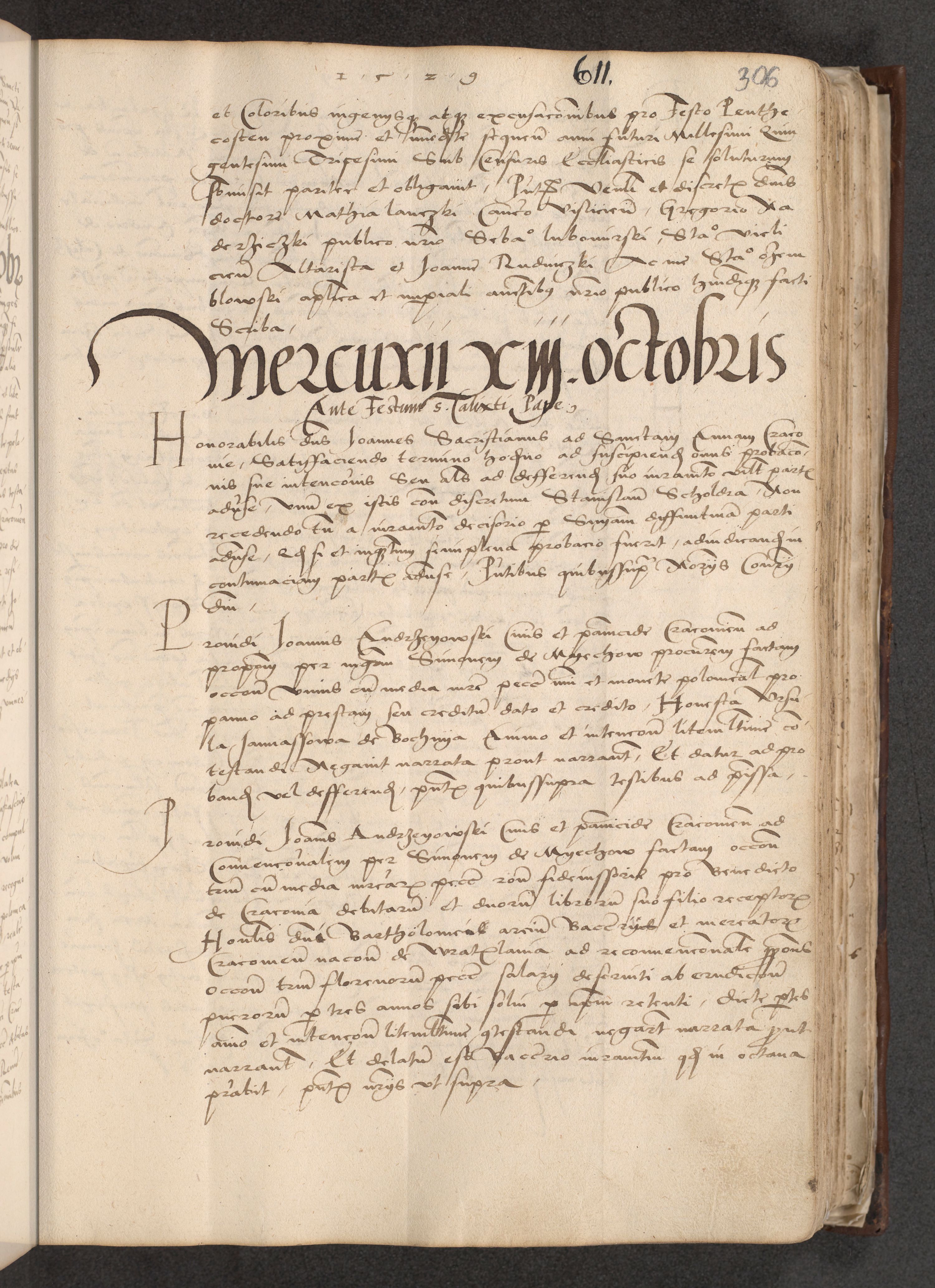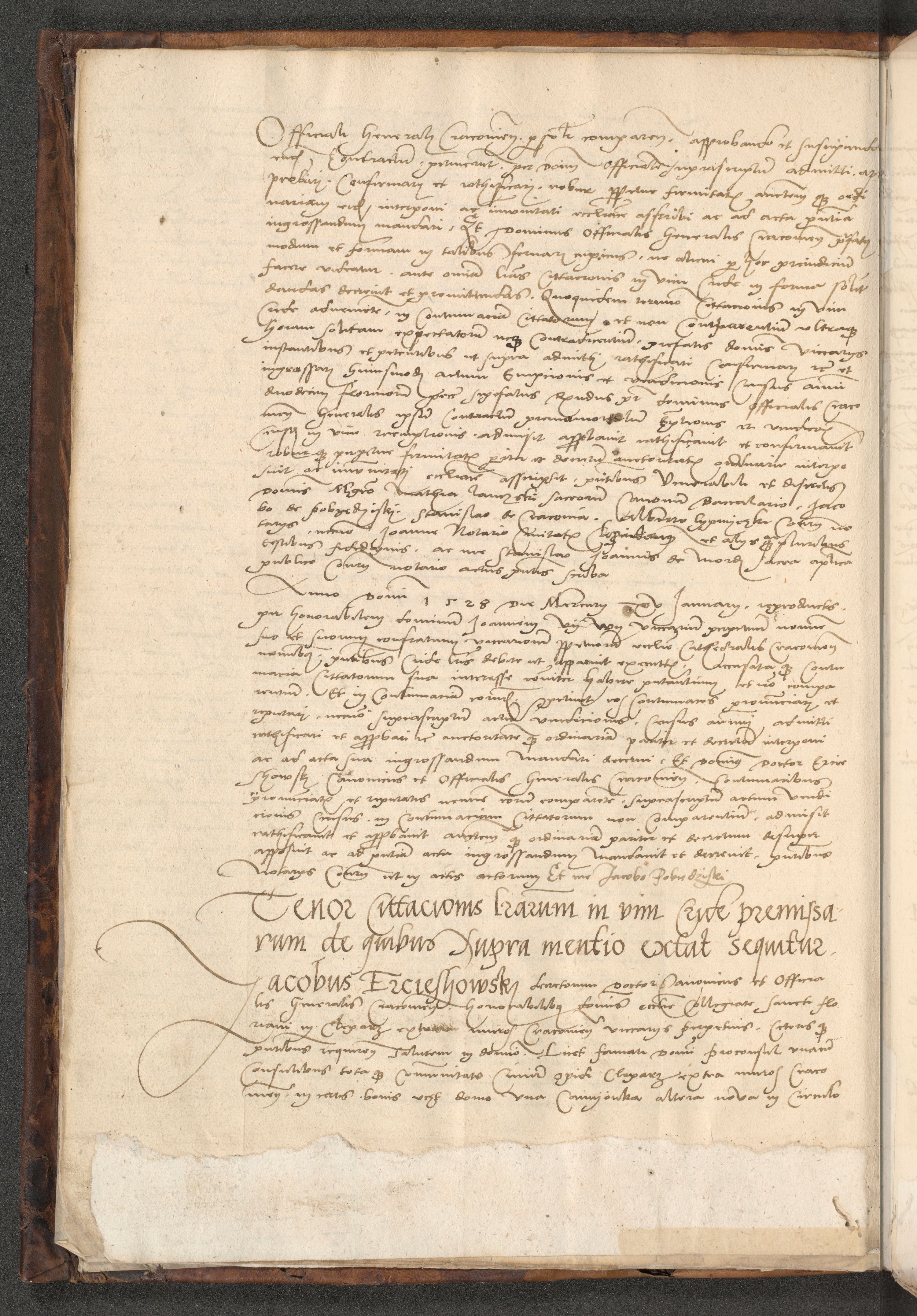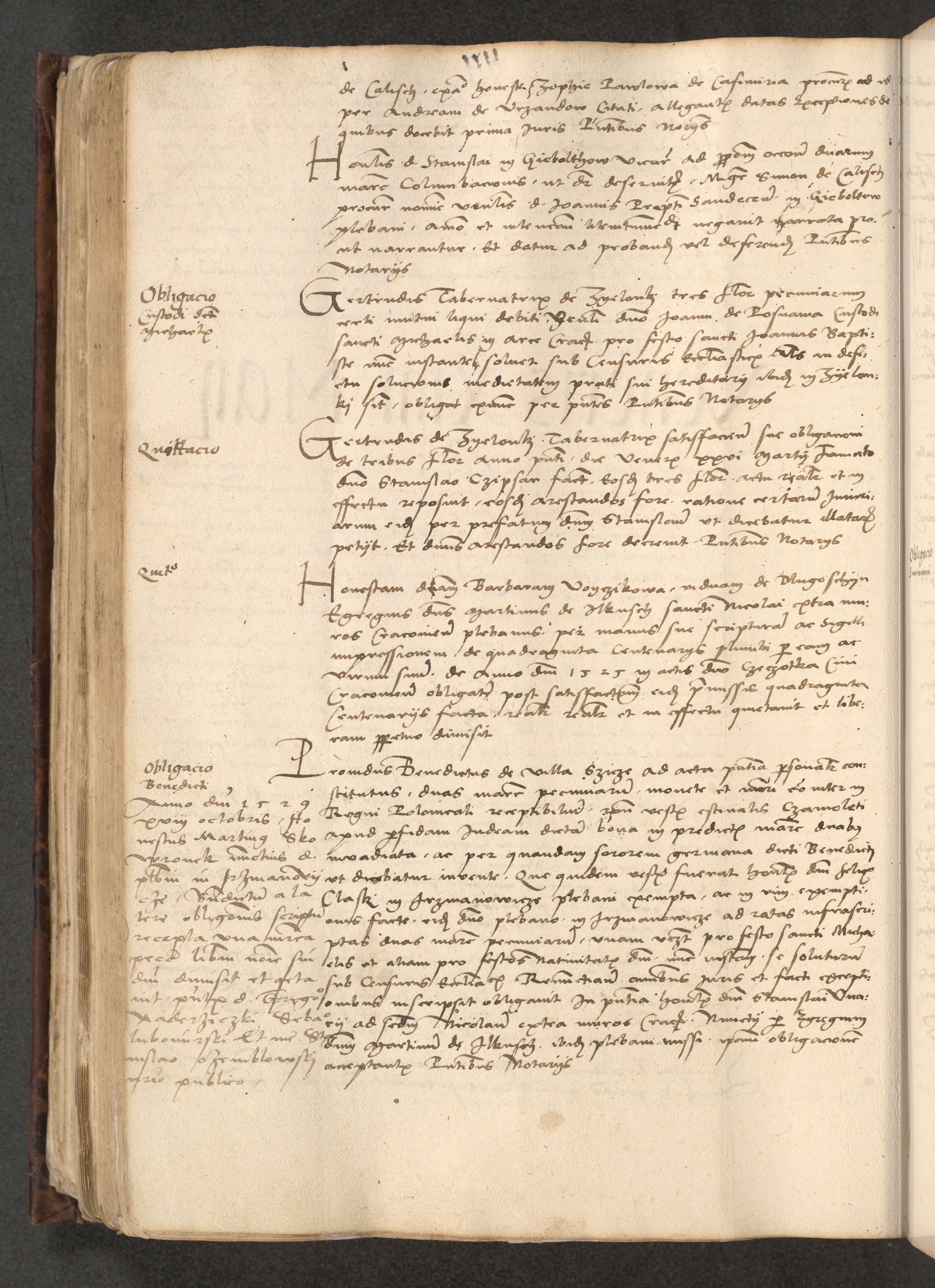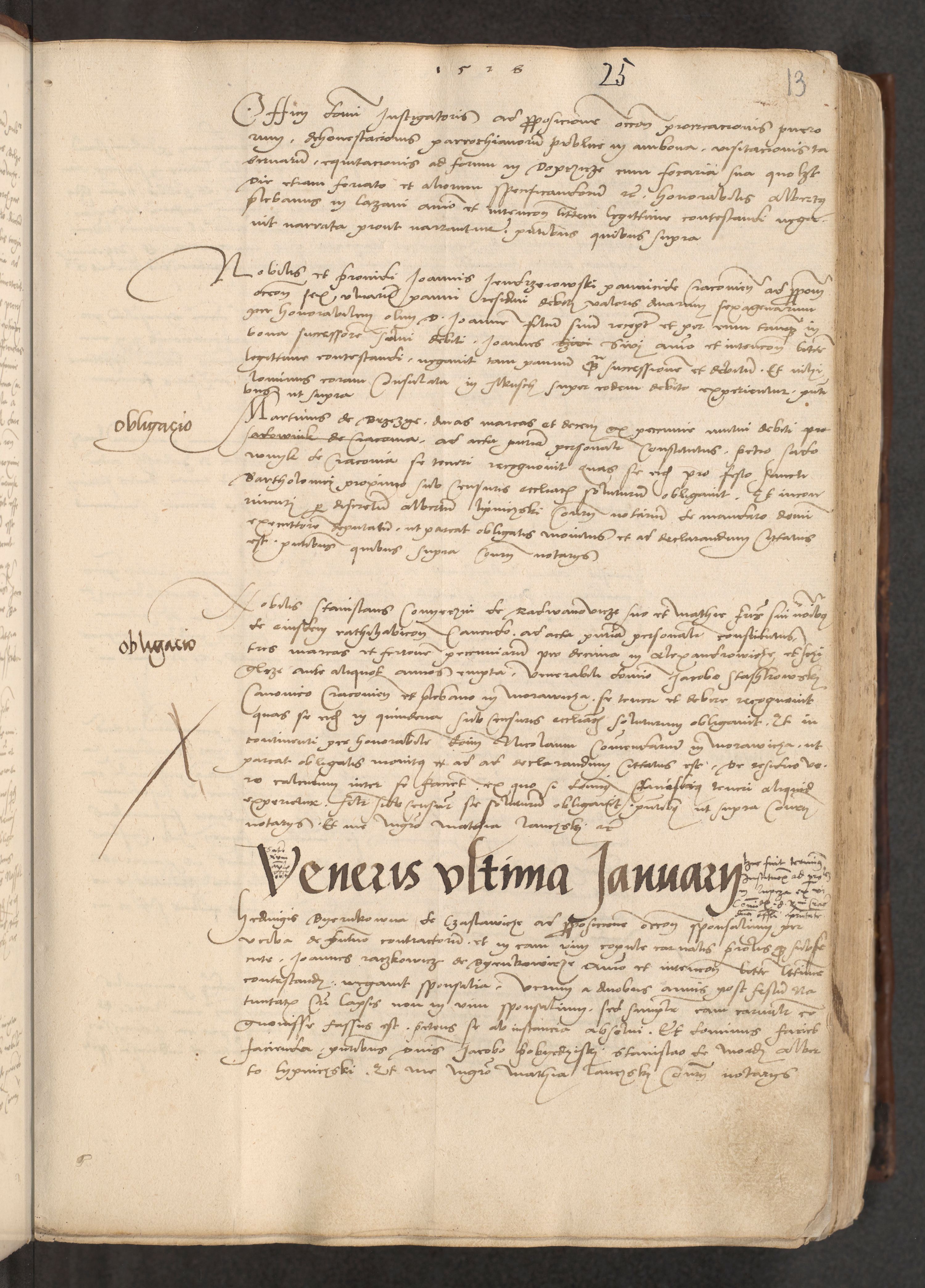 INRI. Acta actorum, obligacionum et sentenciarum tam interlocutoriarum quam diffinitivarum coram reverendo patre ac egregio viro domino Jacobo Erciss[o]wski decretorum doctorem, canonico et officiali generali Cracoviensi ad annum Domini 1528, indicionem primam, pontificatus sanctissimi in Christo patris et domini domini Clementis divina probidendcia pape seprtimi, annum quintum, per Stanislaum de Mordi legalem consistorii notarium omine felici inchoantur