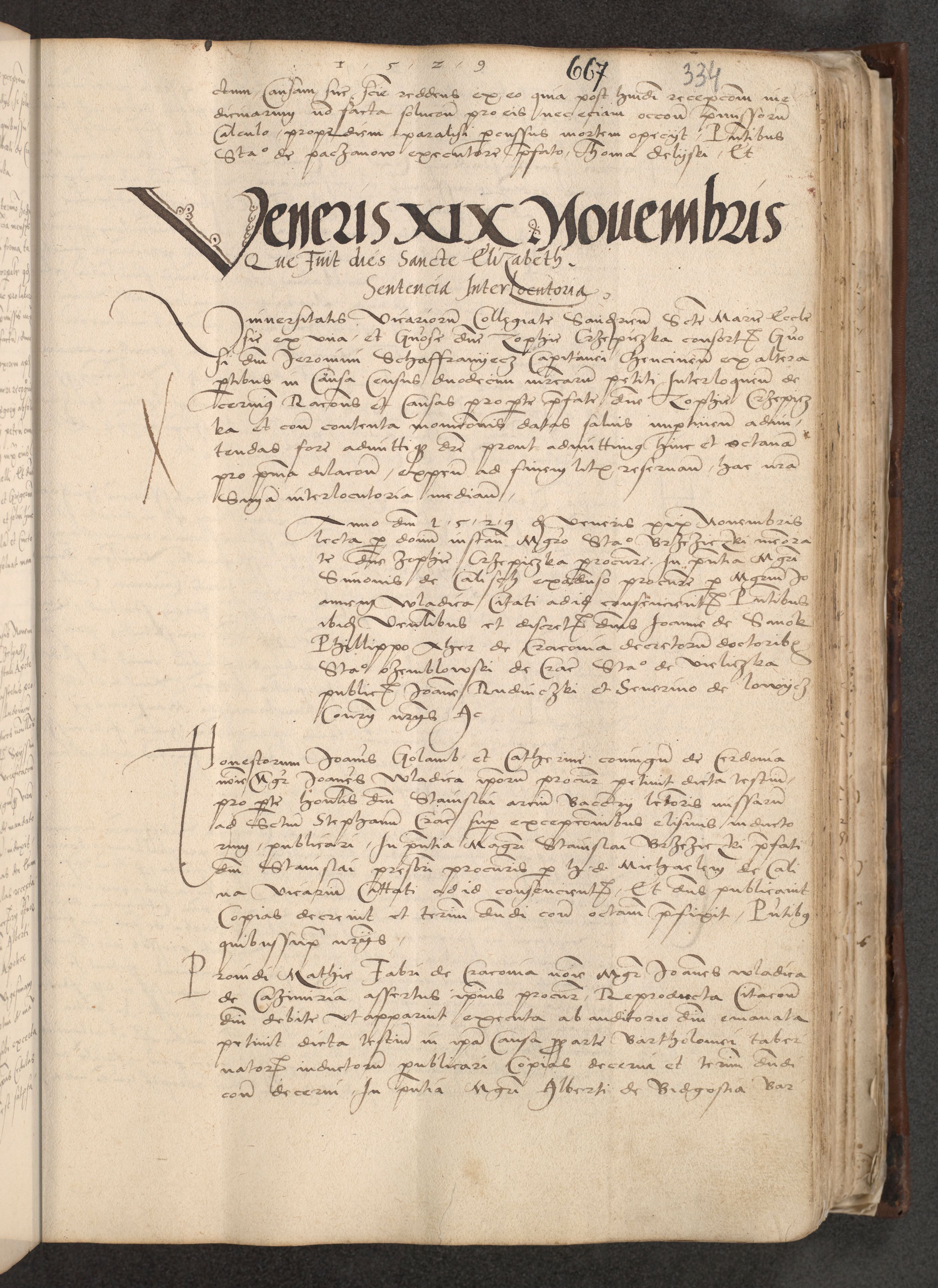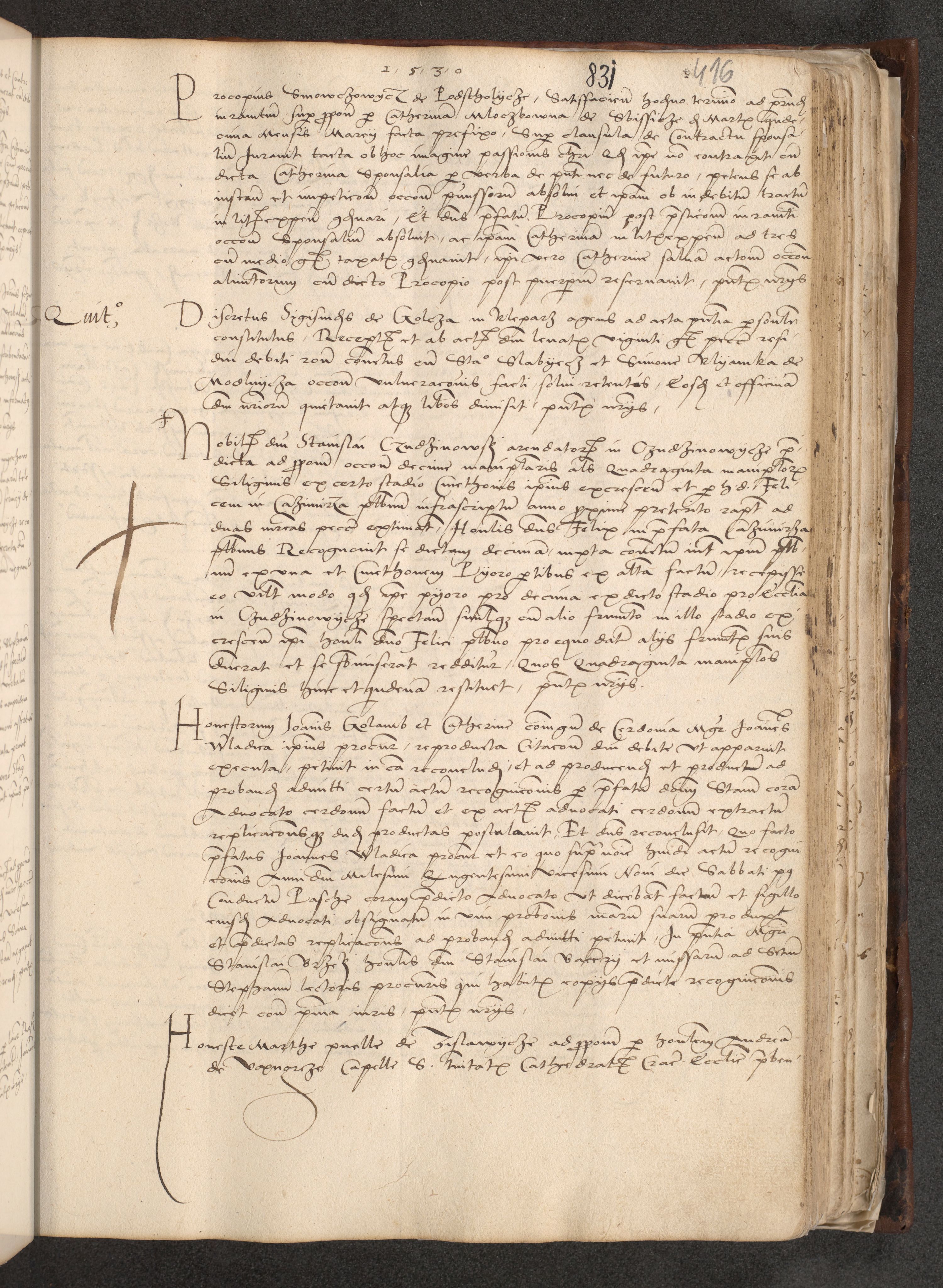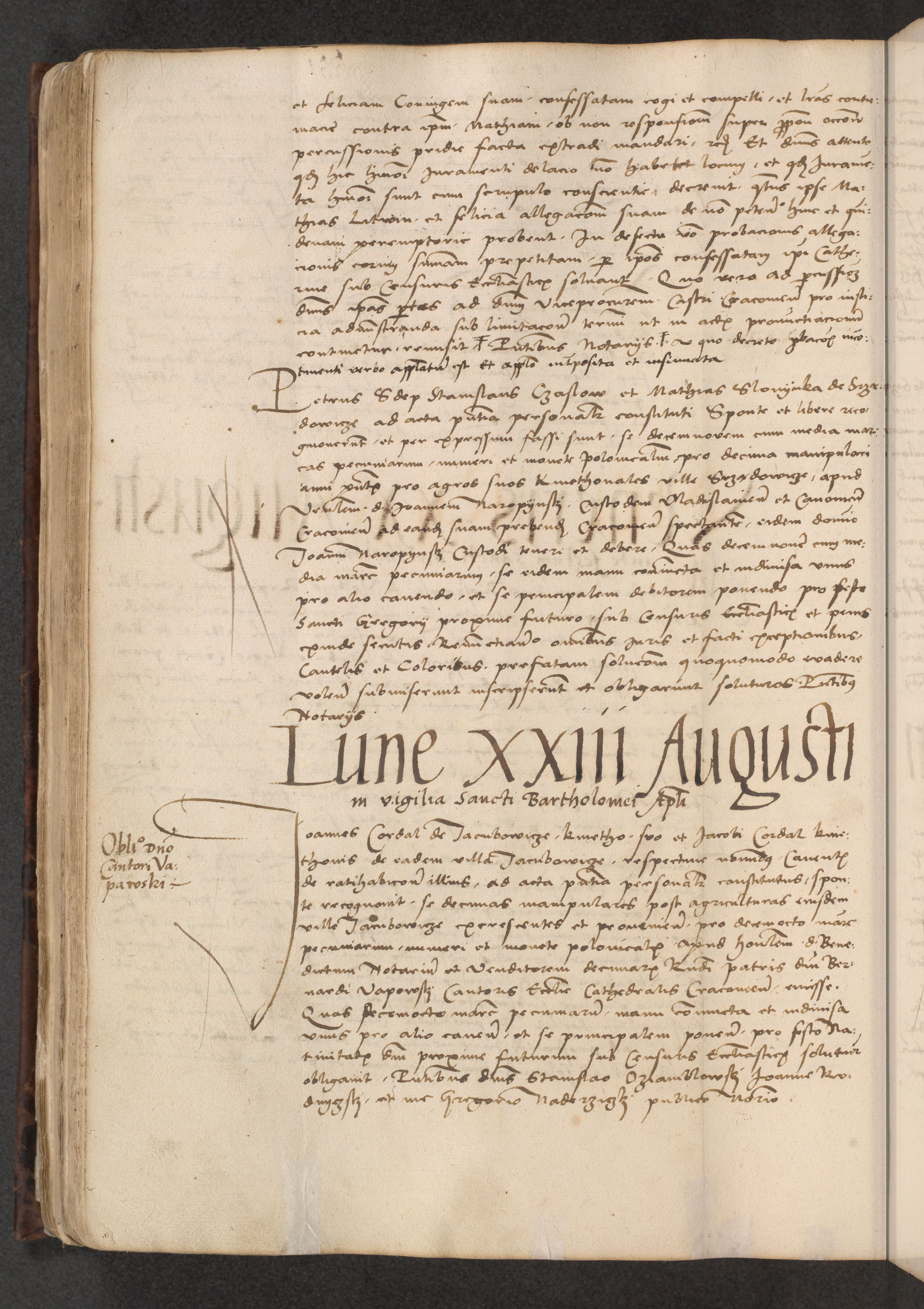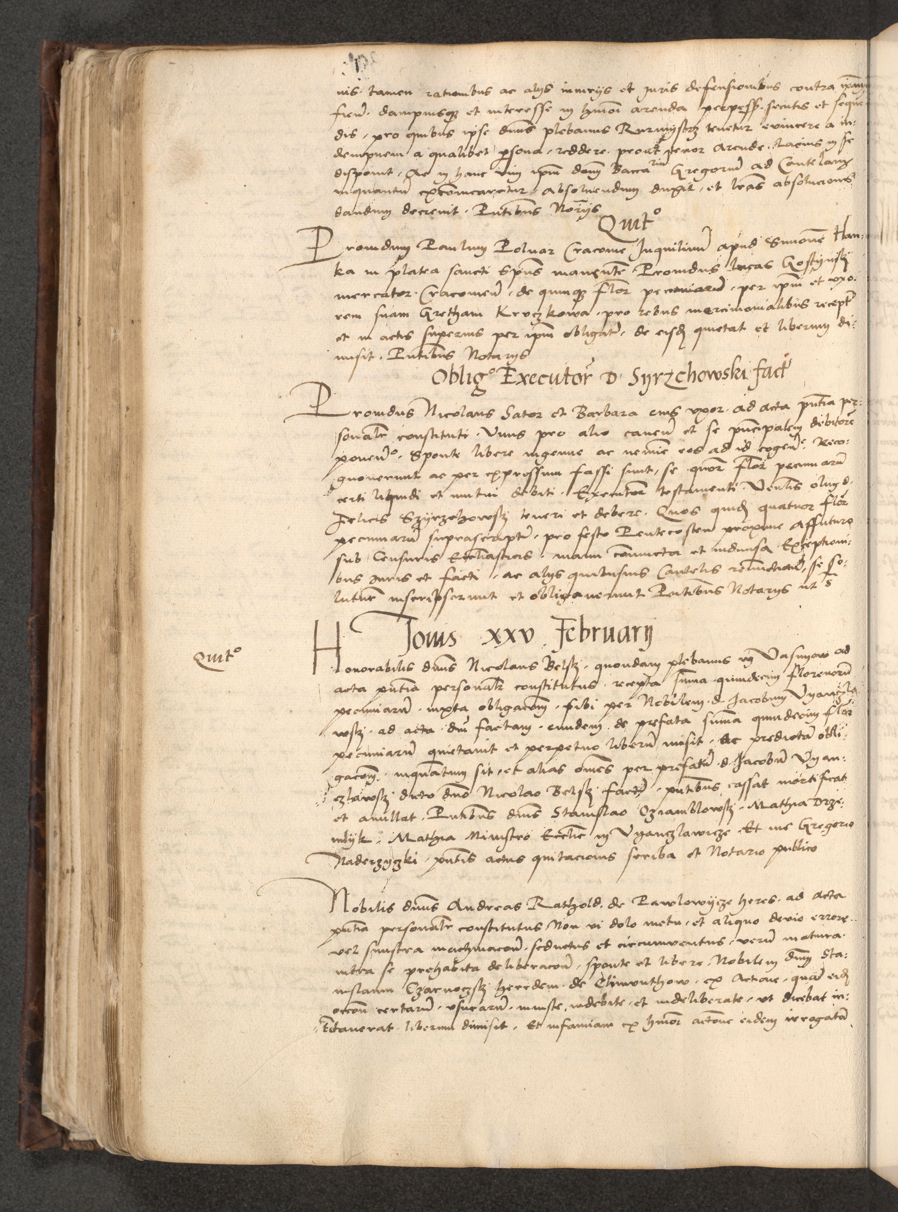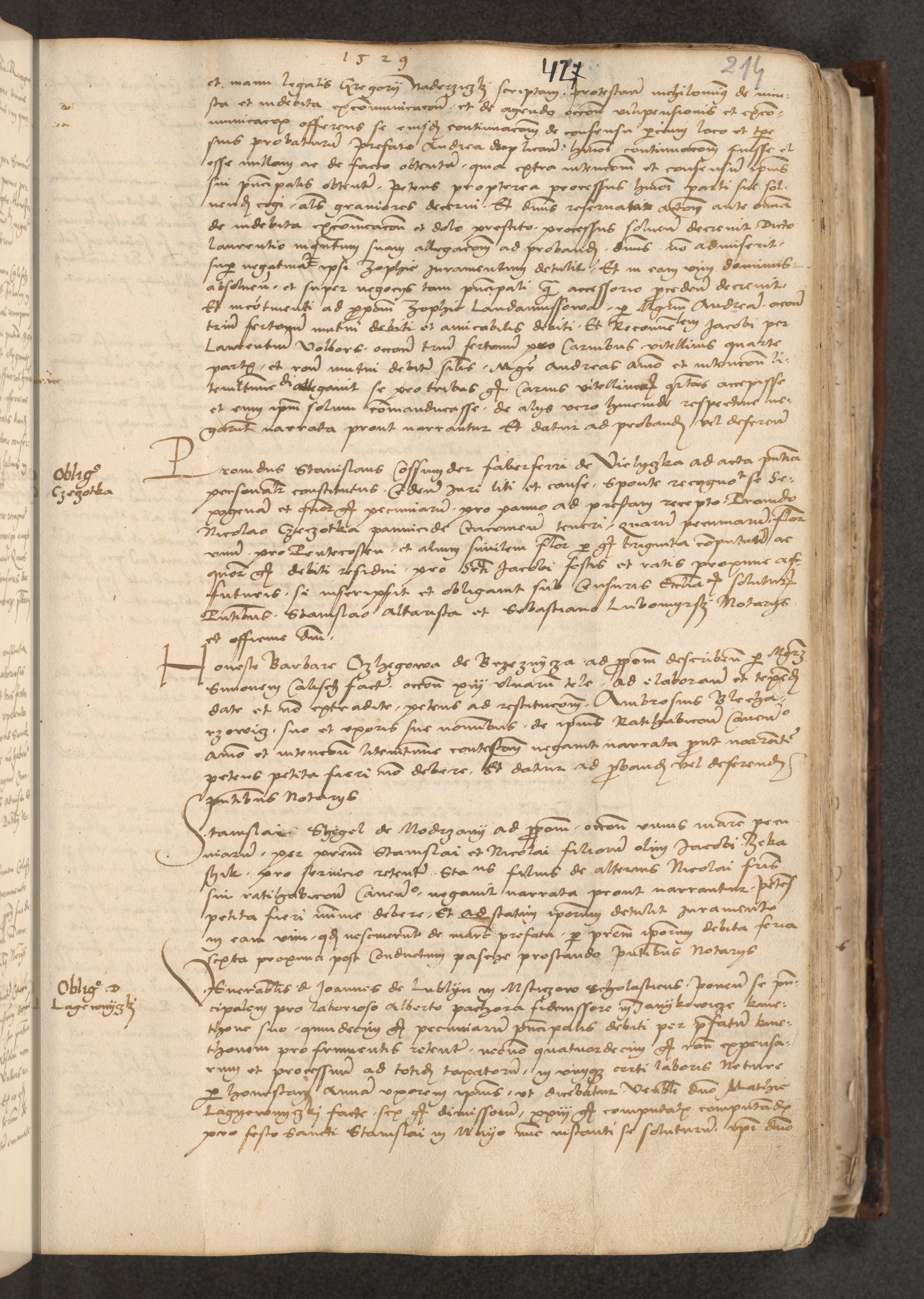 INRI. Acta actorum, obligacionum et sentenciarum tam interlocutoriarum quam diffinitivarum coram reverendo patre ac egregio viro domino Jacobo Erciss[o]wski decretorum doctorem, canonico et officiali generali Cracoviensi ad annum Domini 1528, indicionem primam, pontificatus sanctissimi in Christo patris et domini domini Clementis divina probidendcia pape seprtimi, annum quintum, per Stanislaum de Mordi legalem consistorii notarium omine felici inchoantur