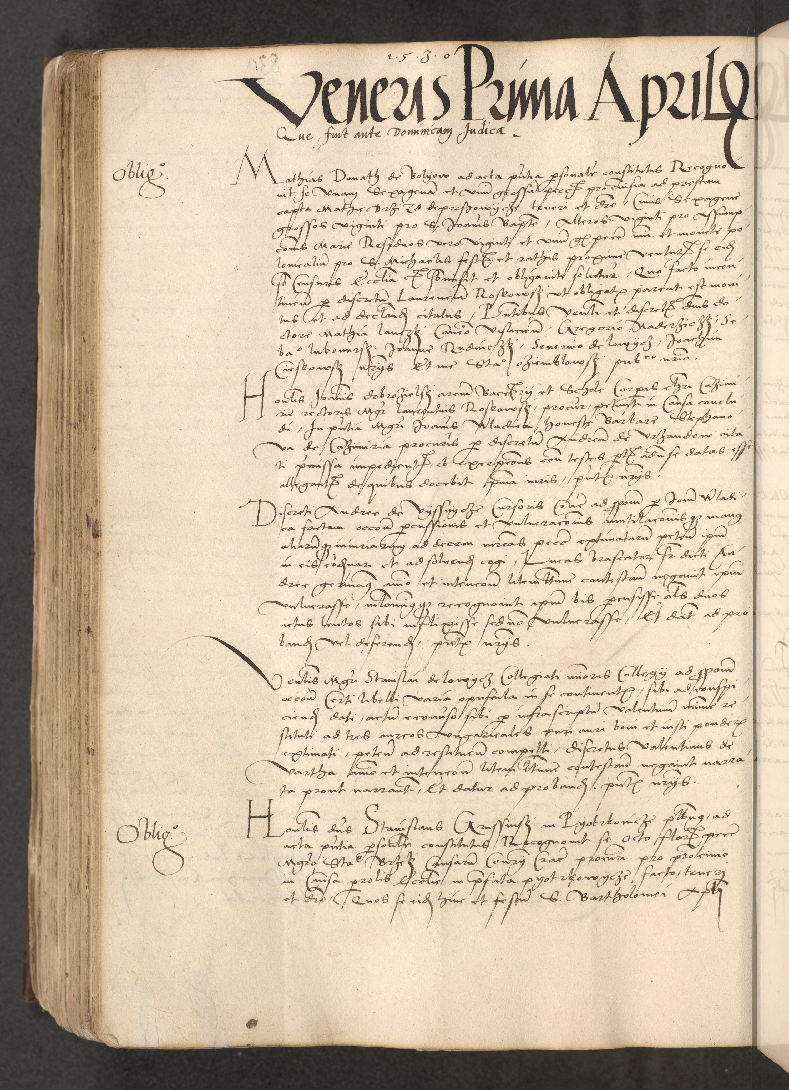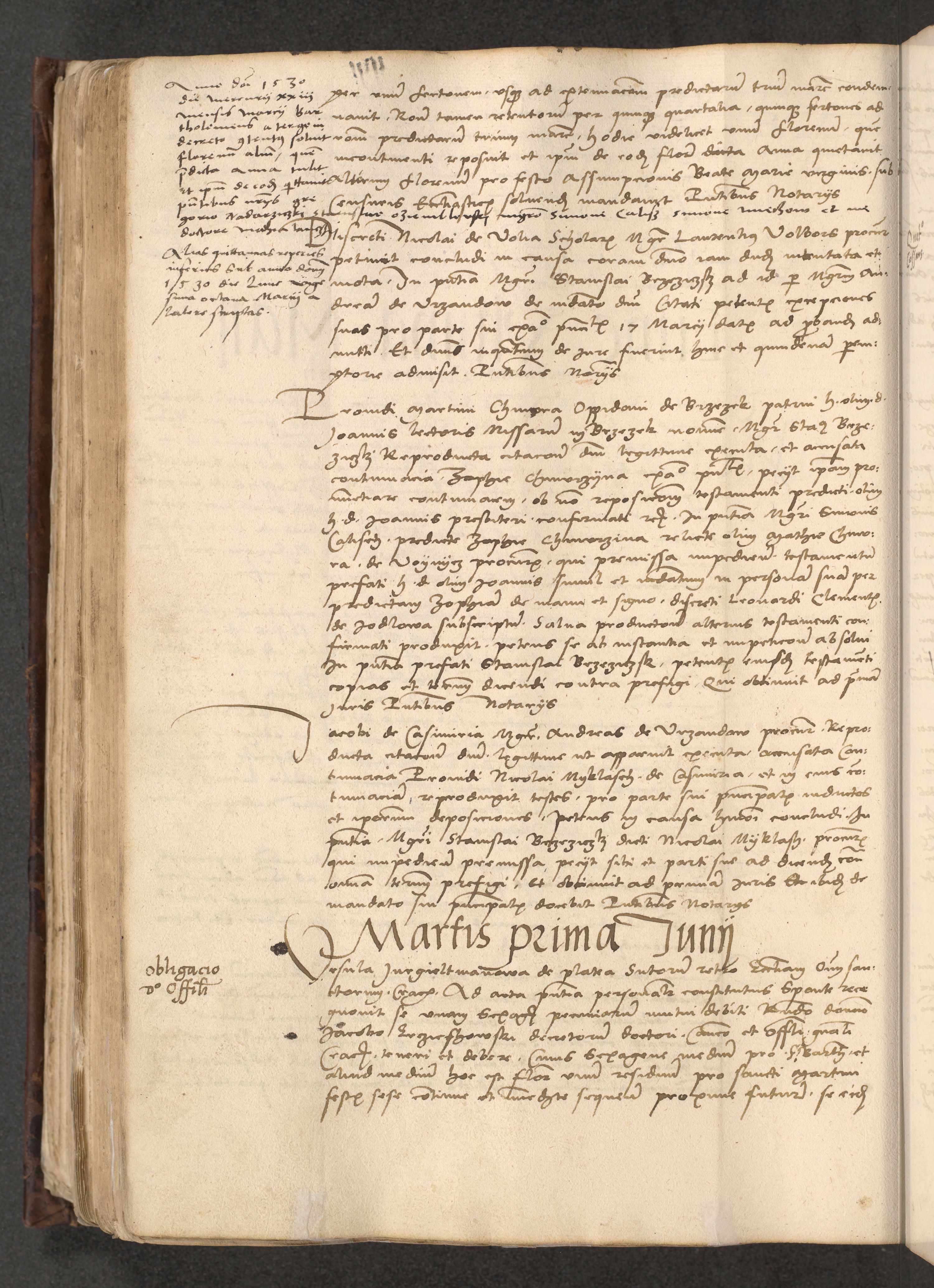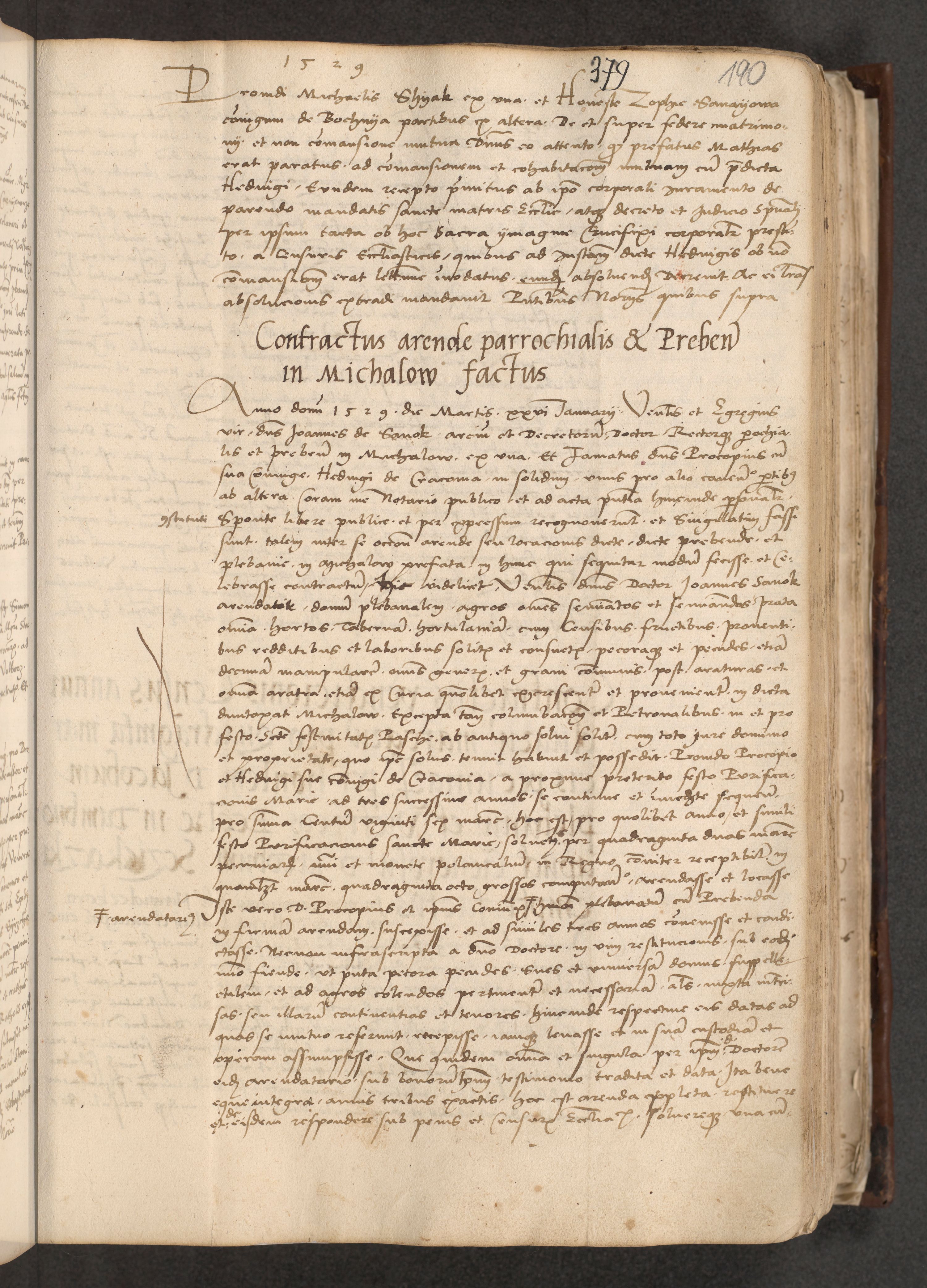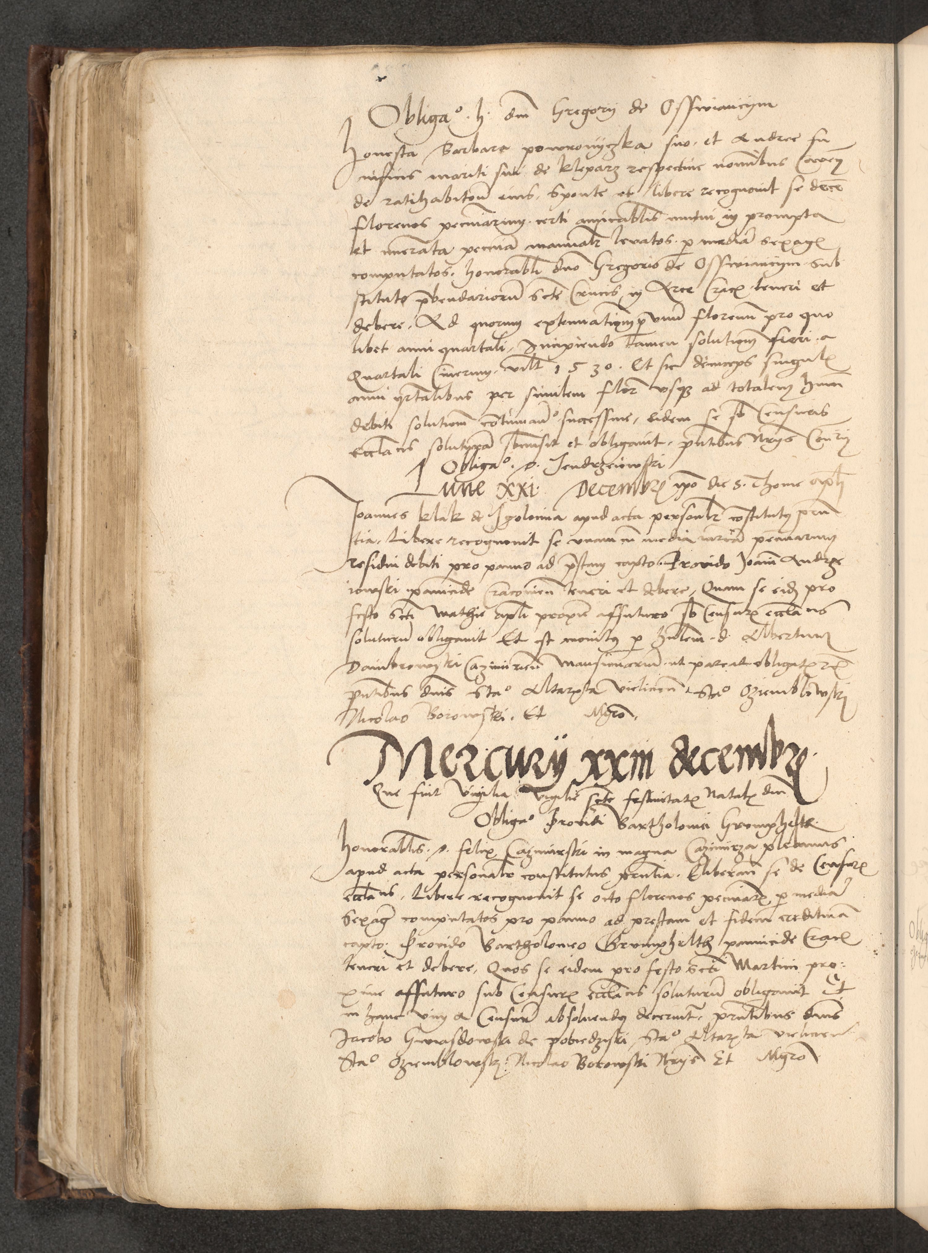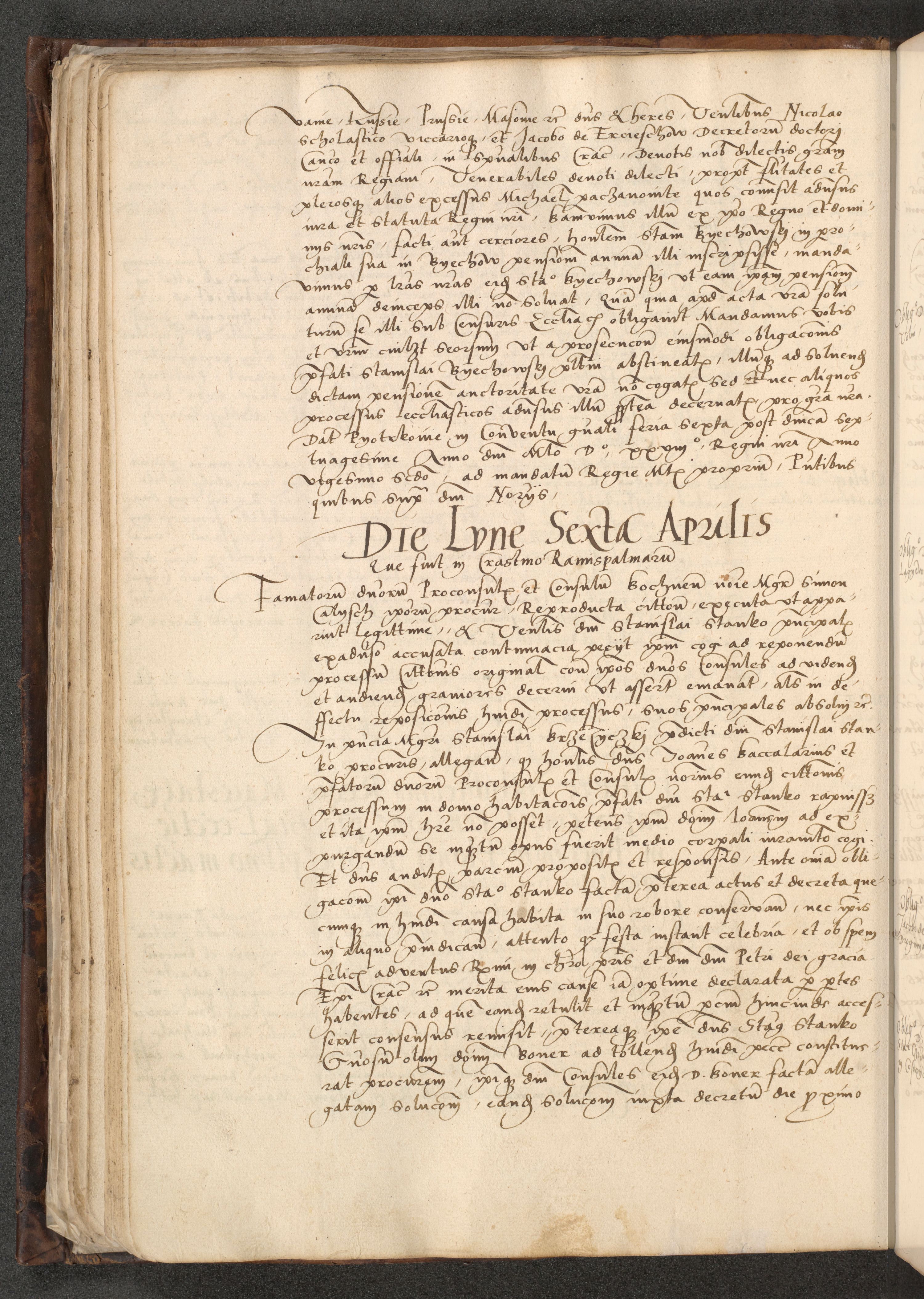 INRI. Acta actorum, obligacionum et sentenciarum tam interlocutoriarum quam diffinitivarum coram reverendo patre ac egregio viro domino Jacobo Erciss[o]wski decretorum doctorem, canonico et officiali generali Cracoviensi ad annum Domini 1528, indicionem primam, pontificatus sanctissimi in Christo patris et domini domini Clementis divina probidendcia pape seprtimi, annum quintum, per Stanislaum de Mordi legalem consistorii notarium omine felici inchoantur
