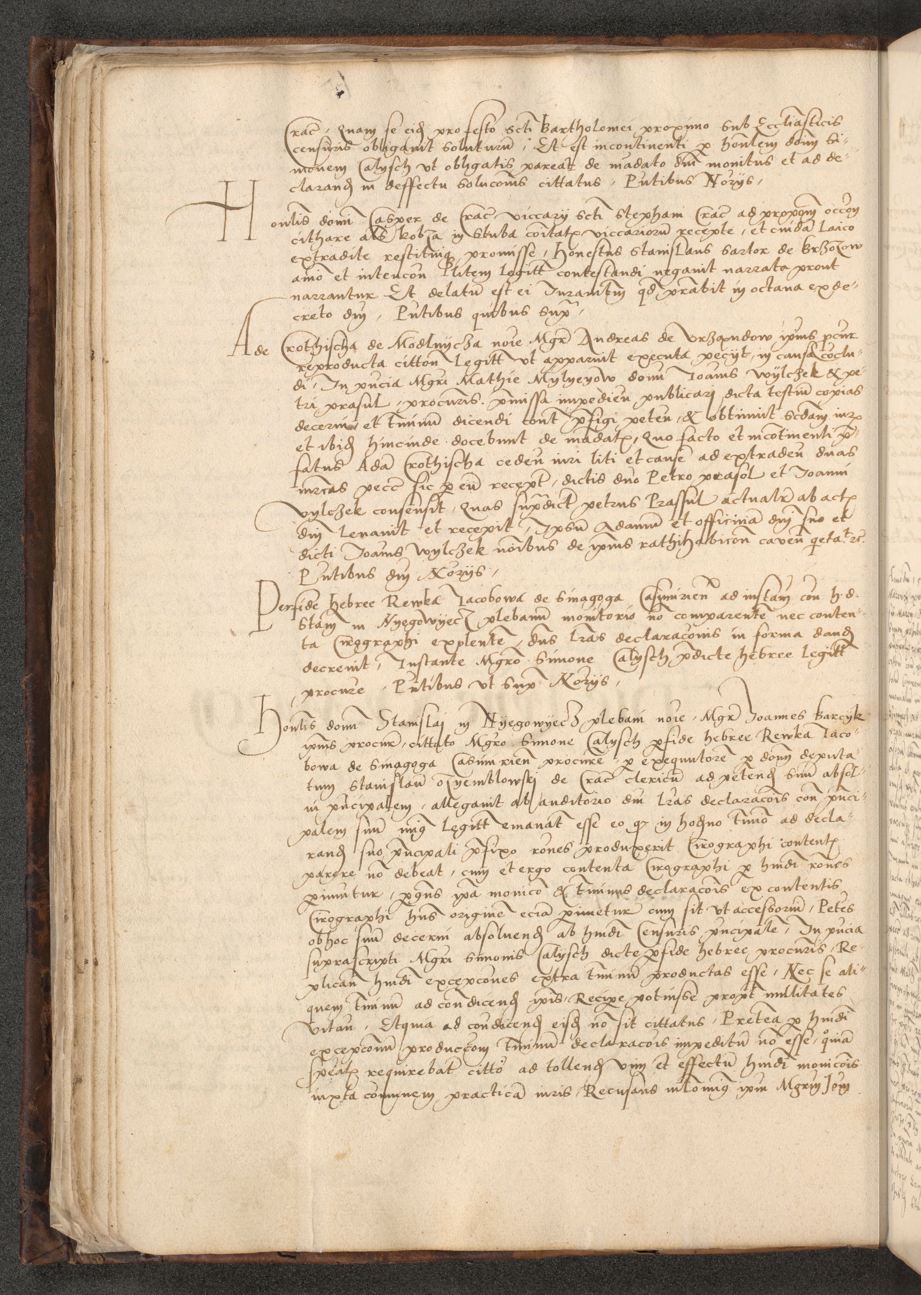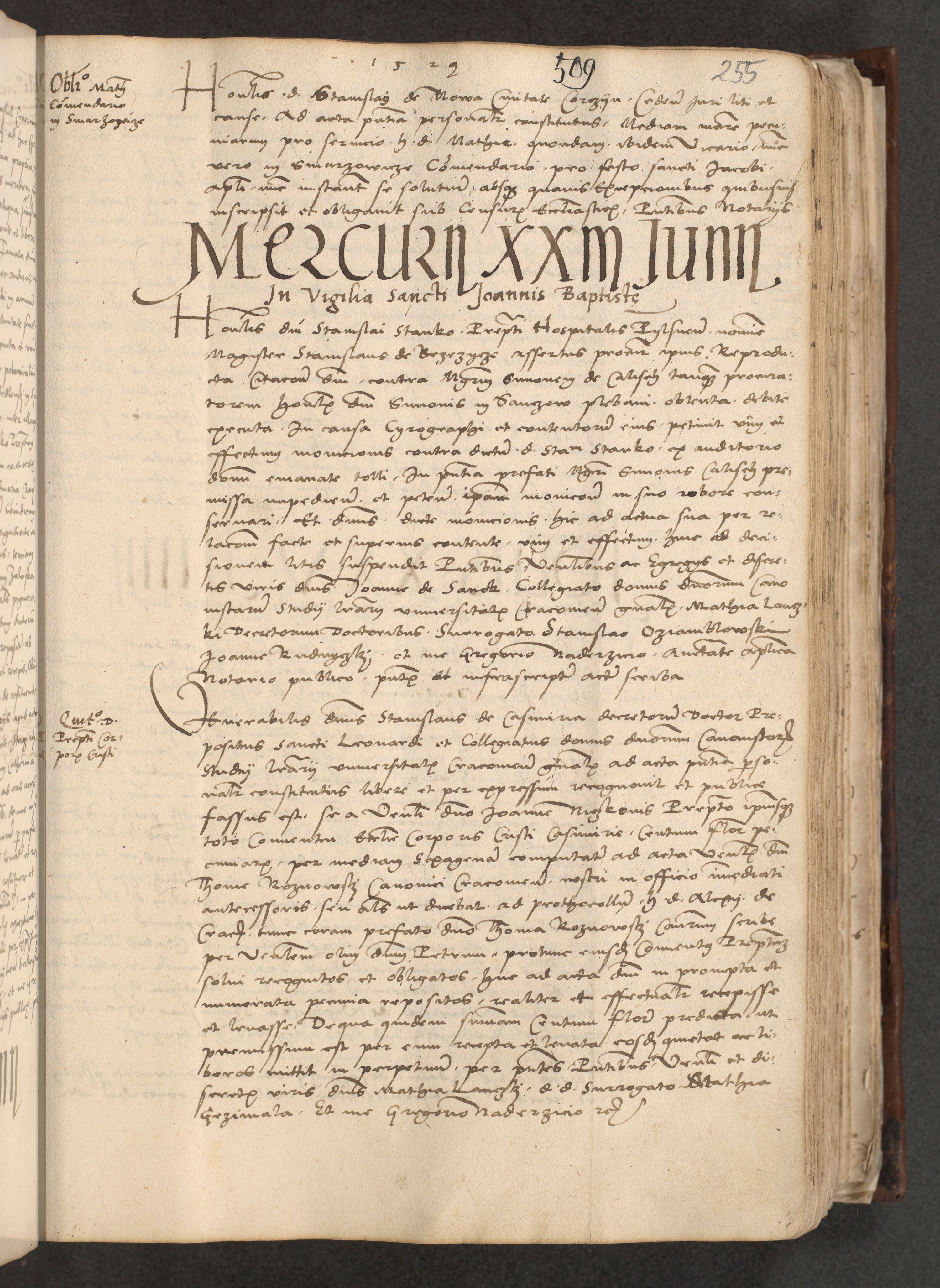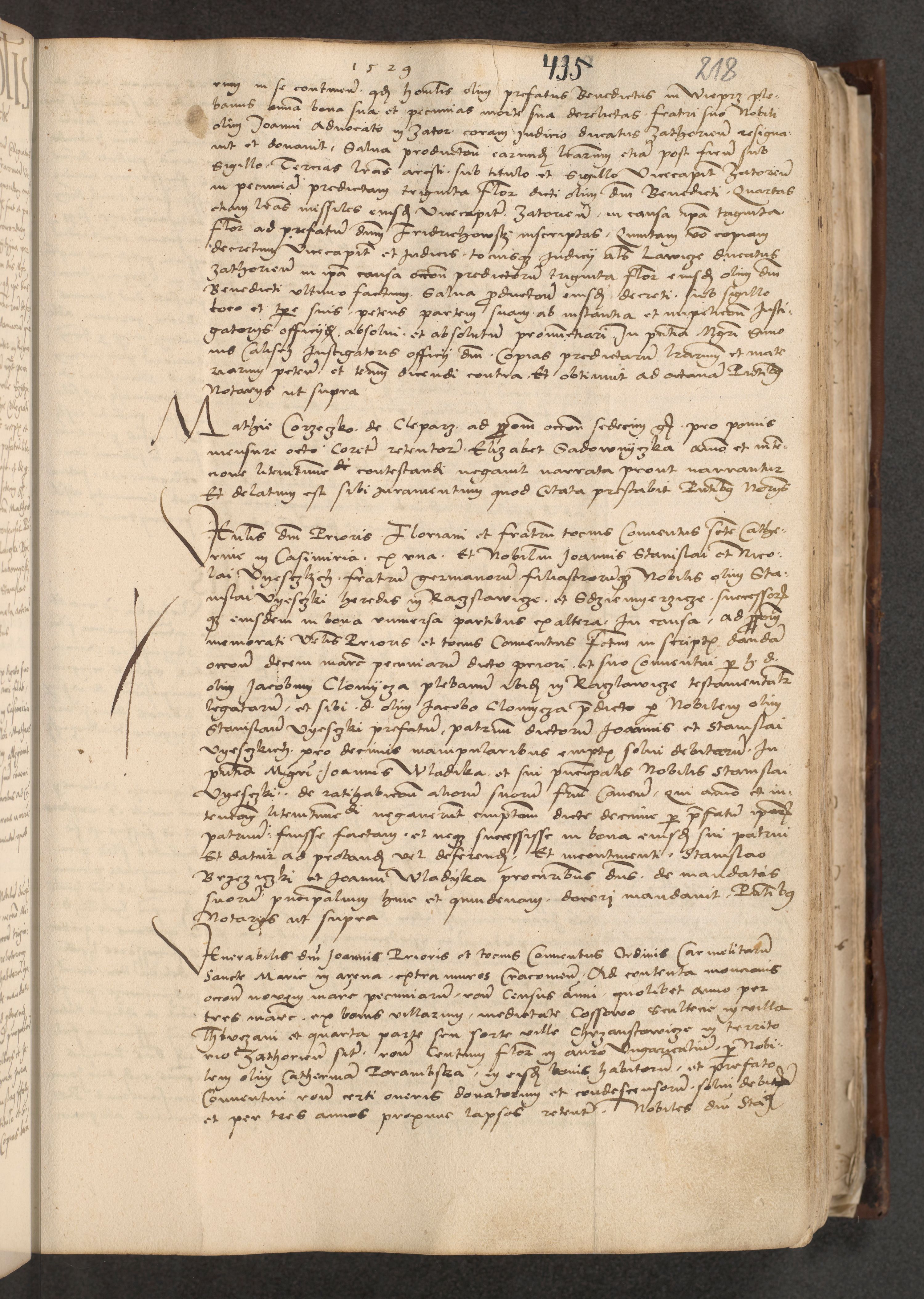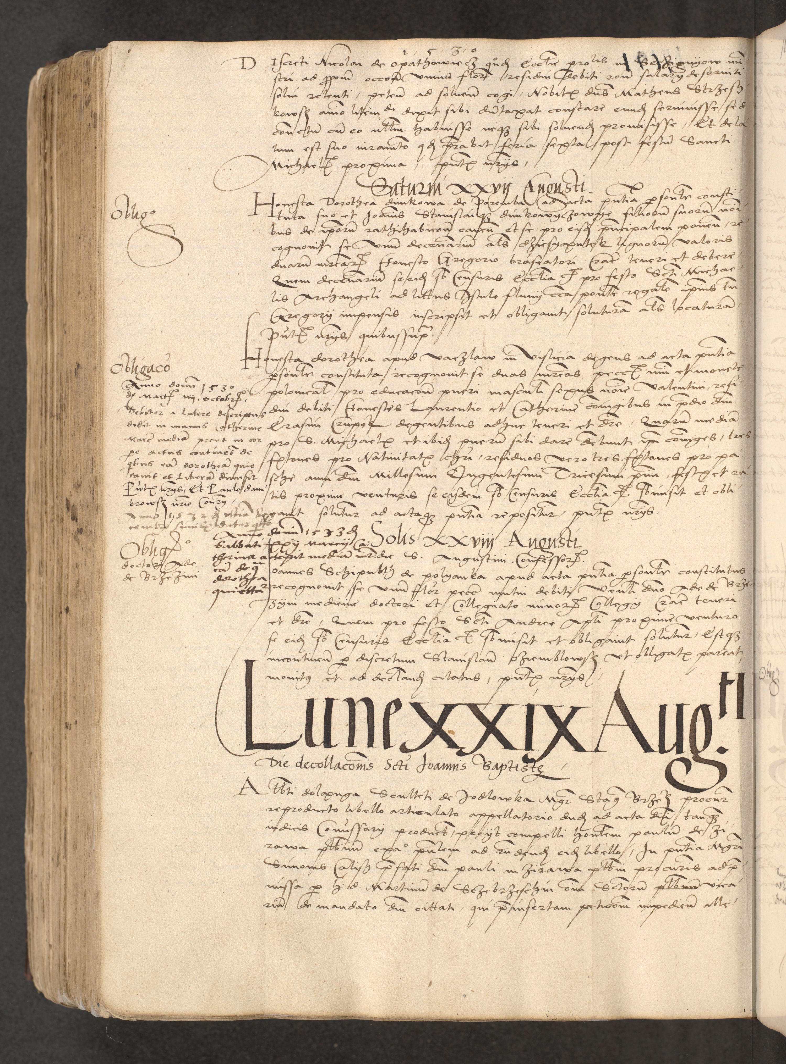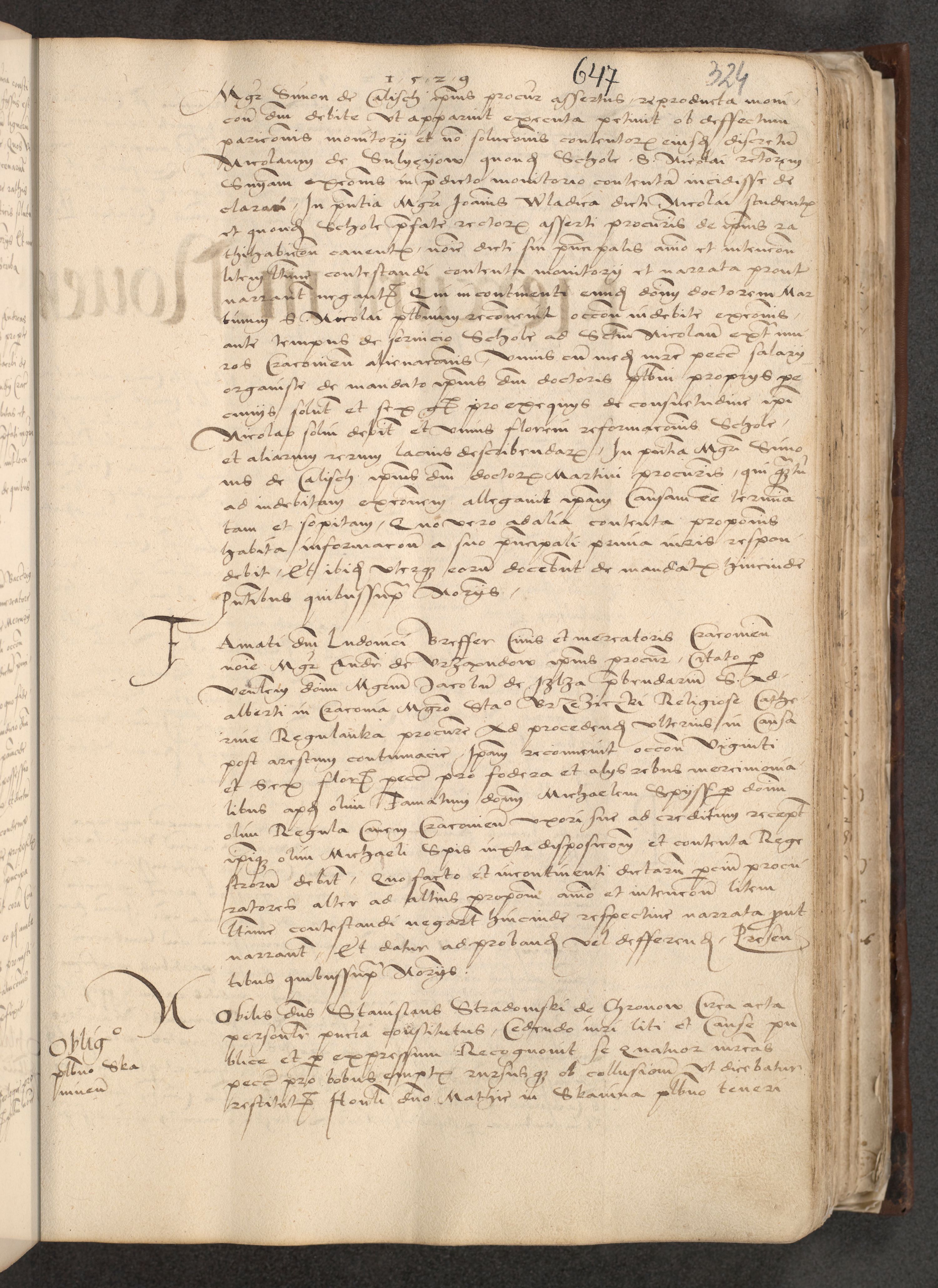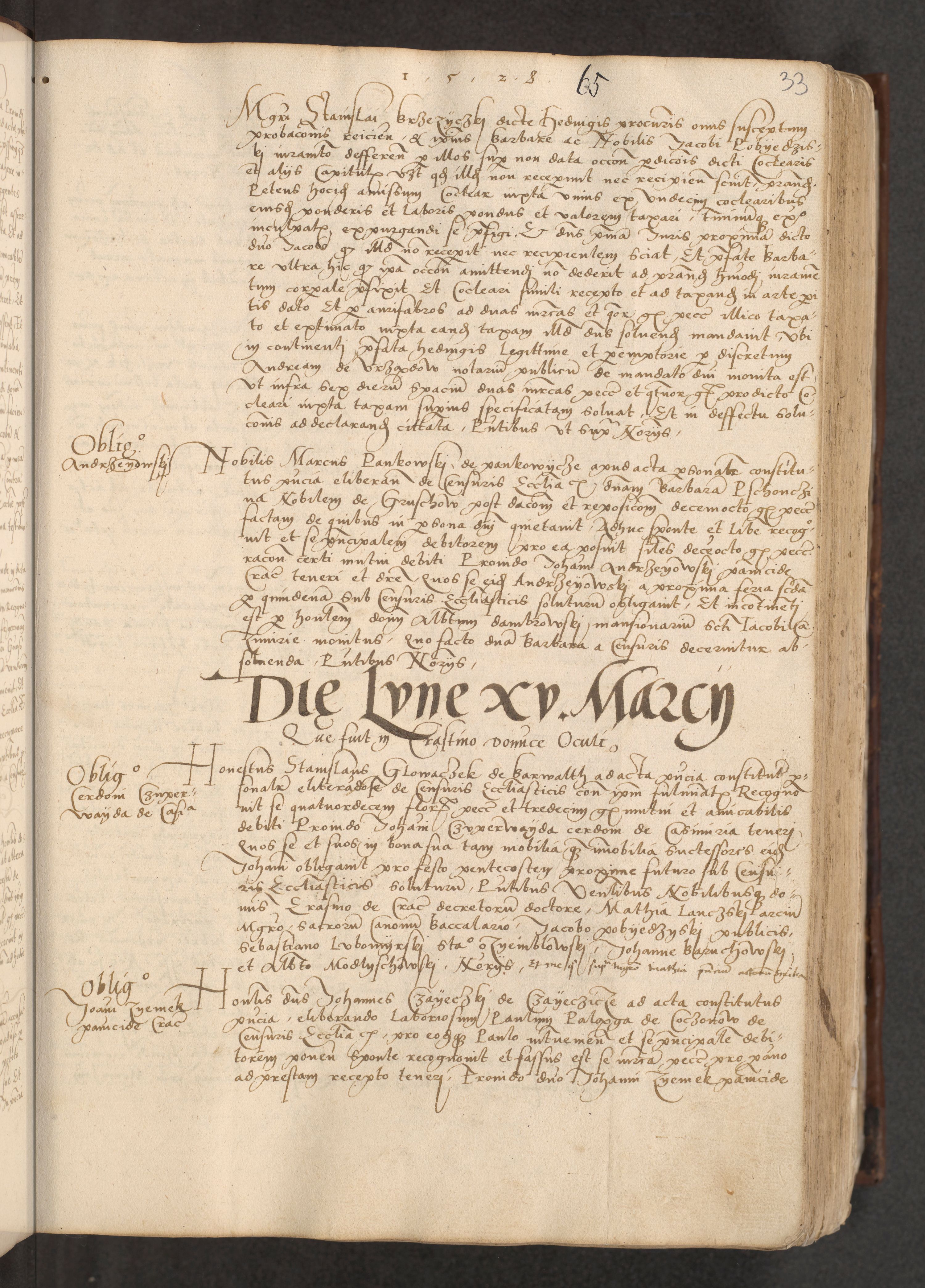 INRI. Acta actorum, obligacionum et sentenciarum tam interlocutoriarum quam diffinitivarum coram reverendo patre ac egregio viro domino Jacobo Erciss[o]wski decretorum doctorem, canonico et officiali generali Cracoviensi ad annum Domini 1528, indicionem primam, pontificatus sanctissimi in Christo patris et domini domini Clementis divina probidendcia pape seprtimi, annum quintum, per Stanislaum de Mordi legalem consistorii notarium omine felici inchoantur