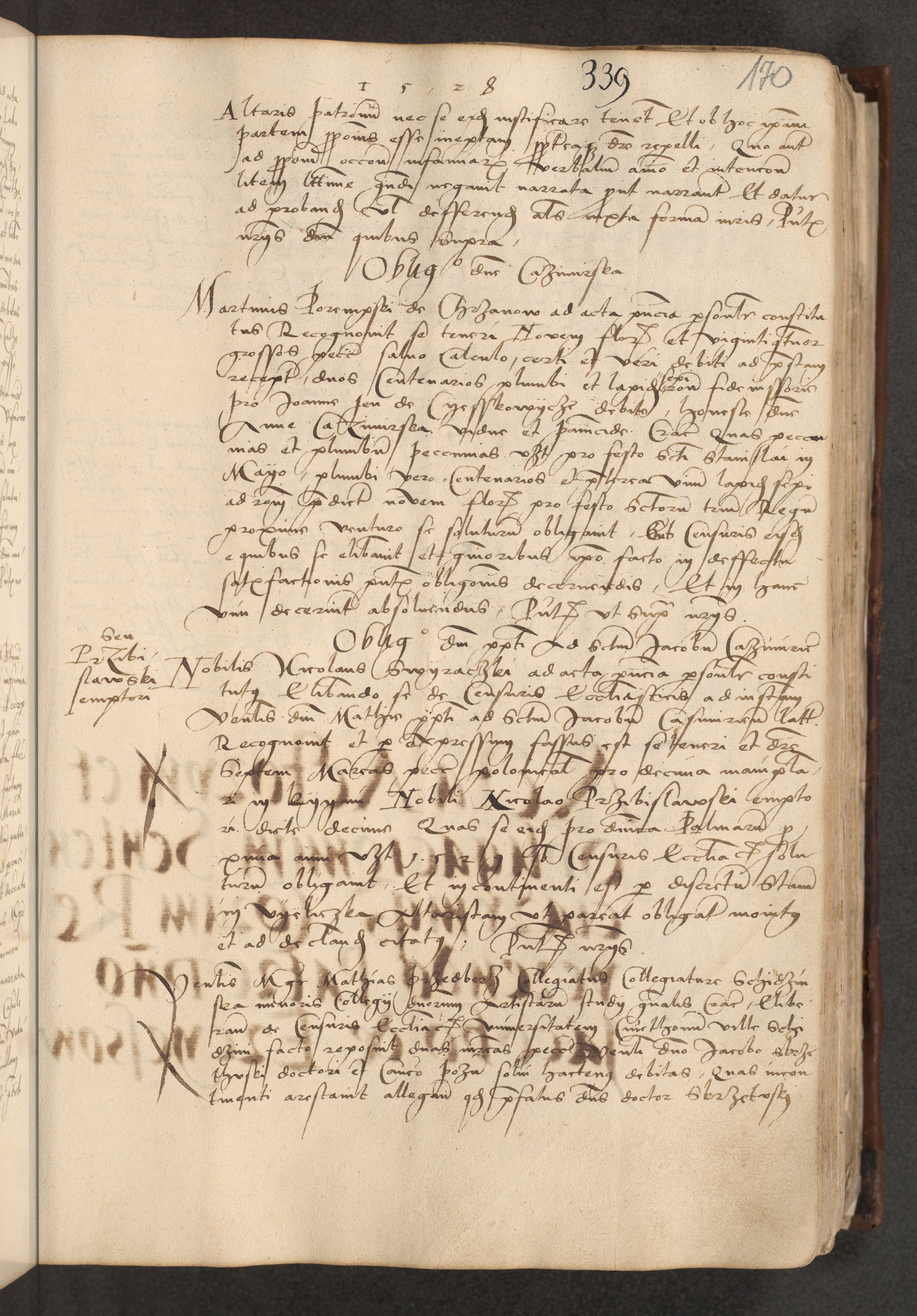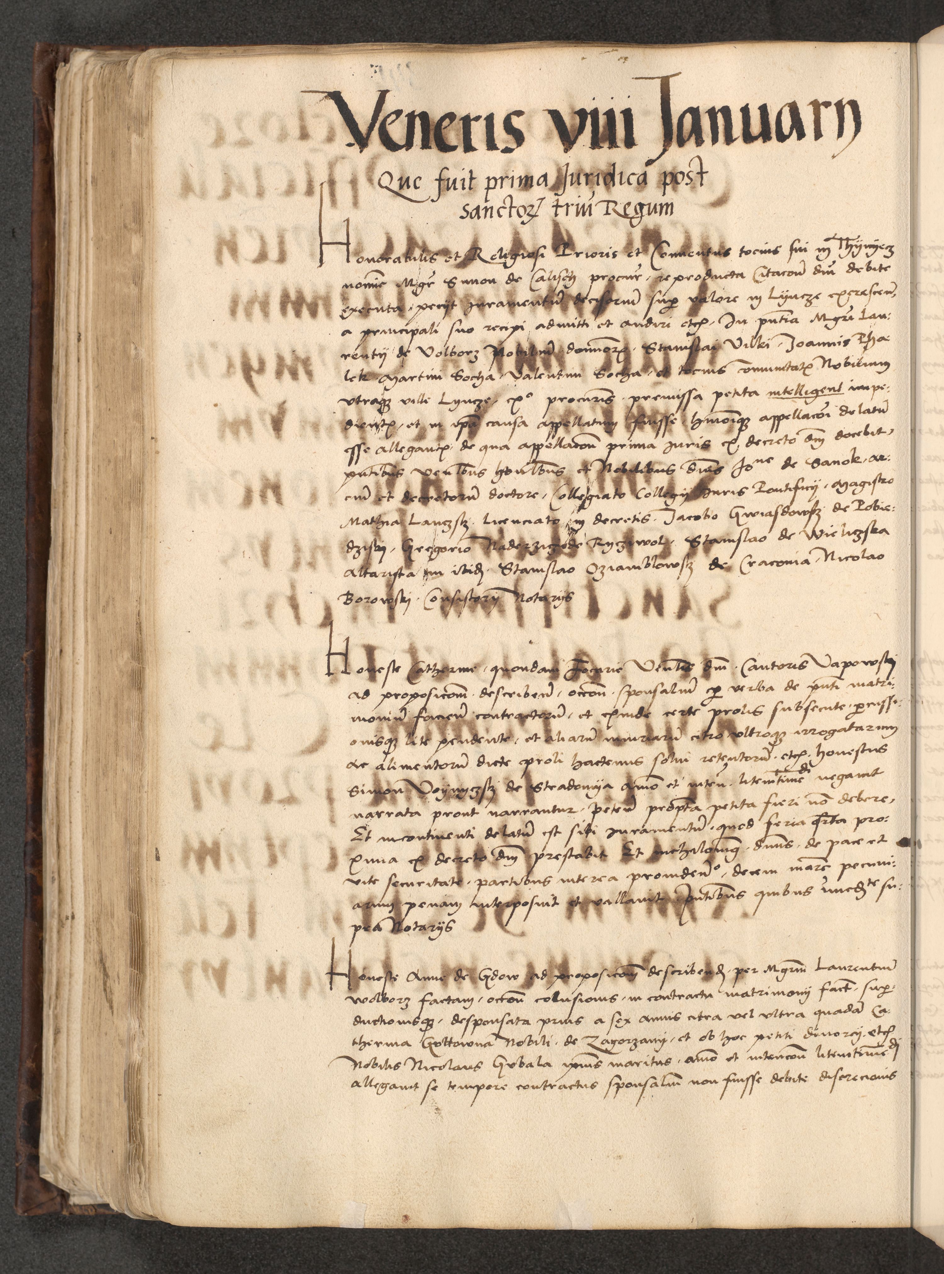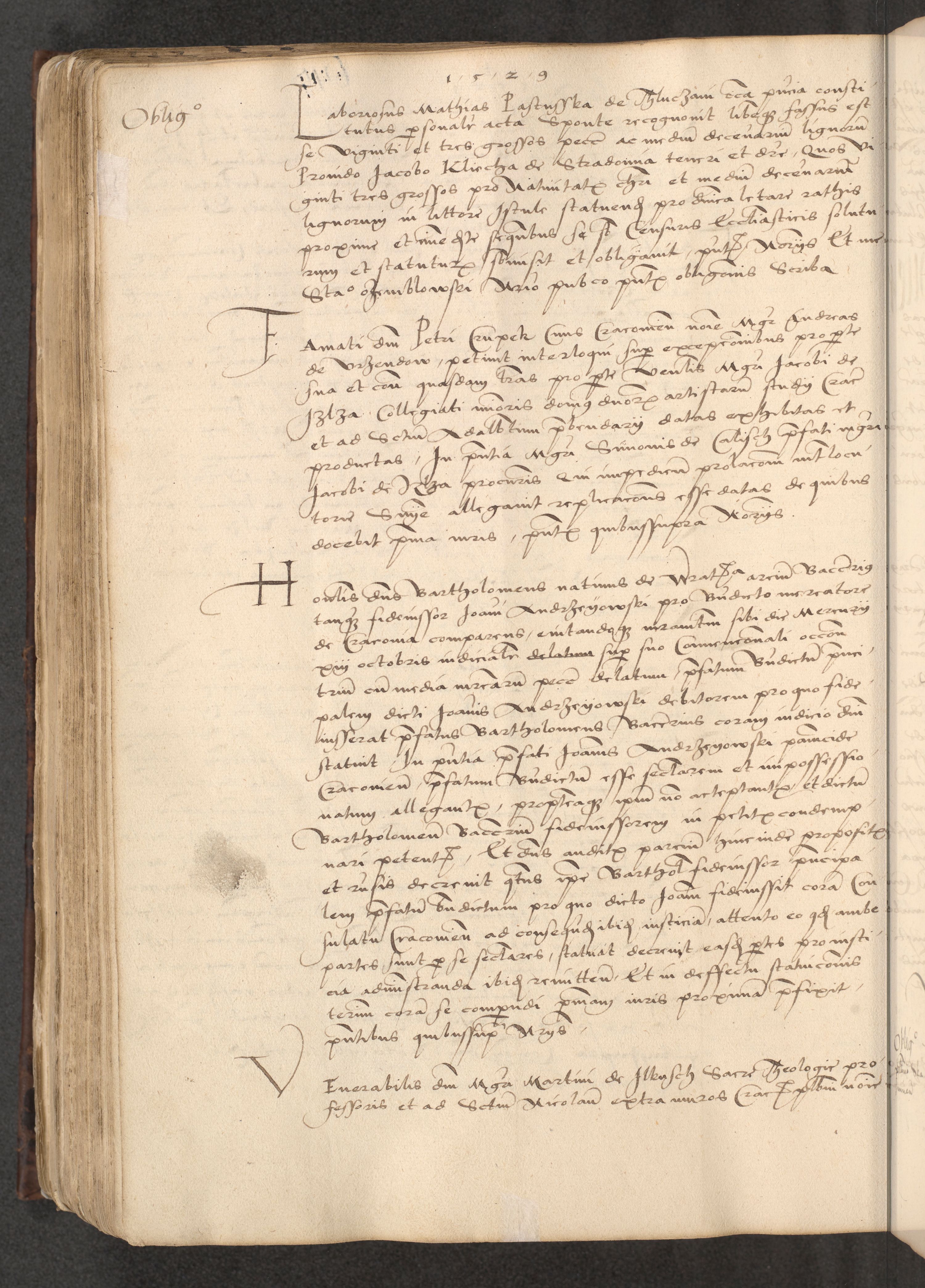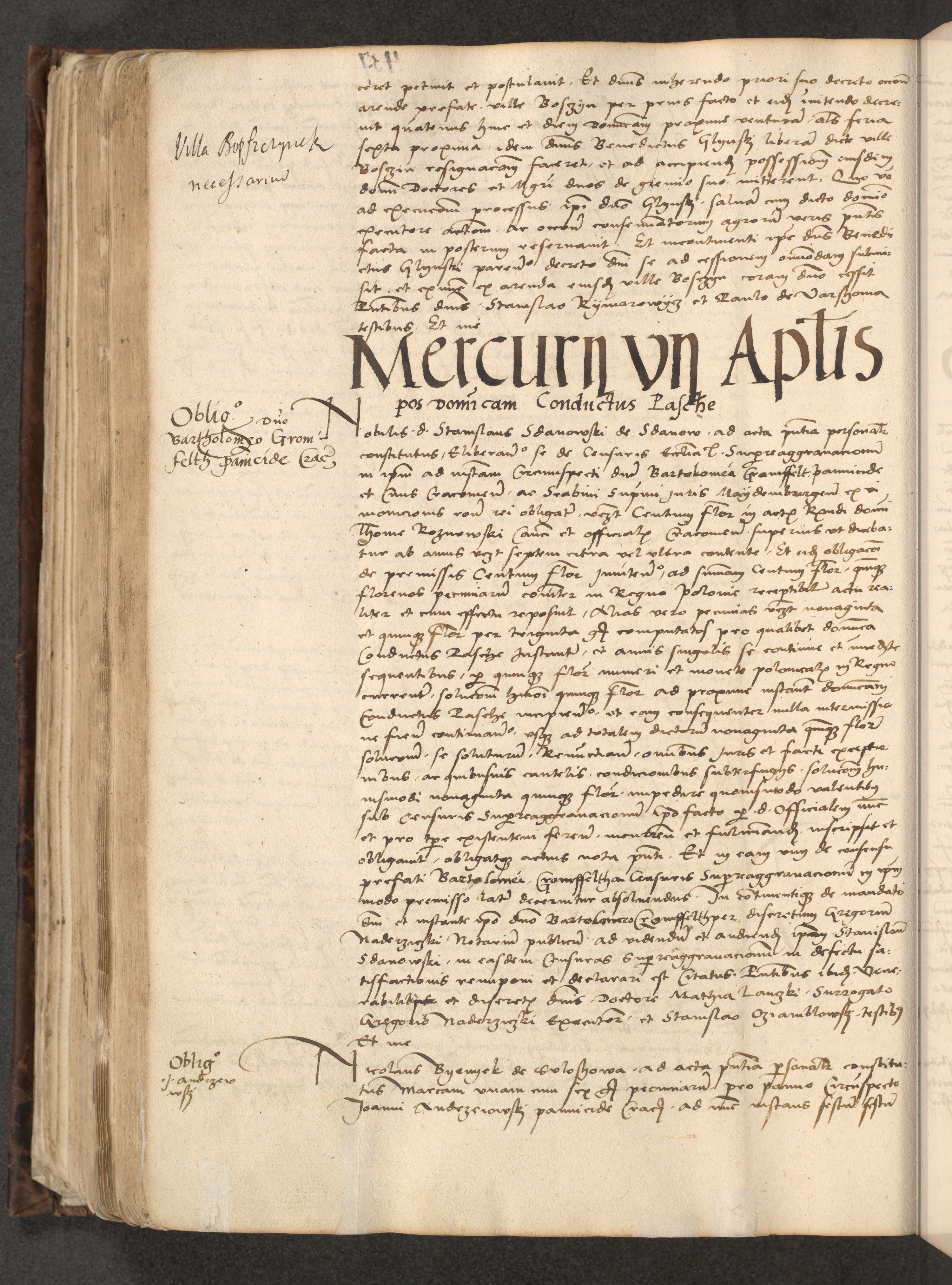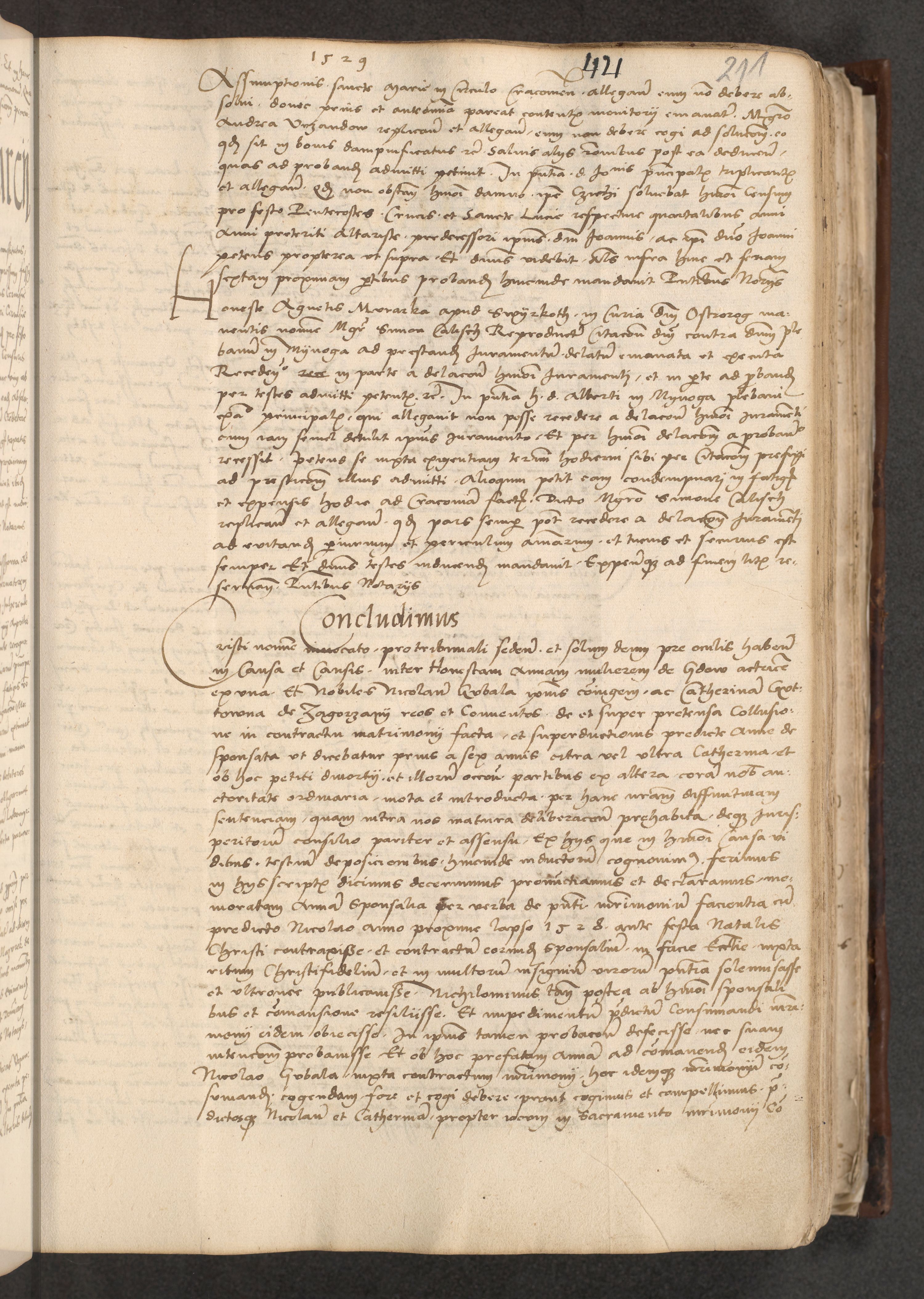 INRI. Acta actorum, obligacionum et sentenciarum tam interlocutoriarum quam diffinitivarum coram reverendo patre ac egregio viro domino Jacobo Erciss[o]wski decretorum doctorem, canonico et officiali generali Cracoviensi ad annum Domini 1528, indicionem primam, pontificatus sanctissimi in Christo patris et domini domini Clementis divina probidendcia pape seprtimi, annum quintum, per Stanislaum de Mordi legalem consistorii notarium omine felici inchoantur
