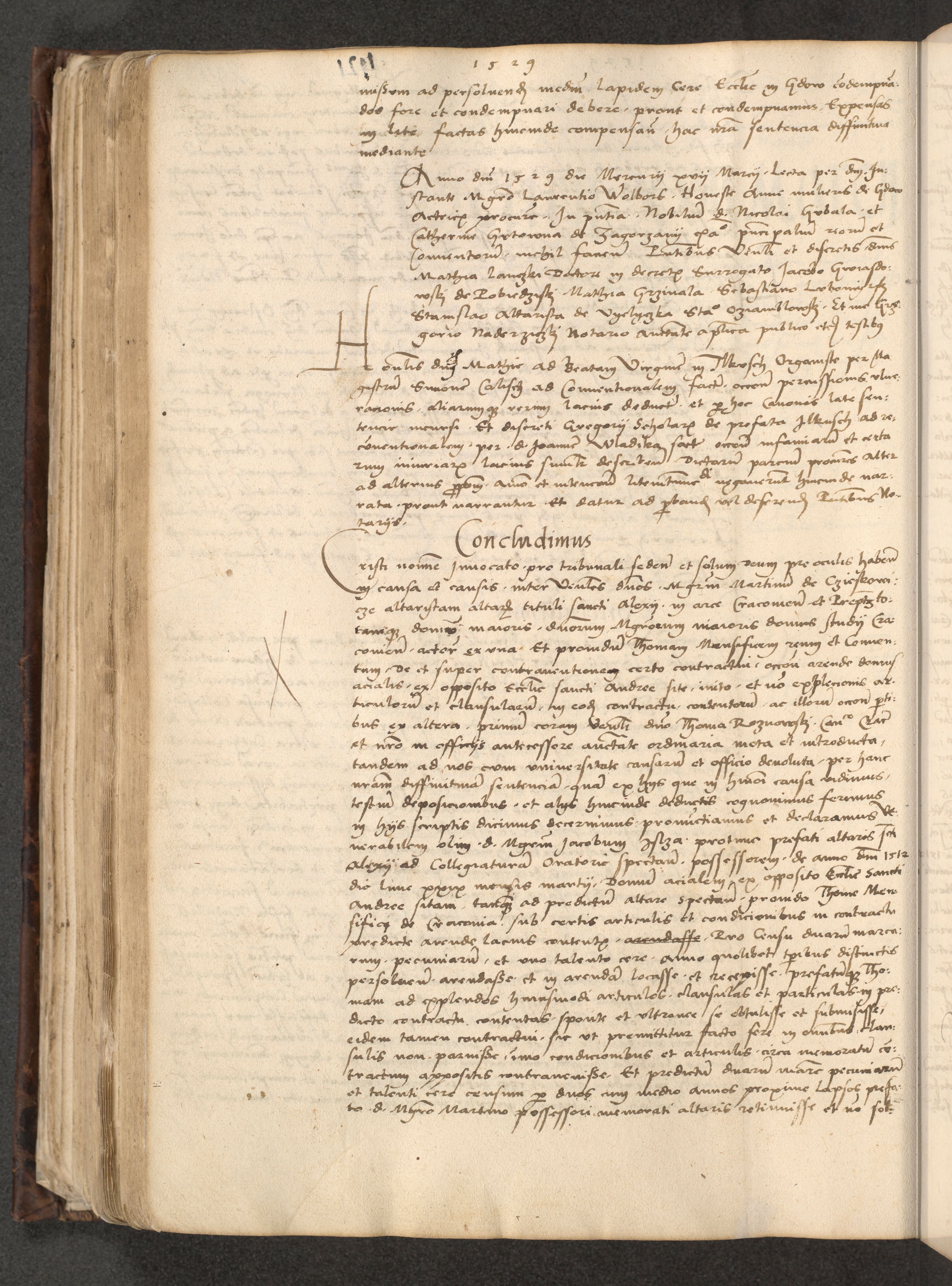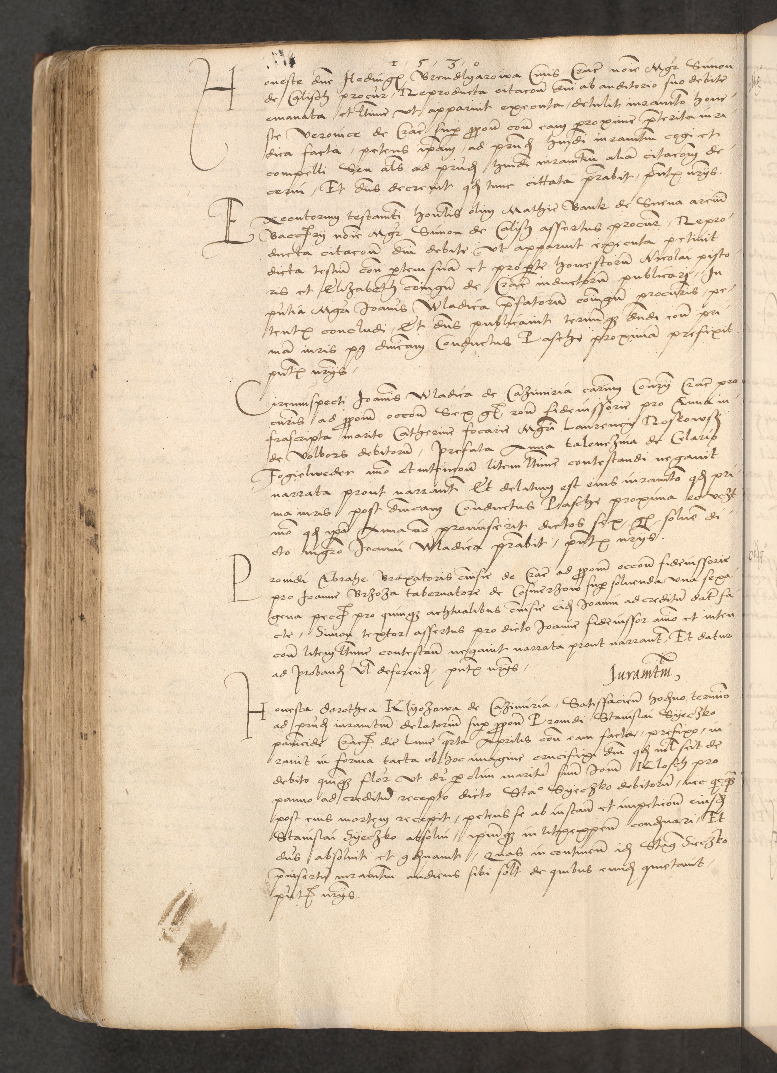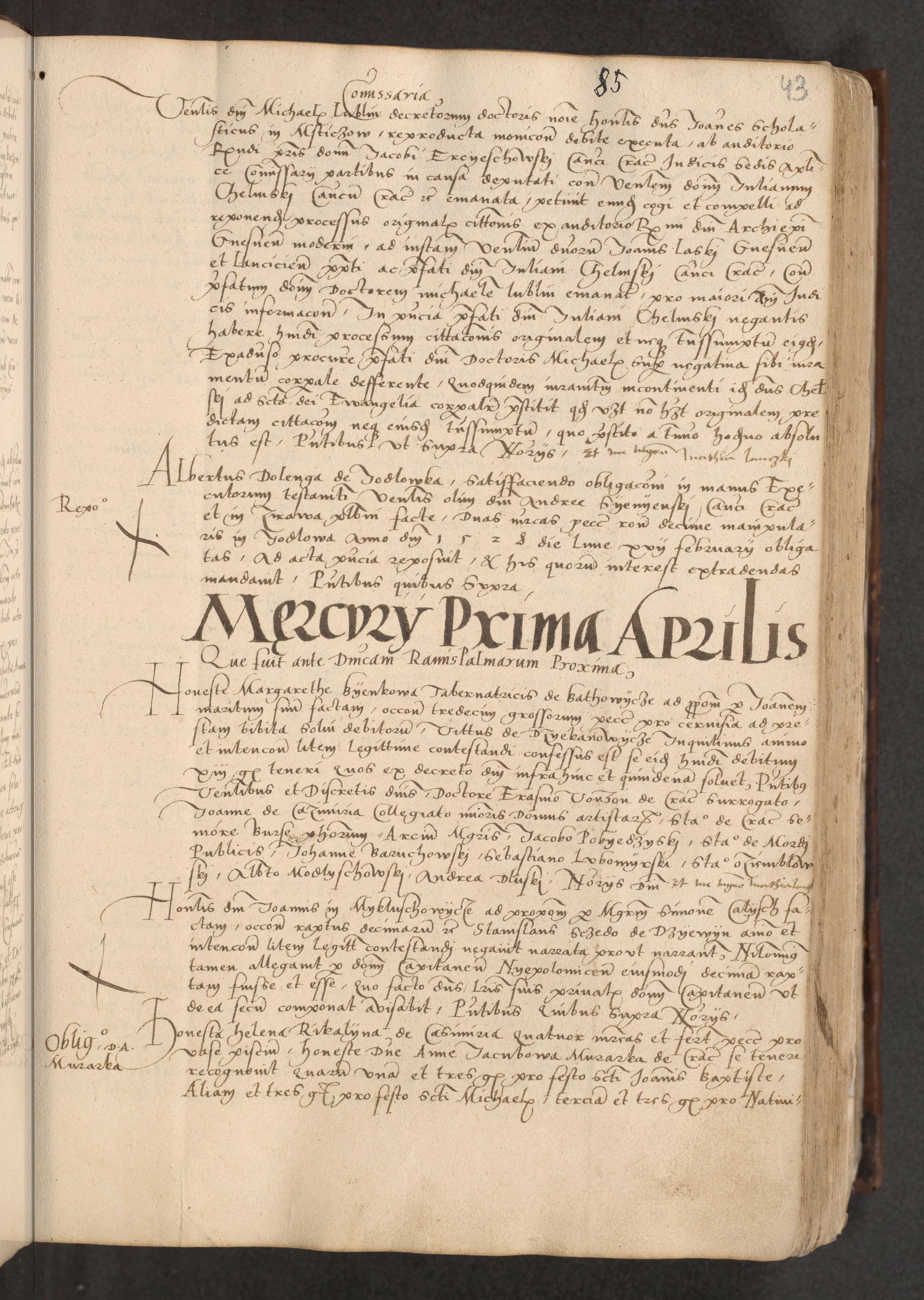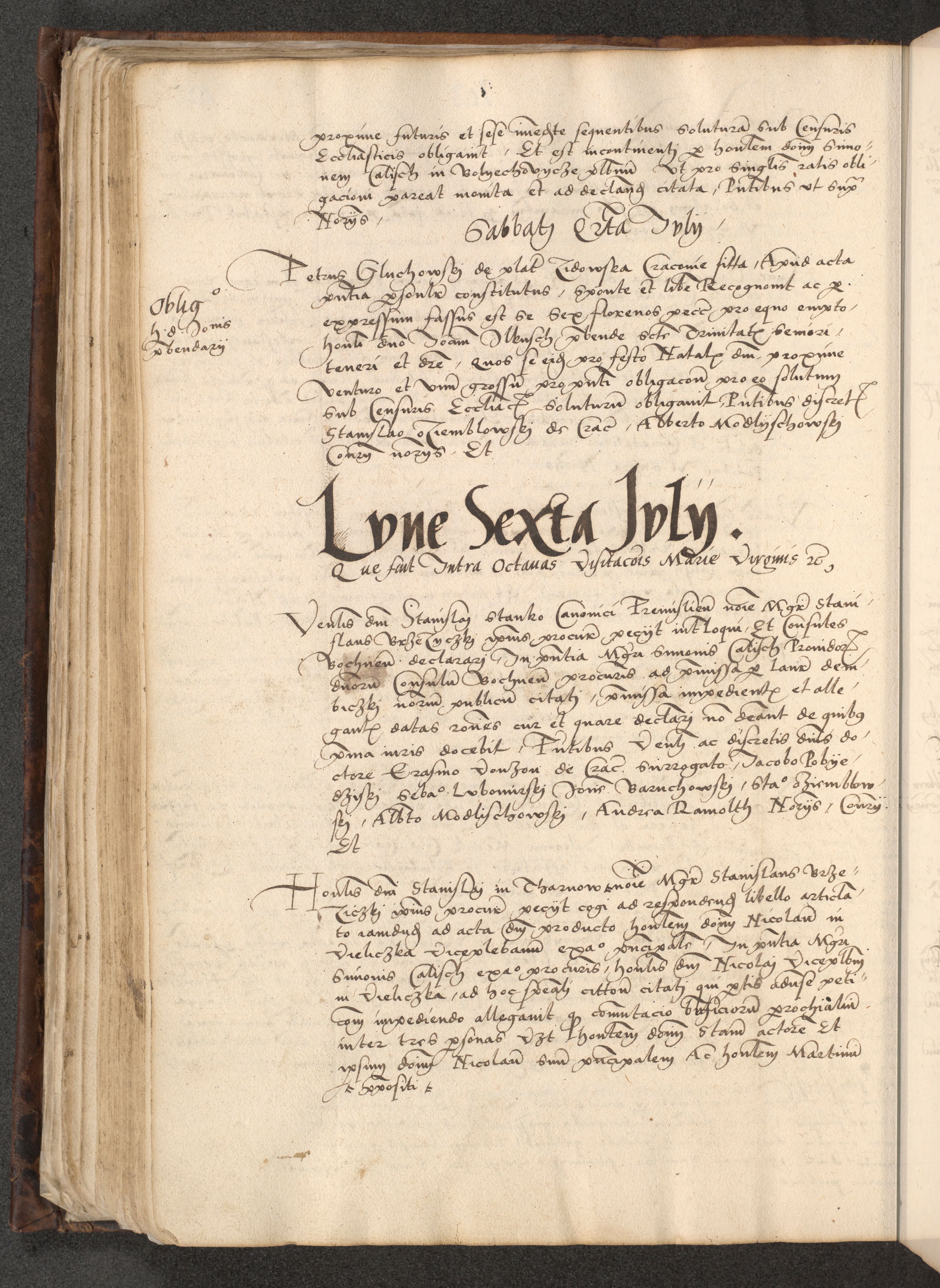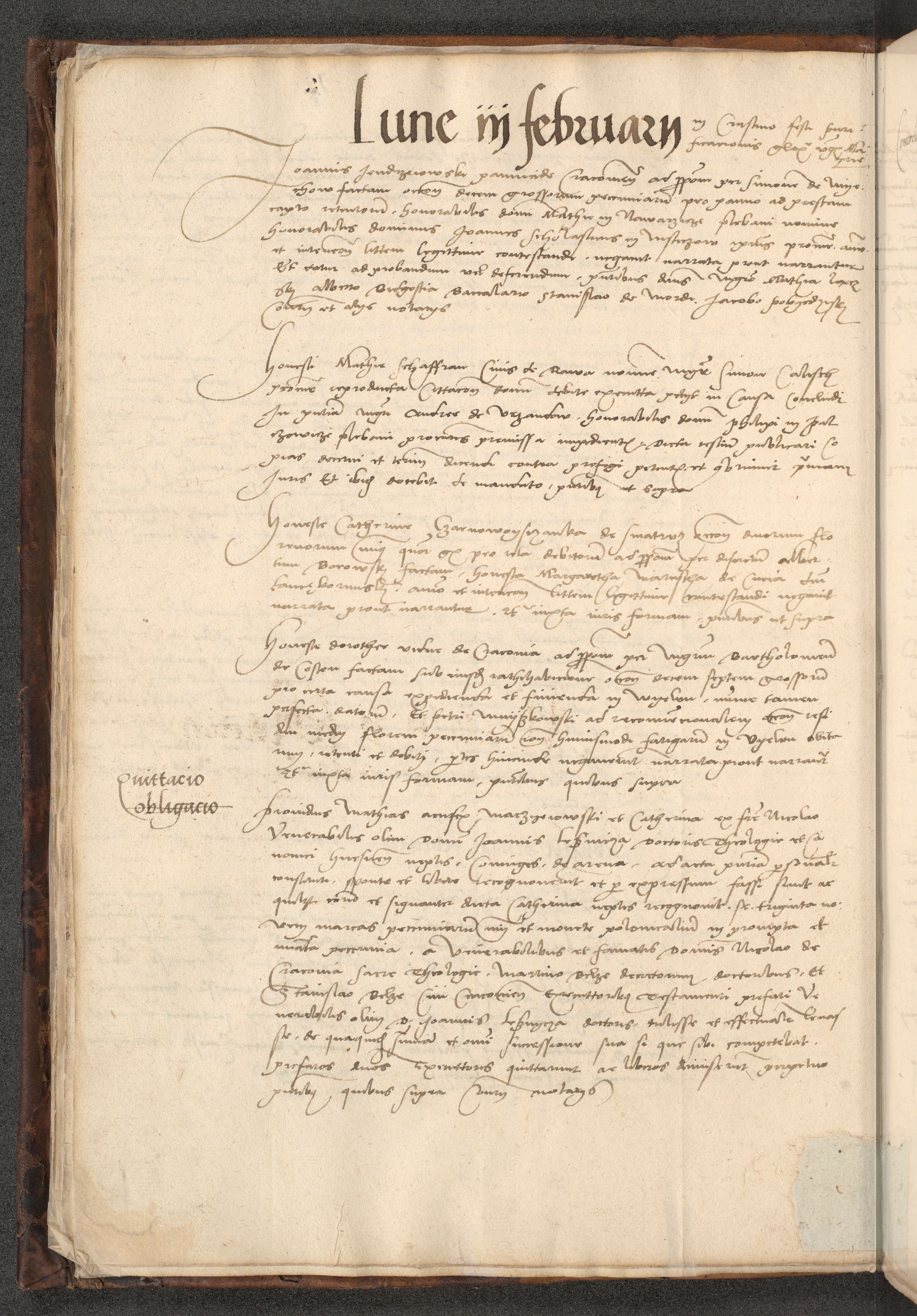 INRI. Acta actorum, obligacionum et sentenciarum tam interlocutoriarum quam diffinitivarum coram reverendo patre ac egregio viro domino Jacobo Erciss[o]wski decretorum doctorem, canonico et officiali generali Cracoviensi ad annum Domini 1528, indicionem primam, pontificatus sanctissimi in Christo patris et domini domini Clementis divina probidendcia pape seprtimi, annum quintum, per Stanislaum de Mordi legalem consistorii notarium omine felici inchoantur