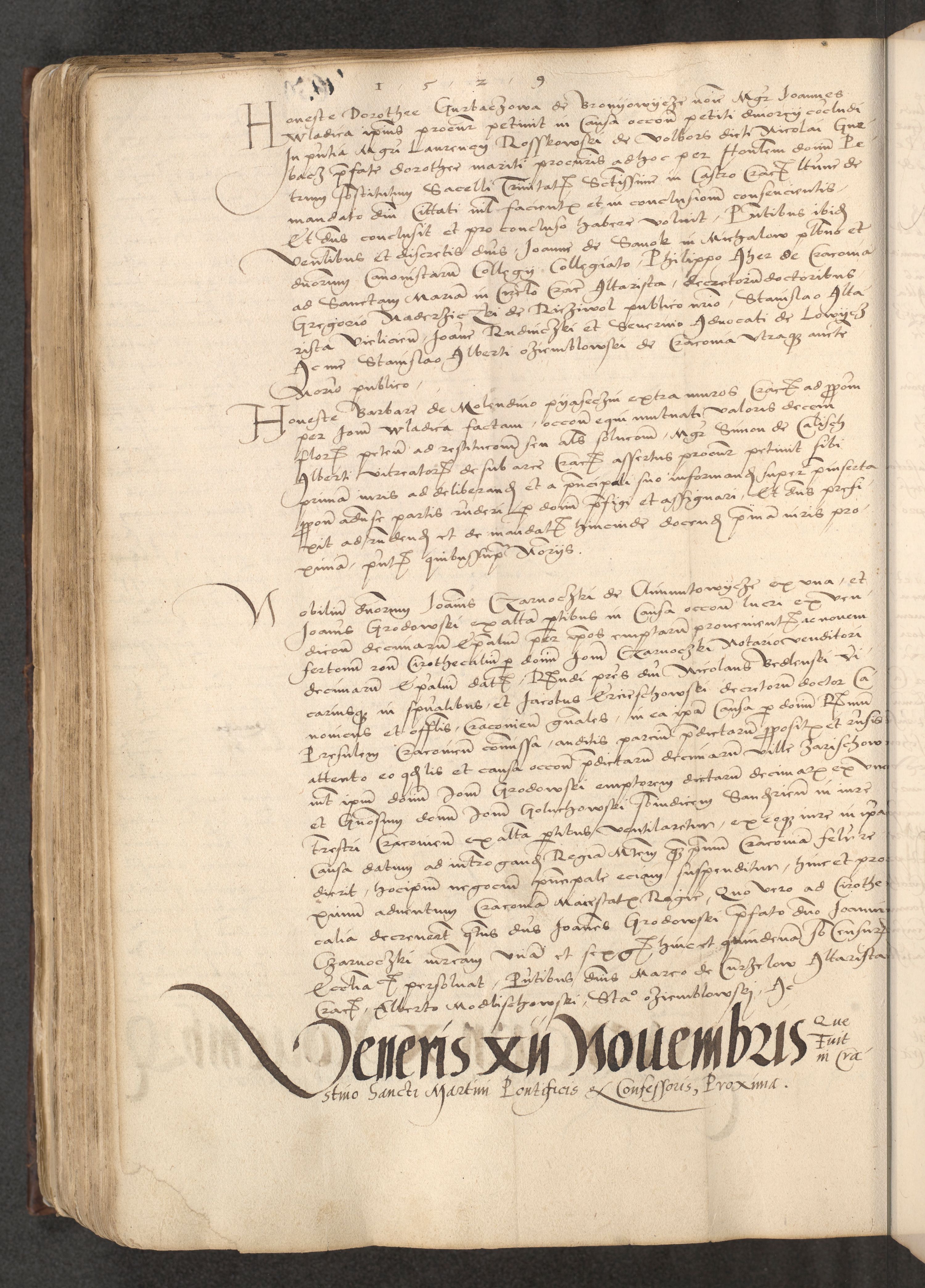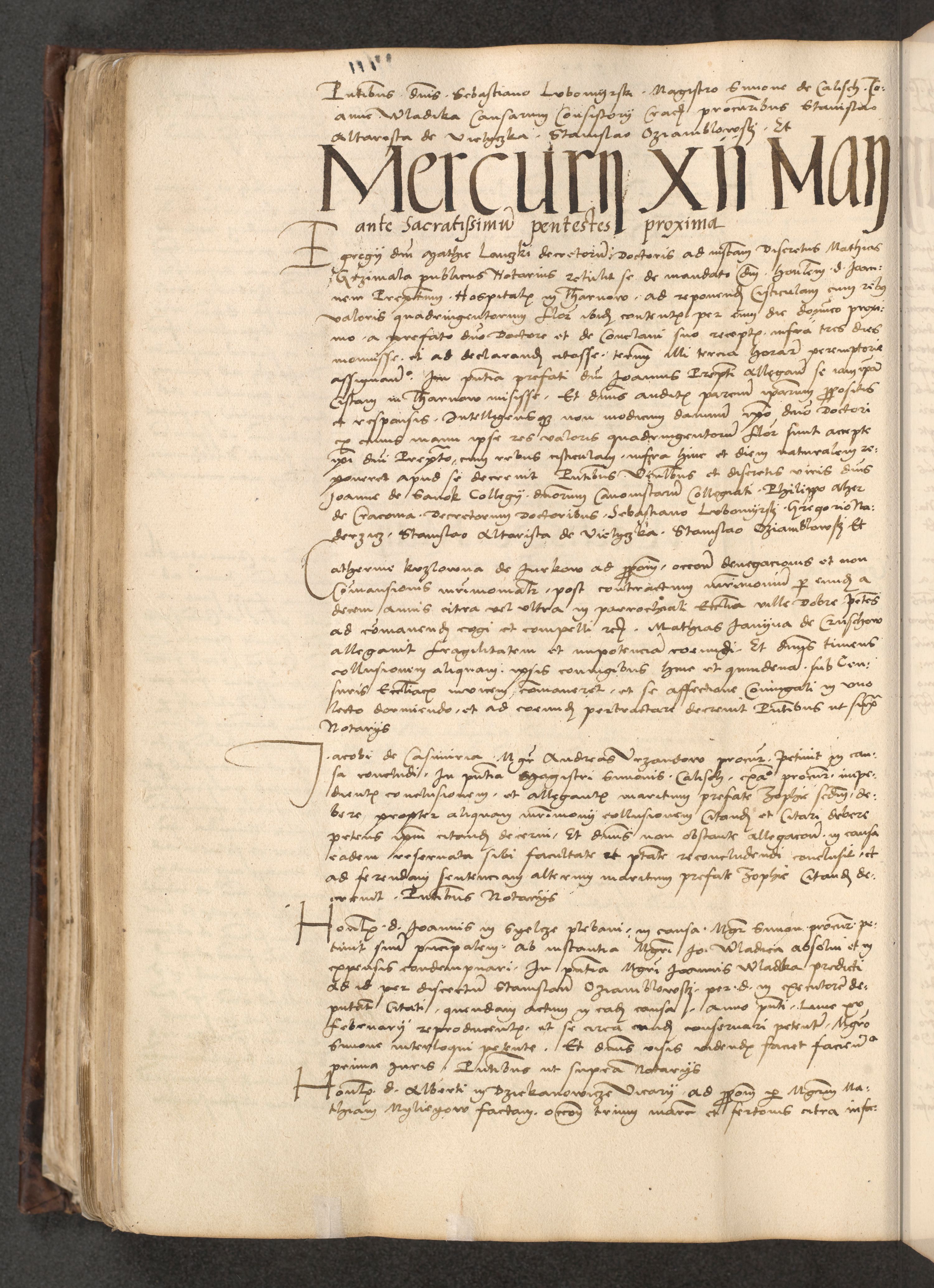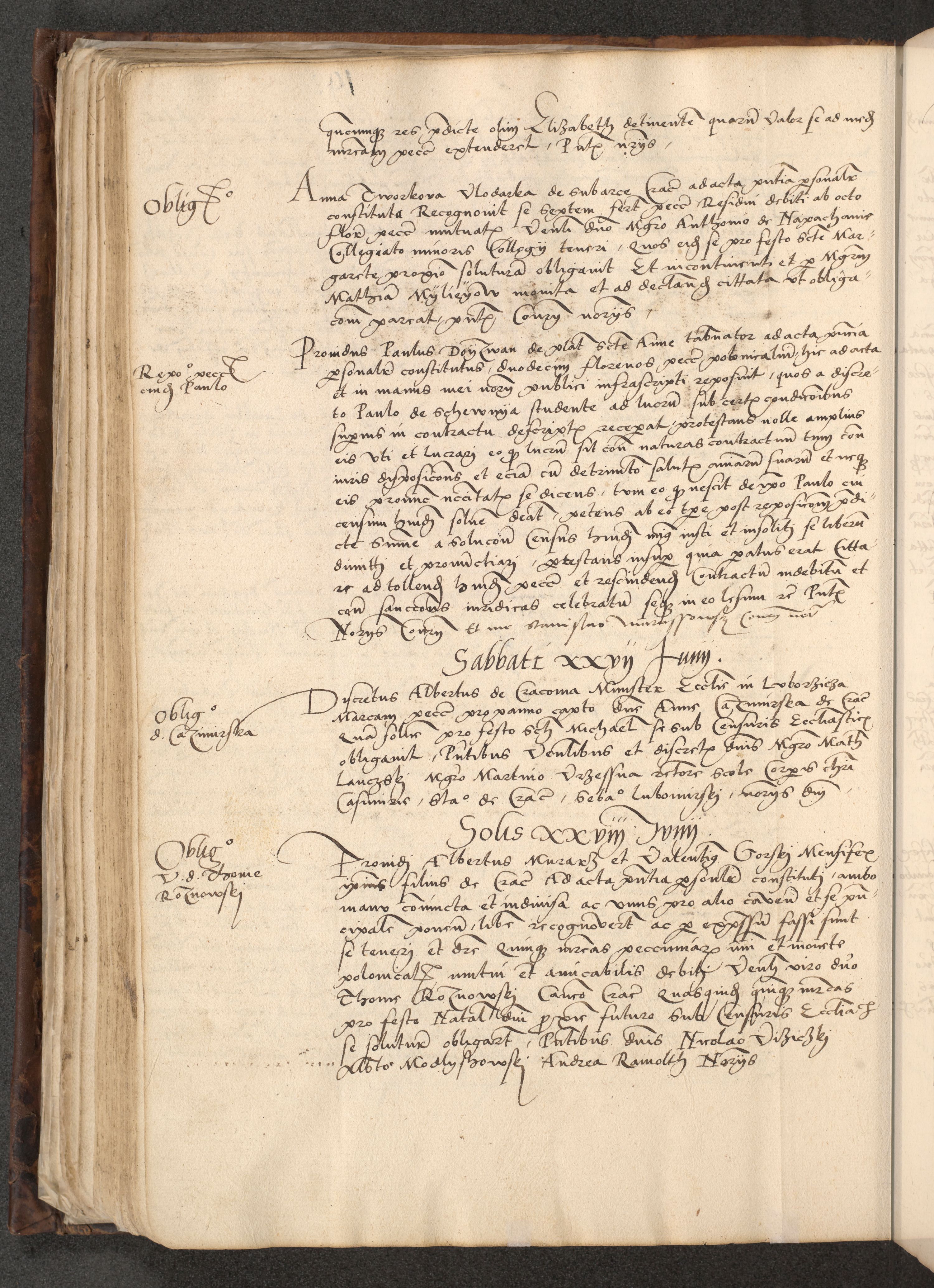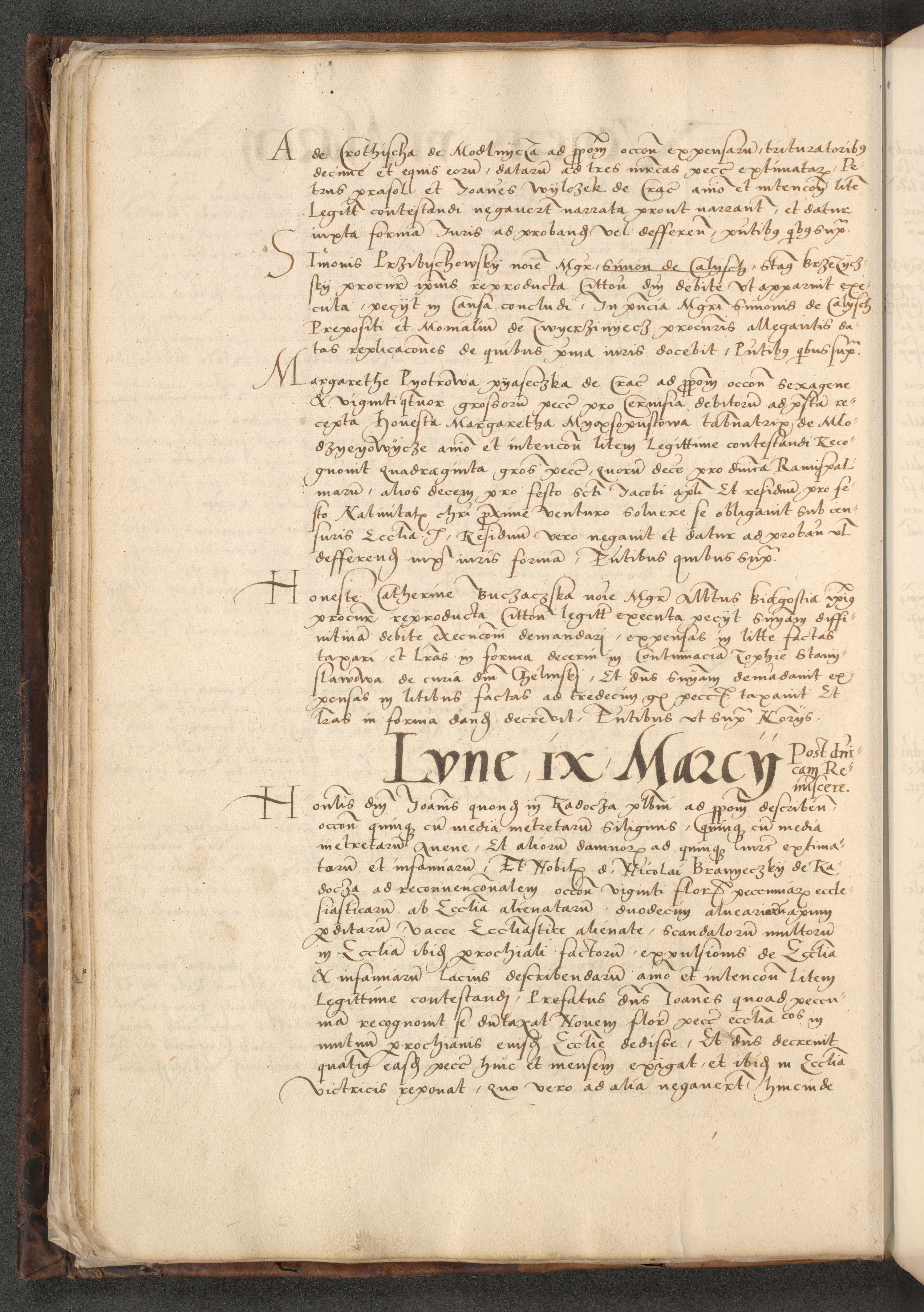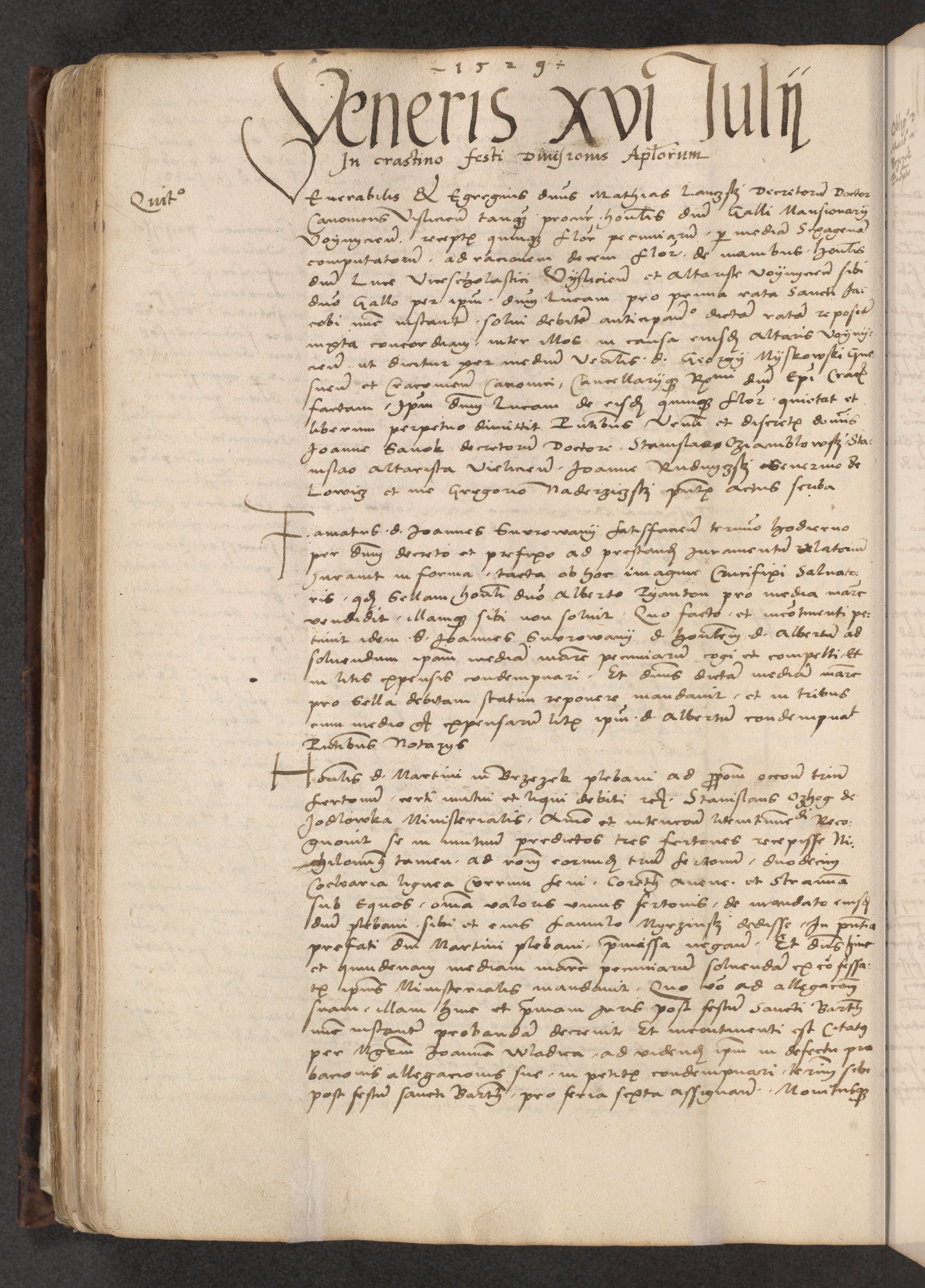 INRI. Acta actorum, obligacionum et sentenciarum tam interlocutoriarum quam diffinitivarum coram reverendo patre ac egregio viro domino Jacobo Erciss[o]wski decretorum doctorem, canonico et officiali generali Cracoviensi ad annum Domini 1528, indicionem primam, pontificatus sanctissimi in Christo patris et domini domini Clementis divina probidendcia pape seprtimi, annum quintum, per Stanislaum de Mordi legalem consistorii notarium omine felici inchoantur