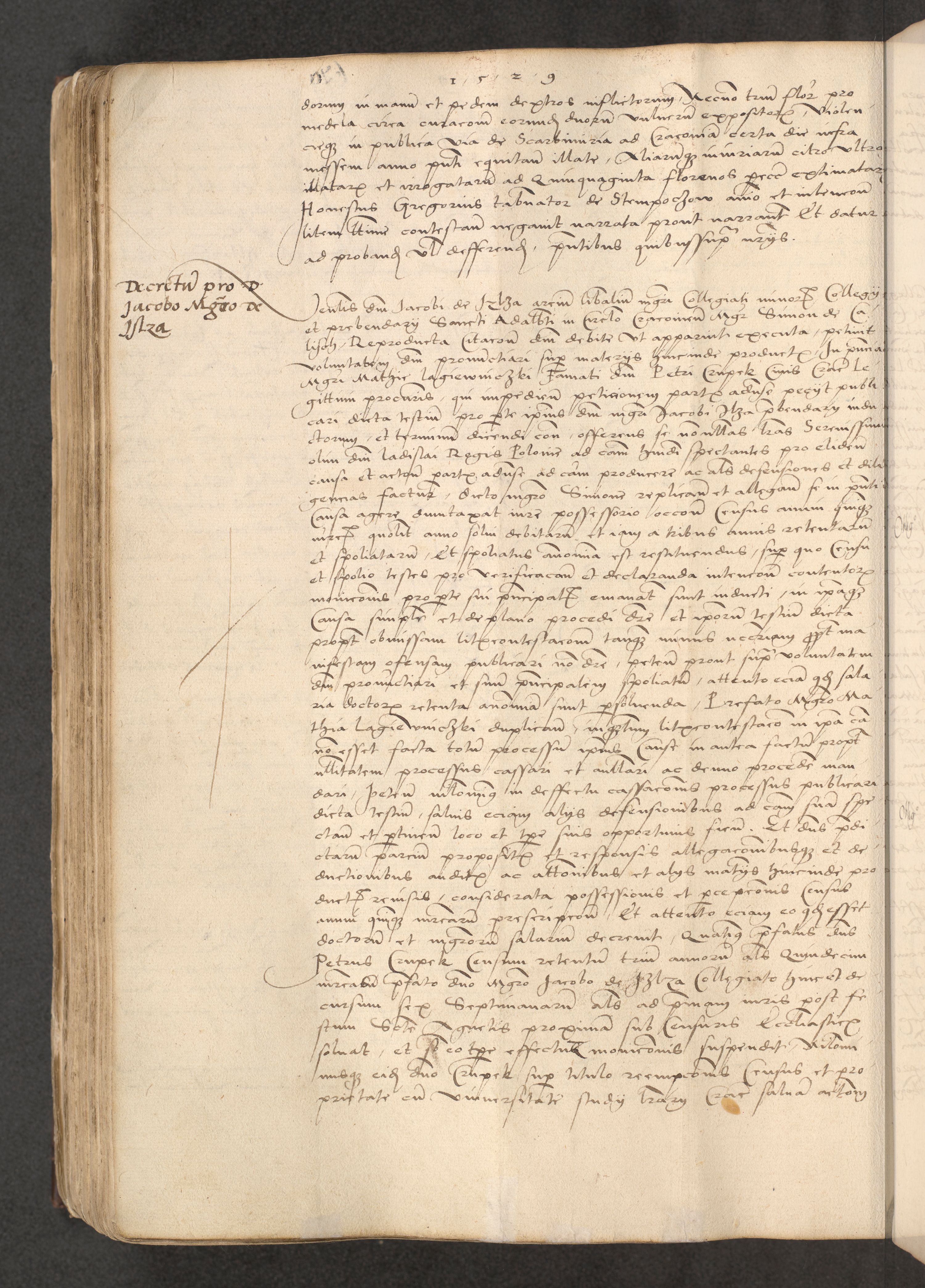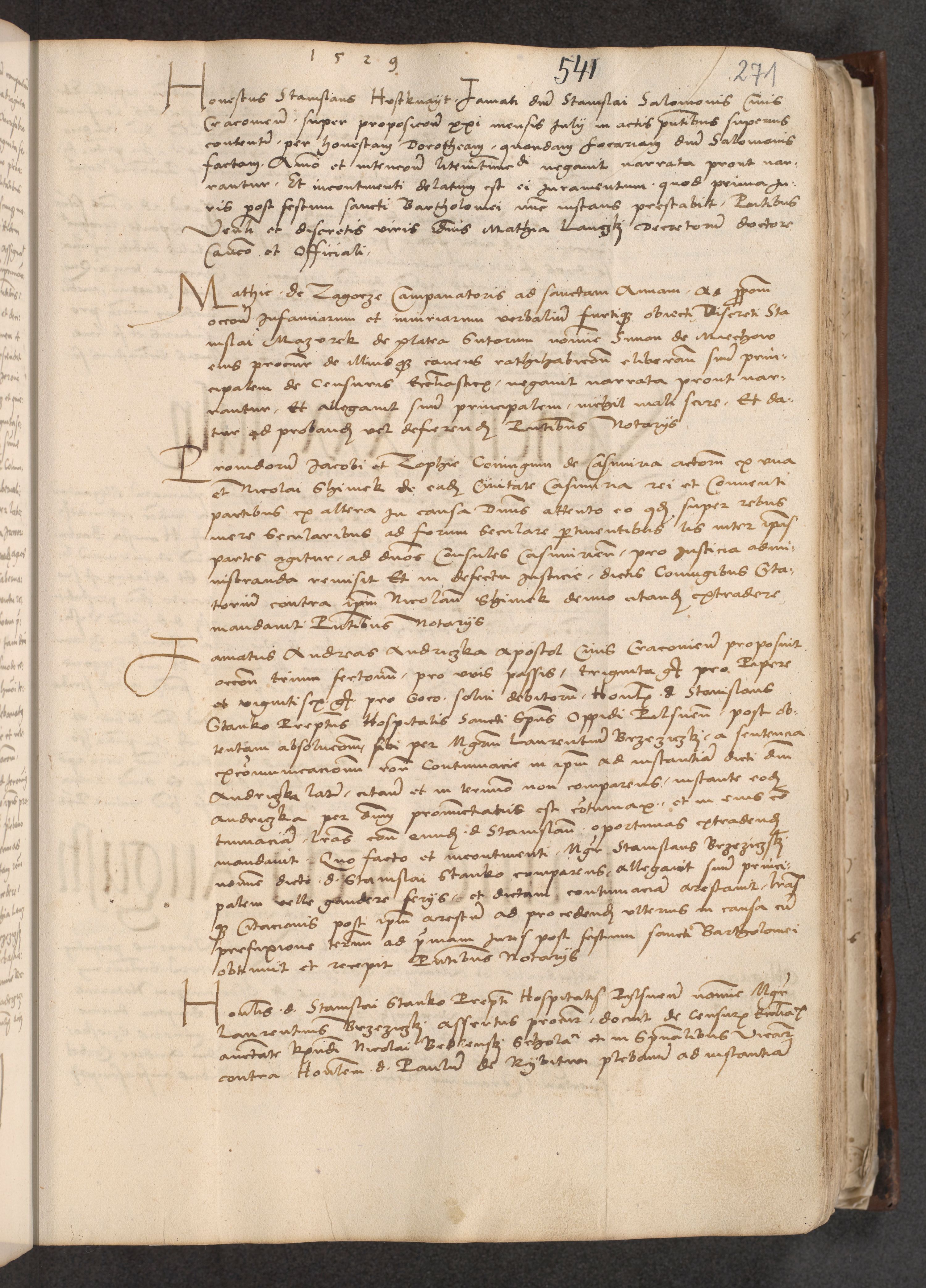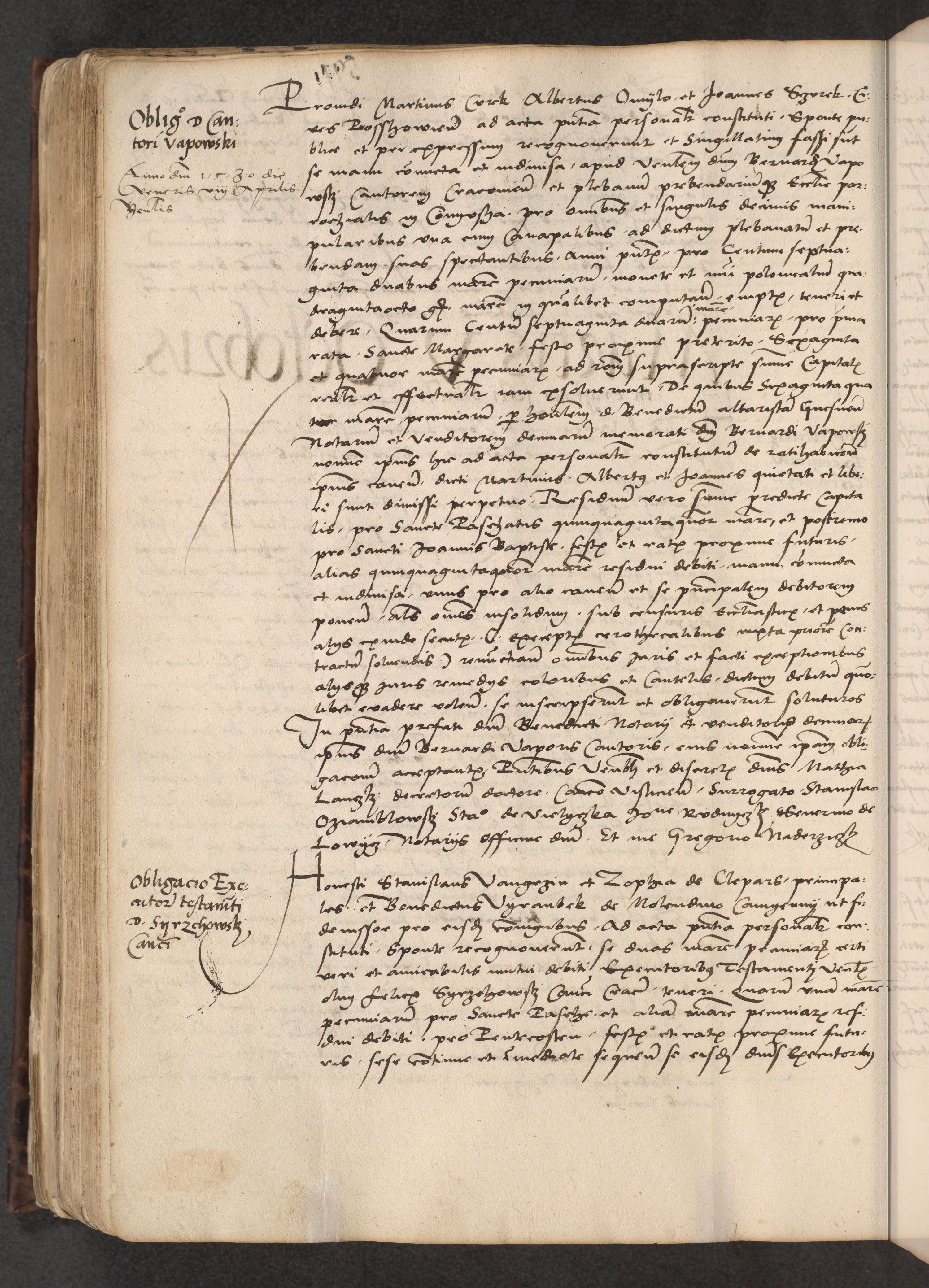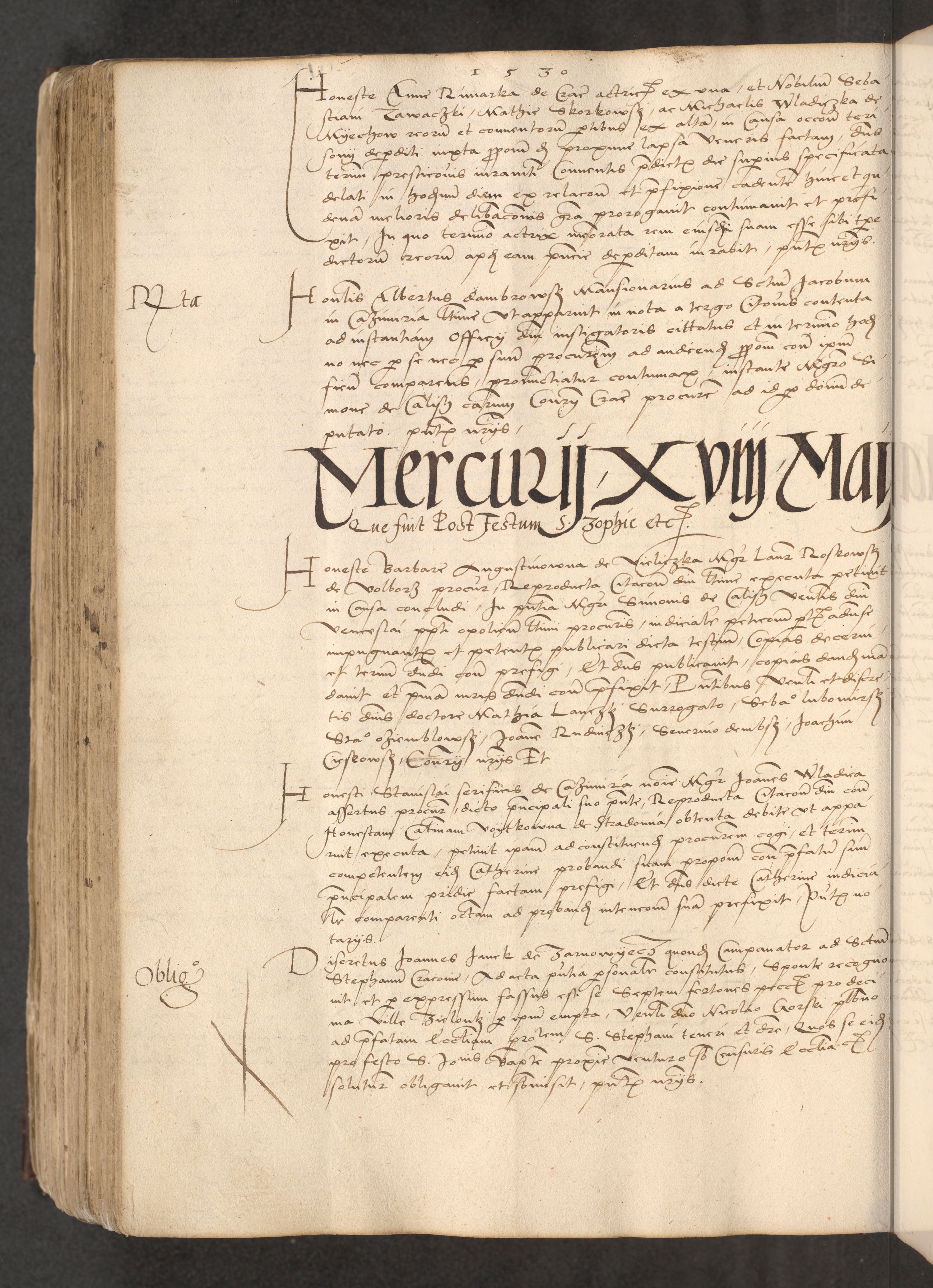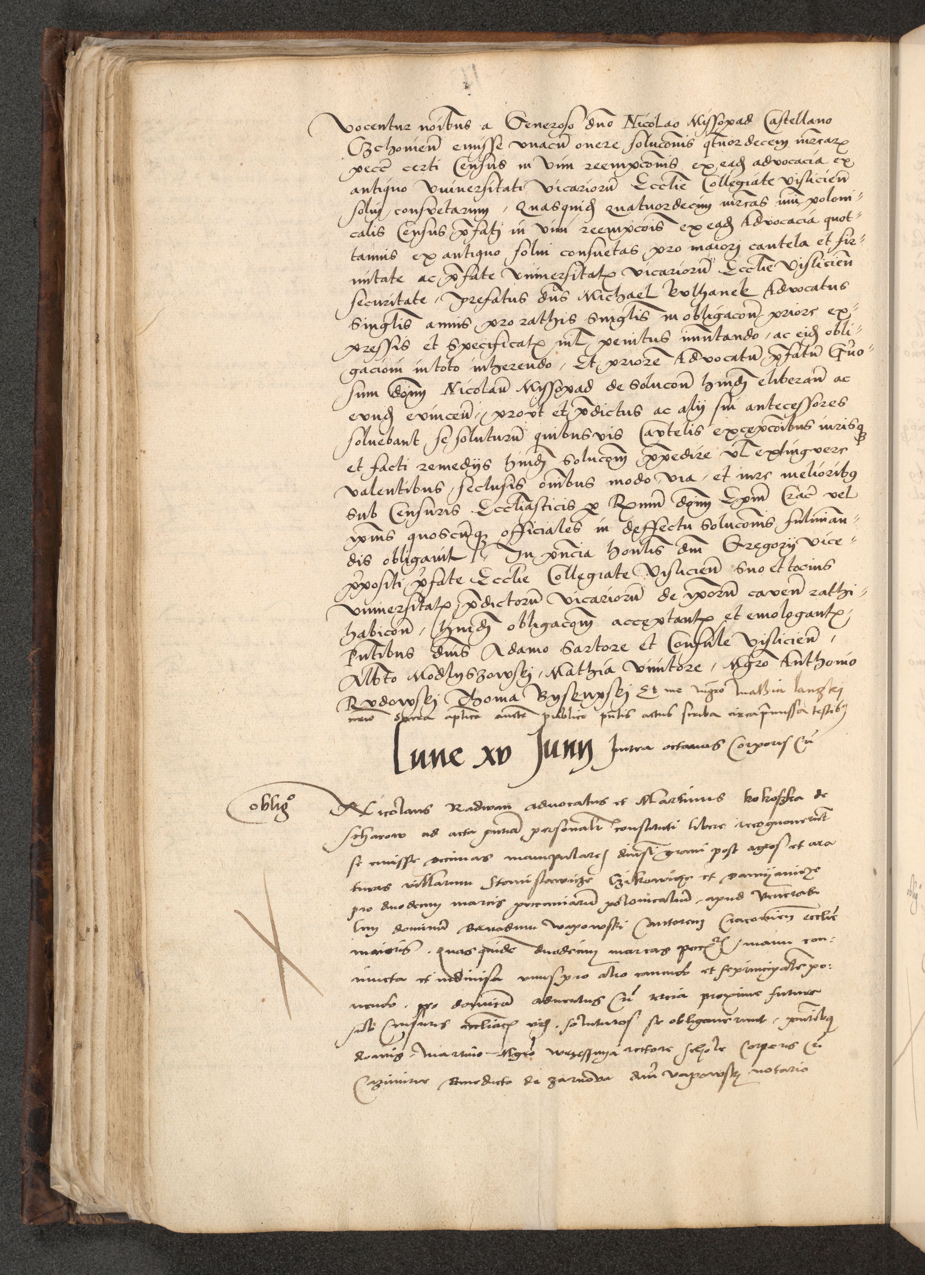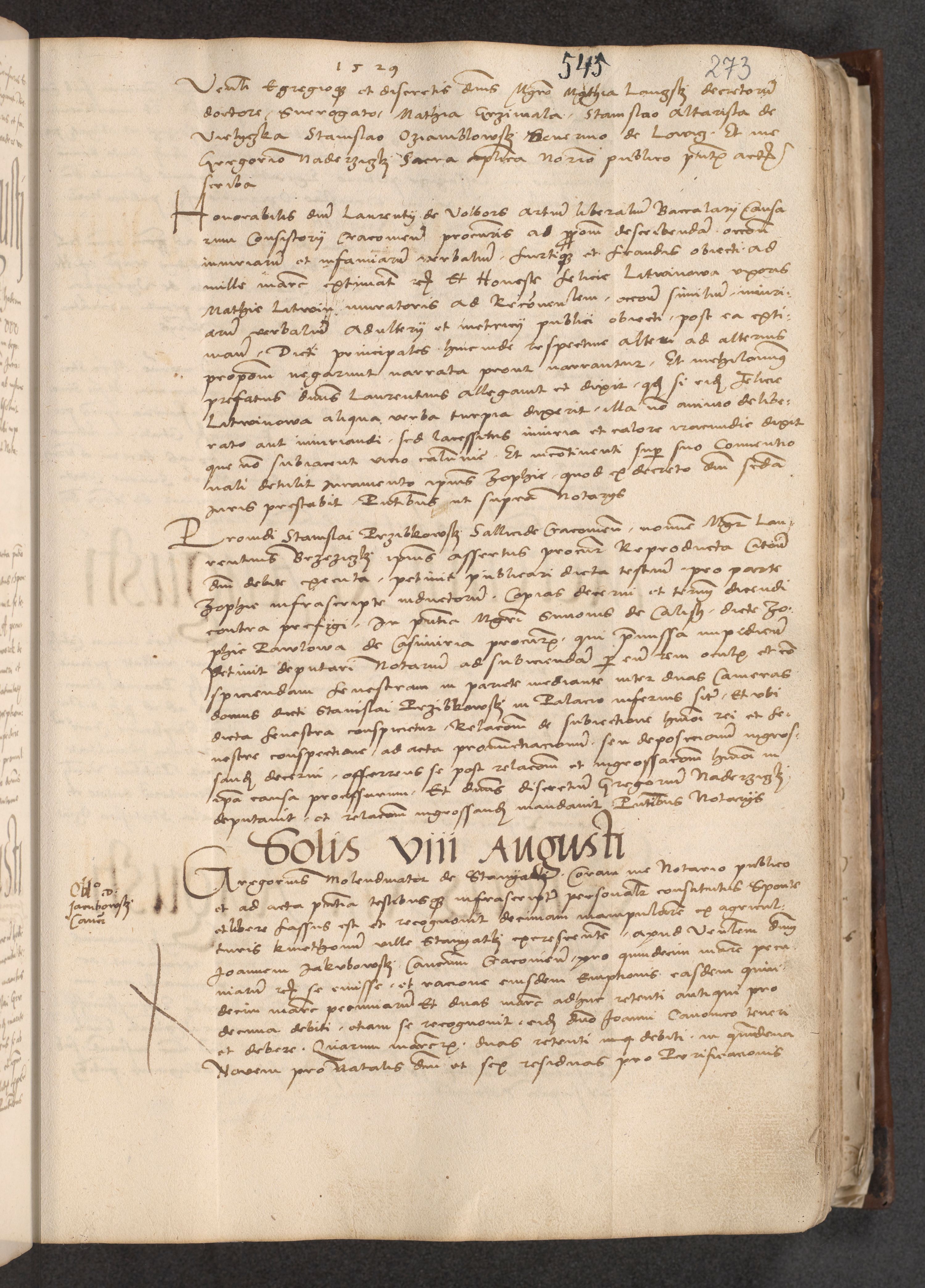 INRI. Acta actorum, obligacionum et sentenciarum tam interlocutoriarum quam diffinitivarum coram reverendo patre ac egregio viro domino Jacobo Erciss[o]wski decretorum doctorem, canonico et officiali generali Cracoviensi ad annum Domini 1528, indicionem primam, pontificatus sanctissimi in Christo patris et domini domini Clementis divina probidendcia pape seprtimi, annum quintum, per Stanislaum de Mordi legalem consistorii notarium omine felici inchoantur