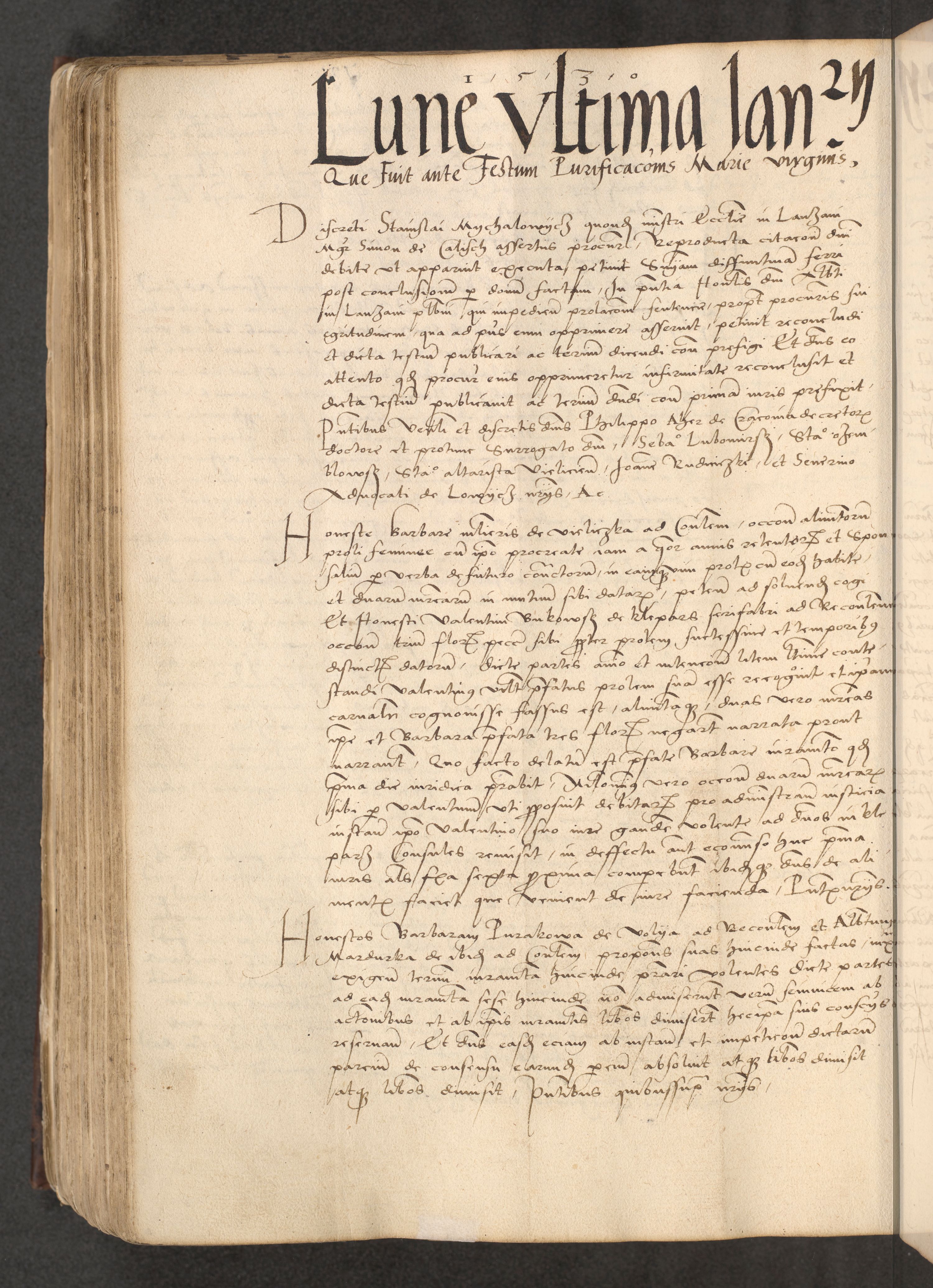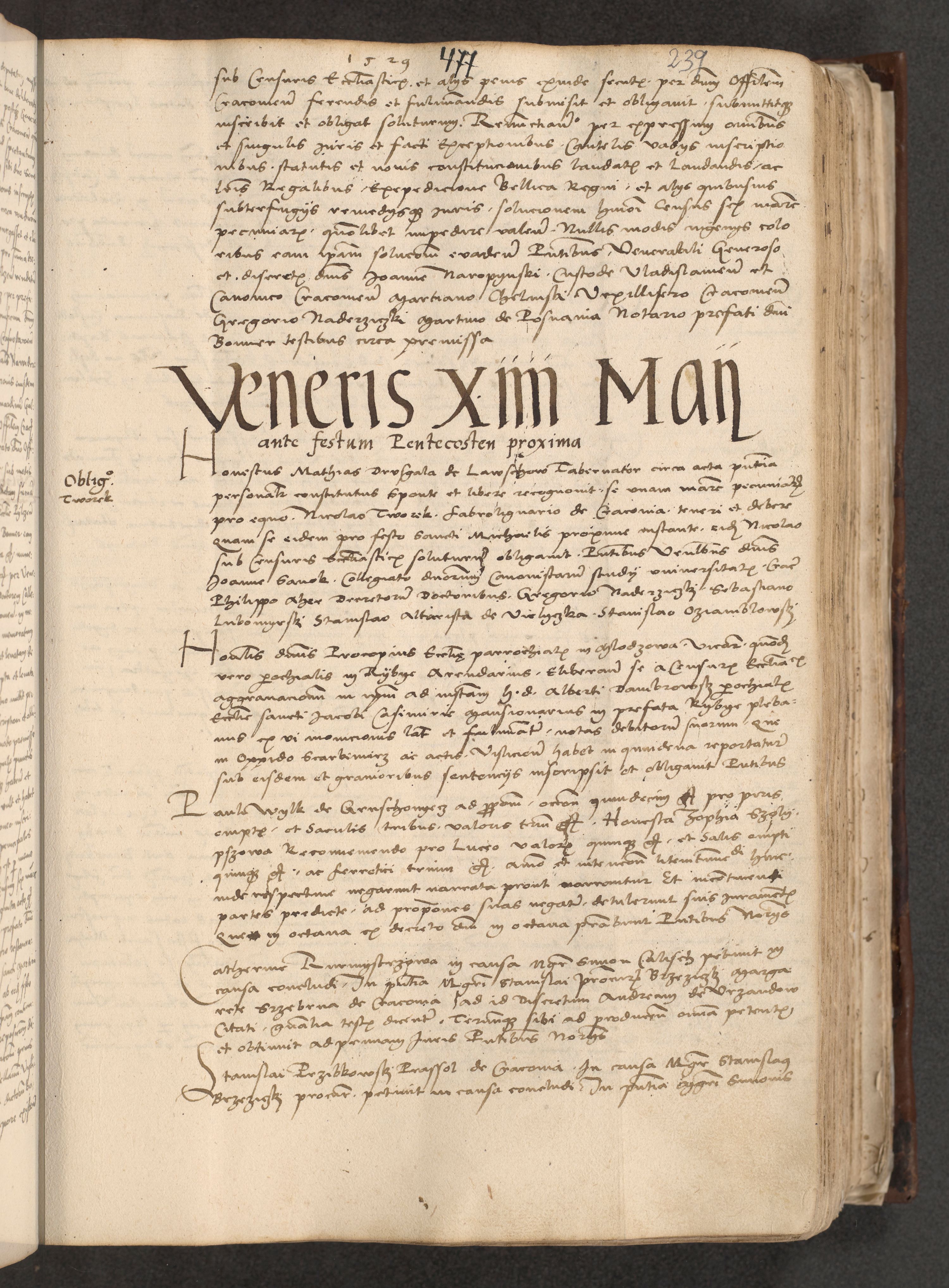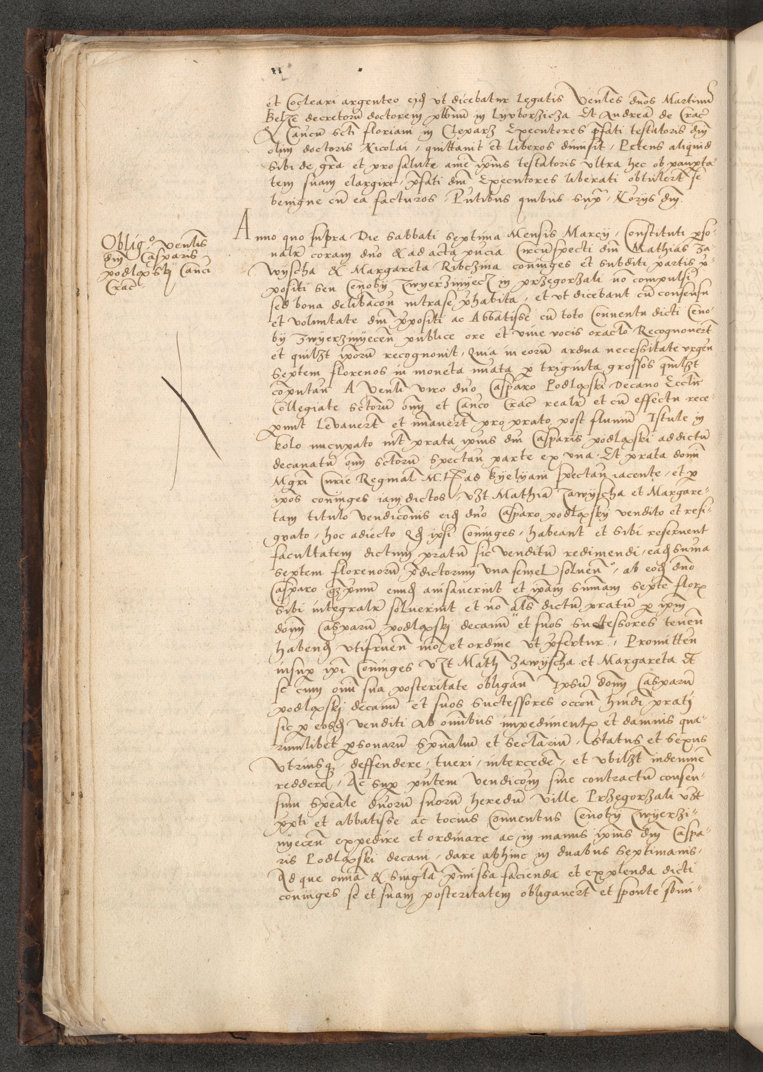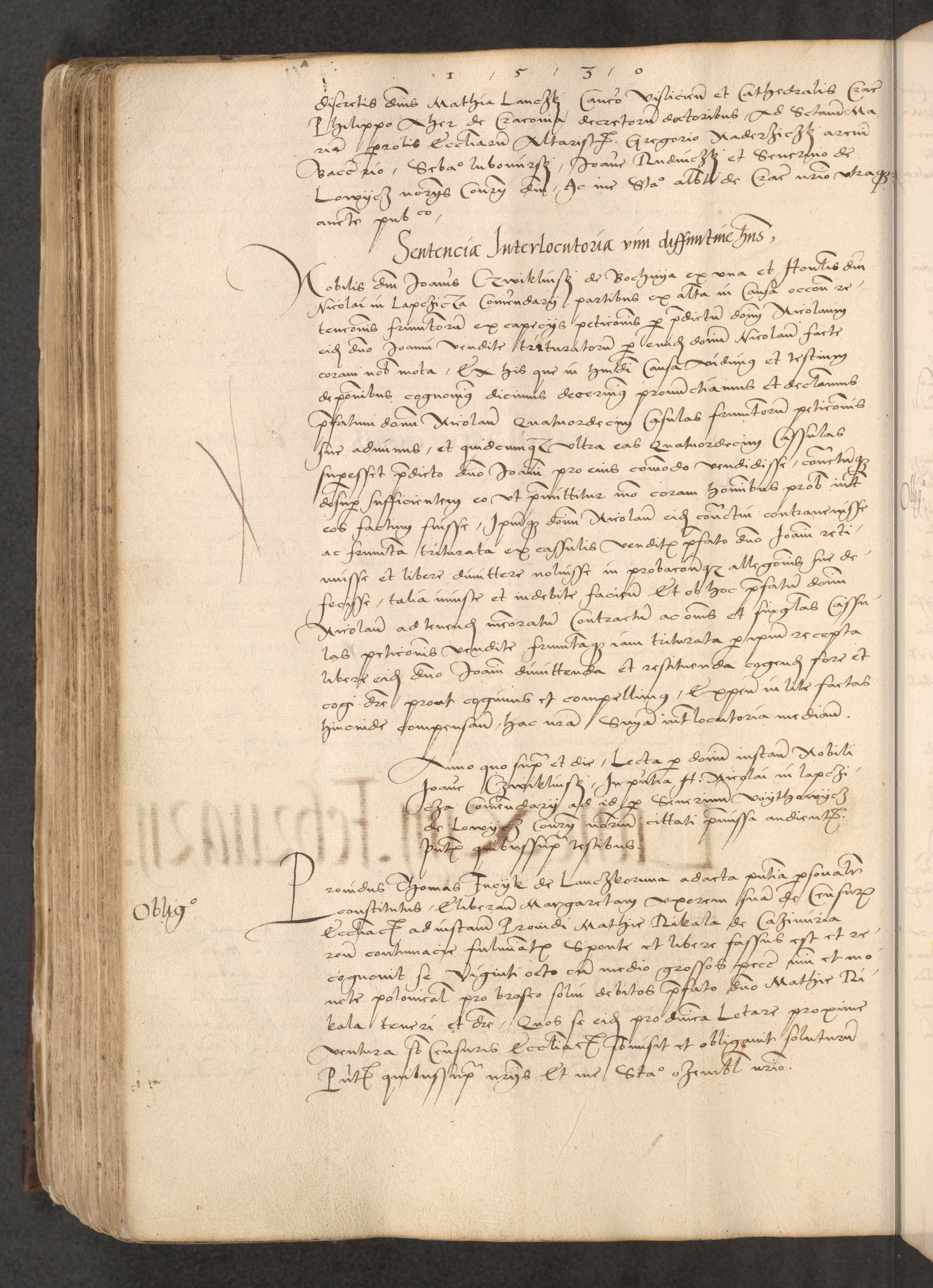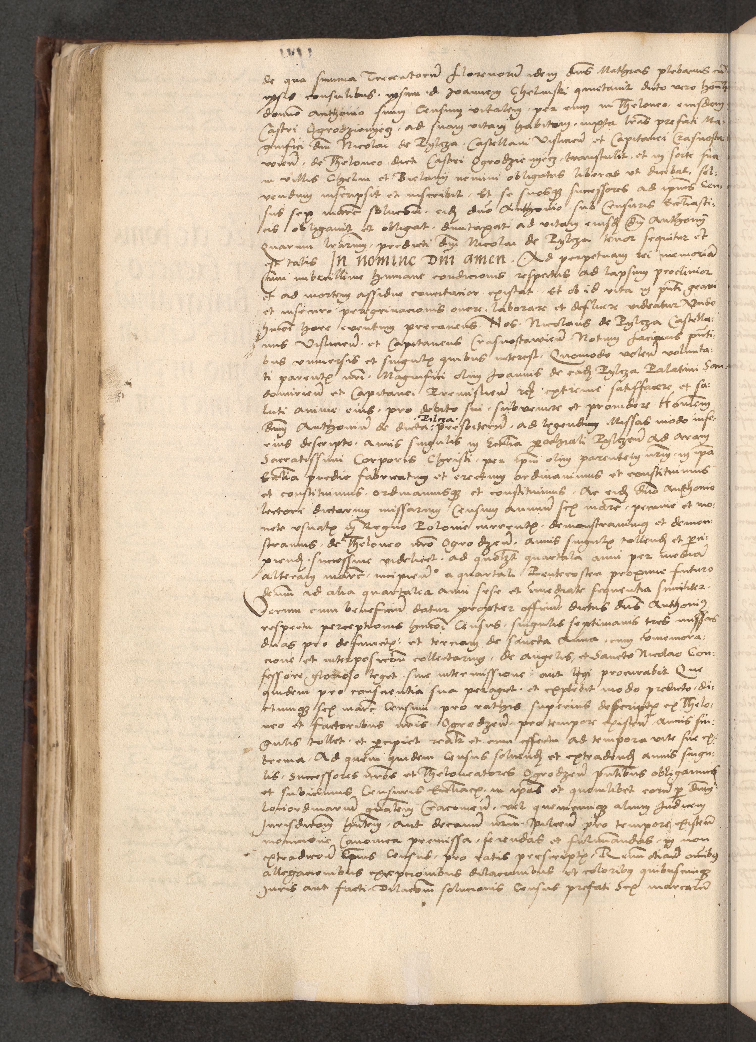INRI. Acta actorum, obligacionum et sentenciarum tam interlocutoriarum quam diffinitivarum coram reverendo patre ac egregio viro domino Jacobo Erciss[o]wski decretorum doctorem, canonico et officiali generali Cracoviensi ad annum Domini 1528, indicionem primam, pontificatus sanctissimi in Christo patris et domini domini Clementis divina probidendcia pape seprtimi, annum quintum, per Stanislaum de Mordi legalem consistorii notarium omine felici inchoantur