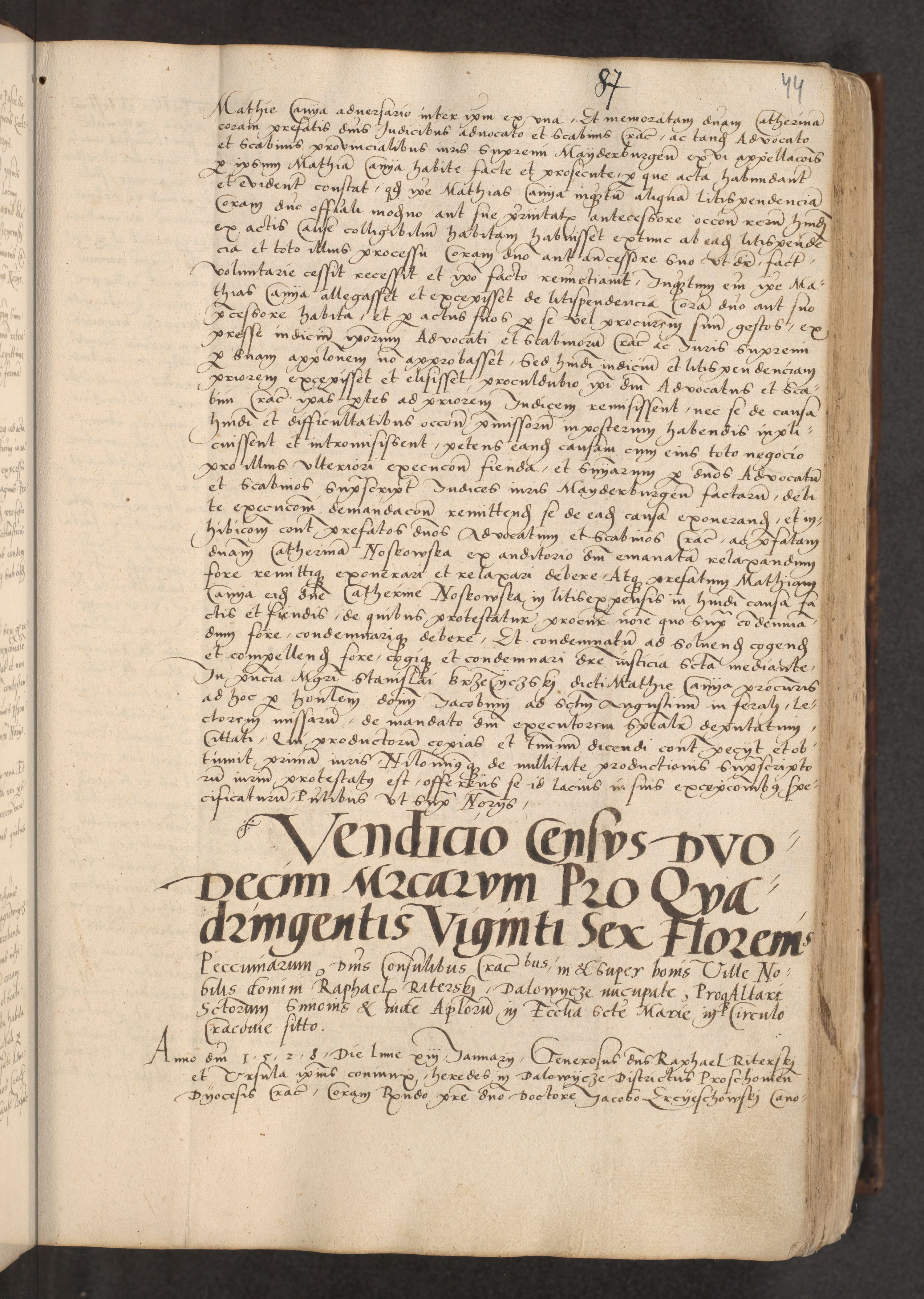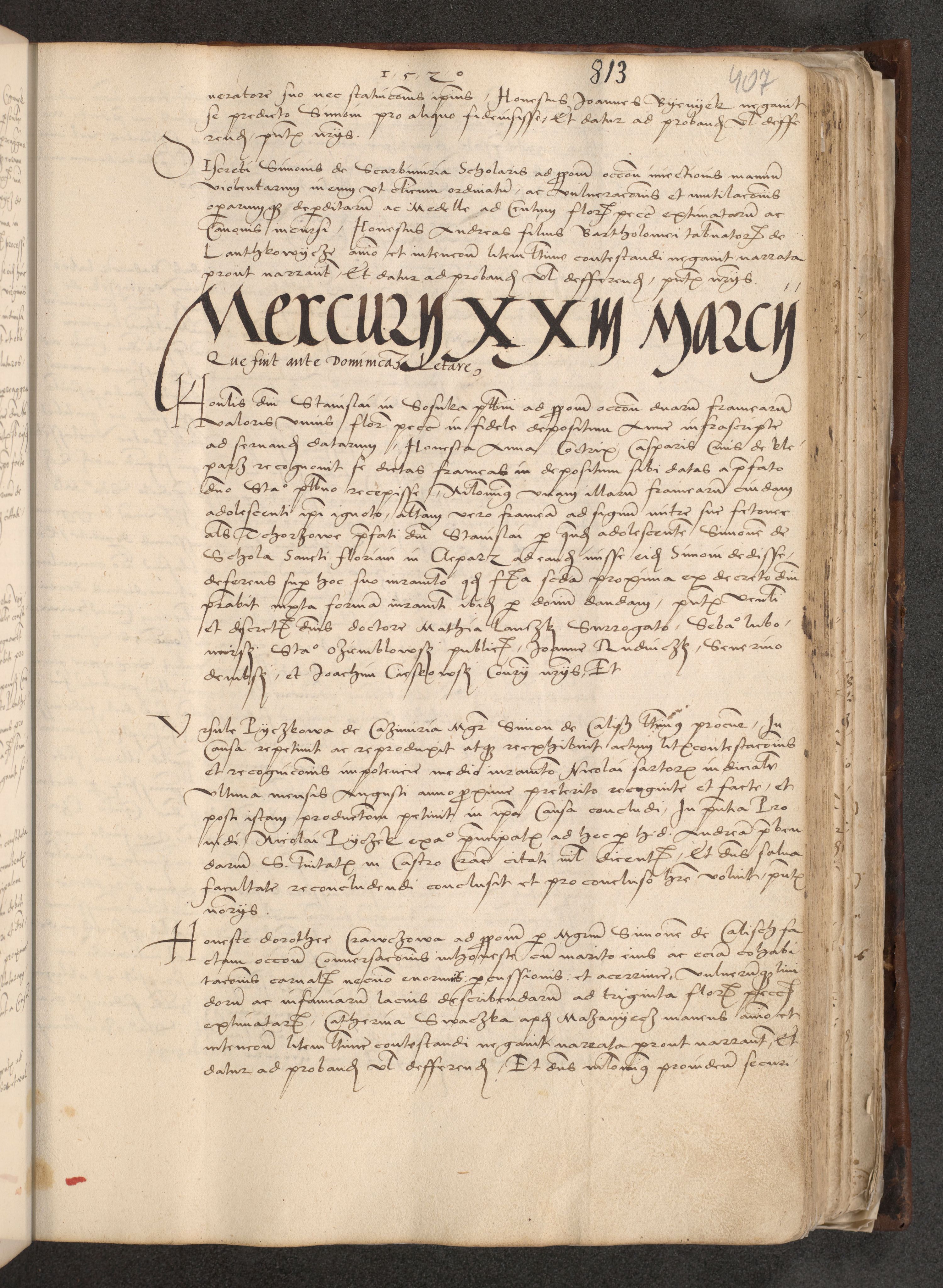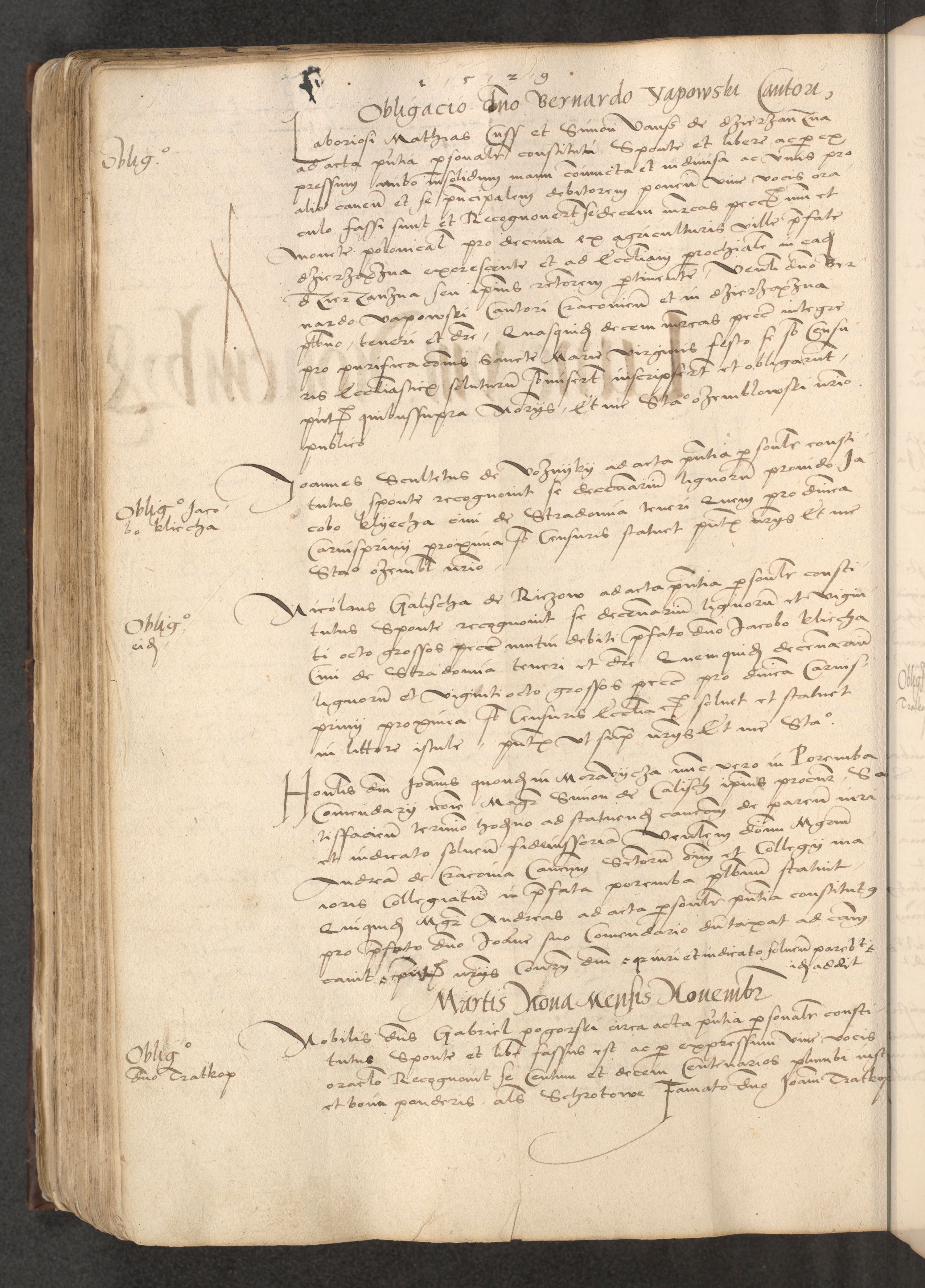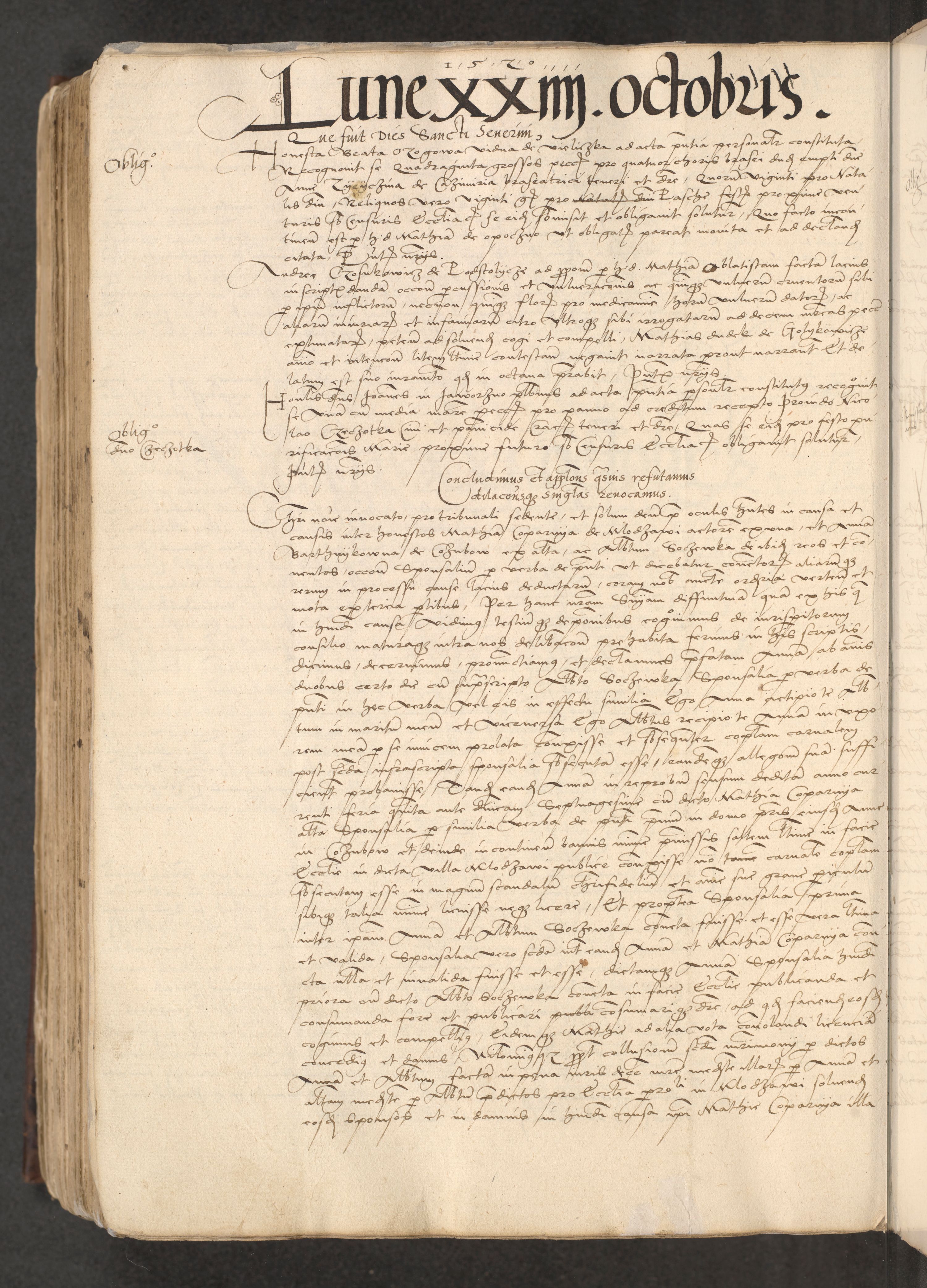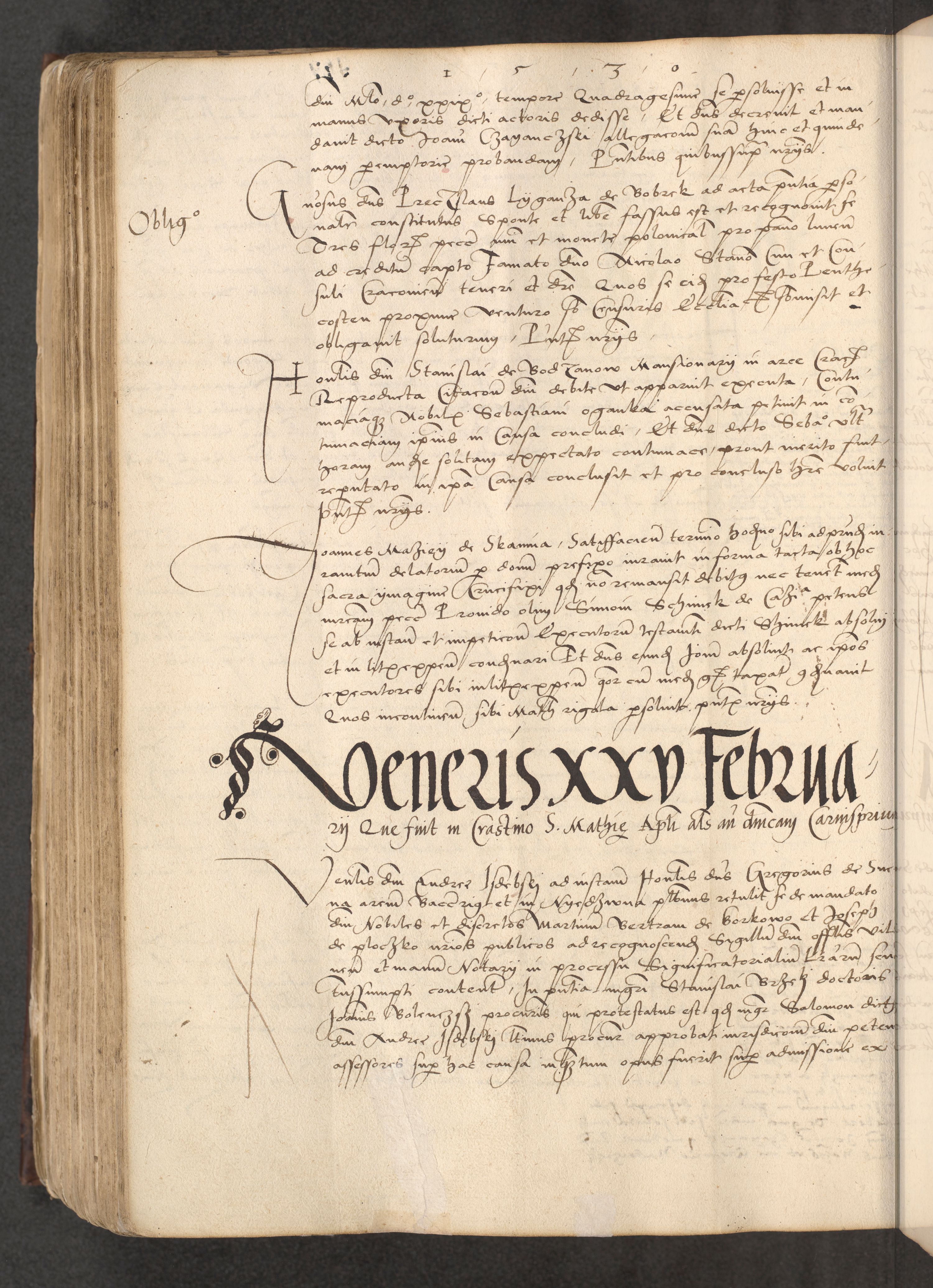 INRI. Acta actorum, obligacionum et sentenciarum tam interlocutoriarum quam diffinitivarum coram reverendo patre ac egregio viro domino Jacobo Erciss[o]wski decretorum doctorem, canonico et officiali generali Cracoviensi ad annum Domini 1528, indicionem primam, pontificatus sanctissimi in Christo patris et domini domini Clementis divina probidendcia pape seprtimi, annum quintum, per Stanislaum de Mordi legalem consistorii notarium omine felici inchoantur