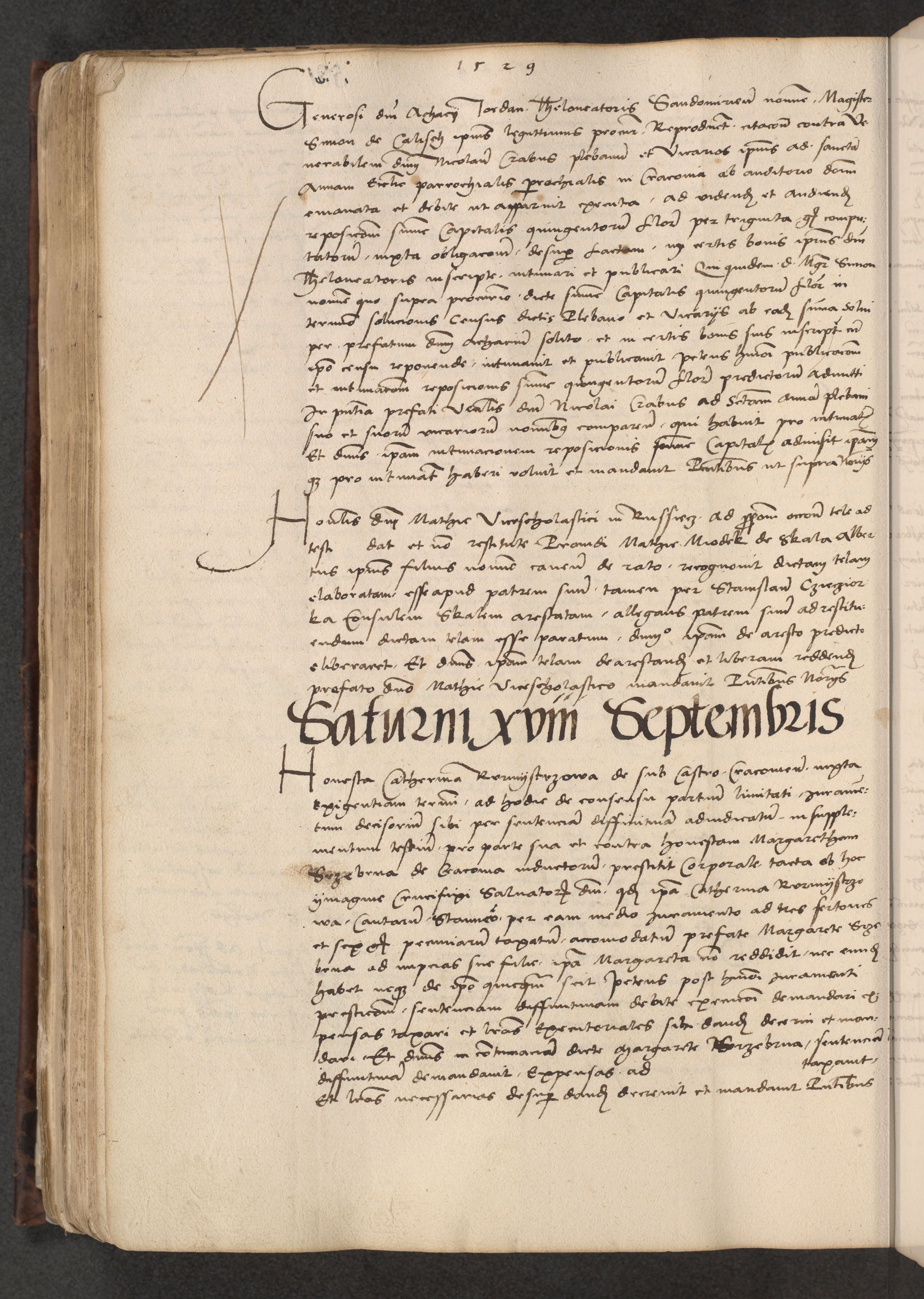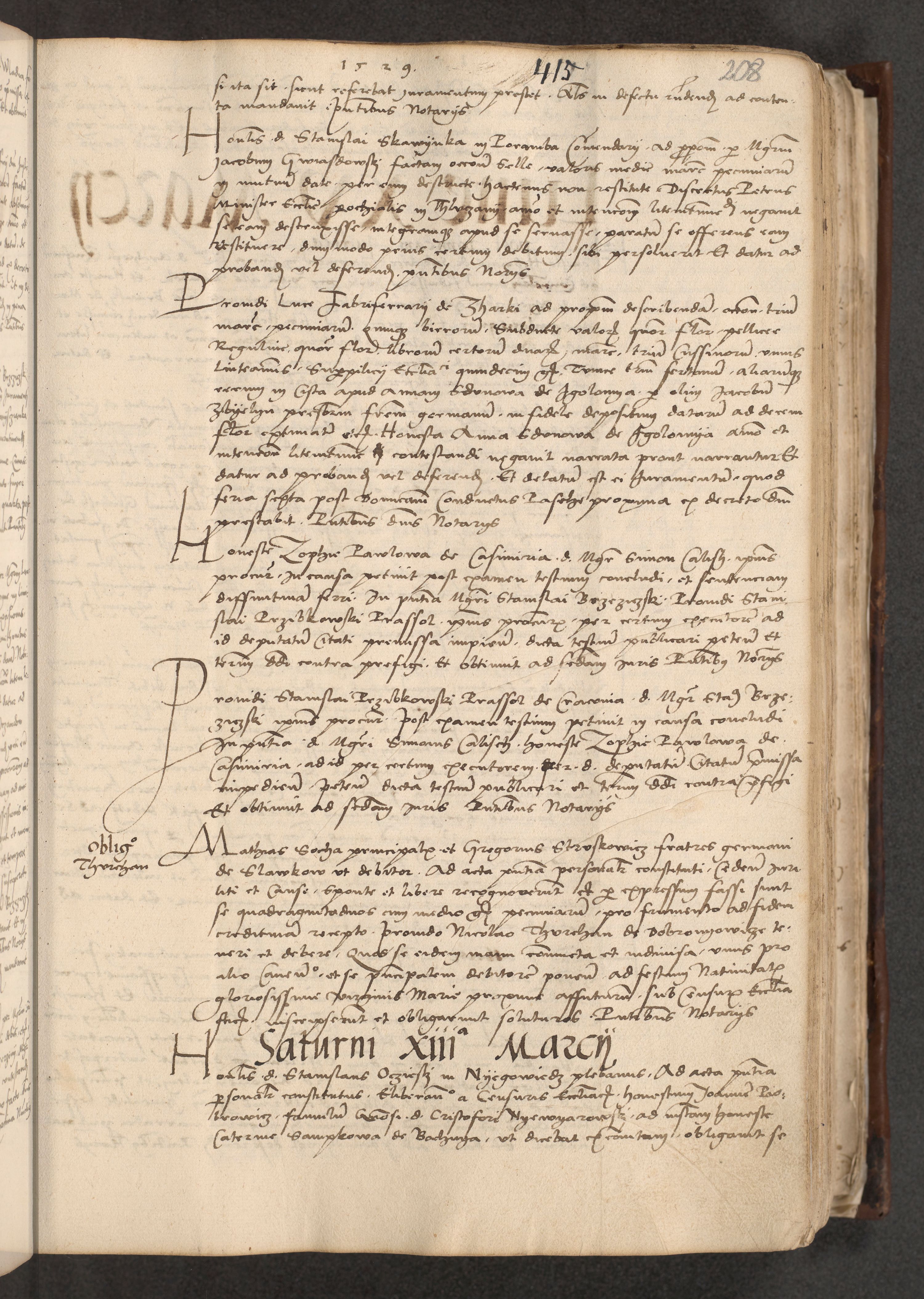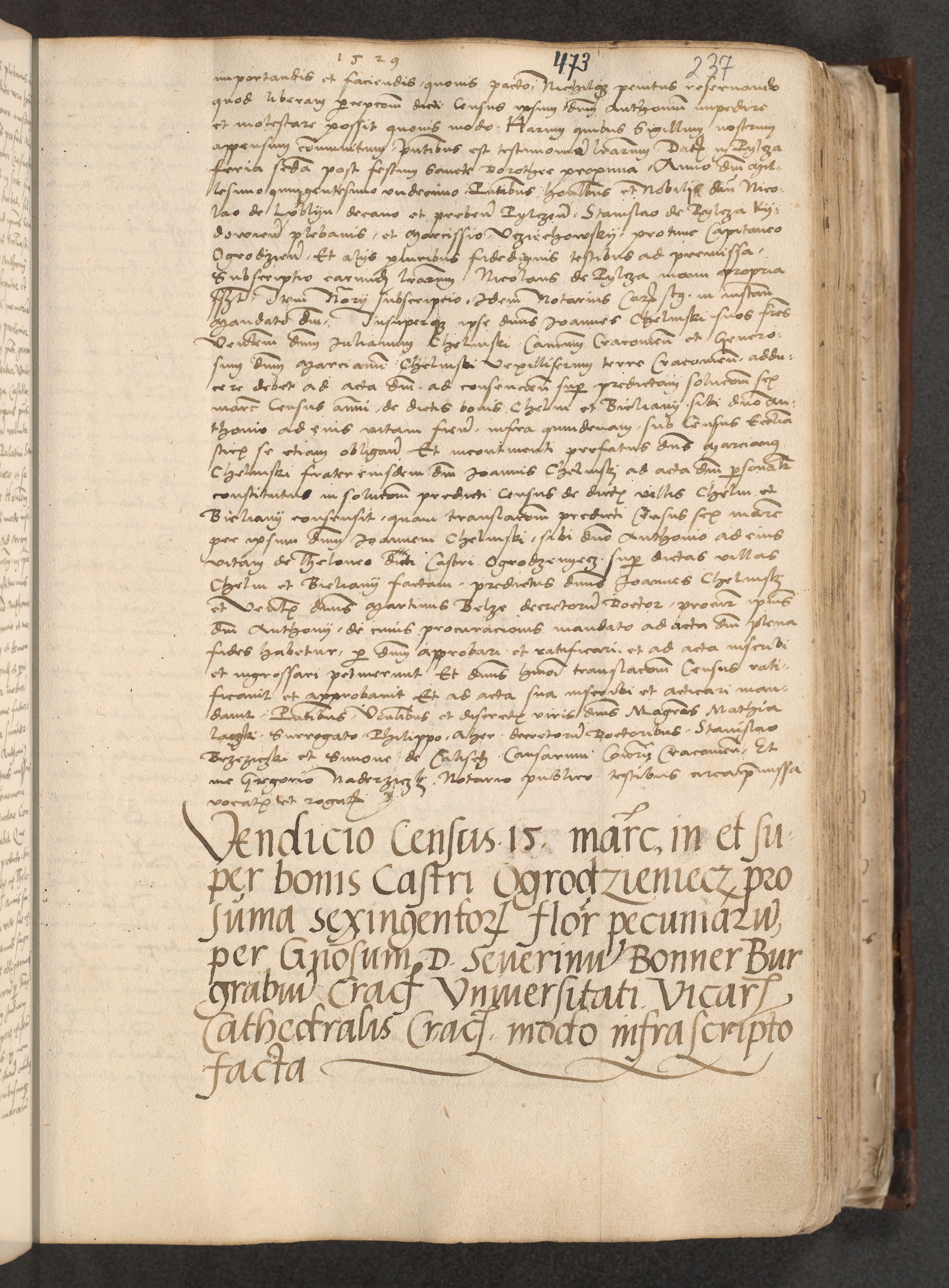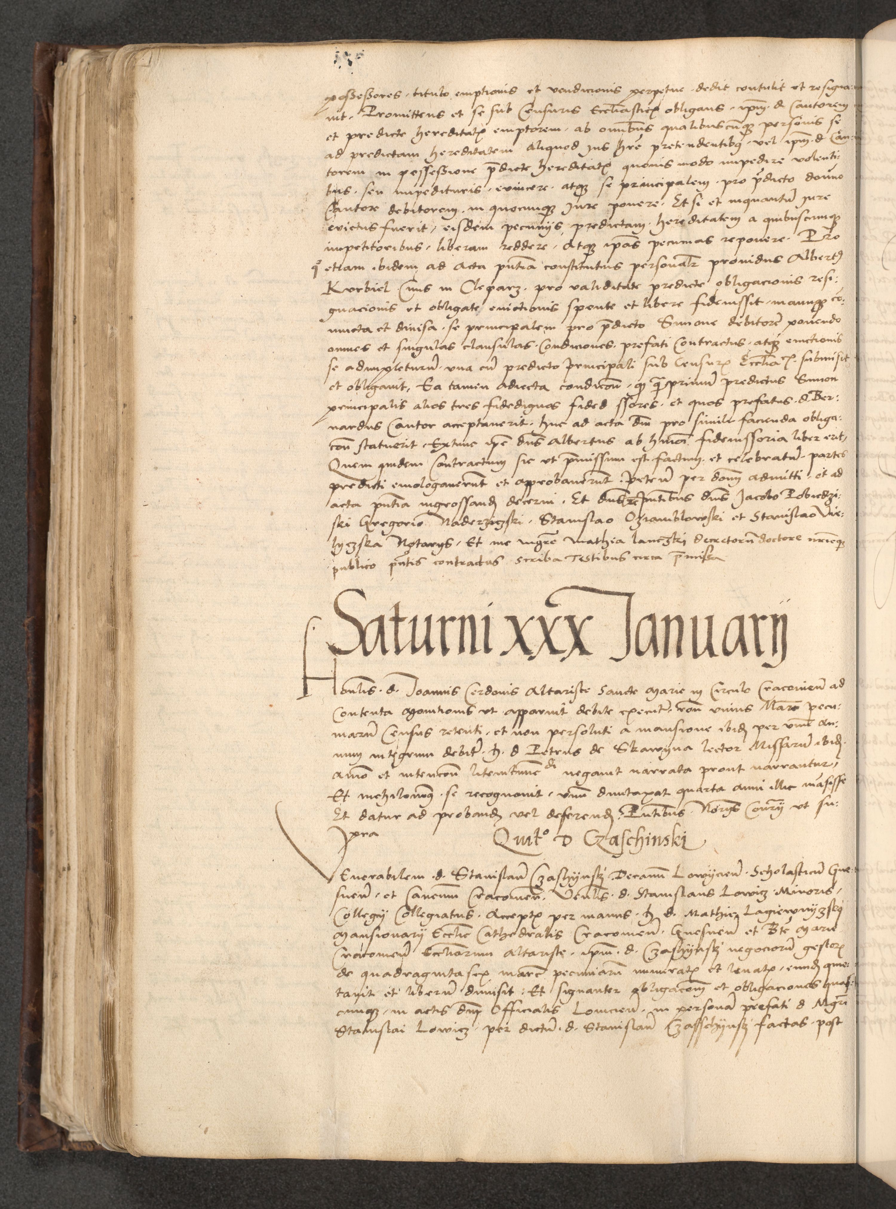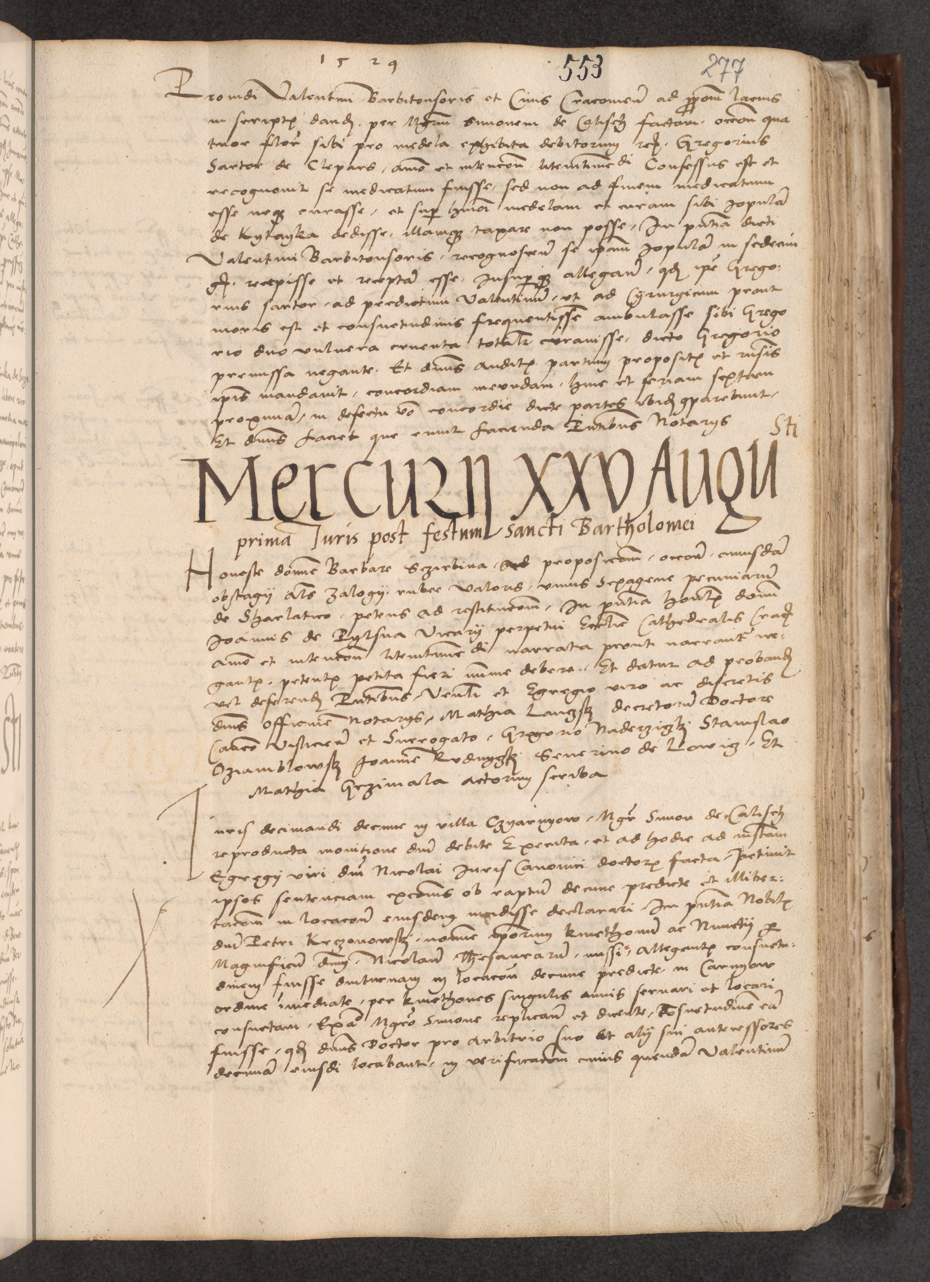 INRI. Acta actorum, obligacionum et sentenciarum tam interlocutoriarum quam diffinitivarum coram reverendo patre ac egregio viro domino Jacobo Erciss[o]wski decretorum doctorem, canonico et officiali generali Cracoviensi ad annum Domini 1528, indicionem primam, pontificatus sanctissimi in Christo patris et domini domini Clementis divina probidendcia pape seprtimi, annum quintum, per Stanislaum de Mordi legalem consistorii notarium omine felici inchoantur