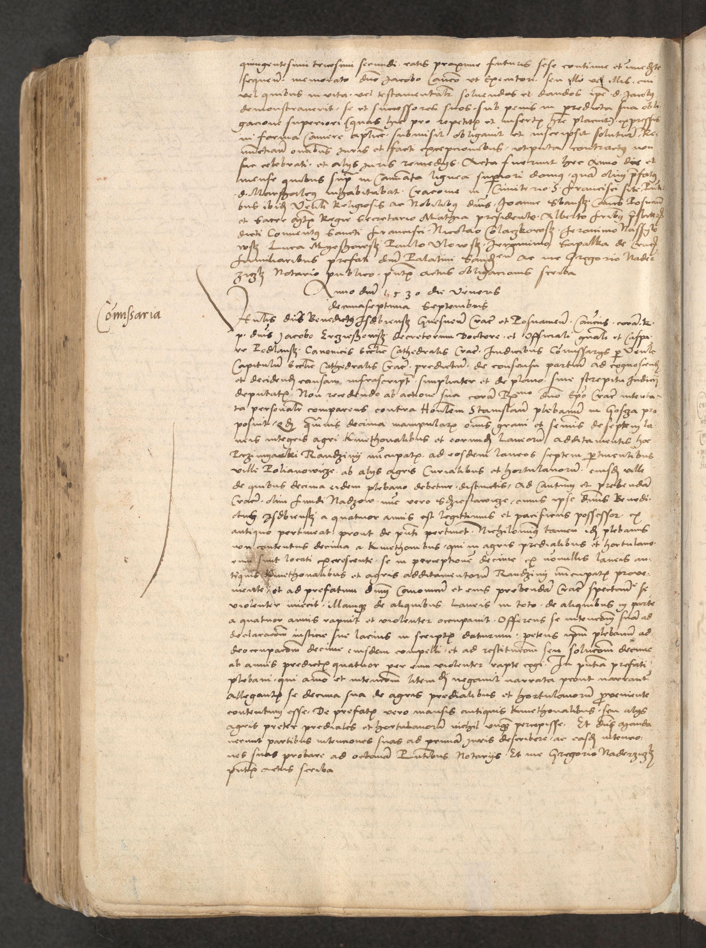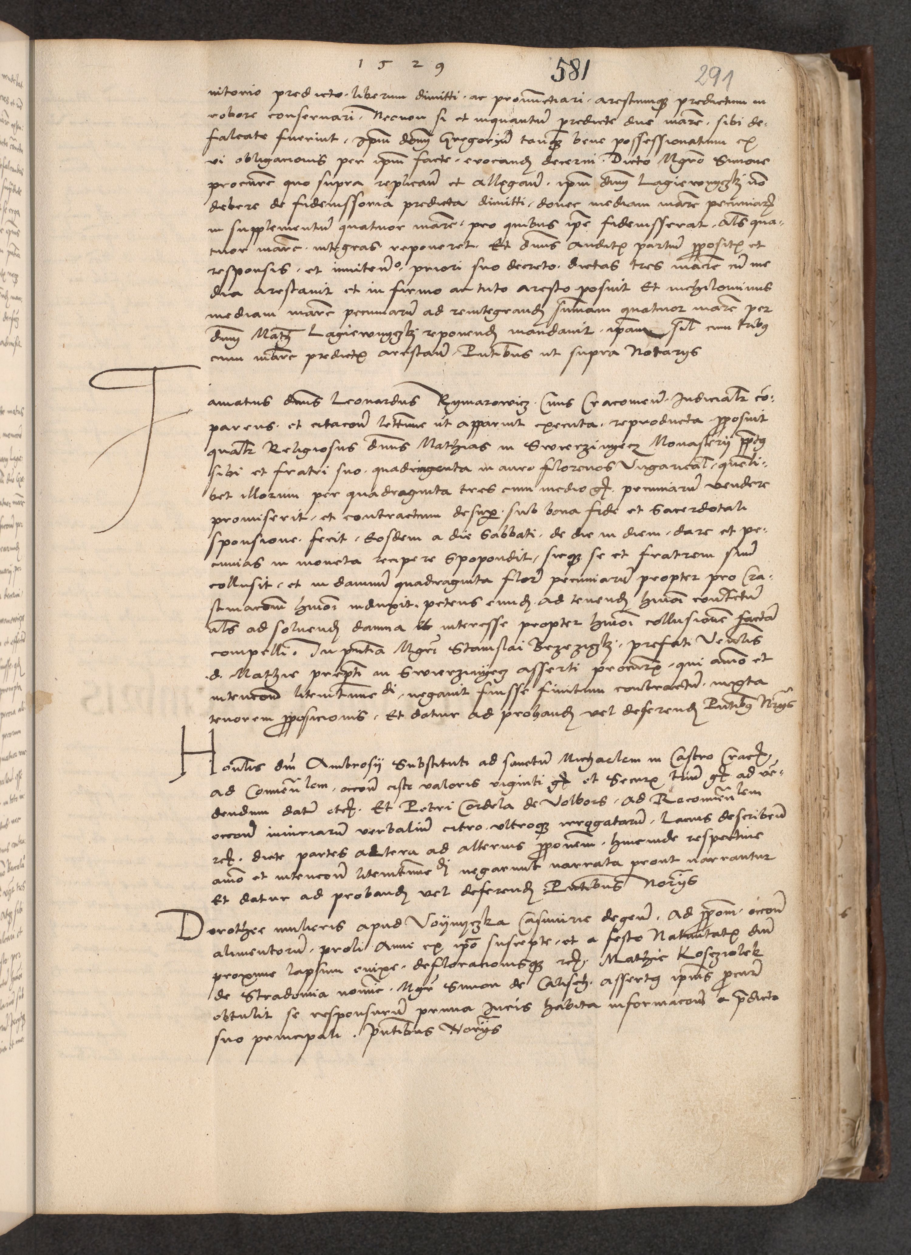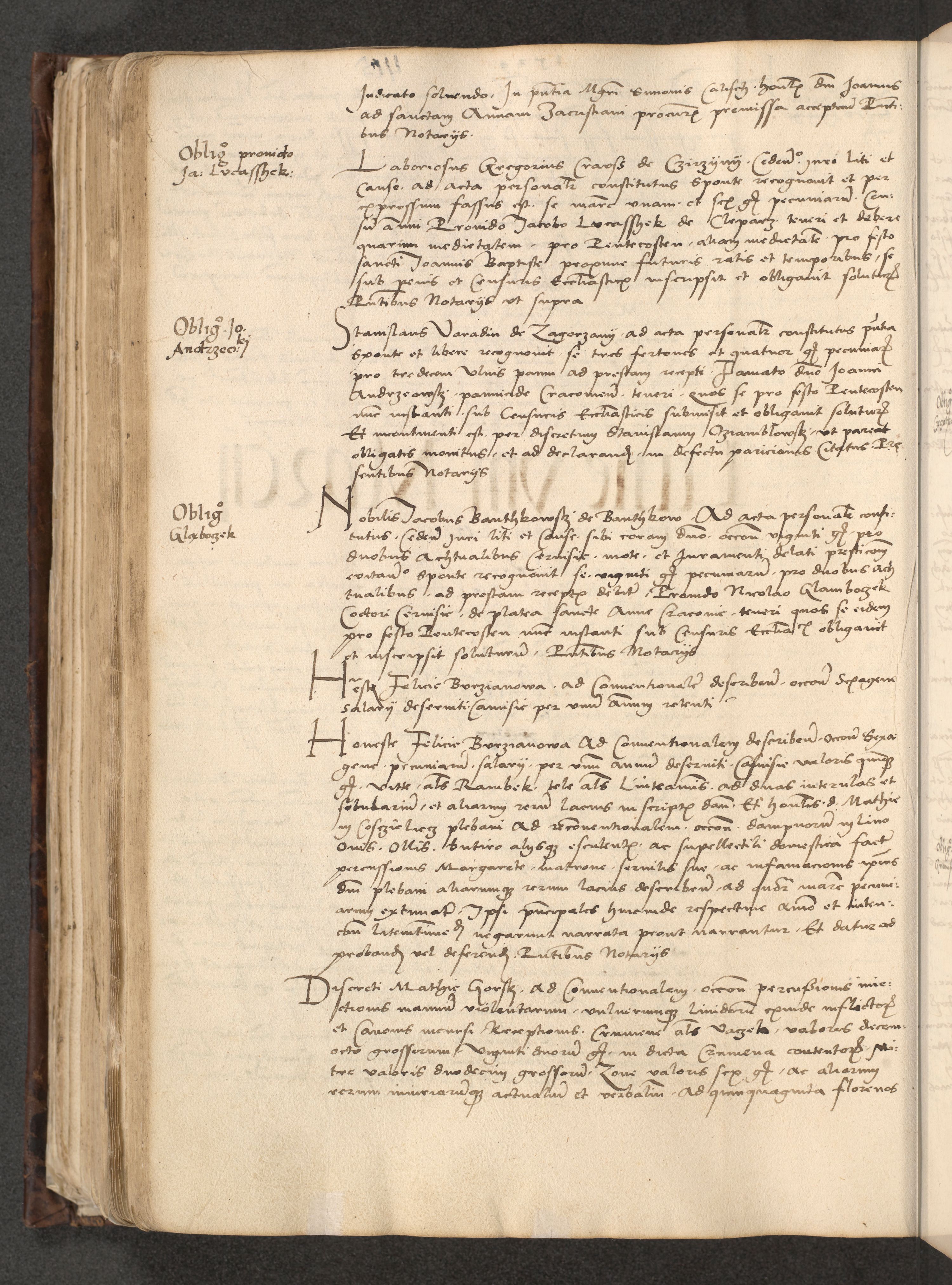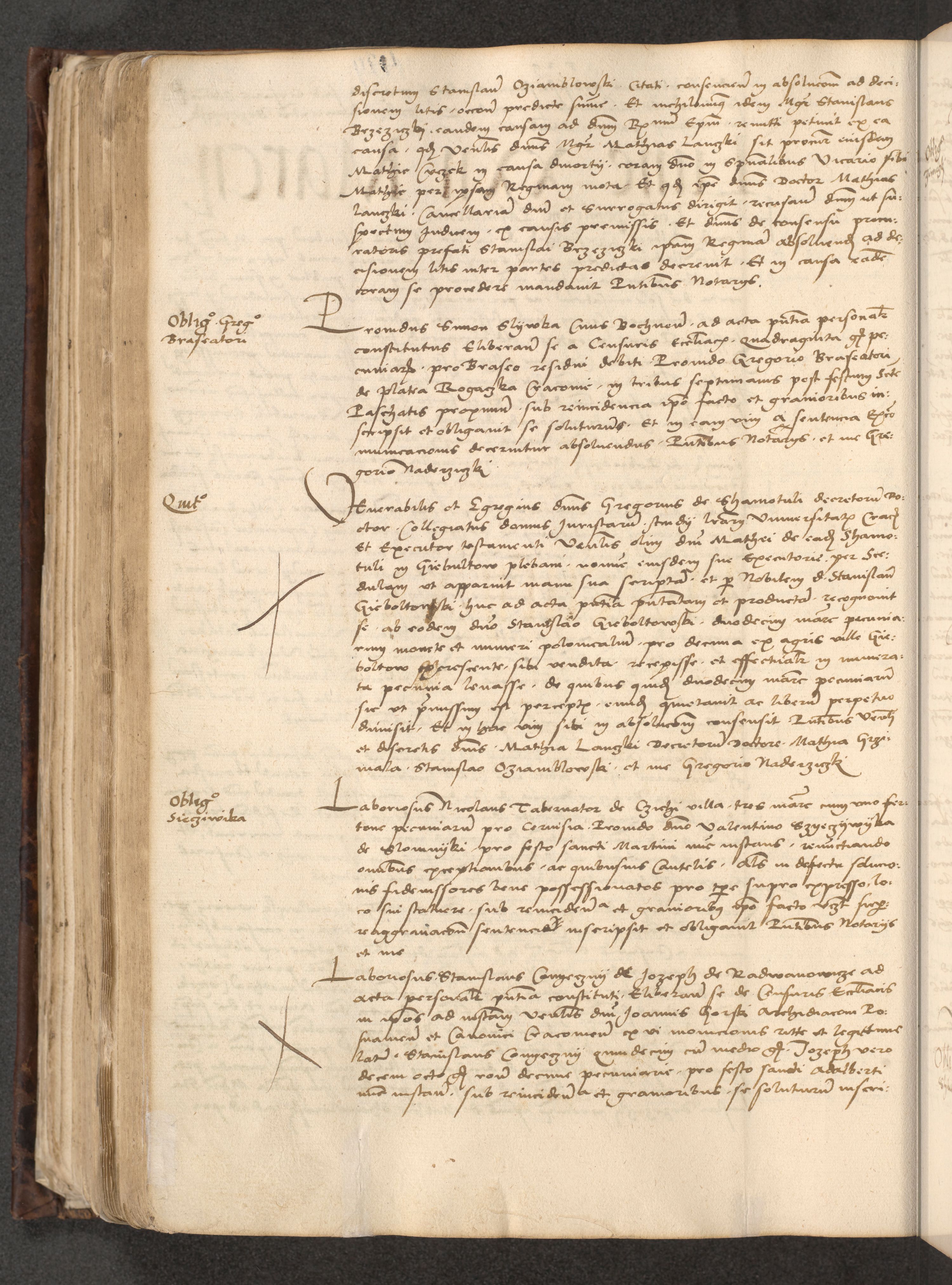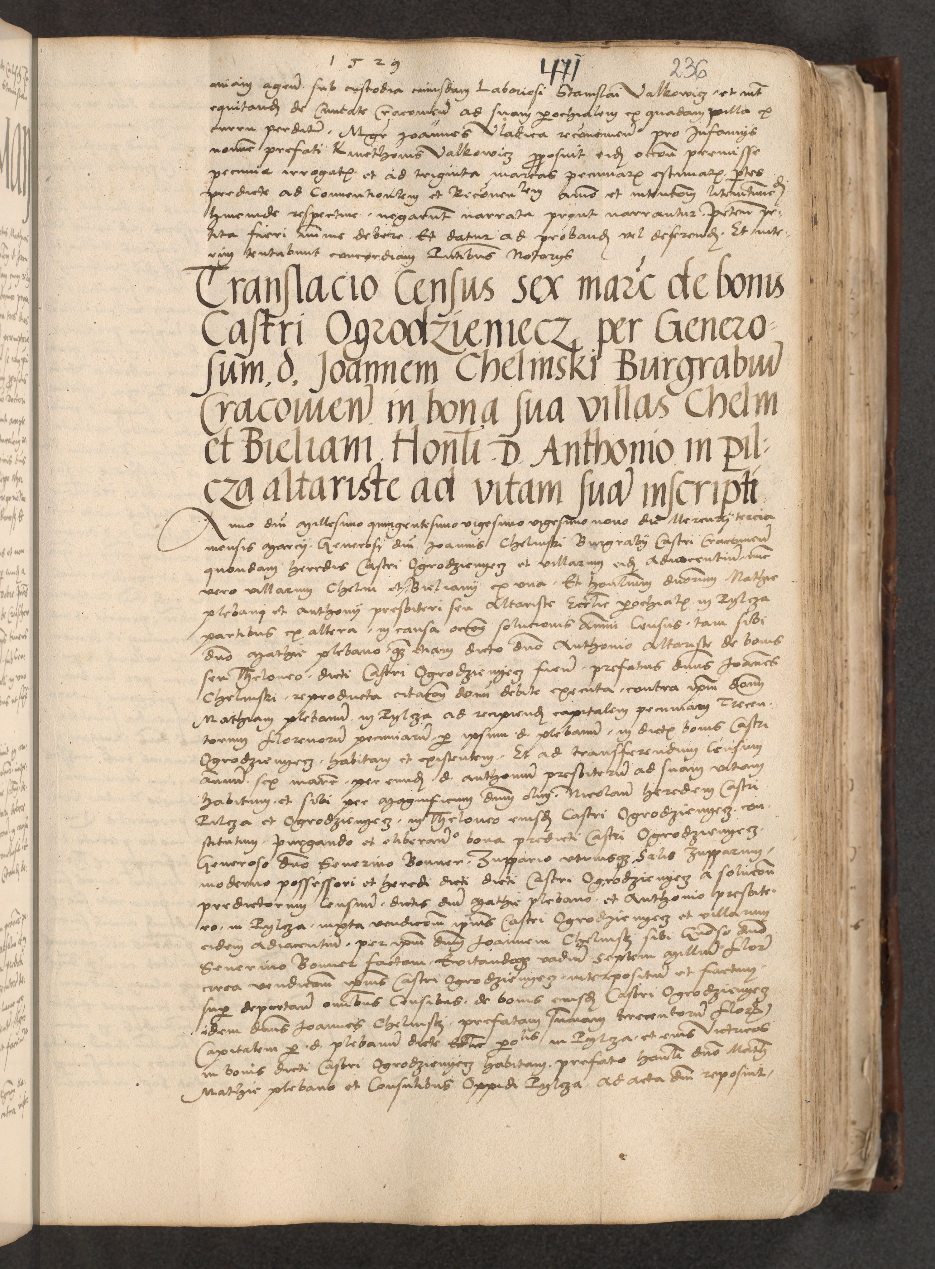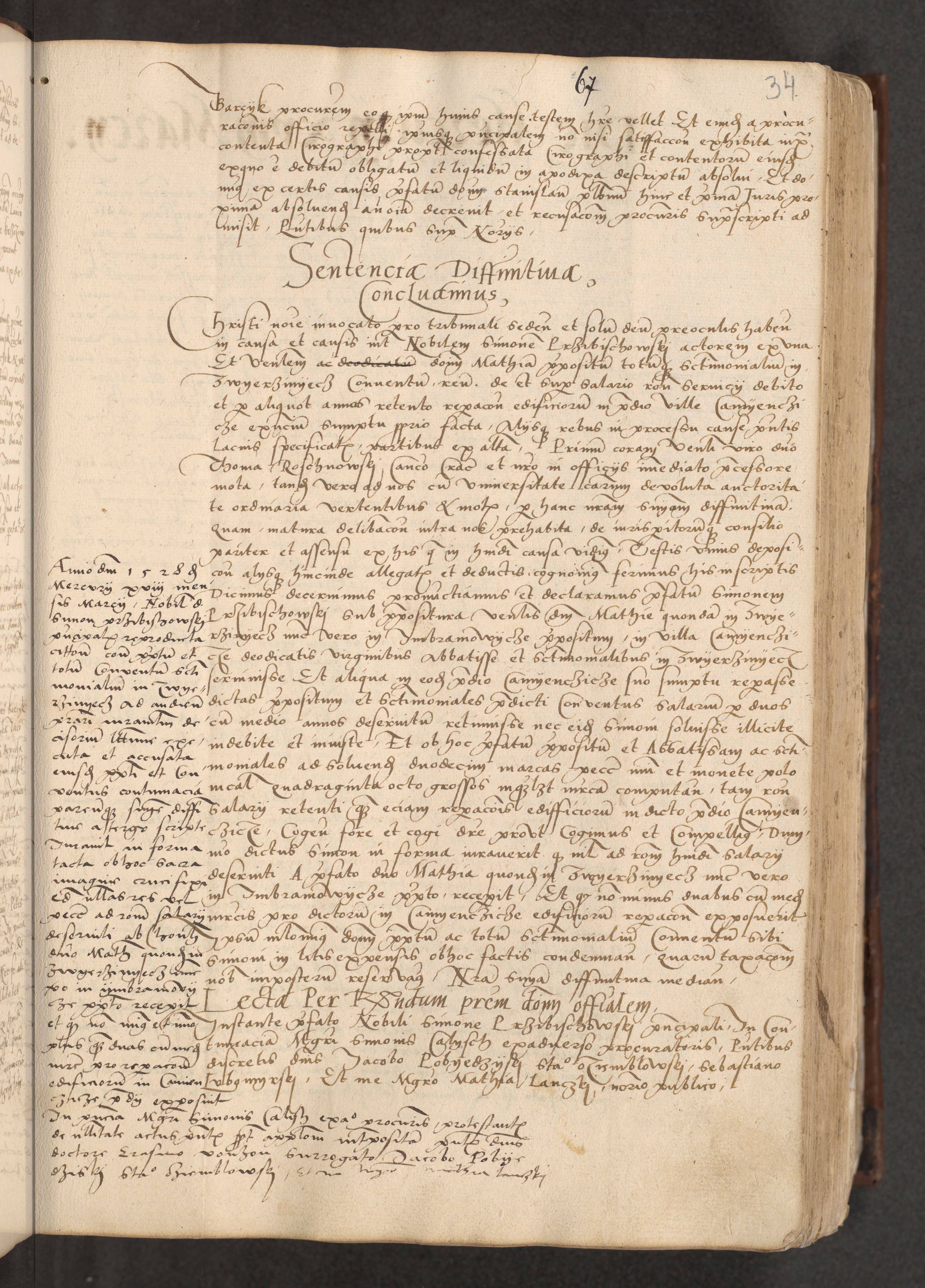 INRI. Acta actorum, obligacionum et sentenciarum tam interlocutoriarum quam diffinitivarum coram reverendo patre ac egregio viro domino Jacobo Erciss[o]wski decretorum doctorem, canonico et officiali generali Cracoviensi ad annum Domini 1528, indicionem primam, pontificatus sanctissimi in Christo patris et domini domini Clementis divina probidendcia pape seprtimi, annum quintum, per Stanislaum de Mordi legalem consistorii notarium omine felici inchoantur
