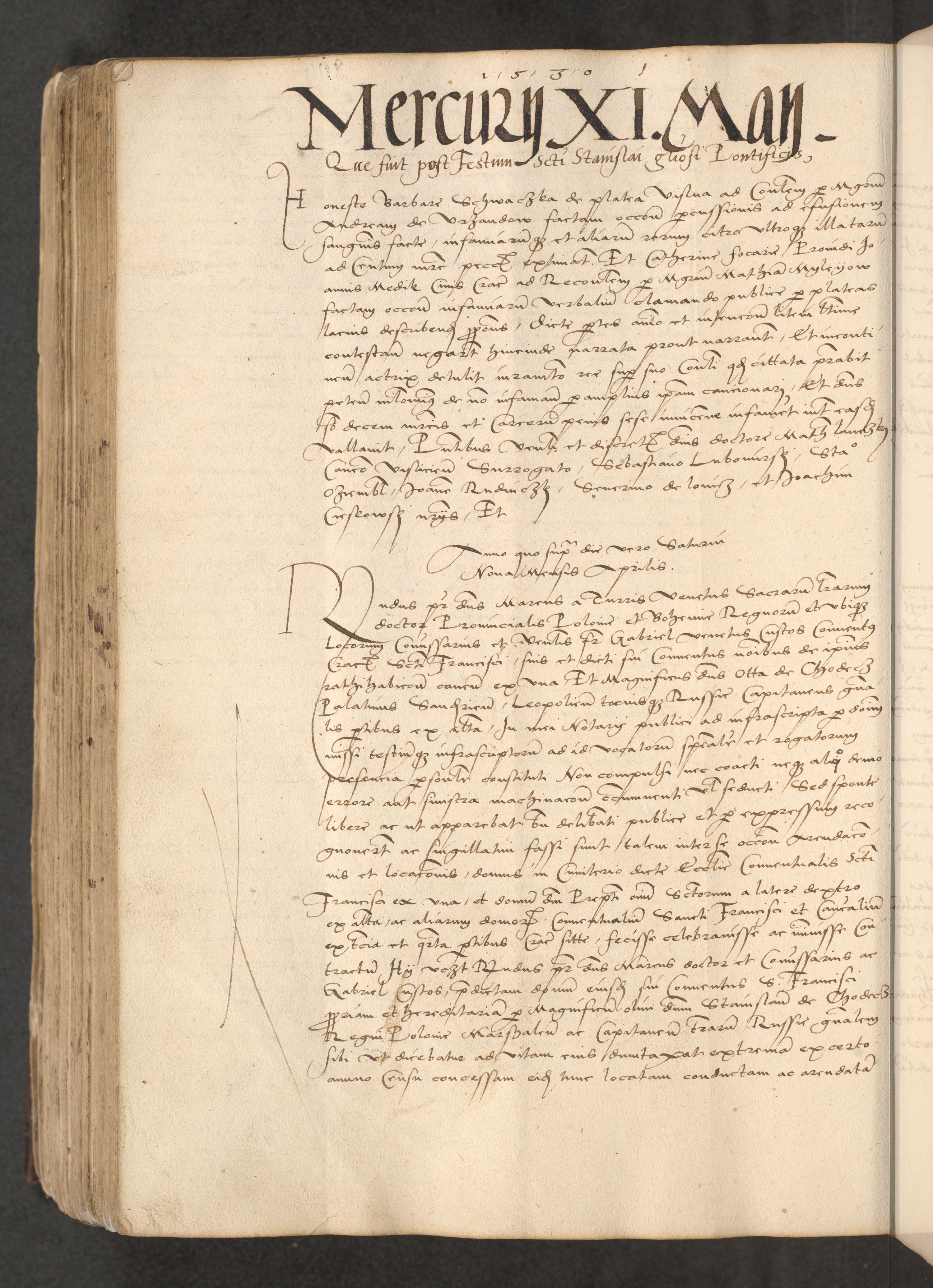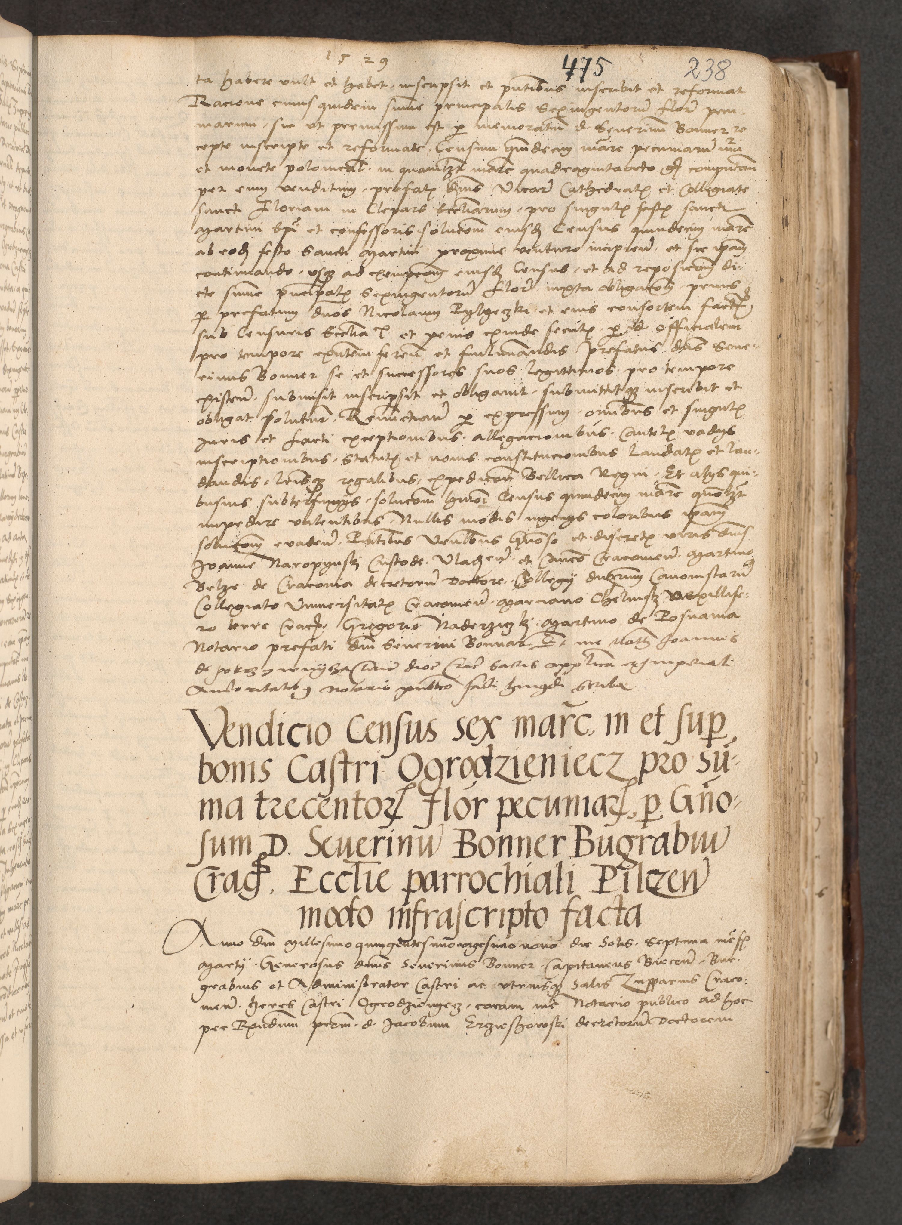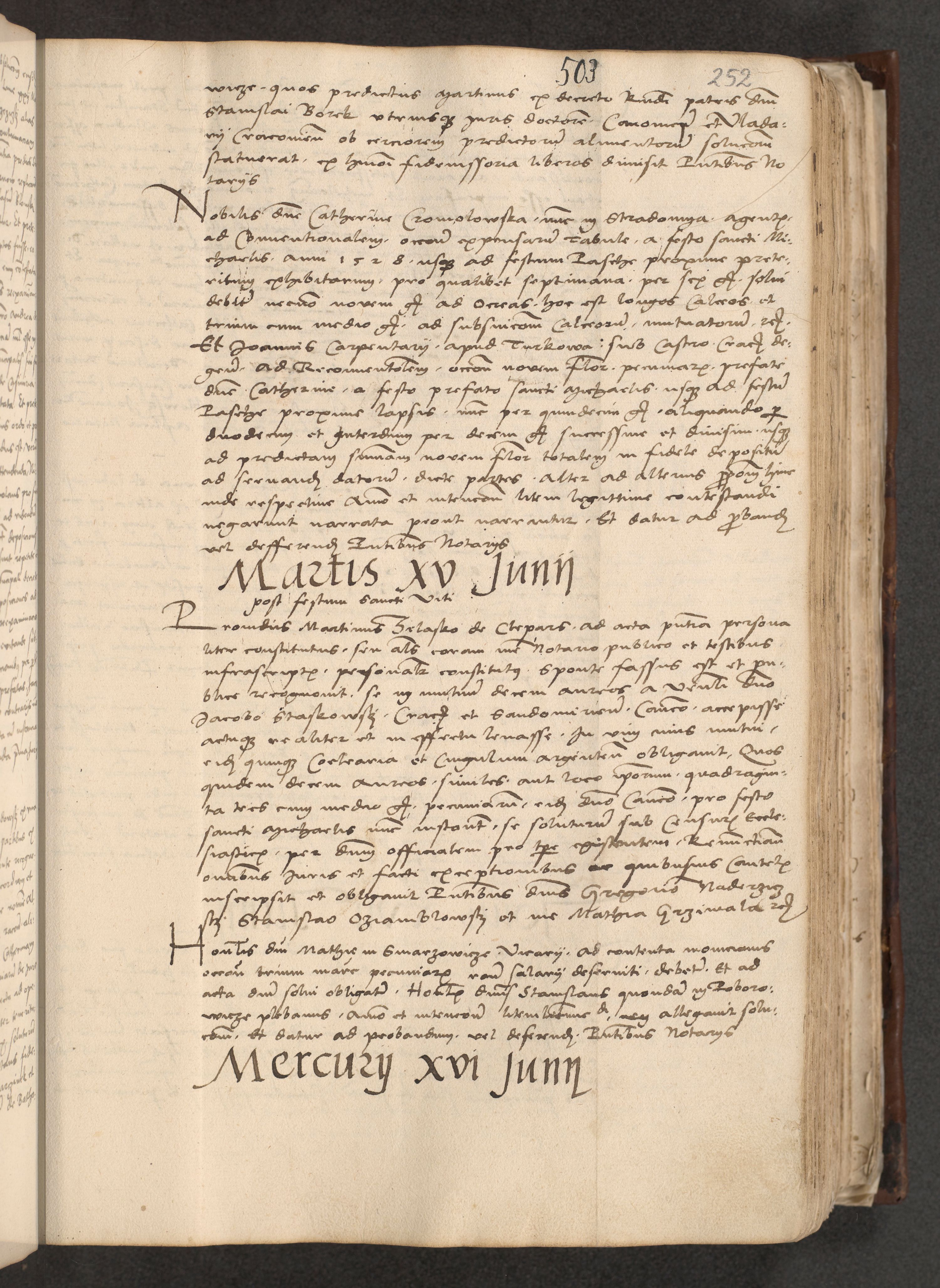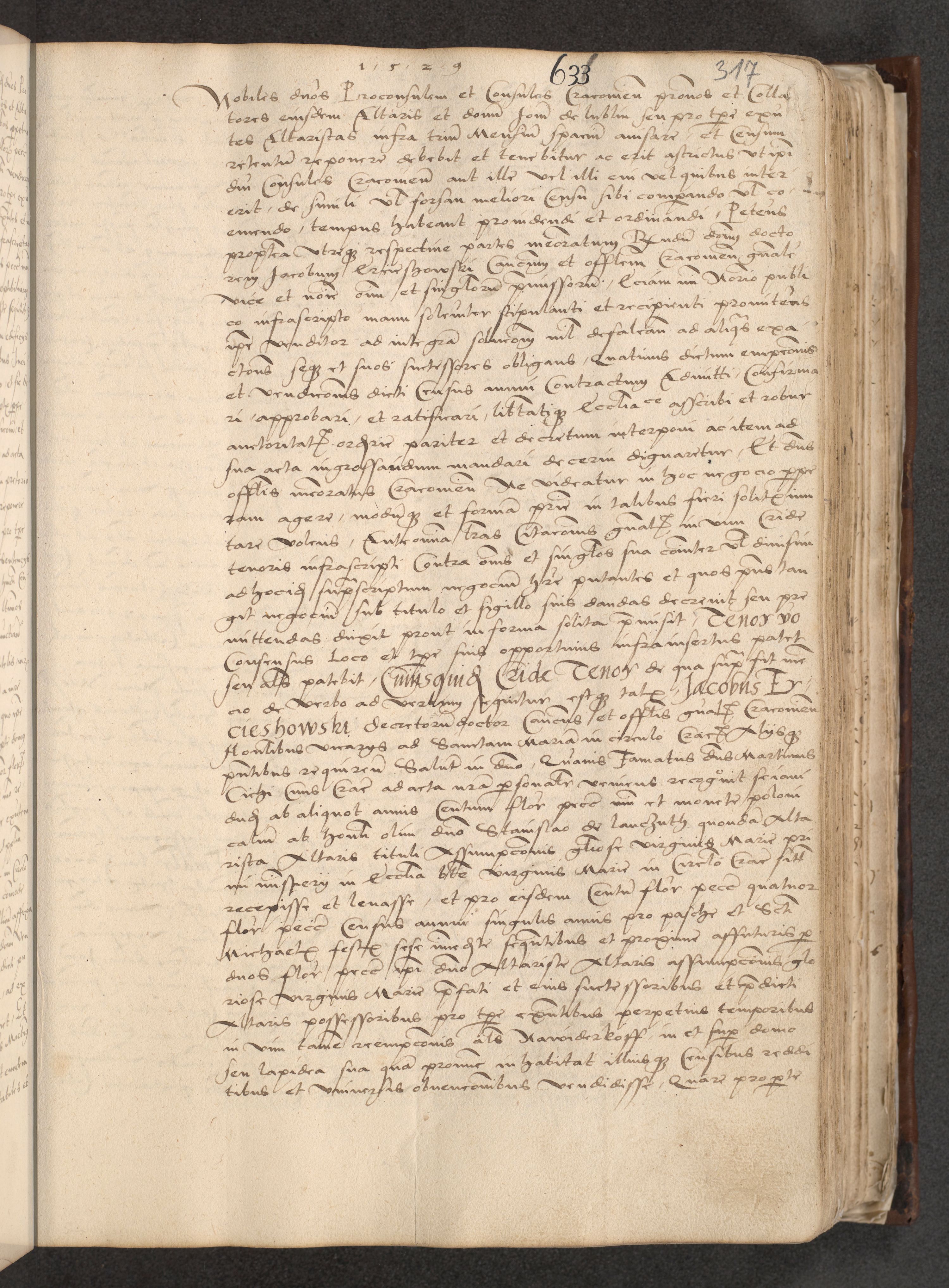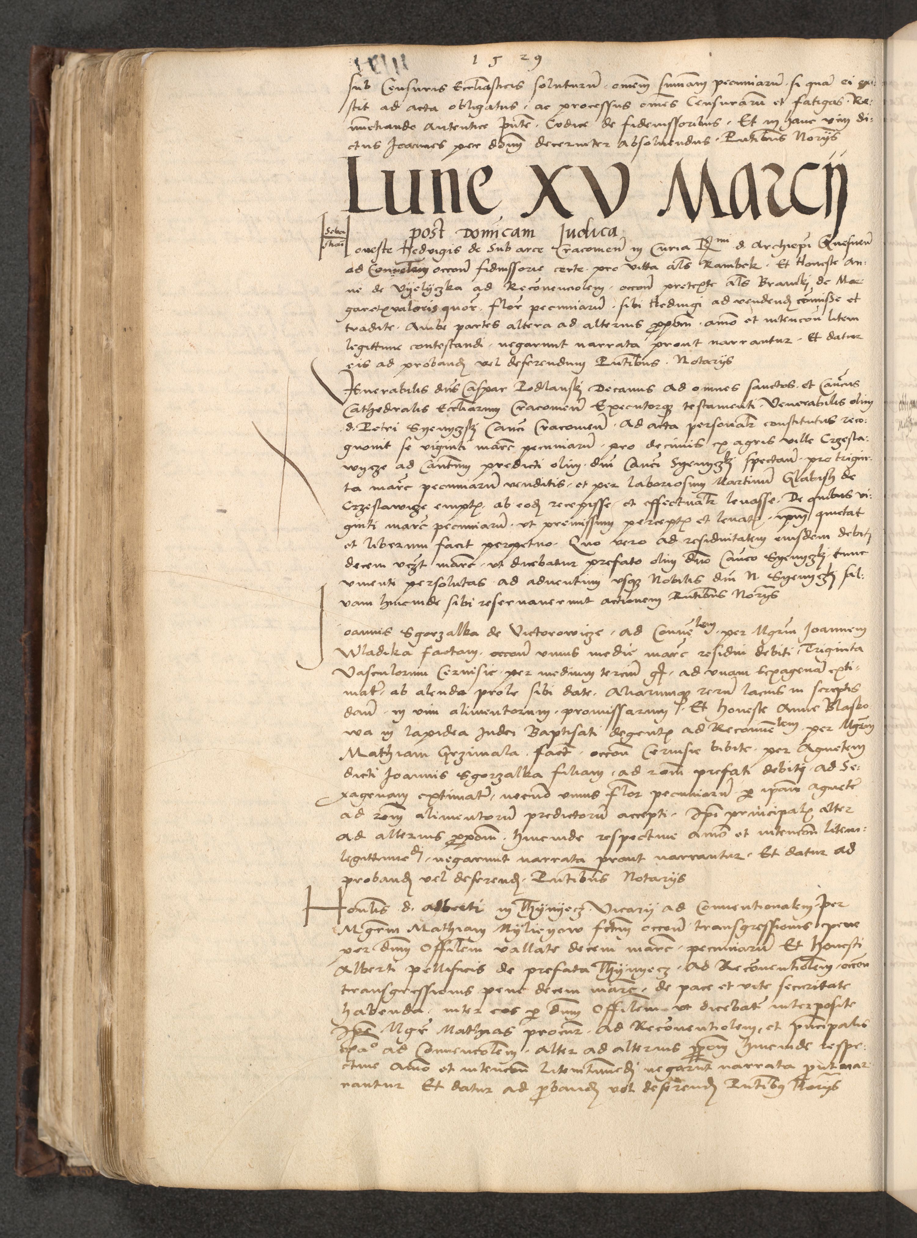 INRI. Acta actorum, obligacionum et sentenciarum tam interlocutoriarum quam diffinitivarum coram reverendo patre ac egregio viro domino Jacobo Erciss[o]wski decretorum doctorem, canonico et officiali generali Cracoviensi ad annum Domini 1528, indicionem primam, pontificatus sanctissimi in Christo patris et domini domini Clementis divina probidendcia pape seprtimi, annum quintum, per Stanislaum de Mordi legalem consistorii notarium omine felici inchoantur
