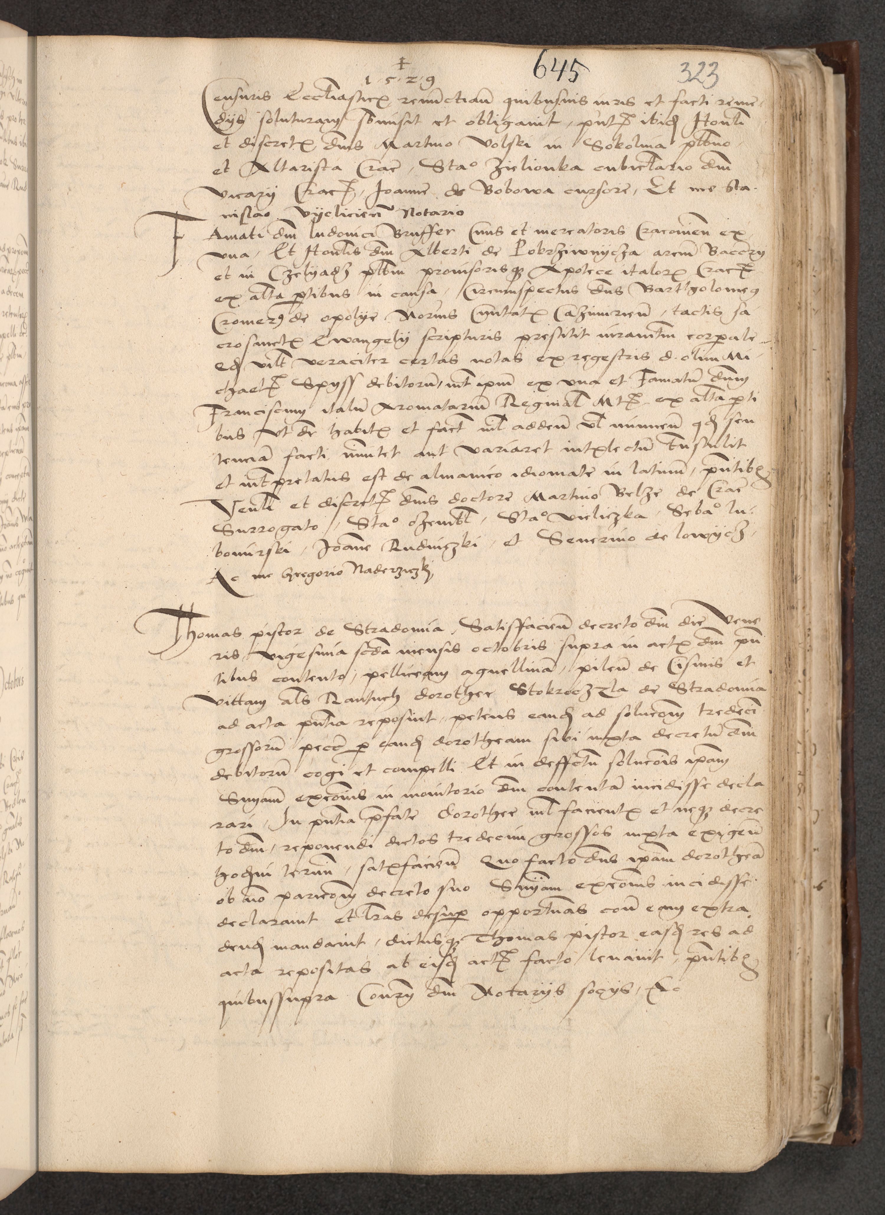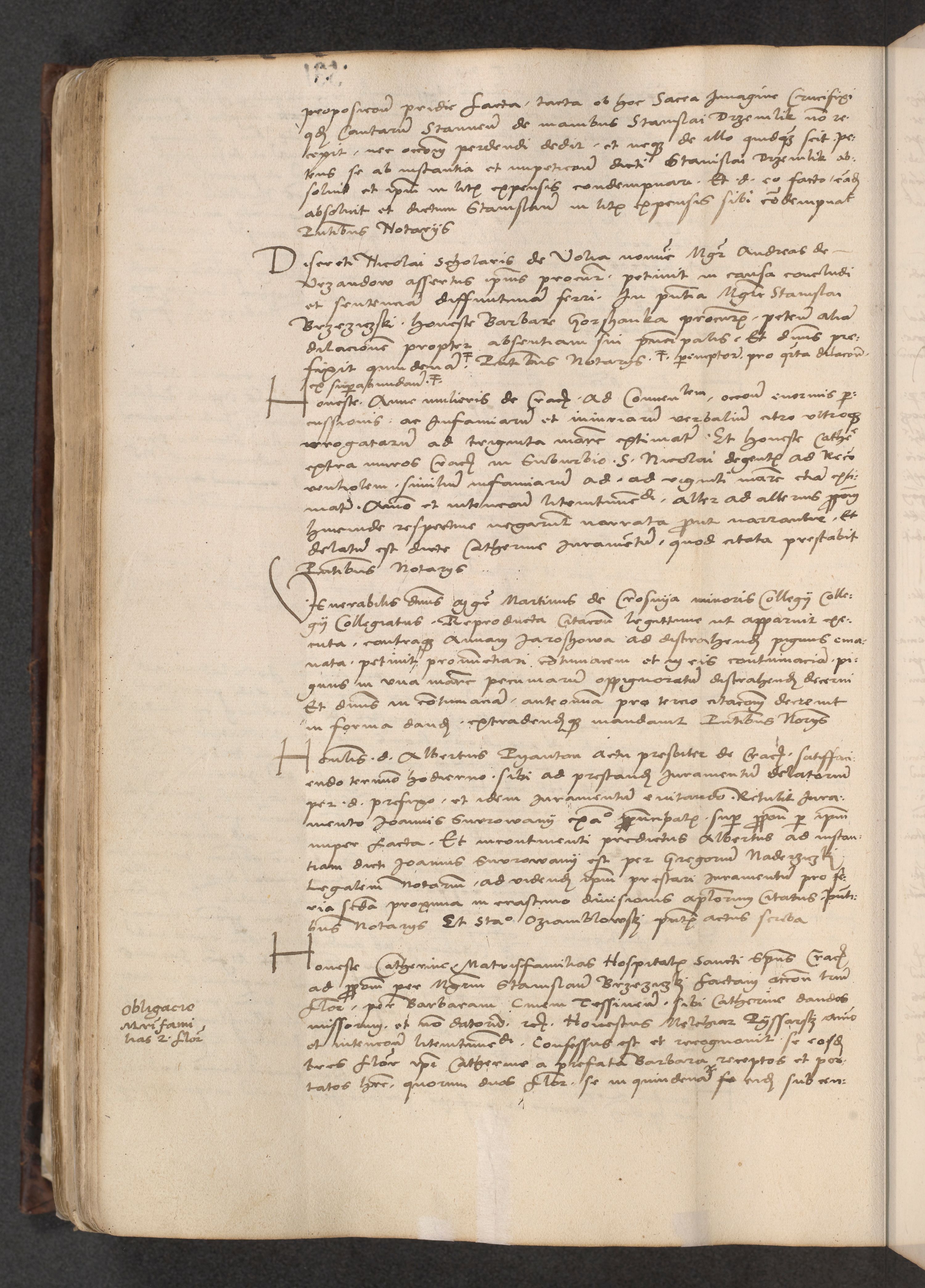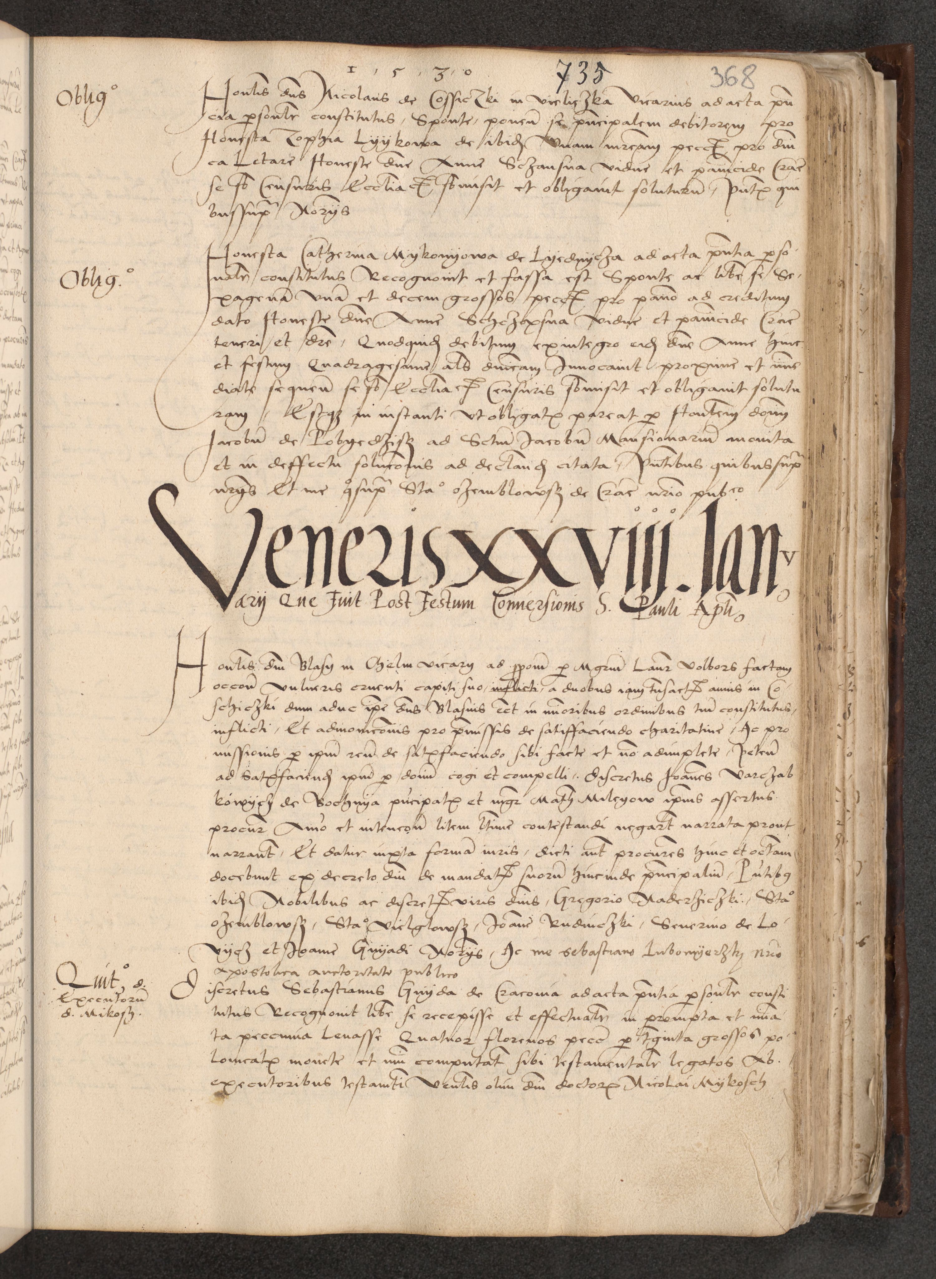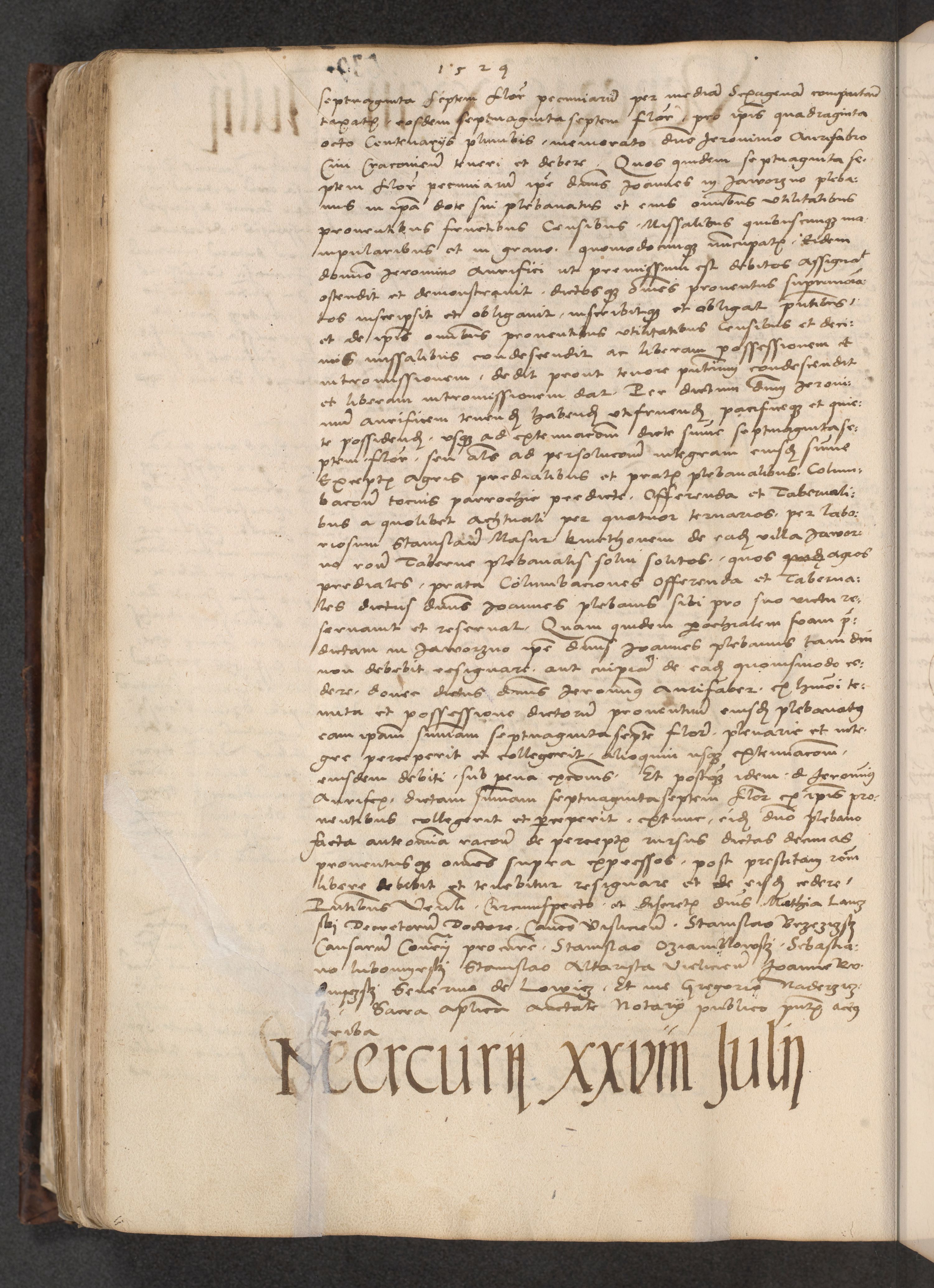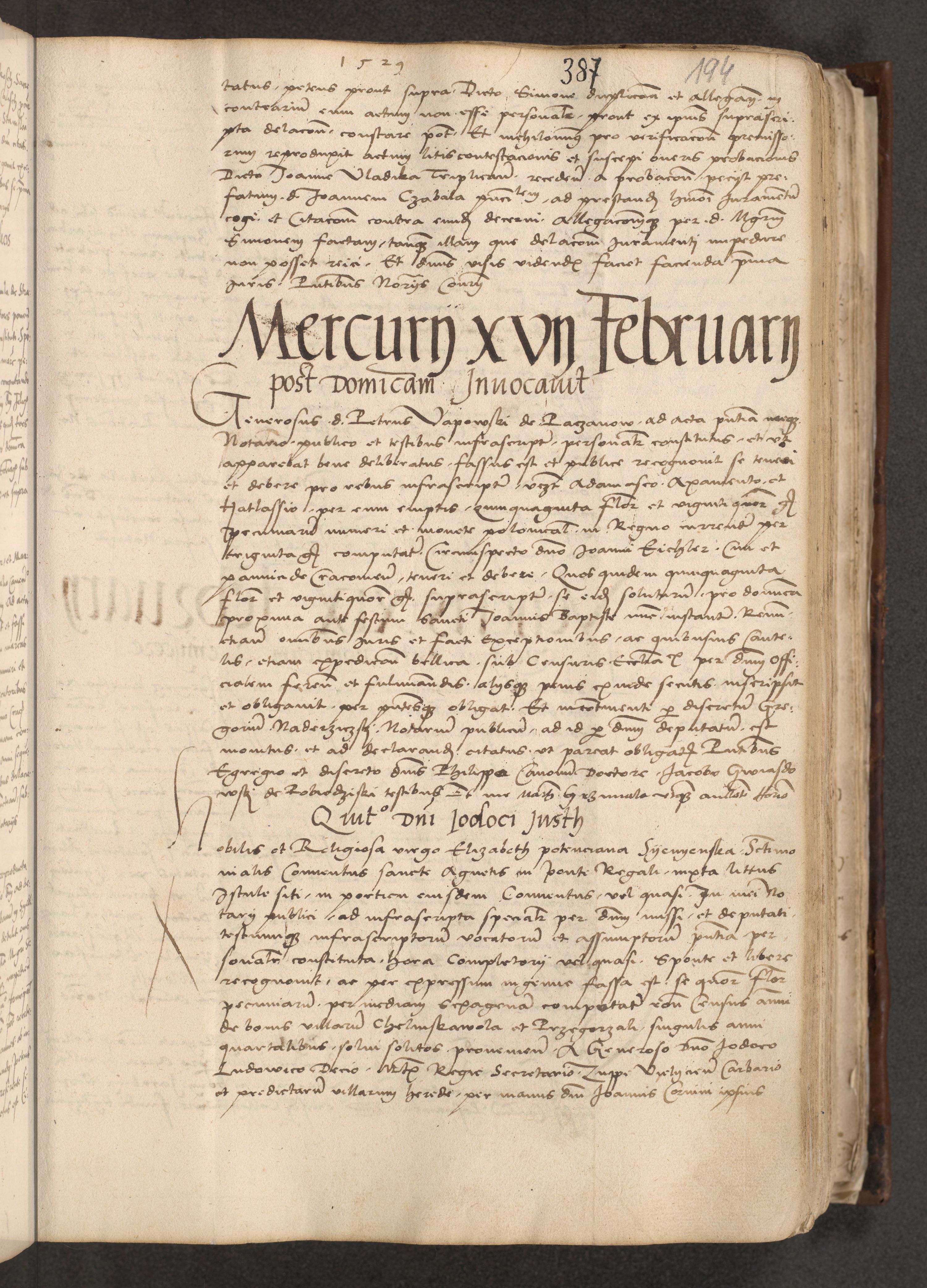 INRI. Acta actorum, obligacionum et sentenciarum tam interlocutoriarum quam diffinitivarum coram reverendo patre ac egregio viro domino Jacobo Erciss[o]wski decretorum doctorem, canonico et officiali generali Cracoviensi ad annum Domini 1528, indicionem primam, pontificatus sanctissimi in Christo patris et domini domini Clementis divina probidendcia pape seprtimi, annum quintum, per Stanislaum de Mordi legalem consistorii notarium omine felici inchoantur