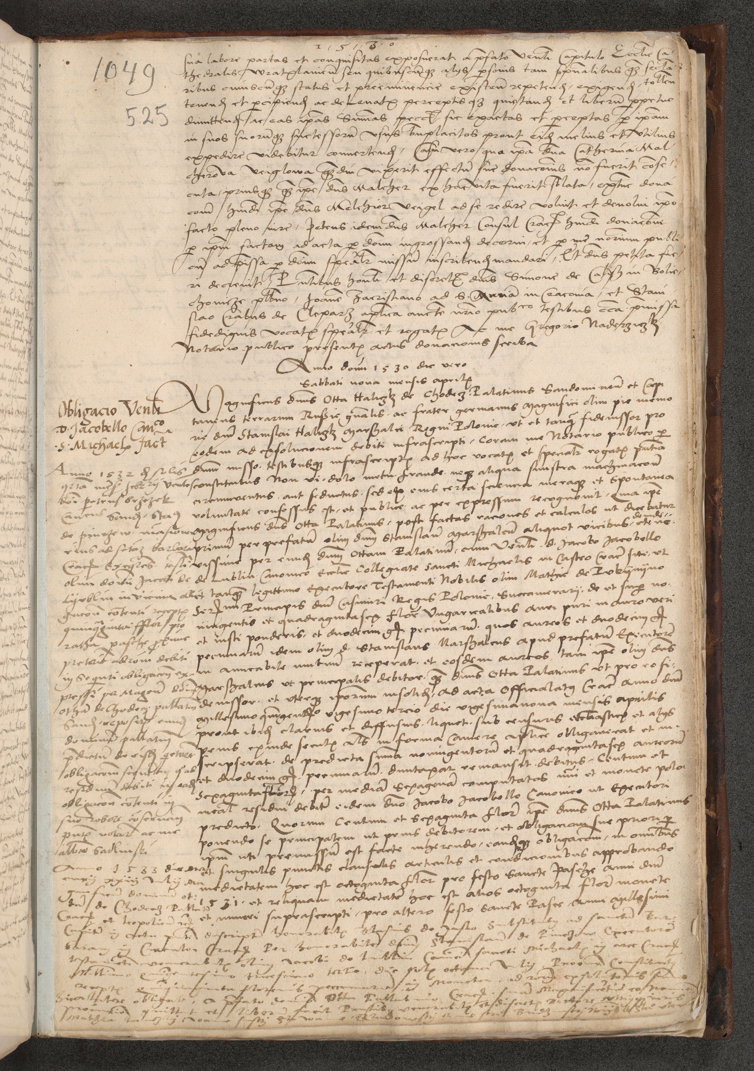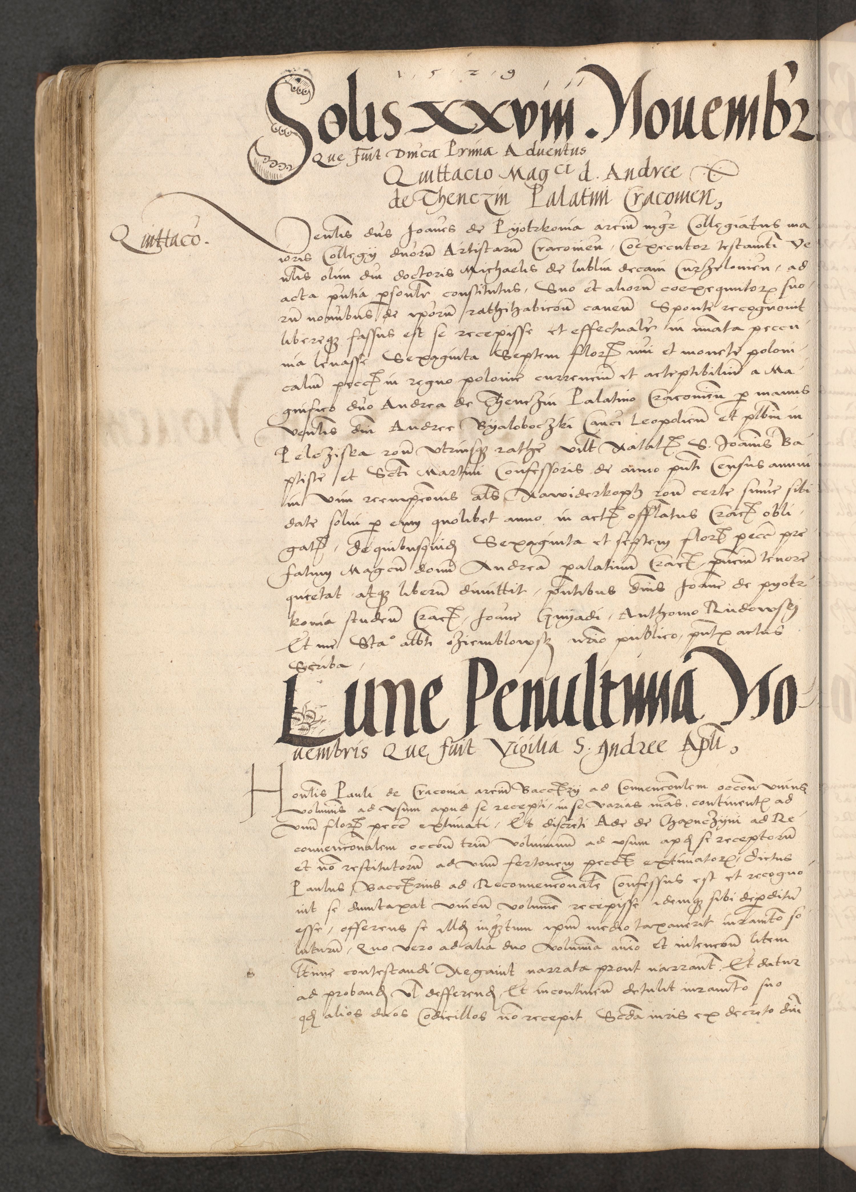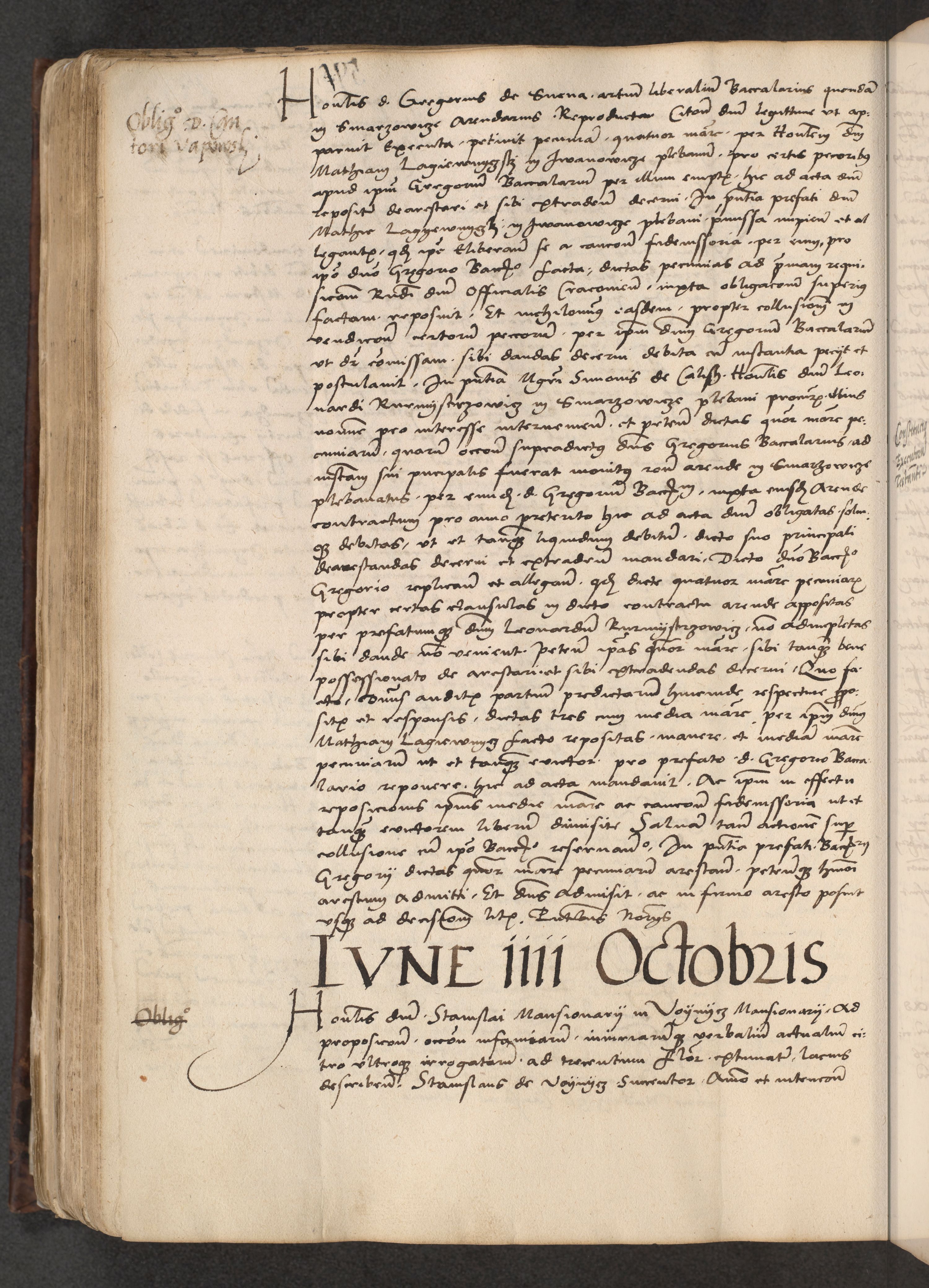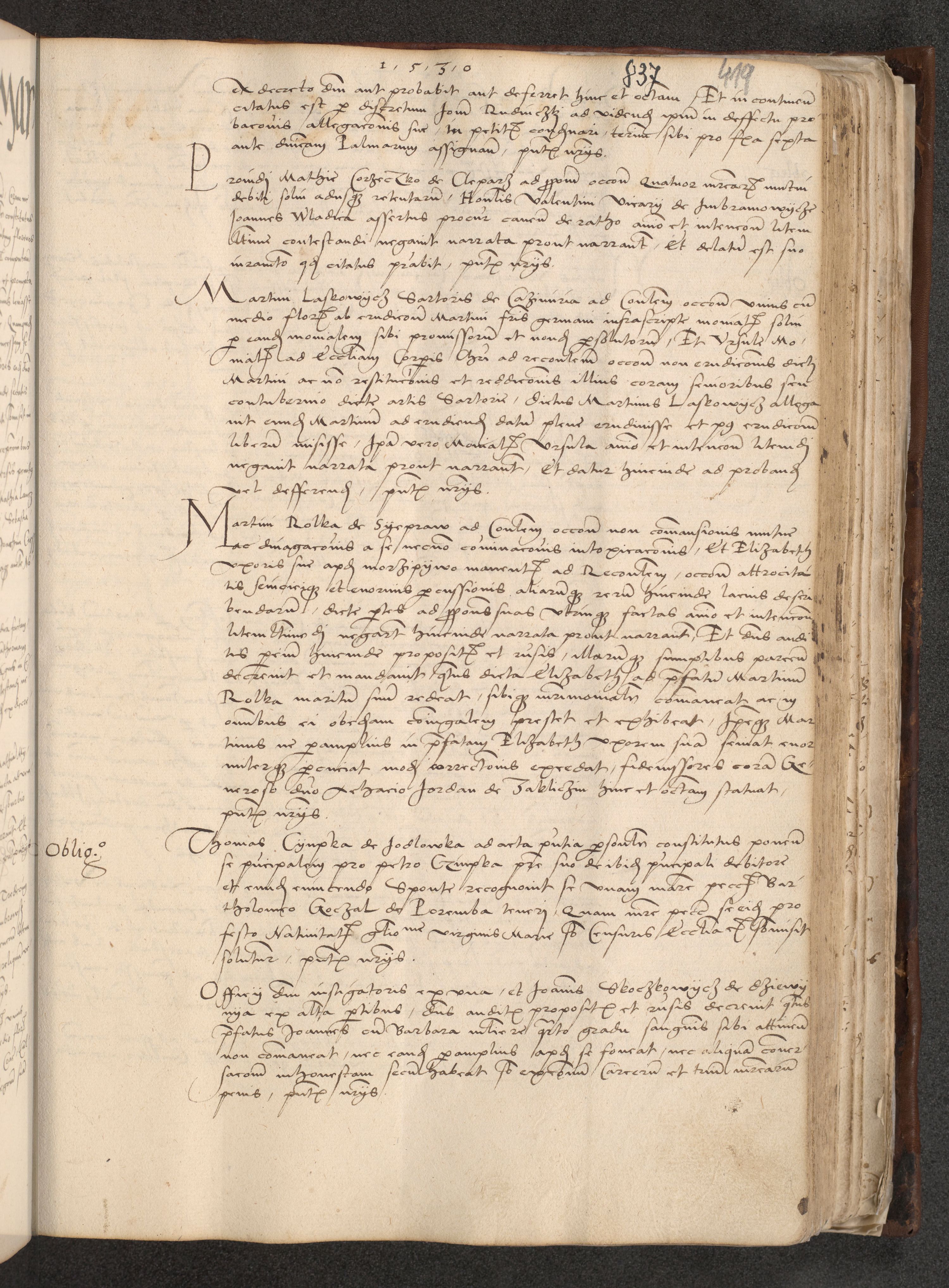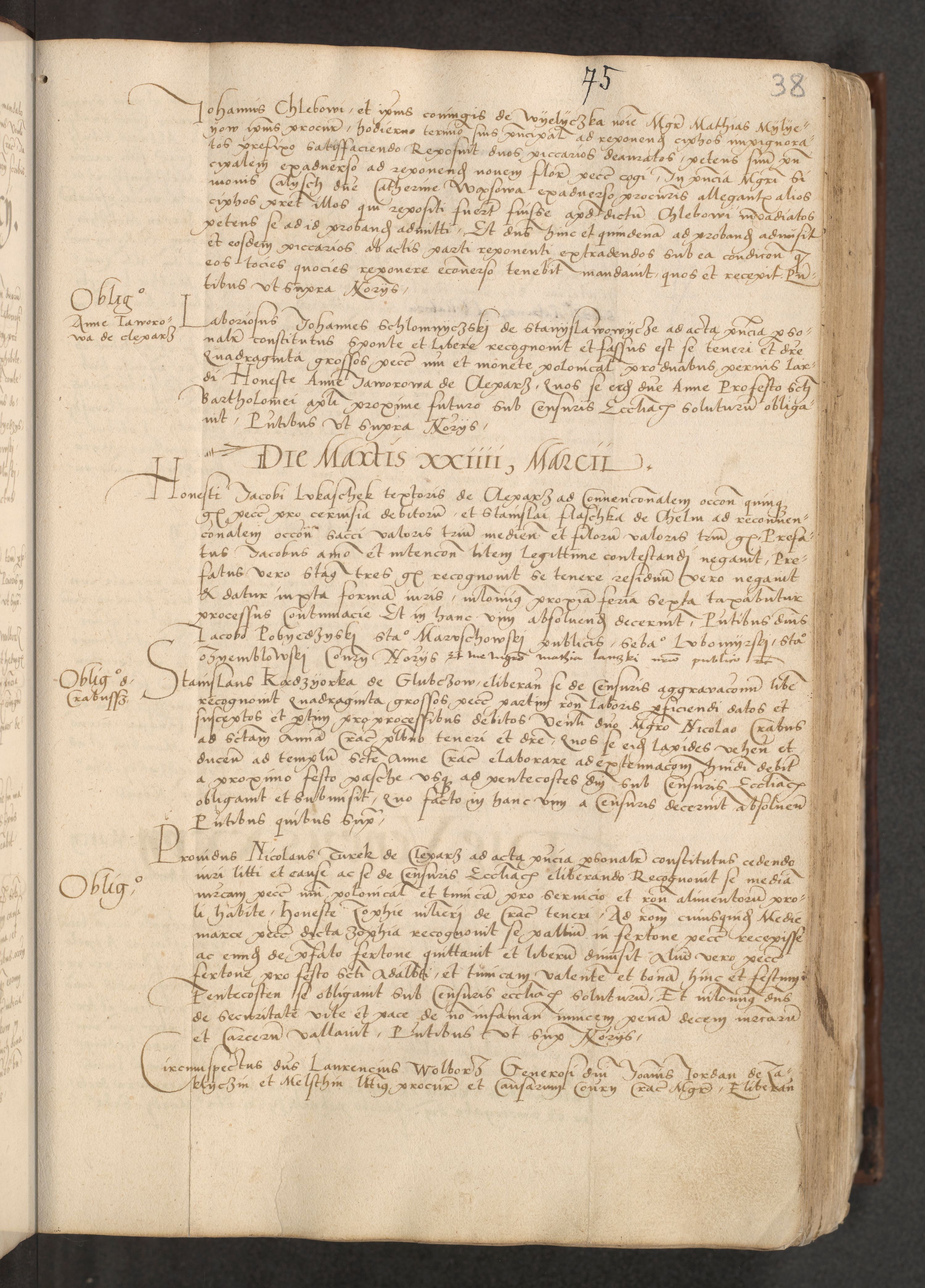 INRI. Acta actorum, obligacionum et sentenciarum tam interlocutoriarum quam diffinitivarum coram reverendo patre ac egregio viro domino Jacobo Erciss[o]wski decretorum doctorem, canonico et officiali generali Cracoviensi ad annum Domini 1528, indicionem primam, pontificatus sanctissimi in Christo patris et domini domini Clementis divina probidendcia pape seprtimi, annum quintum, per Stanislaum de Mordi legalem consistorii notarium omine felici inchoantur
