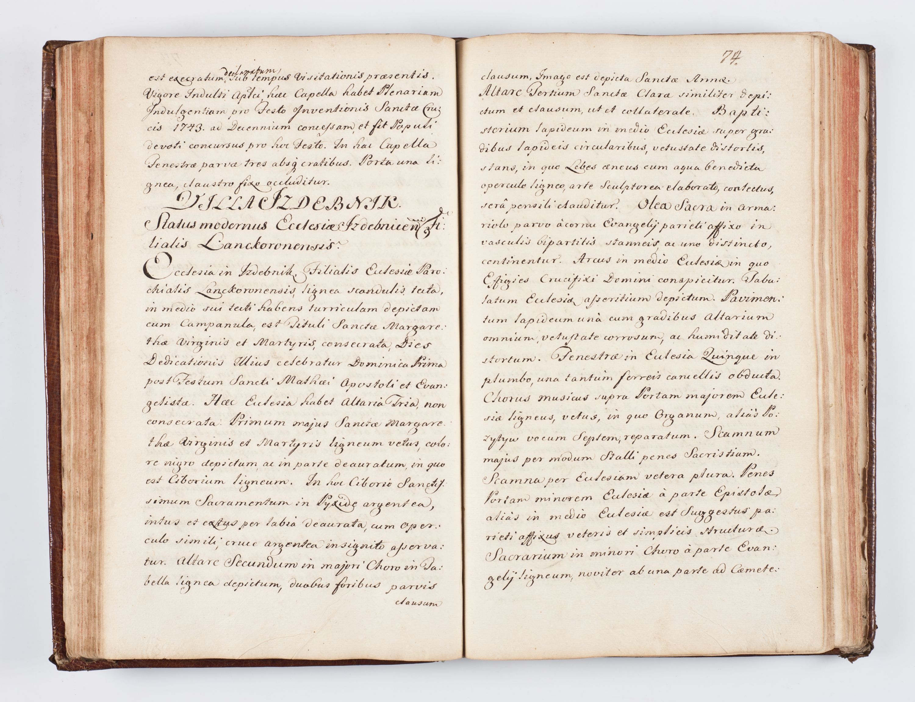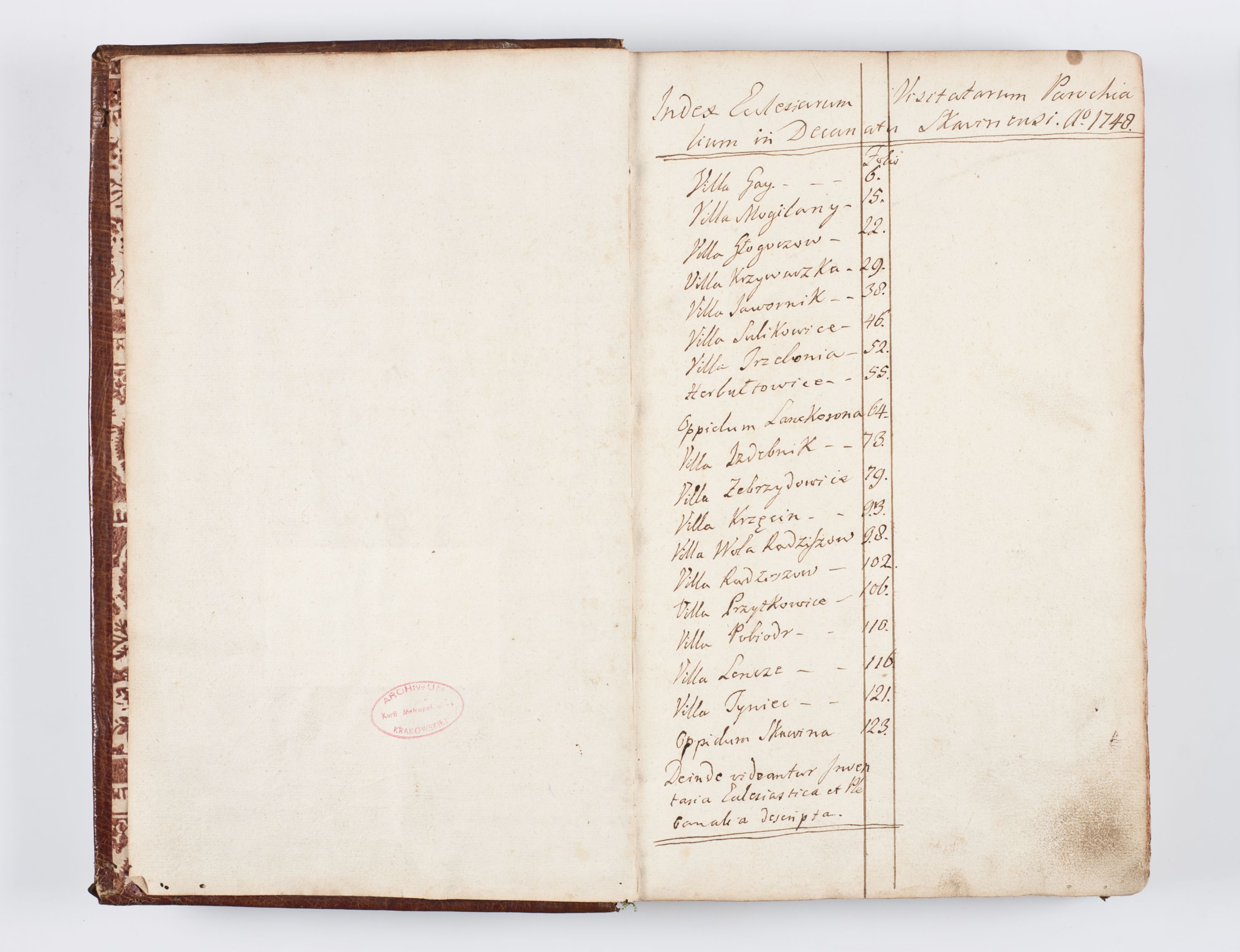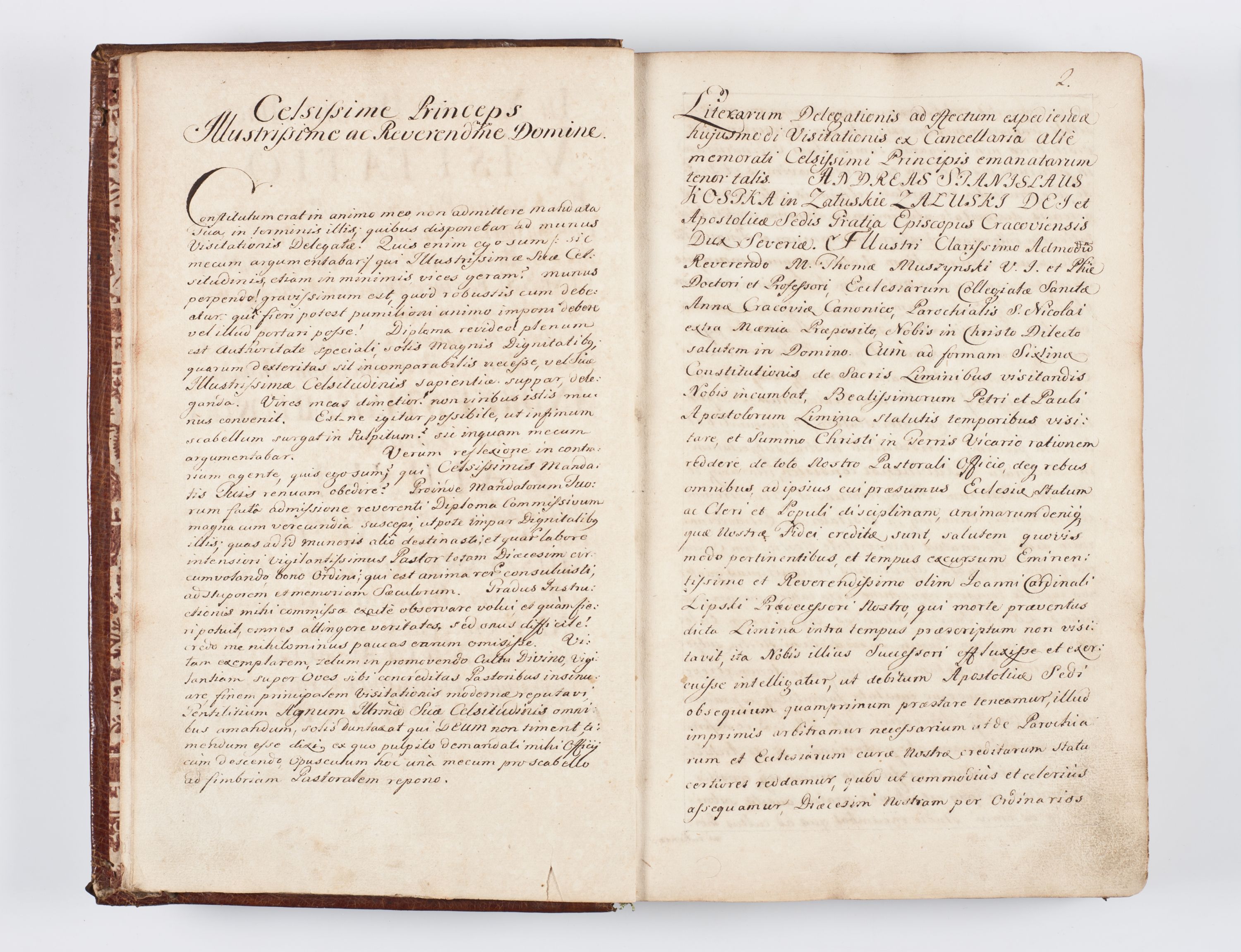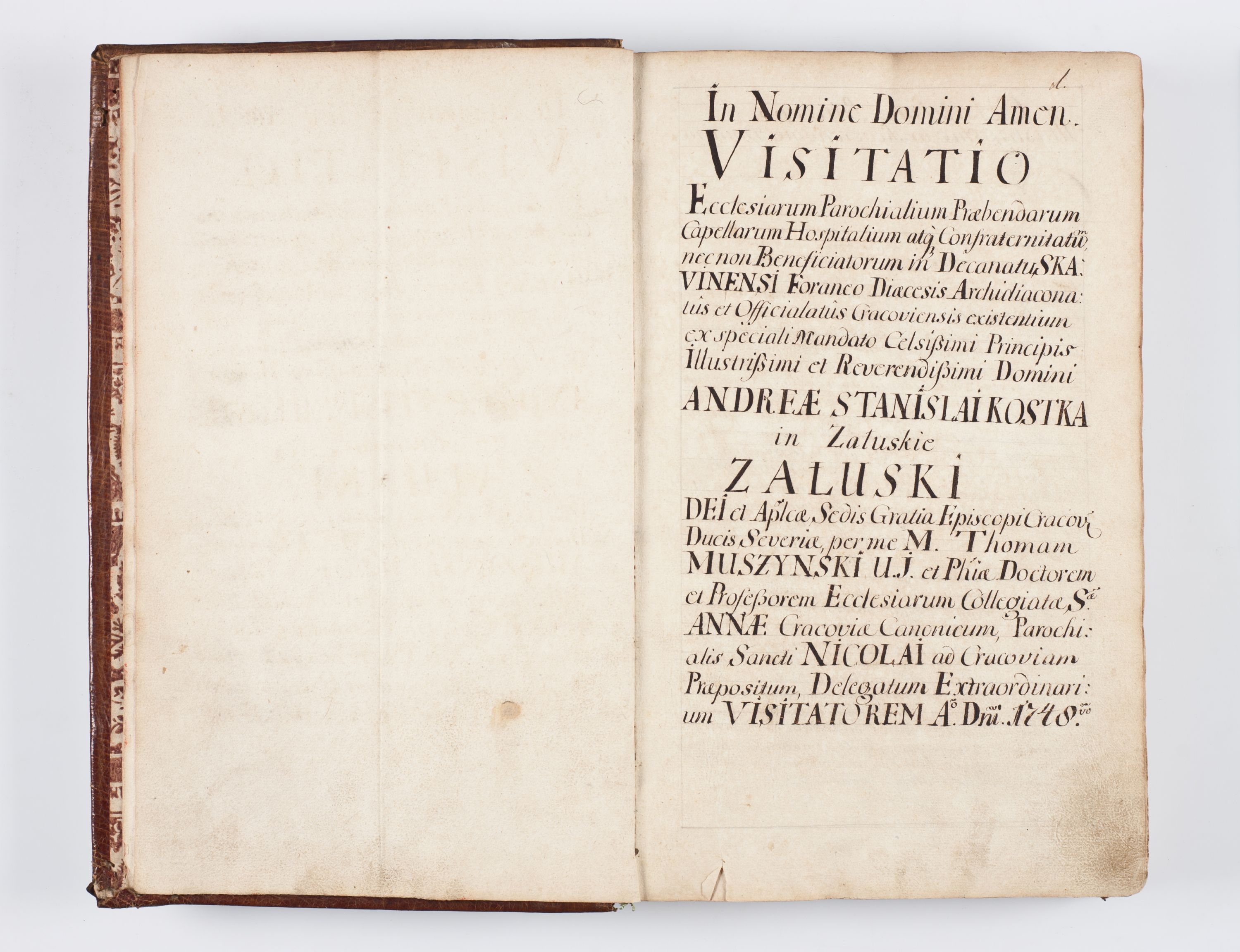 Visitatio ecclesiarum parachialium, praebendarum, capellarum, hospitalium atque confraternitatum, nec non beneficiorum in decanatu Scaviensi foraneo, dioecesis, archidiaconatus et officialatus Cracoviensis consistentiu, ex speciali mandato Cel. Principis R.D. Andreae Stanislai Kostka in Załuskie Załuski, episcopi Cracoviensis canonicum, parochialis s. Nicolai ad Cracowiam praepositum, delegatum extraordinarium visitatorem a.D. 1748