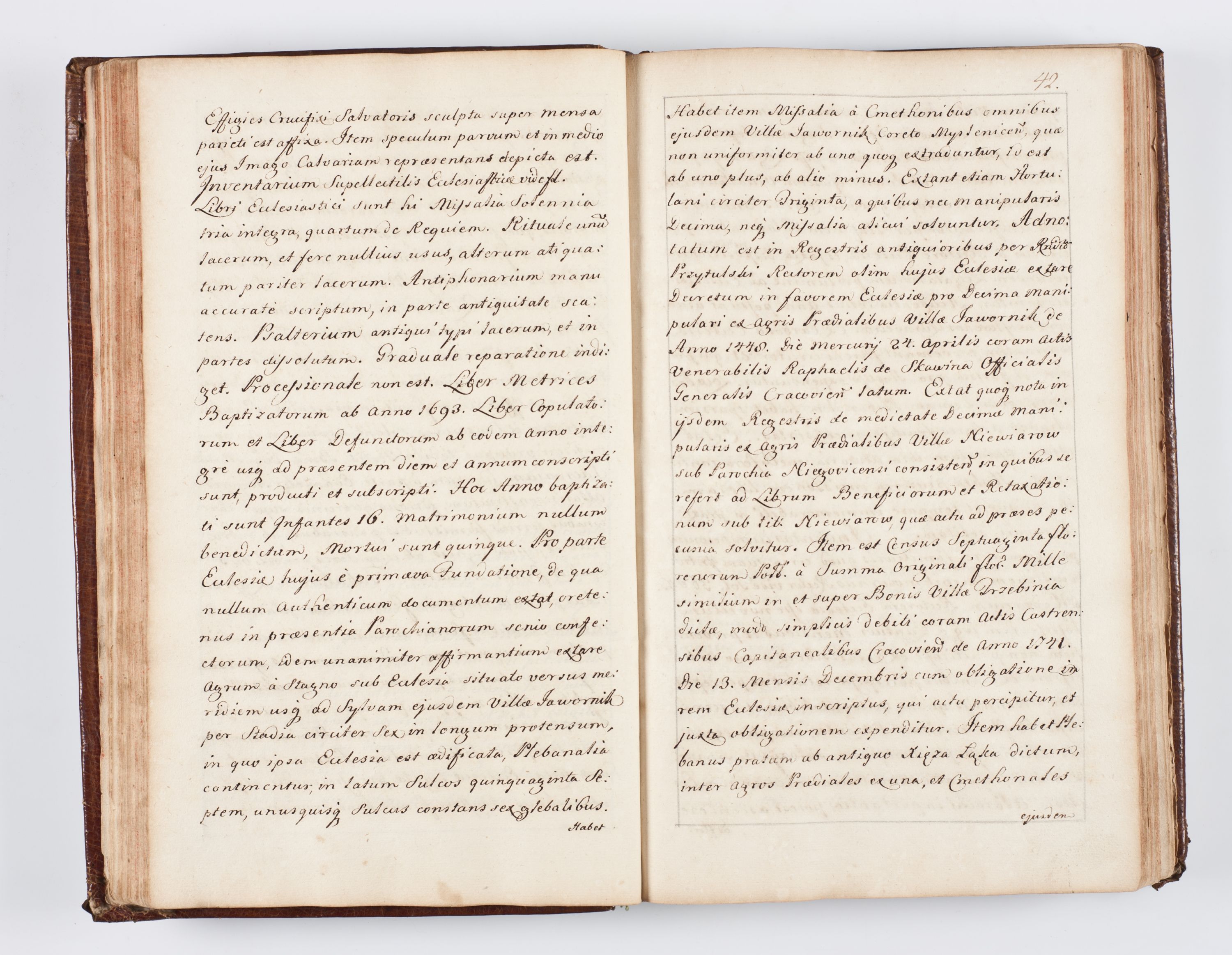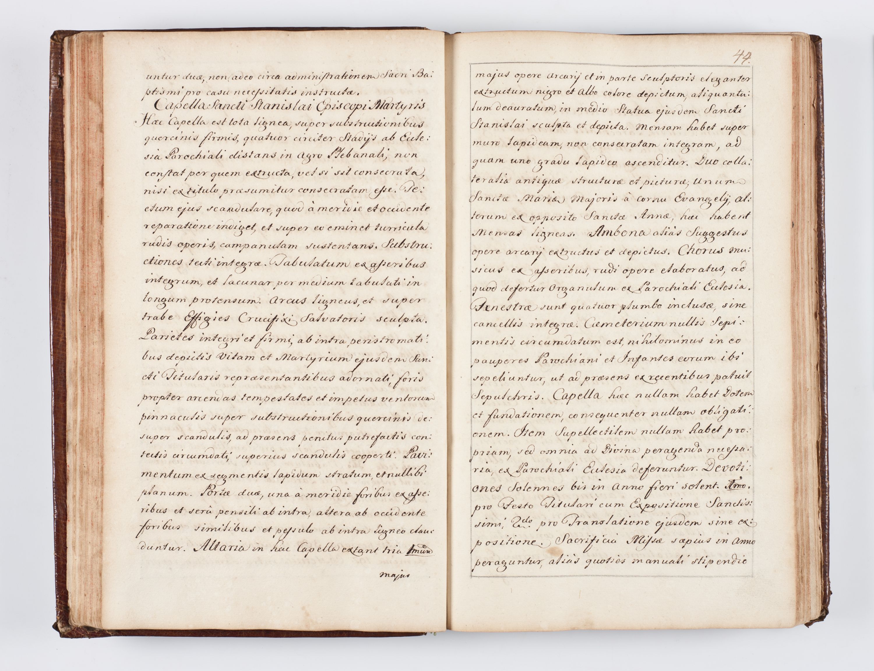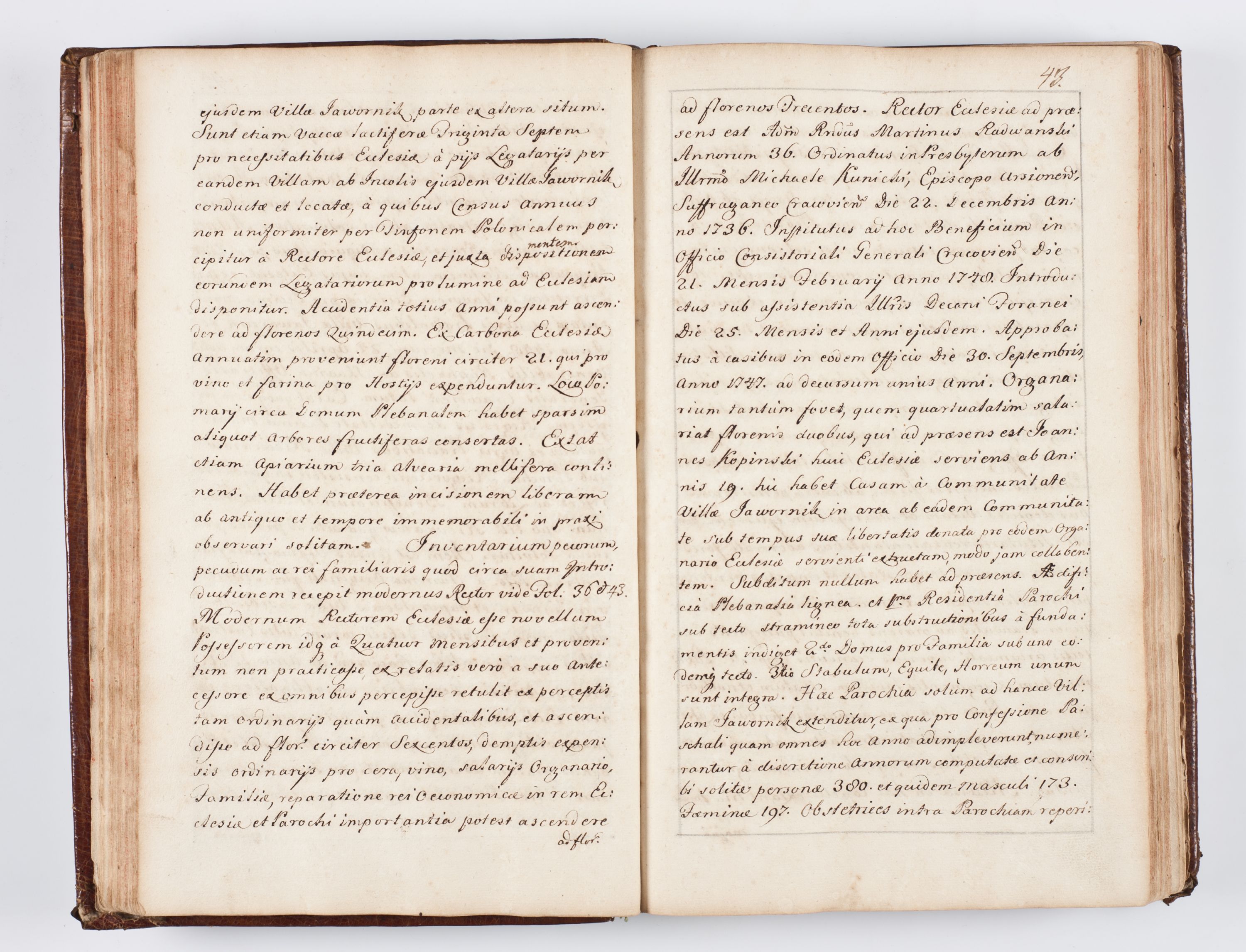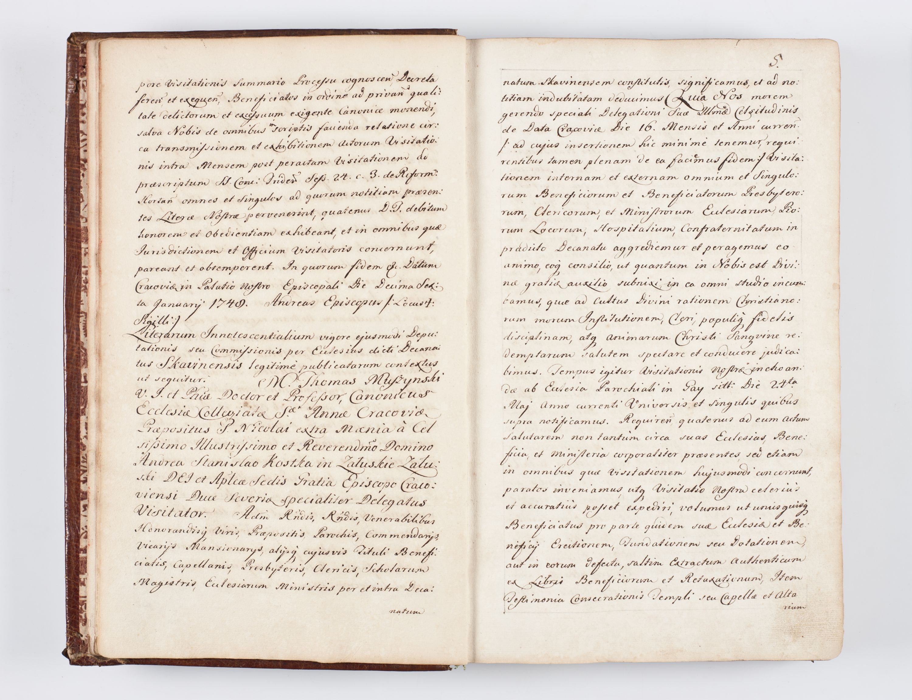 Visitatio ecclesiarum parachialium, praebendarum, capellarum, hospitalium atque confraternitatum, nec non beneficiorum in decanatu Scaviensi foraneo, dioecesis, archidiaconatus et officialatus Cracoviensis consistentiu, ex speciali mandato Cel. Principis R.D. Andreae Stanislai Kostka in Załuskie Załuski, episcopi Cracoviensis canonicum, parochialis s. Nicolai ad Cracowiam praepositum, delegatum extraordinarium visitatorem a.D. 1748