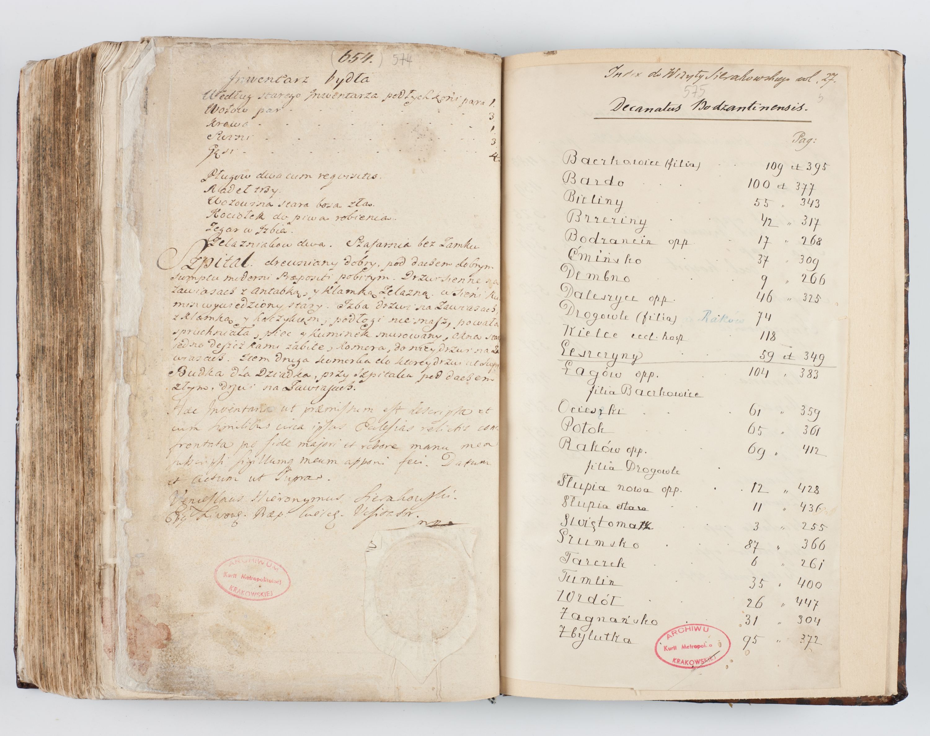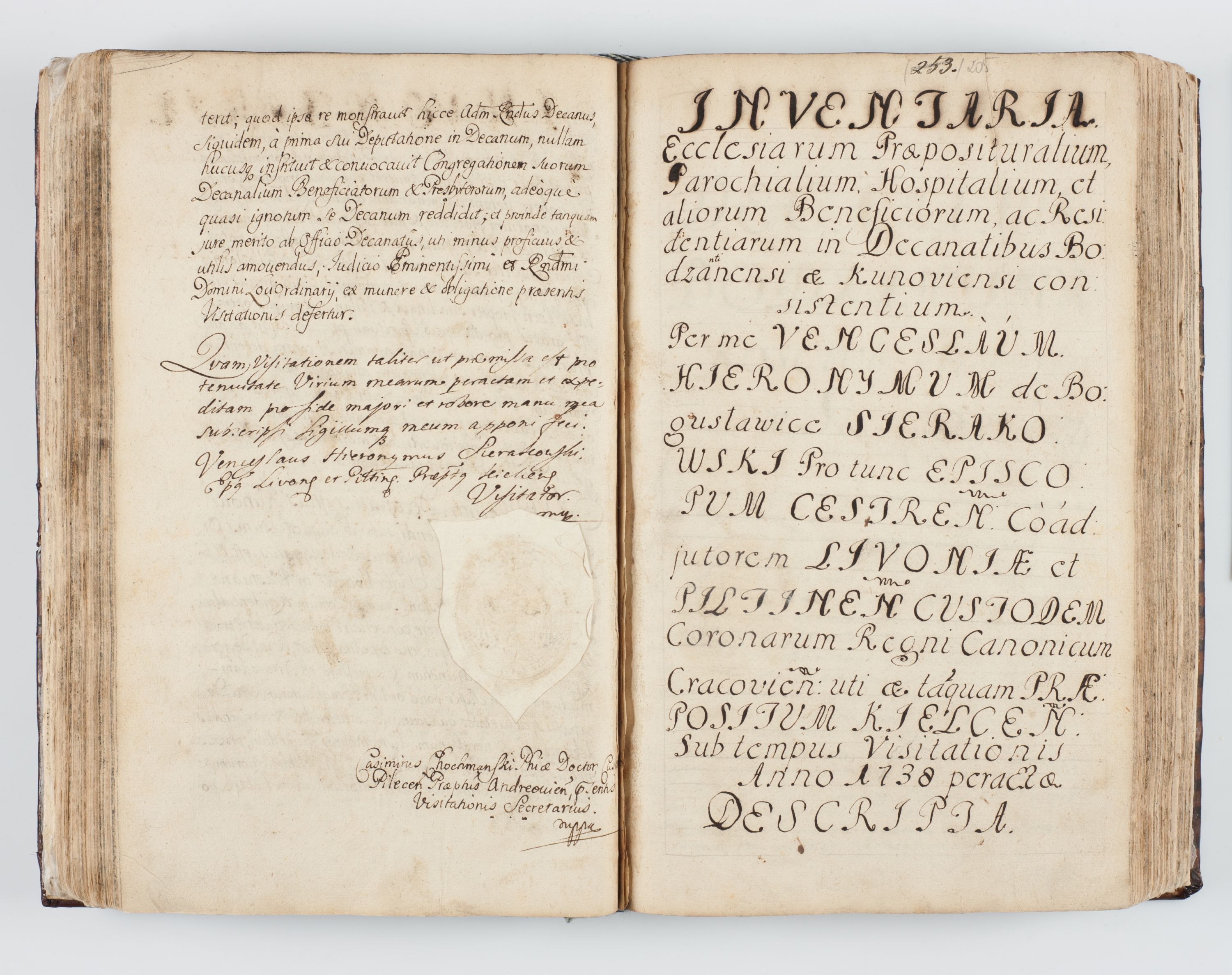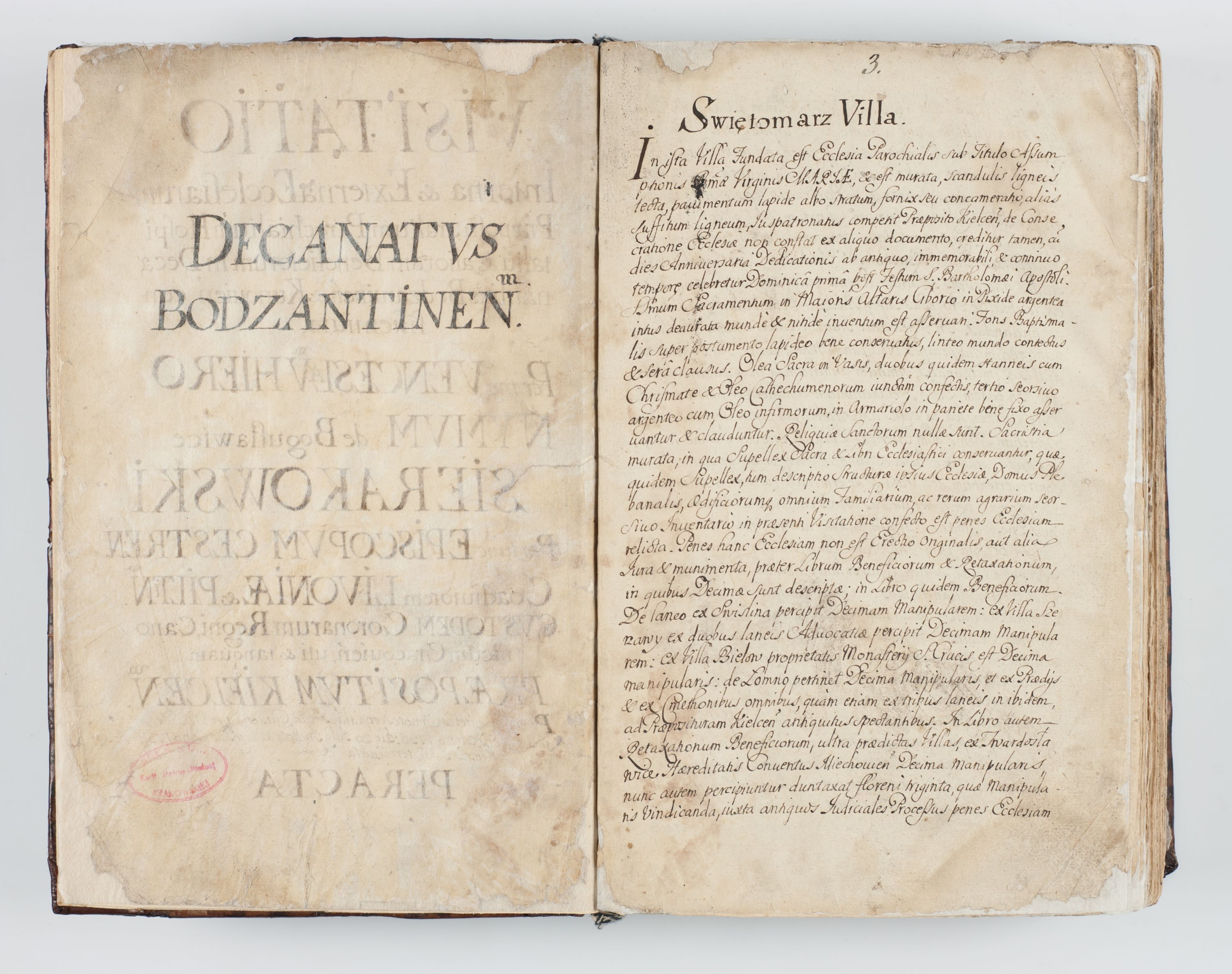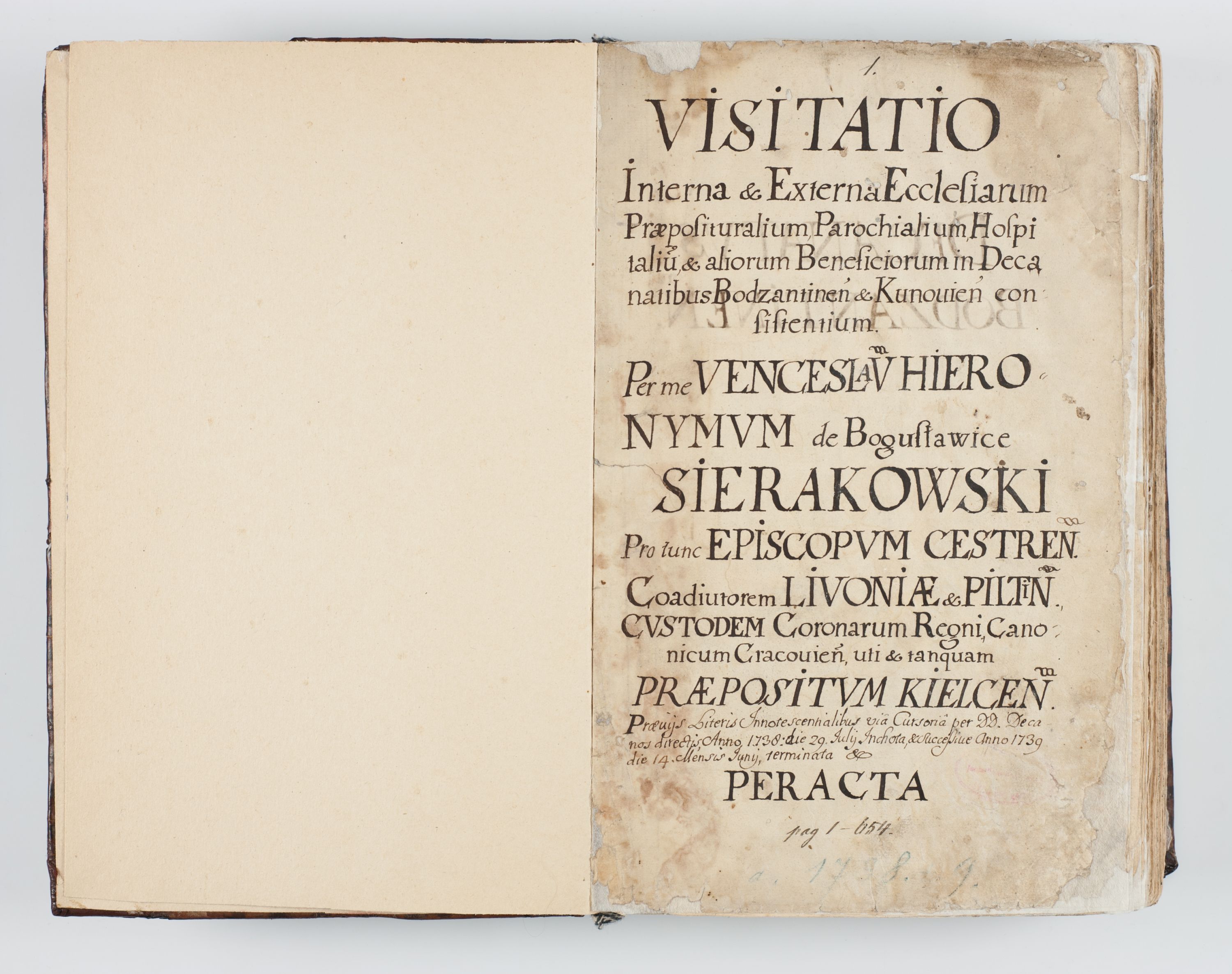 Visitatio interna et externa ecclesiarum praeposituralium, parachialium, hospitalium et aliorum beneficiorum in decanatibus Bodzantinensi ac Kunoviensi consistentium per me Venceslaum Hieronymum de Bogusławice Sierakowski, pro tunc episcopum Cestrensem, coadiutorem Livoniae et Piltinensis, custodem Coronarum Regni , canonicum Cracoviensem uti tanquam praepositum Kielcensem, praeviis litteris innotescentialibus via cursoria per R.D. Decanos directis anno 1738 die 29 Julii inchoata et successivo anno 1739 die 14 memsis Junii terminata et peracta
