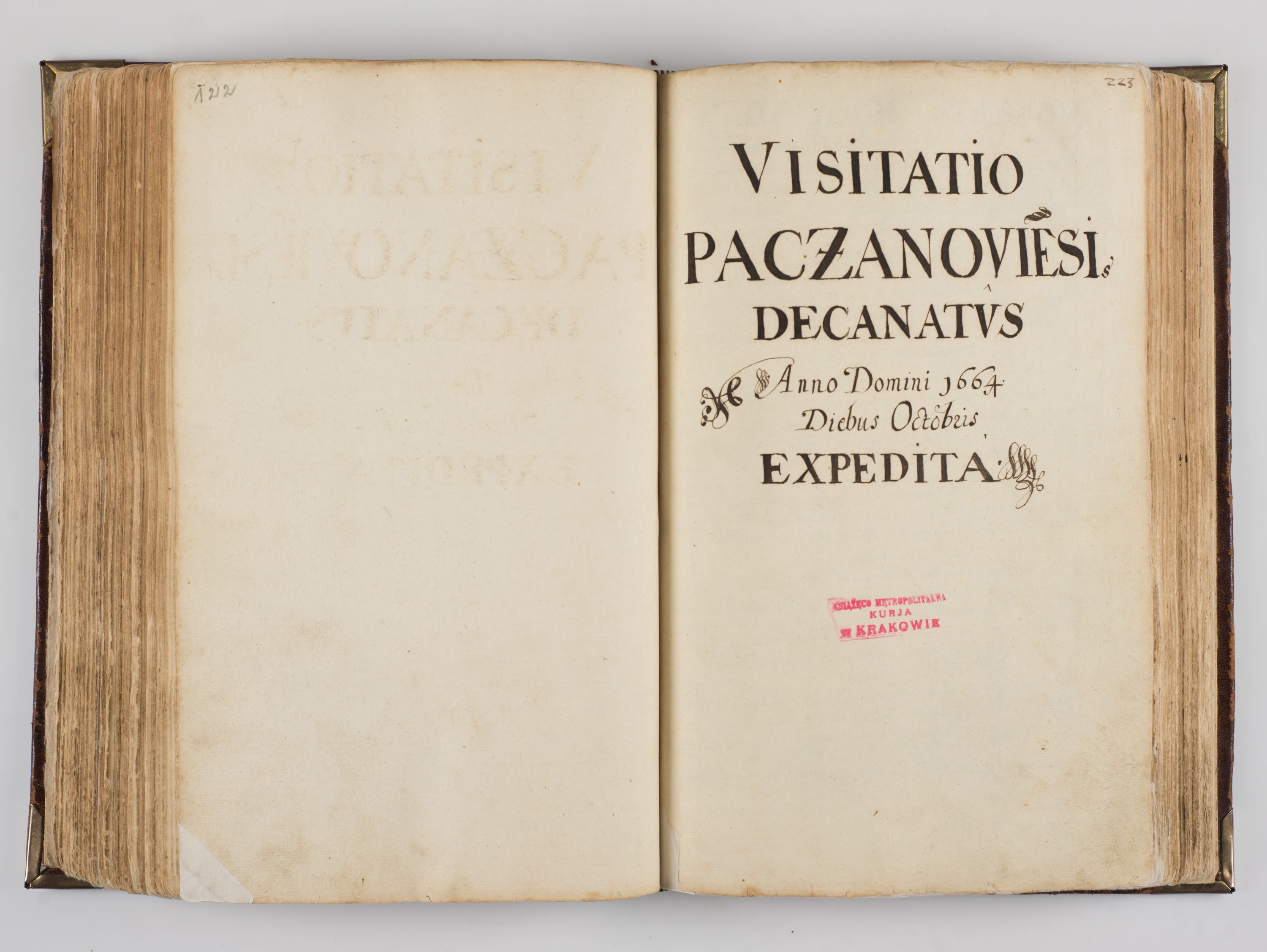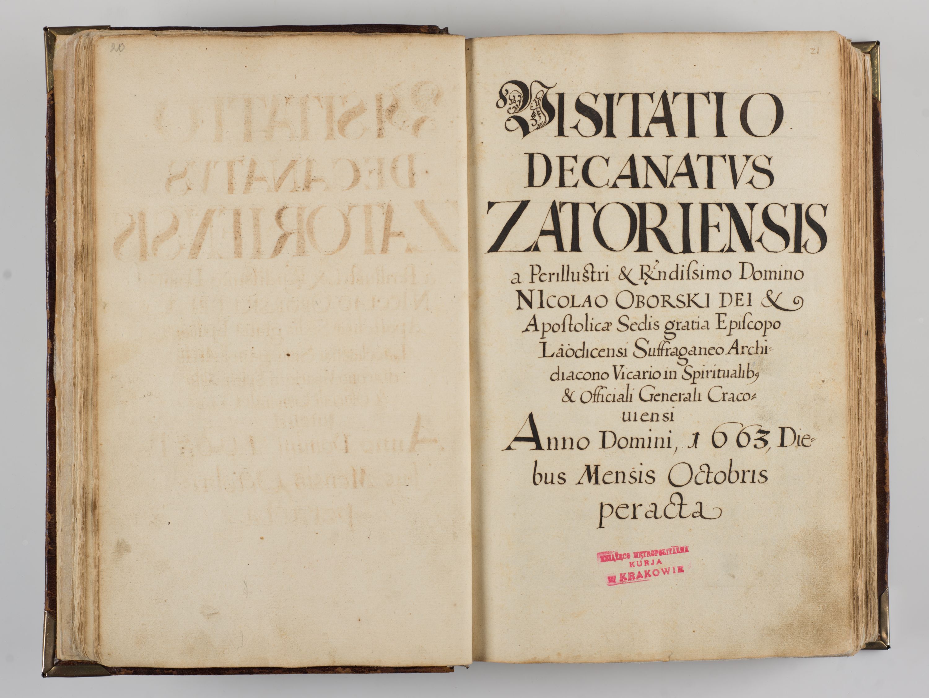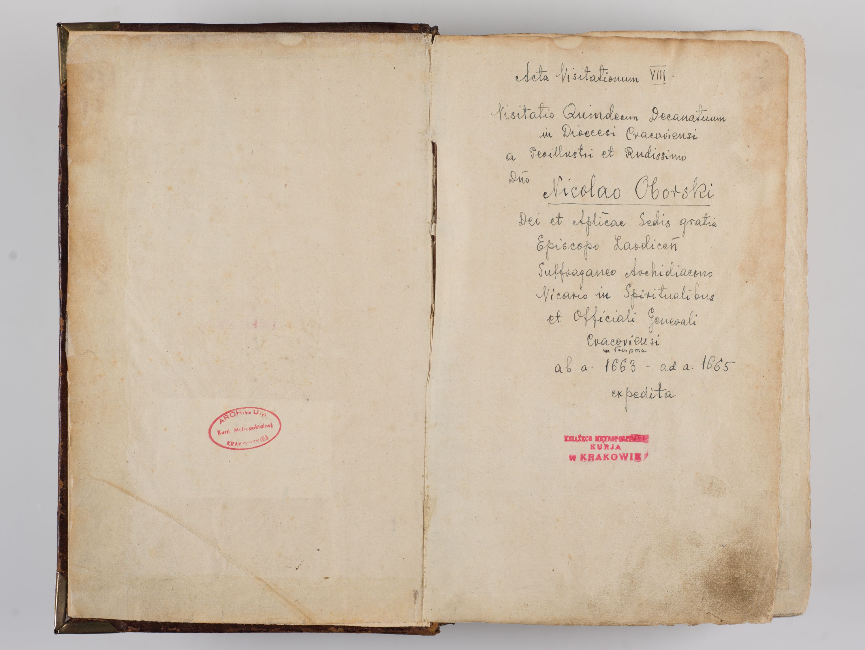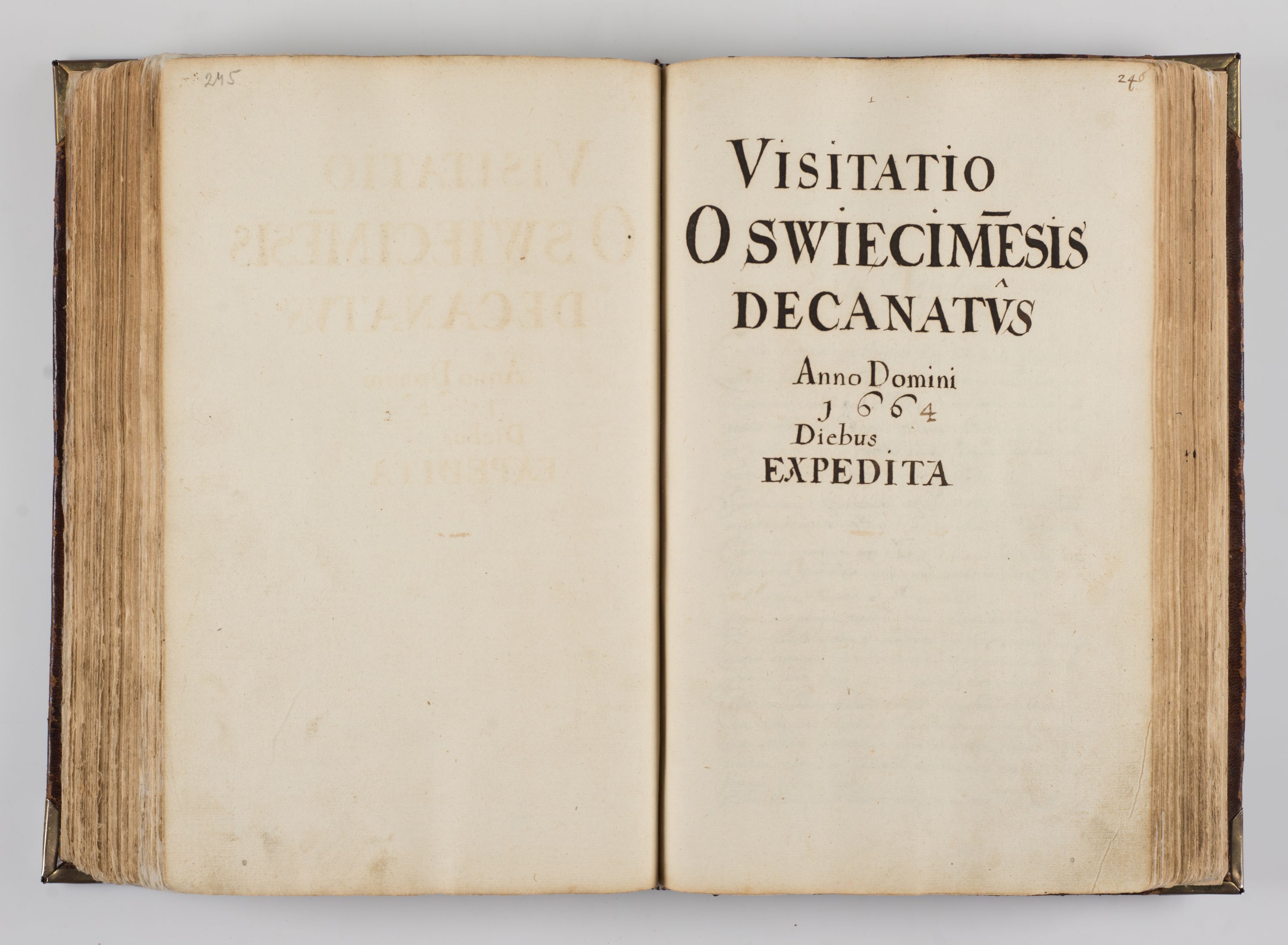 Visitatio quindecim decanatuum, nempe: Skavinensis, Zathoriensis, Novi Montis, Skalensis, Wrocimoviensis, Adreoviensis, Kijensis, Paczanoviensis, Oswiecimensis, Żywiecensis, Witoviensis, Skoliensis, Opatovecensis, Wielicensis et Plesnensis a Peril. et R.D. Nicolao Oborski, episcopo Laodicensis, suffraganeo, archidiacono, vicario in spiritualibus generali Cracoviensi in annis 1663 - 1665 expedita