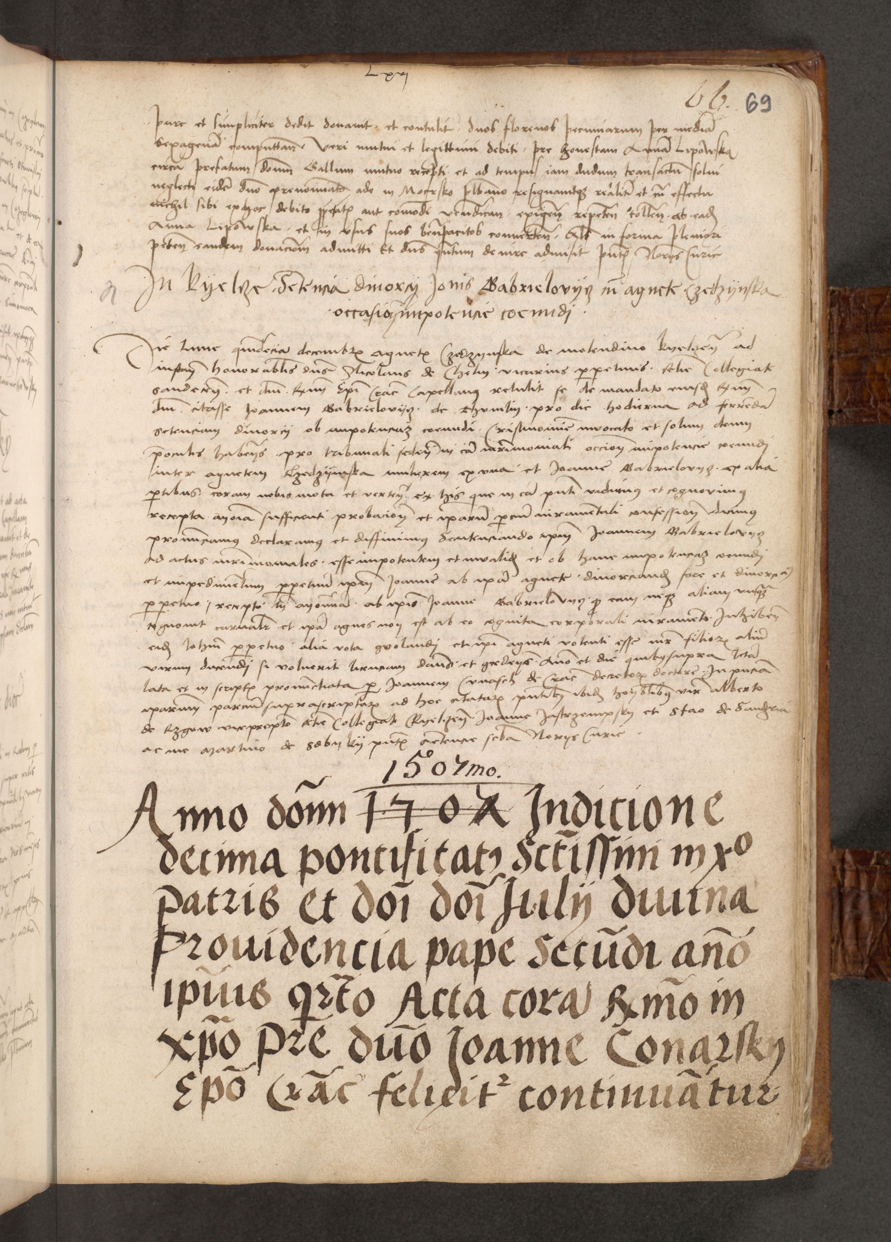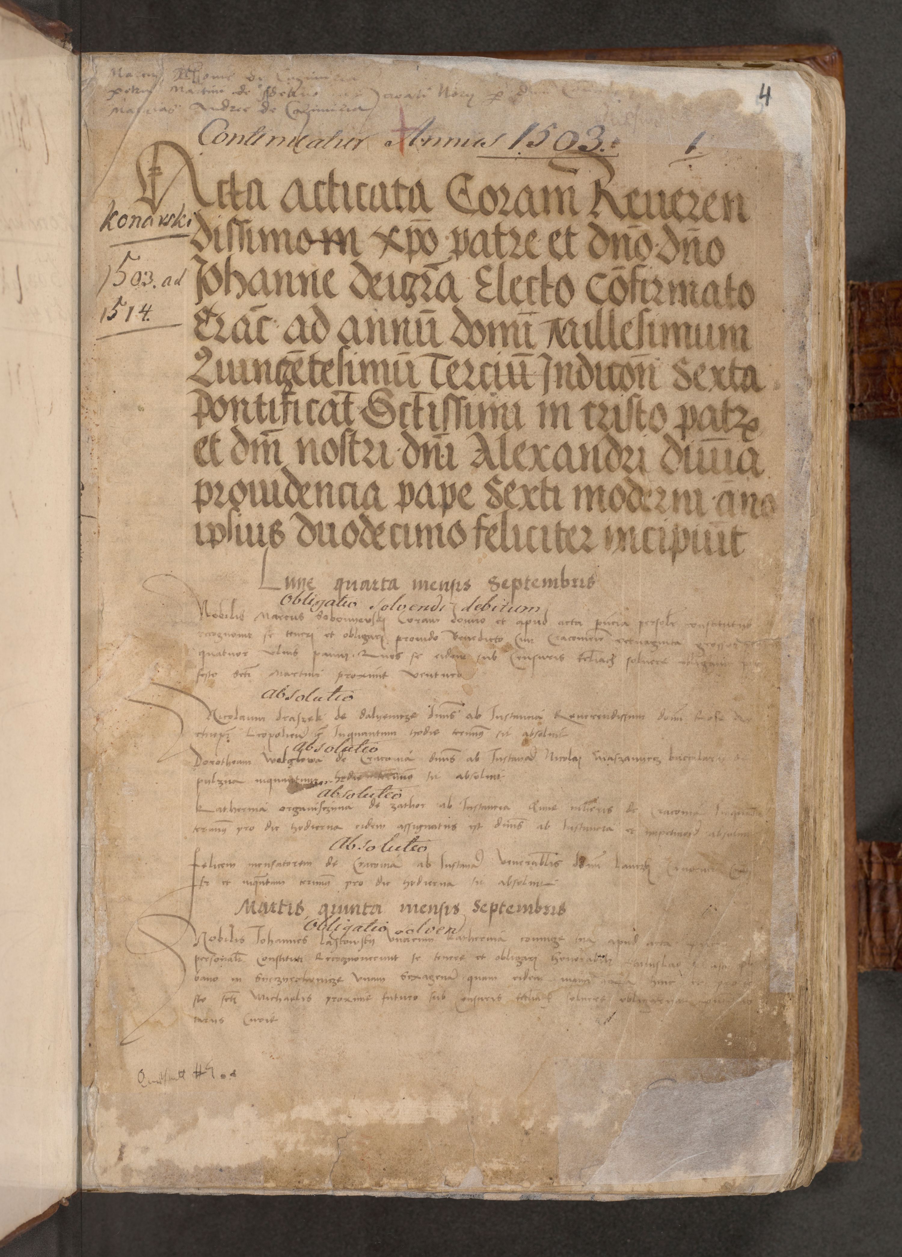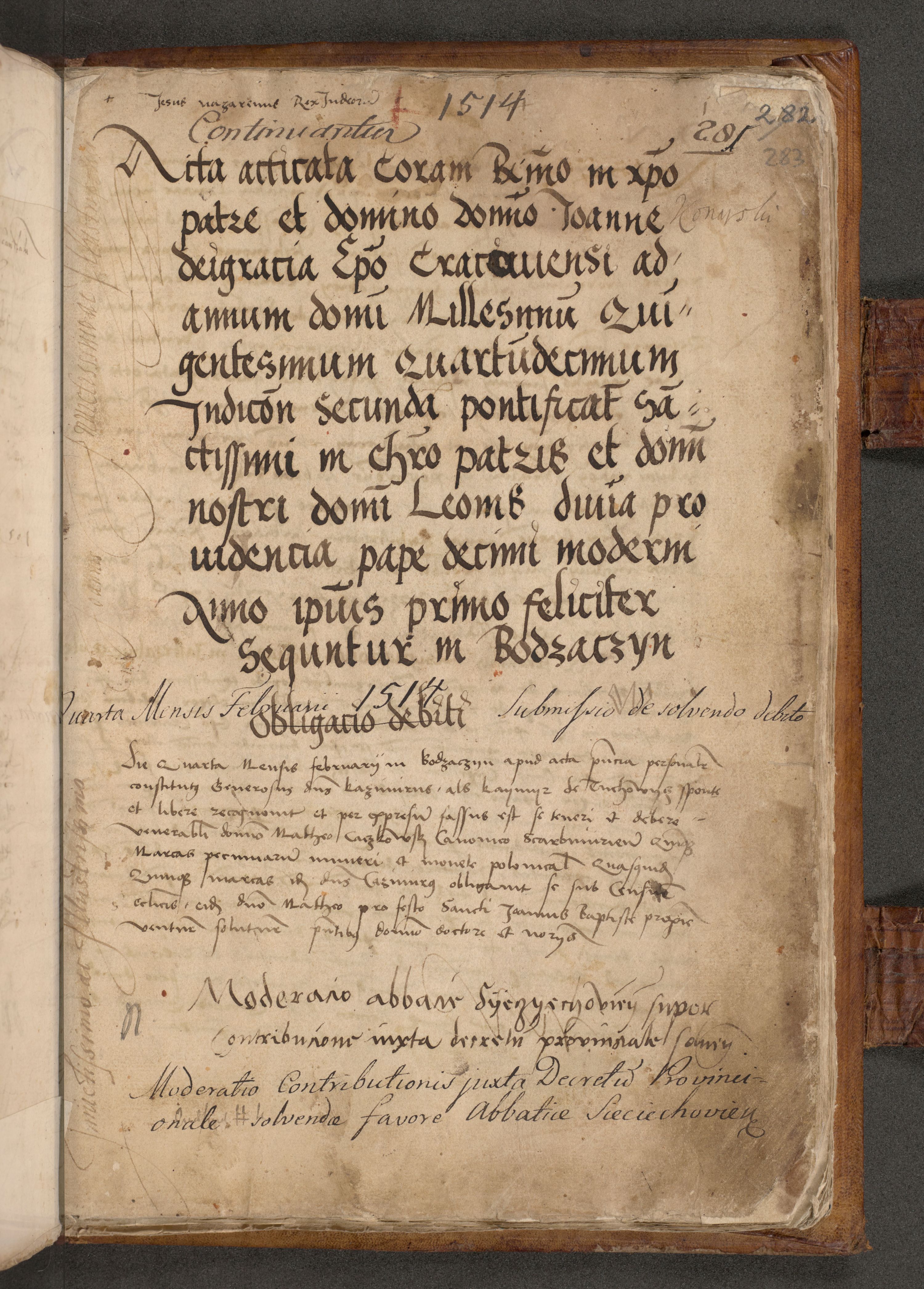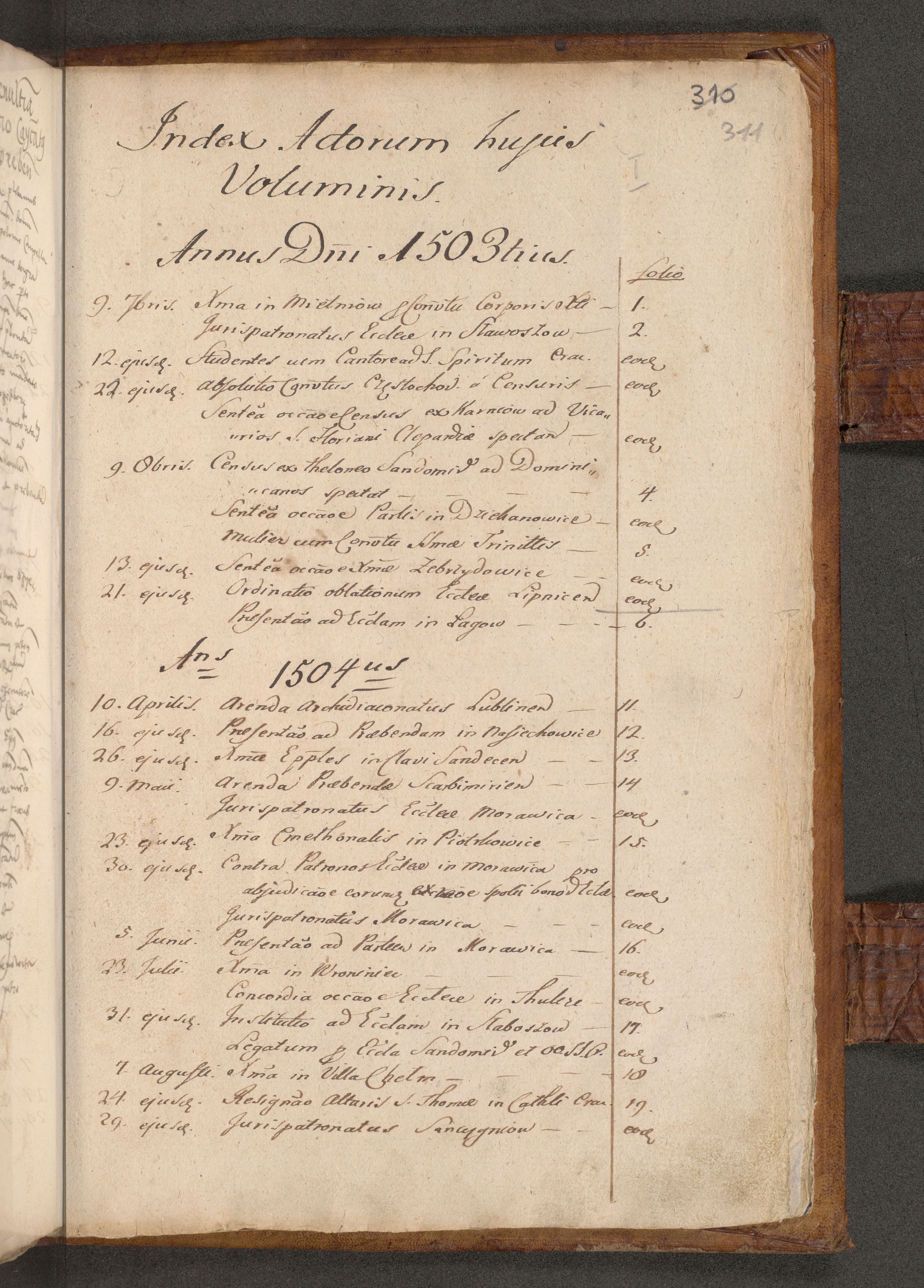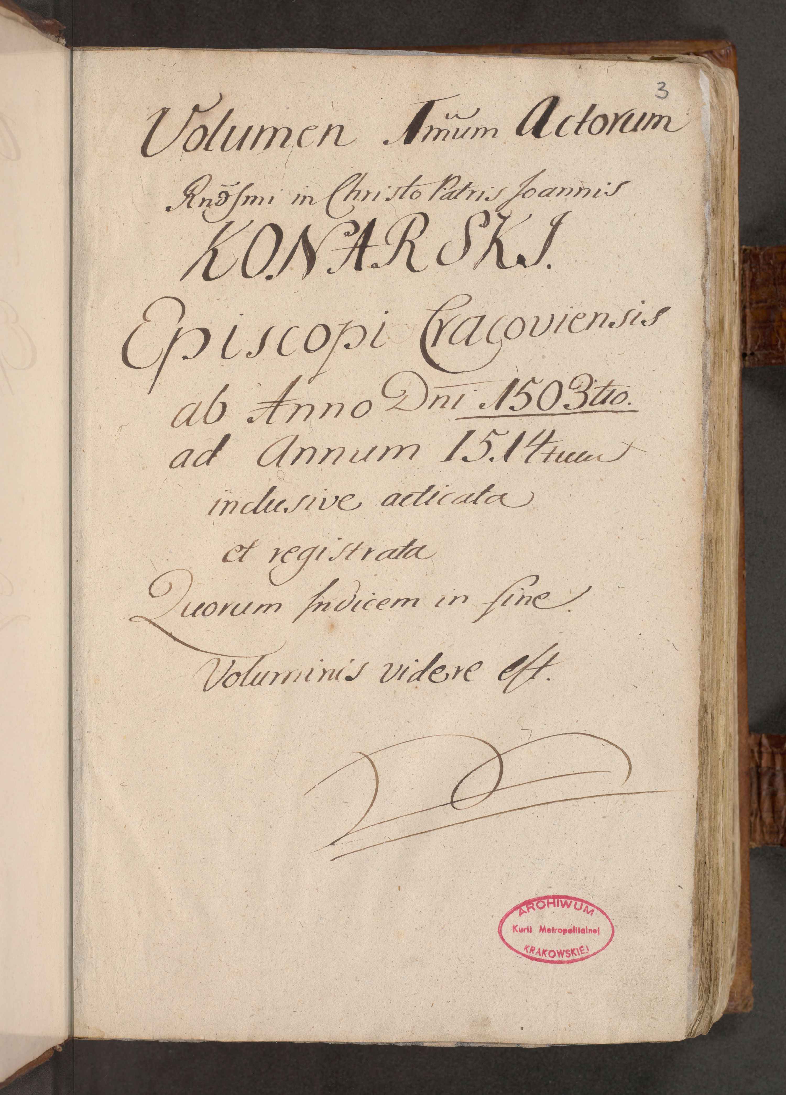 Volumen I-mum actorum R. D. Joannis Konarski, episcopi Cracoviensis ab an D. 1503 ad annum 1514 inclusive acticata et registata, quorum indicem in dine voluminis videre est.